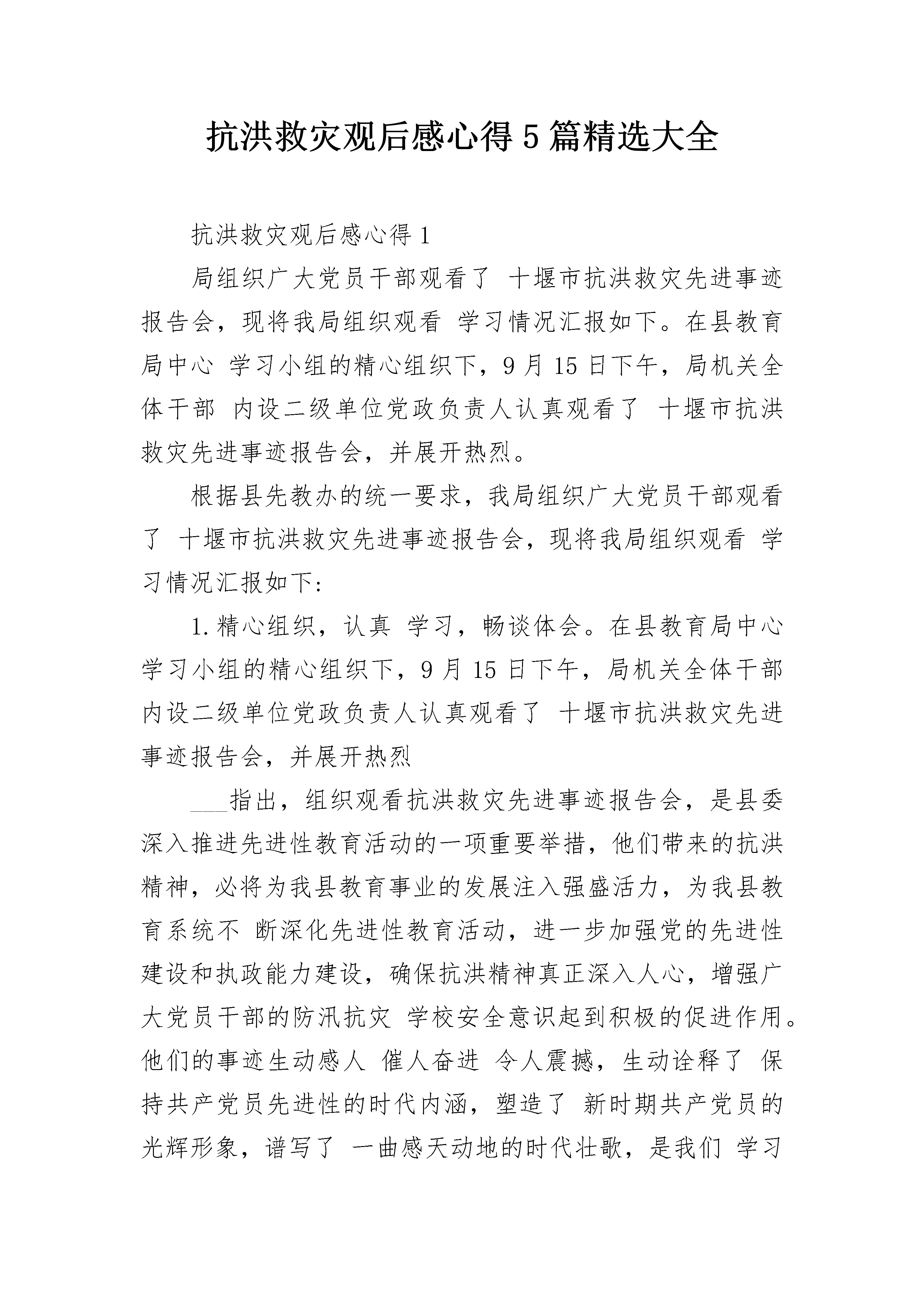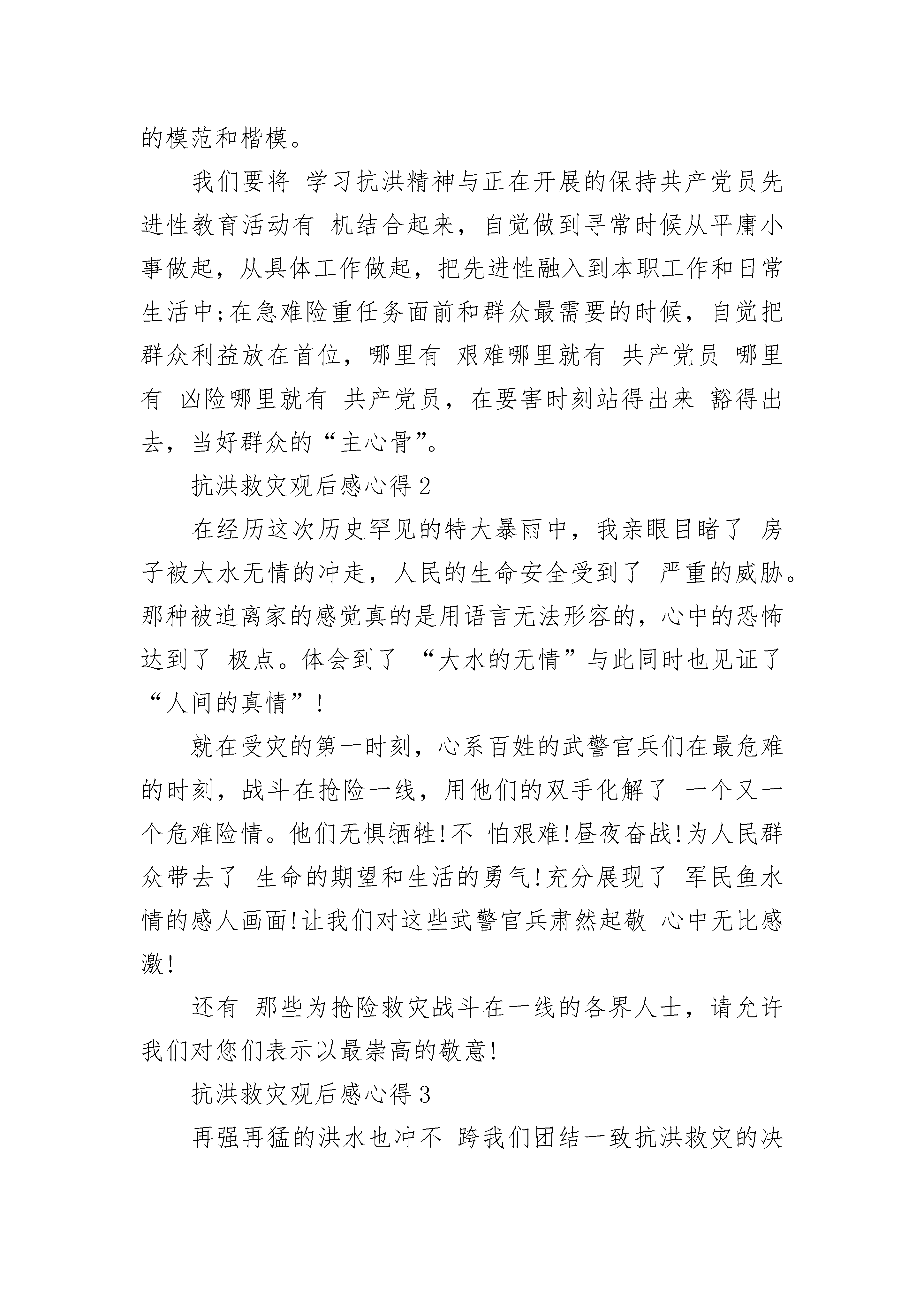 抗洪救灾观后感心得5篇精选大全抗洪救灾观后感心得1局组织广大党员干部观看了十堰市抗洪救灾先进事迹报告会,现将我局组织观看学习情况汇报如下。在县教育局中心学习小组的精心组织下,9月15日下午,局机关全体干部内设二级单位党政负责人认真观看了十堰市抗洪救灾先进事迹报告会,并展开热烈。根据县先教办的统一要求,我局组织广大党员干部观看了十堰市抗洪救灾先进事迹报告会,现将我局组织观看学习情况汇报如下:1.精心组织,认真学习,畅谈体会。在县教育局中心学习小组的精心组织下,9月15日下午,局机关全体干部内设二级单位党政负责人认真观看了十堰市抗洪救灾先进事迹报告会,并展开热烈___指出,组织观看抗洪救灾先进事迹报告会,是县委深入推进先进性教育活动的一项重要举措,他们带来的抗洪精神,必将为我县教育事业的发展注入强盛活力,为我县教育系统不断深化先进性教育活动,进一步加强党的先进性建设和执政能力建设,确保抗洪精神真正深入人心,增强广大党员干部的防汛抗灾学校安全意识起到积极的促进作用。他们的事迹生动感人催人奋进令人震撼,生动诠释了保持共产党员先进性的时代内涵,塑造了新时期共产党员的光辉形象,谱写了一曲感天动地的时代壮歌,是我们学习的模范和楷模。我们要将学习抗洪精神与正在开展的保持共产党员先进性教育活动有机结合起来,自觉做到寻常时候从平庸小事做起,从具体工作做起,把先进性融入到本职工作和日常生活中;在急难险重任务面前和群众最需要的时候,自觉把群众利益放在首位,哪里有艰难哪里就有共产党员哪里有凶险哪里就有共产党员,在要害时刻站得出来豁得出去,当好群众的“主心骨”。抗洪救灾观后感心得2在经历这次历史罕见的特大暴雨中,我亲眼目睹了房子被大水无情的冲走,人民的生命安全受到了严重的威胁。那种被迫离家的感觉真的是用语言无法形容的,心中的恐怖达到了极点。体会到了“大水的无情”与此同时也见证了“人间的真情”!就在受灾的第一时刻,心系百姓的武警官兵们在最危难的时刻,战斗在抢险一线,用他们的双手化解了一个又一个危难险情。他们无惧牺牲!不怕艰难!昼夜奋战!为人民群众带去了生命的期望和生活的勇气!充分展现了军民鱼水情的感人画面!让我们对这些武警官兵肃然起敬心中无比感激!还有那些为抢险救灾战斗在一线的各界人士,请允许我们对您们表示以最崇高的敬意!抗洪救灾观后感心得3再强再猛的洪水也冲不跨我们团结一致抗洪救灾的决心。__乡全体救灾人员在抗洪抢险中所取得的胜利就充分证明了这点。__年8月5日,墨江县__阿墨江他郎河因受强降雨影响河水暴涨,__乡三江口一带发生特大洪涝灾害及次生地质灾害。这次灾害导致防护河堤大面积坍塌,造成部分房屋崩塌路面阻断,同时险情致使__两百多户居民需紧急撤离,并给人民群众带来了巨大的财产损失。面对突如其来的洪涝灾害,__“8?5”洪涝灾害及次生地质灾害救灾指挥部迅速启动应急方案,安全撤离并安置好受灾的群众。这次灾害引起了省市县各级领导的高度重视,于8月8日分别安排并组织了党员突击队青年突击队消防突击队等多支救灾队伍赶赴__灾区。我也光荣地加入了青年突击队,在团县委书记和副书记的领导下和其他青年朋友们经过两个多小时的车程就到达了灾区,没顾得上歇息,我们就投入到了担心的救援工作。我们的第一项任务是给在受灾群众的安置点搭帐篷。夏天的__十分闷热,我们青年突击队的所有人员都头顶烈日,担心的工作着,汗流浃背自然是难免的,可没有一人说不愿意,也没有一人偷懒,大家都明白,惟独我们搭建好帐篷受灾群众才干被如数安排好。大家工作的很认真,连歇息是也不愿多浪费一分钟,尽管大家很累,但是脸上却洋溢着快乐的笑脸。由于搭建帐篷和活动板房的水泥场地不够,救灾指挥部要求组织人员迅速对粮管所前后的暂时空场实施混泥土浇灌以保证后续工作的展开,我们也于八号晚饭后接到了第二项任务,配合施工人员进行混泥土浇灌作业。日暮下我们鲜红的团旗迎风飘扬,我们的青年突击队也担心有序的配合施工人员浇灌混泥土。我们身着红色志愿服排成一条长龙就像一条长长的运输带运输着搅拌好的混泥土。混泥土着实很沉,由于情况紧急我们所有人都没有佩戴手套,很快大家的手都磨烂了,有的都流血了,可大家没有说一个“累”字一个“脏”字。而后我们又参加了活动板房的搭建,天天依然烈日炎炎,可苦中也有苦中的乐趣。在工作中我们依然欢声笑语。由于活动板房材料在切割时工艺偶有粗糙,被铁片划伤也是常事,可想一想灾情的严重和受灾群众安置的紧迫局面,大家那顾得上关怀这些划伤都继续埋头苦干。看着一幢幢活动板房搭建完成,我们也最终可以松口气了,想想灾民就要住进我们亲手搭建的房子中,我们欣喜万分再苦再累也是值得的。在救灾过程中也让我收获了人生中难得精神财富和宝贵的工作经验。我们青年突击队中的成员都是来自全县各个单位的,有政府部门的,有教育系统的,有厂矿企业的,还有来自