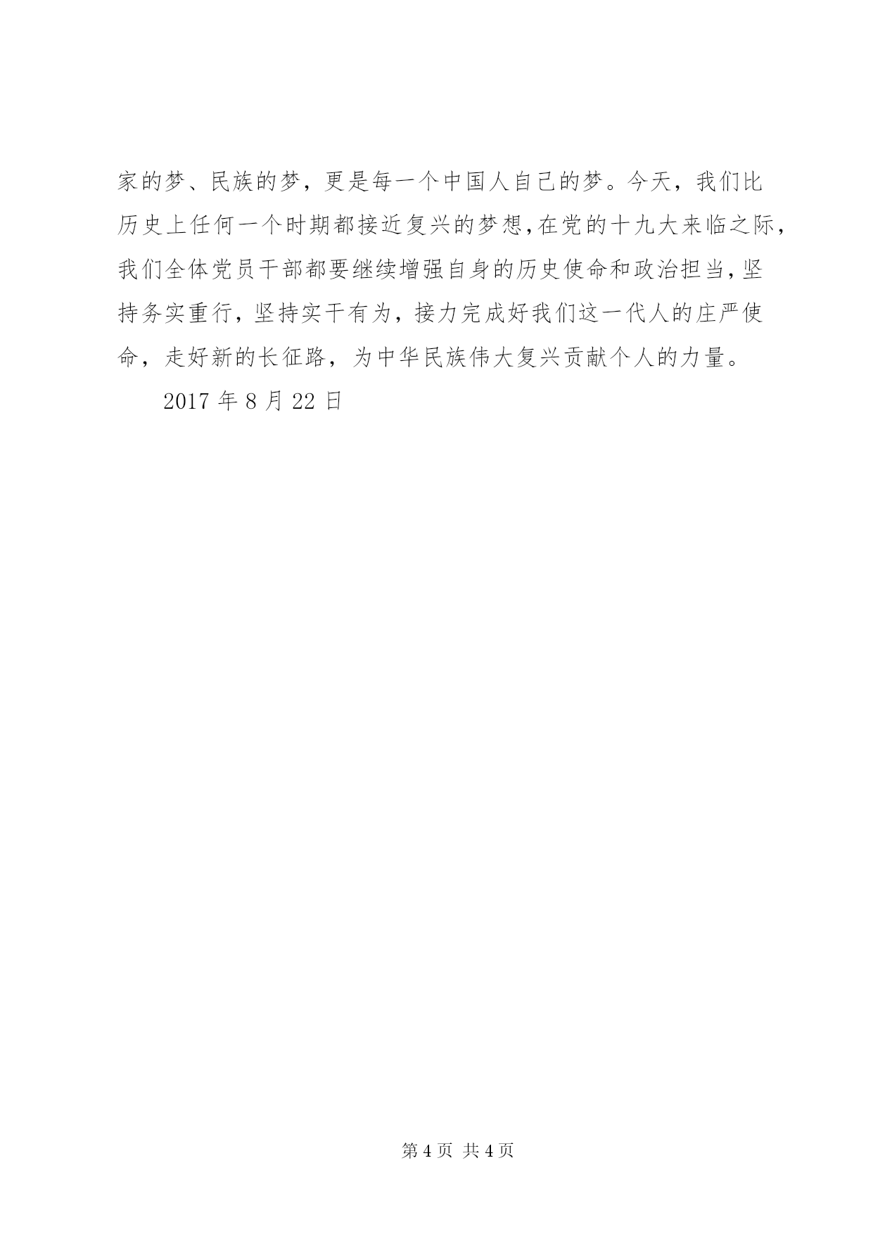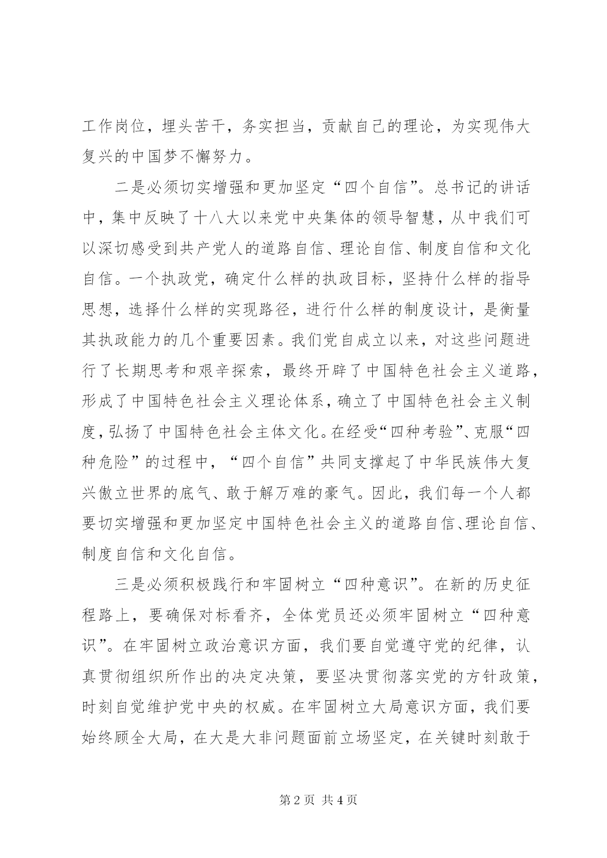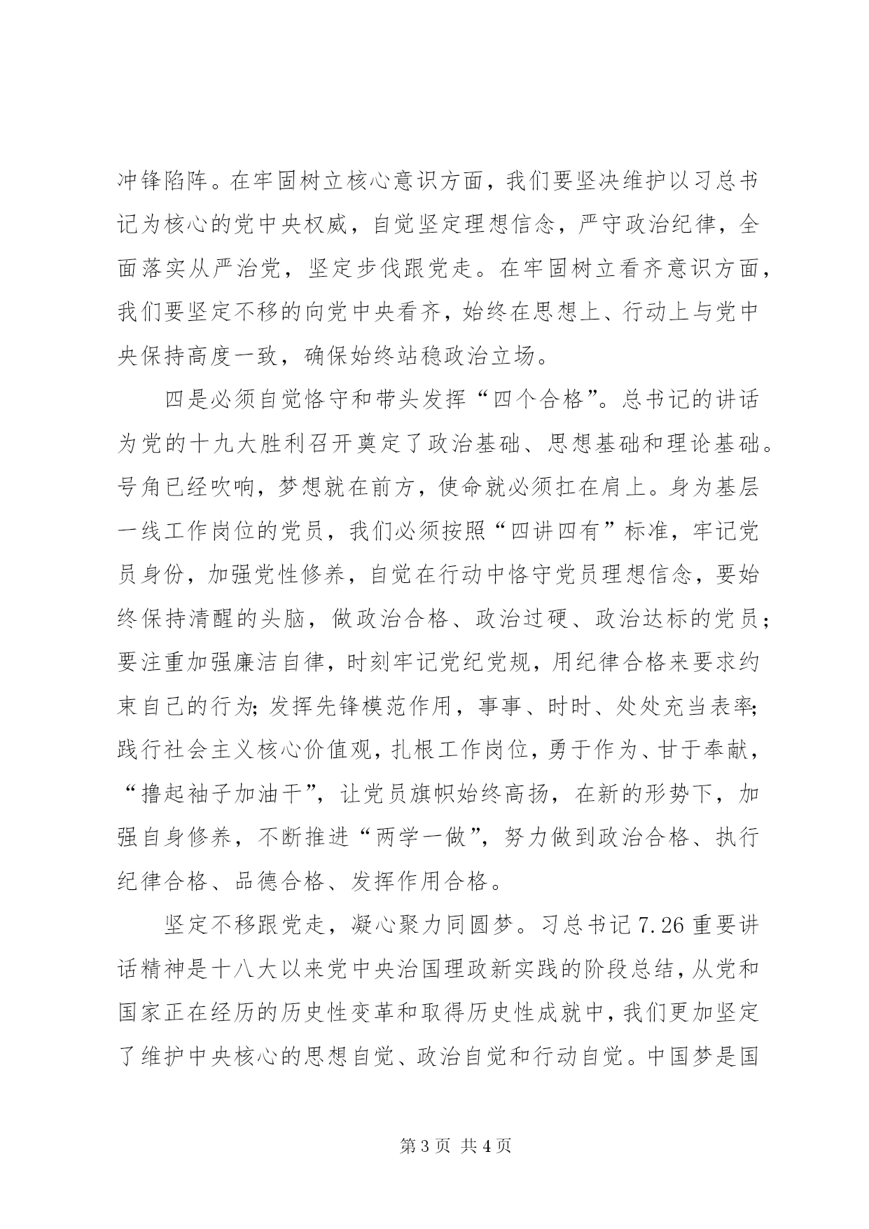 第PAGE\*Arabic\*MERGEFORMAT4页共NUMPAGES\*MERGEFORMAT4页 学习7.26重要讲话精神心得体会 7月26日至27日,习近平总书记省部级主要领导干部专题研讨班开班式上系统总结了十八大以来党和国家事业发展的巨大成就和历史经验,科学分析了当前国际国内形势,深刻阐述了五年来党和国家发生的深刻变革;深刻阐述了新的历史条件下坚持和发展中国特色社会主义的一系列重大理论和实践问题;深刻阐明了未来一个时期党和国家发展的大政方针和行动纲领,提出了一系列新的重要思想、重要观点、重大判断、重大举措,具有很强的思想性、战略性、前瞻性和指导性。近段时间以来,通过本单位组织对总书记7.26重要讲话精神的集中学习和个人自学,对于总书记讲话有了更为深刻的理解。一是必须深刻认识和拥护执行“四个全面”。全面深化改革、全面依法治国、全面从严治党、全面建成小康社会相辅相成、相得益彰,是我们党治国理政方略与时俱进的新创造,是马克思主义与中国实践相结合的新飞跃。“四个全面”战略布局是从国家发展现实需要中得出来的,反映了人民群众的热切期待,能够解决我们当前面临的突出矛盾和问题。它抓住了改革发展稳定关键,统领中国发展总纲,确立了新形势下党和国家各项工作的战略方向、重点领域、主攻目标。在全面建成小康社会的关键时期和决胜阶段,每一位中华儿女都应当更加深刻认识“四个全面”的内涵,按照总书记提出新的思路、新的战略、新的举措,立足自身工作岗位,埋头苦干,务实担当,贡献自己的理论,为实现伟大复兴的中国梦不懈努力。二是必须切实增强和更加坚定“四个自信”。总书记的讲话中,集中反映了十八大以来党中央集体的领导智慧,从中我们可以深切感受到共产党人的道路自信、理论自信、制度自信和文化自信。一个执政党,确定什么样的执政目标,坚持什么样的指导思想,选择什么样的实现路径,进行什么样的制度设计,是衡量其执政能力的几个重要因素。我们党自成立以来,对这些问题进行了长期思考和艰辛探索,最终开辟了中国特色社会主义道路,形成了中国特色社会主义理论体系,确立了中国特色社会主义制度,弘扬了中国特色社会主体文化。在经受“四种考验”、克服“四种危险”的过程中,“四个自信”共同支撑起了中华民族伟大复兴傲立世界的底气、敢于解万难的豪气。因此,我们每一个人都要切实增强和更加坚定中国特色社会主义的道路自信、理论自信、制度自信和文化自信。三是必须积极践行和牢固树立“四种意识”。在新的历史征程路上,要确保对标看齐,全体党员还必须牢固树立“四种意识”。在牢固树立政治意识方面,我们要自觉遵守党的纪律,认真贯彻组织所作出的决定决策,要坚决贯彻落实党的方针政策,时刻自觉维护党中央的权威。在牢固树立大局意识方面,我们要始终顾全大局,在大是大非问题面前立场坚定,在关键时刻敢于冲锋陷阵。在牢固树立核心意识方面,我们要坚决维护以习总书记为核心的党中央权威,自觉坚定理想信念,严守政治纪律,全面落实从严治党,坚定步伐跟党走。在牢固树立看齐意识方面,我们要坚定不移的向党中央看齐,始终在思想上、行动上与党中央保持高度一致,确保始终站稳政治立场。四是必须自觉恪守和带头发挥“四个合格”。总书记的讲话为党的十九大胜利召开奠定了政治基础、思想基础和理论基础。号角已经吹响,梦想就在前方,使命就必须扛在肩上。身为基层一线工作岗位的党员,我们必须按照“四讲四有”标准,牢记党员身份,加强党性修养,自觉在行动中恪守党员理想信念,要始终保持清醒的头脑,做政治合格、政治过硬、政治达标的党员;要注重加强廉洁自律,时刻牢记党纪党规,用纪律合格来要求约束自己的行为;发挥先锋模范作用,事事、时时、处处充当表率;践行社会主义核心价值观,扎根工作岗位,勇于作为、甘于奉献,“撸起袖子加油干”,让党员旗帜始终高扬,在新的形势下,加强自身修养,不断推进“两学一做”,努力做到政治合格、执行纪律合格、品德合格、发挥作用合格。坚定不移跟党走,凝心聚力同圆梦。习总书记7.26重要讲话精神是十八大以来党中央治国理政新实践的阶段总结,从党和国家正在经历的历史性变革和取得历史性成就中,我们更加坚定了维护中央核心的思想自觉、政治自觉和行动自觉。中国梦是国家的梦、民族的梦,更是每一个中国人自己的梦。今天,我们比历史上任何一个时期都接近复兴的梦想,在党的十九大来临之际,我们全体党员干部都要继续增强自身的历史使命和政治担当,坚持务实重行,坚持实干有为,接力完成好我们这一代人的庄严使命,走好新的长征路,为中华民族伟大复兴贡献个人的力量。2017年8月22日