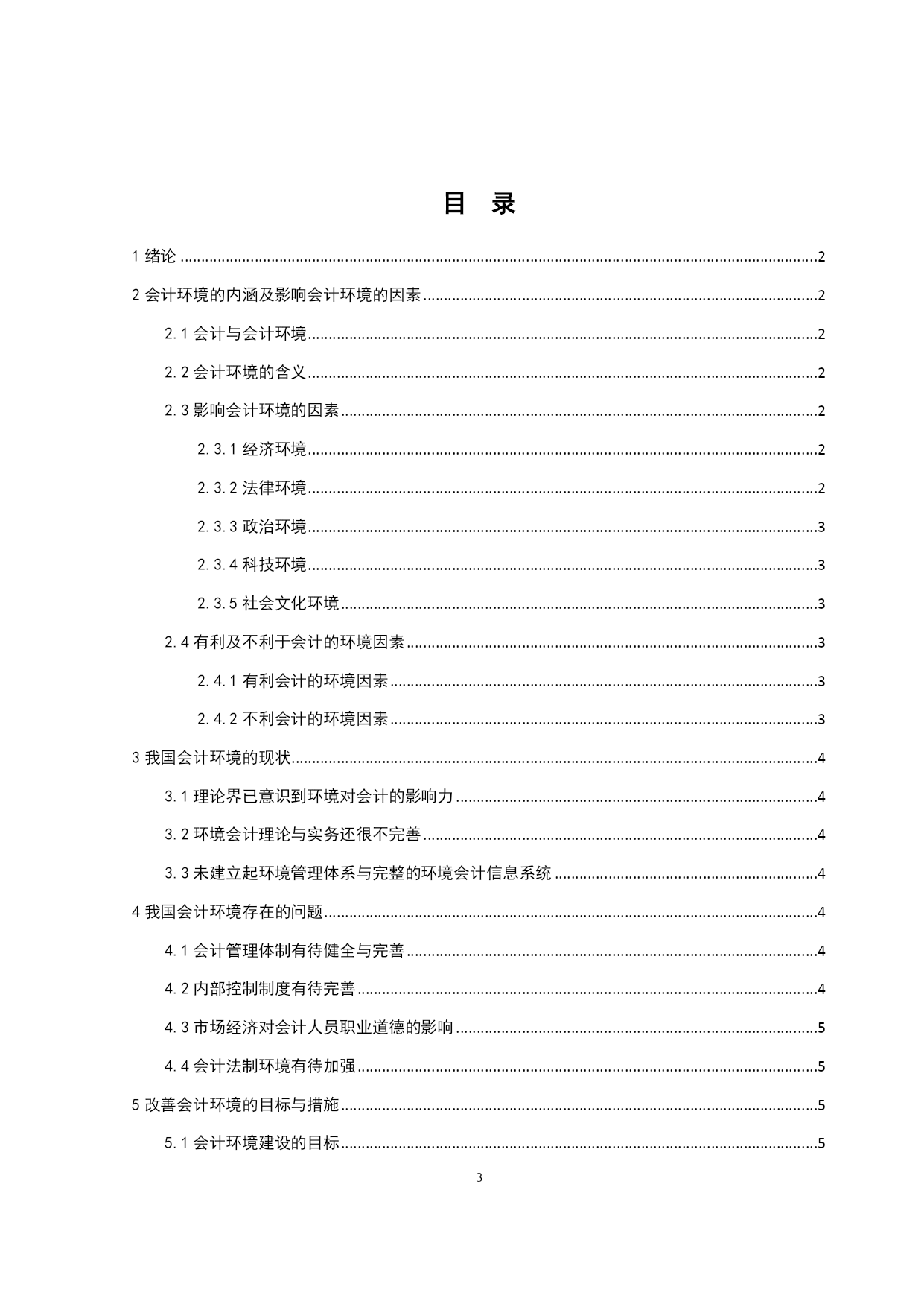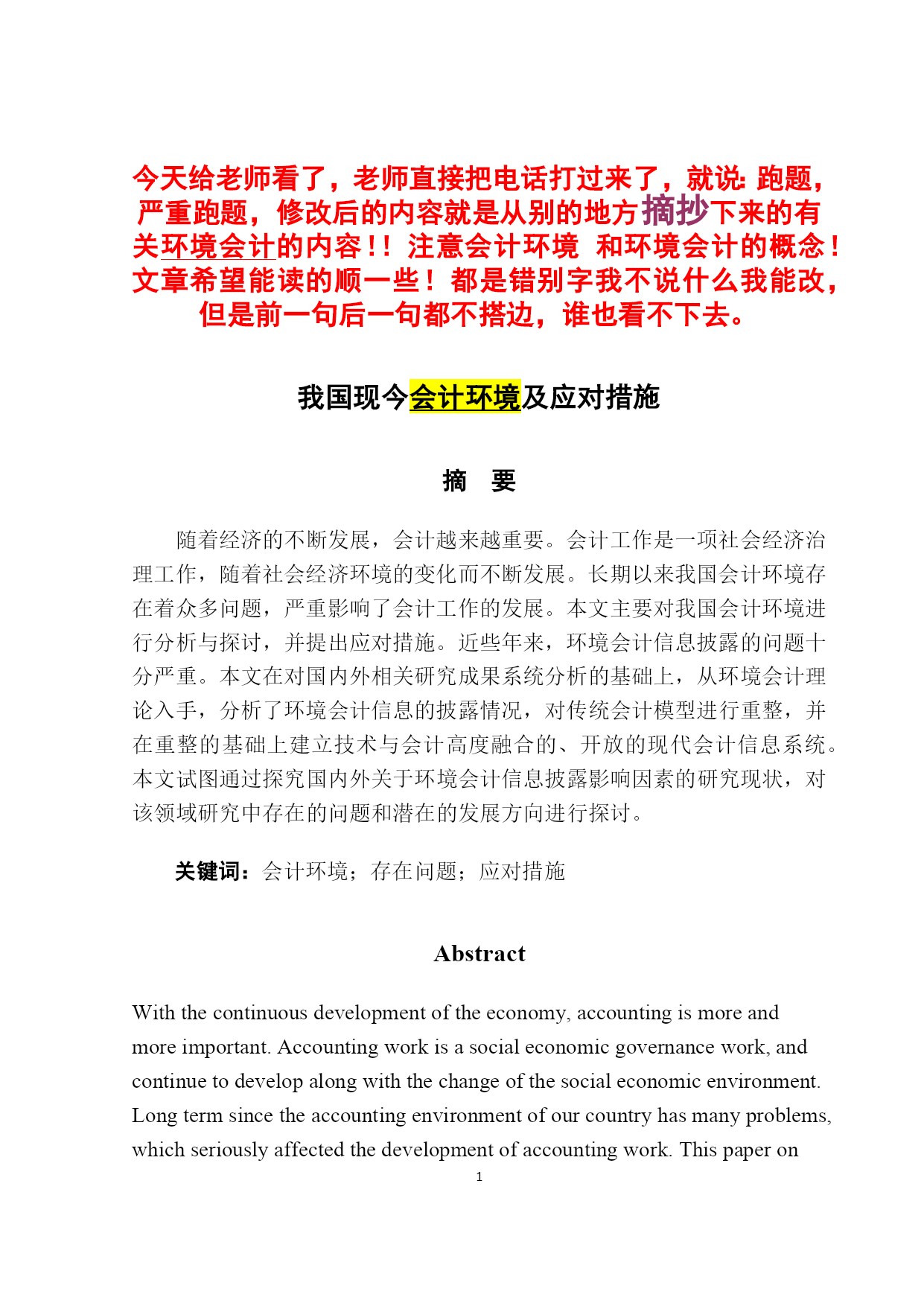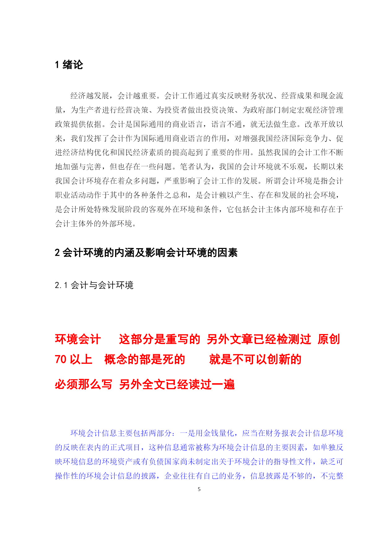 PAGE\*MERGEFORMAT17 今天给老师看了,老师直接把电话打过来了,就说:跑题,严重跑题,修改后的内容就是从别的地方摘抄下来的有关环境会计的内容!!注意会计环境和环境会计的概念!文章希望能读的顺一些!都是错别字我不说什么我能改,但是前一句后一句都不搭边,谁也看不下去。 我国现今会计环境及应对措施 摘要 随着经济的不断发展,会计越来越重要。会计工作是一项社会经济治理工作,随着社会经济环境的变化而不断发展。长期以来我国会计环境存在着众多问题,严重影响了会计工作的发展。本文主要对我国会计环境进行分析与探讨,并提出应对措施。近些年来,环境会计信息披露的问题十分严重。本文在对国内外相关研究成果系统分析的基础上,从环境会计理论入手,分析了环境会计信息的披露情况,对传统会计模型进行重整,并在重整的基础上建立技术与会计高度融合的、开放的现代会计信息系统。本文试图通过探究国内外关于环境会计信息披露影响因素的研究现状,对该领域研究中存在的问题和潜在的发展方向进行探讨。 关键词:会计环境;存在问题;应对措施 Abstract Withthecontinuousdevelopmentoftheeconomy,accountingismoreandmoreimportant.Accountingworkisasocialeconomicgovernancework,andcontinuetodevelopalongwiththechangeofthesocialeconomicenvironment.Longtermsincetheaccountingenvironmentofourcountryhasmanyproblems,whichseriouslyaffectedthedevelopmentofaccountingwork.ThispaperonChina'saccountingenvironmentanalysisanddiscussion,andputsforwardthecountermeasures. Keywords:environmentalaccounting;problems;Countermeasures 目录TOC\o"1-3"\h\z\u HYPERLINK\l"_Toc381386642"1绪论 PAGEREF_Toc381386642\h2 HYPERLINK\l"_Toc381386643"2会计环境的内涵及影响会计环境的因素 PAGEREF_Toc381386643\h2 HYPERLINK\l"_Toc381386644"2.1会计与会计环境 PAGEREF_Toc381386644\h2 HYPERLINK\l"_Toc381386645"2.2会计环境的含义 PAGEREF_Toc381386645\h2 HYPERLINK\l"_Toc381386646"2.3影响会计环境的因素 PAGEREF_Toc381386646\h2 HYPERLINK\l"_Toc381386647"2.3.1经济环境 PAGEREF_Toc381386647\h2 HYPERLINK\l"_Toc381386648"2.3.2法律环境 PAGEREF_Toc381386648\h2 HYPERLINK\l"_Toc381386649"2.3.3政治环境 PAGEREF_Toc381386649\h3 HYPERLINK\l"_Toc381386650"2.3.4科技环境 PAGEREF_Toc381386650\h3 HYPERLINK\l"_Toc381386651"2.3.5社会文化环境 PAGEREF_Toc381386651\h3 HYPERLINK\l"_Toc381386652"2.4有利及不利于会计的环境因素 PAGEREF_Toc381386652\h3 HYPERLINK\l"_Toc381386653"2.4.1有利会计的环境因素 PAGEREF_Toc381386653\h3 HYPERLINK\l"_Toc381386654"2.4.2不利会计的环境因素 PAGEREF_Toc381386654\h3 HYPERLINK\l"_Toc381386655"3我国会计环境的现状 PAGEREF_Toc381386655\h4 HYPERLINK\l"_Toc381386656"3.1理论界已意识到环境对会计的影响力 PAGEREF_Toc381386656\h4 HYPERLINK\l"_Toc3813