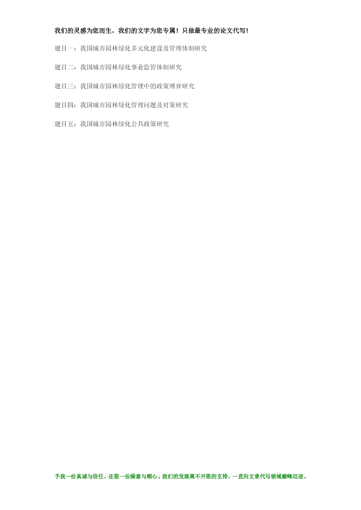 我们的灵感为您而生,我们的文字为您专属!只做最专业的论文代写! 予我一份真诚与信任,还您一份满意与顺心。我们的发展离不开您的支持,一直向文章代写领域巅峰迈进。 题目一:我国城市园林绿化多元化建设及管理体制研究 题目二:我国城市园林绿化事业监管体制研究 题目三:我国城市园林绿化管理中的政策博弈研究 题目四:我国城市园林绿化管理问题及对策研究 题目五:我国城市园林绿化公共政策研究