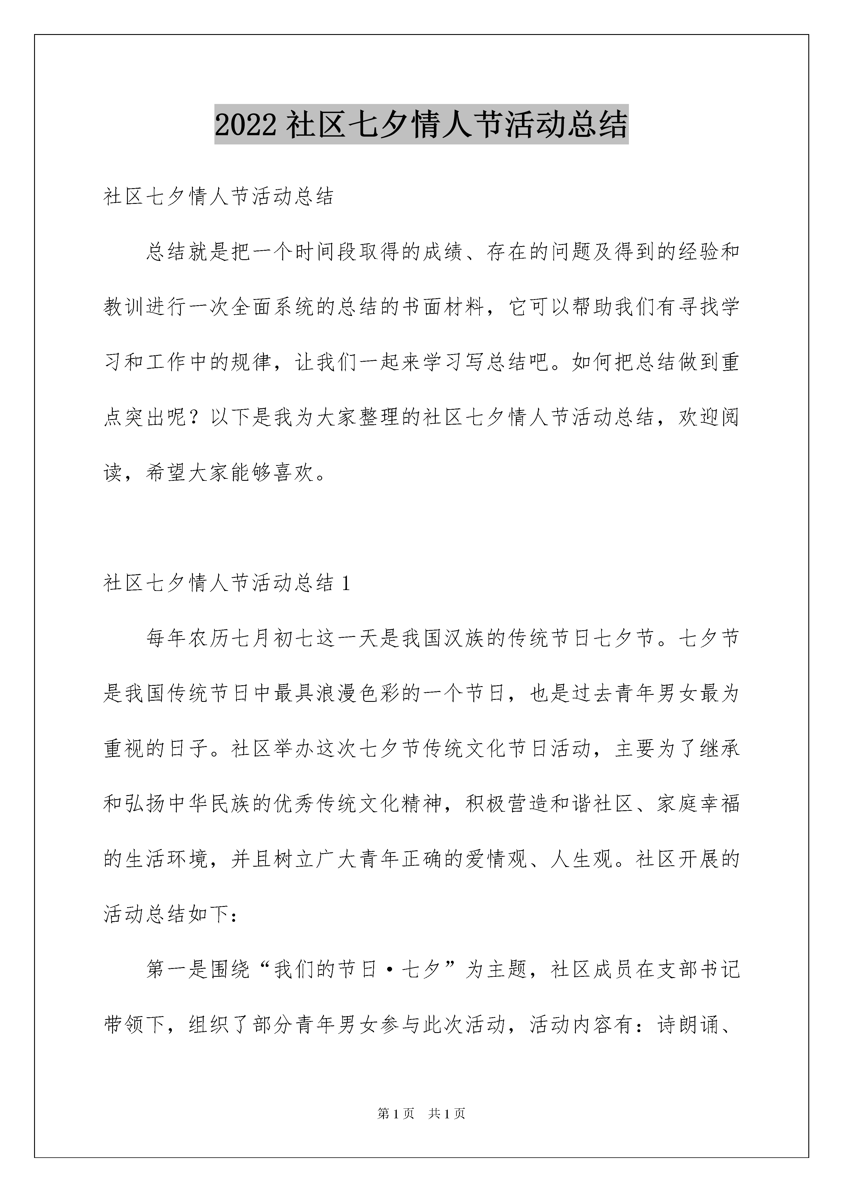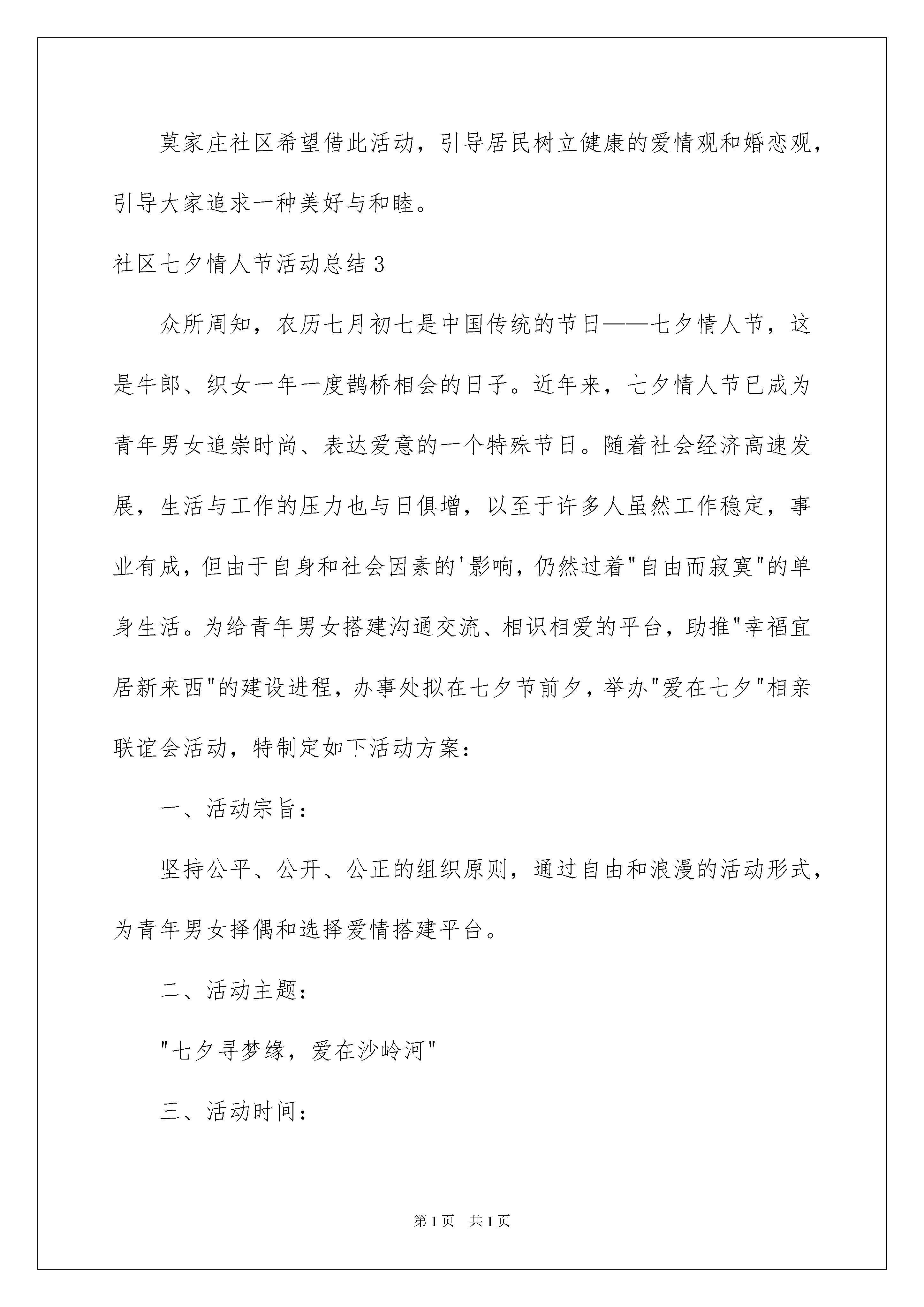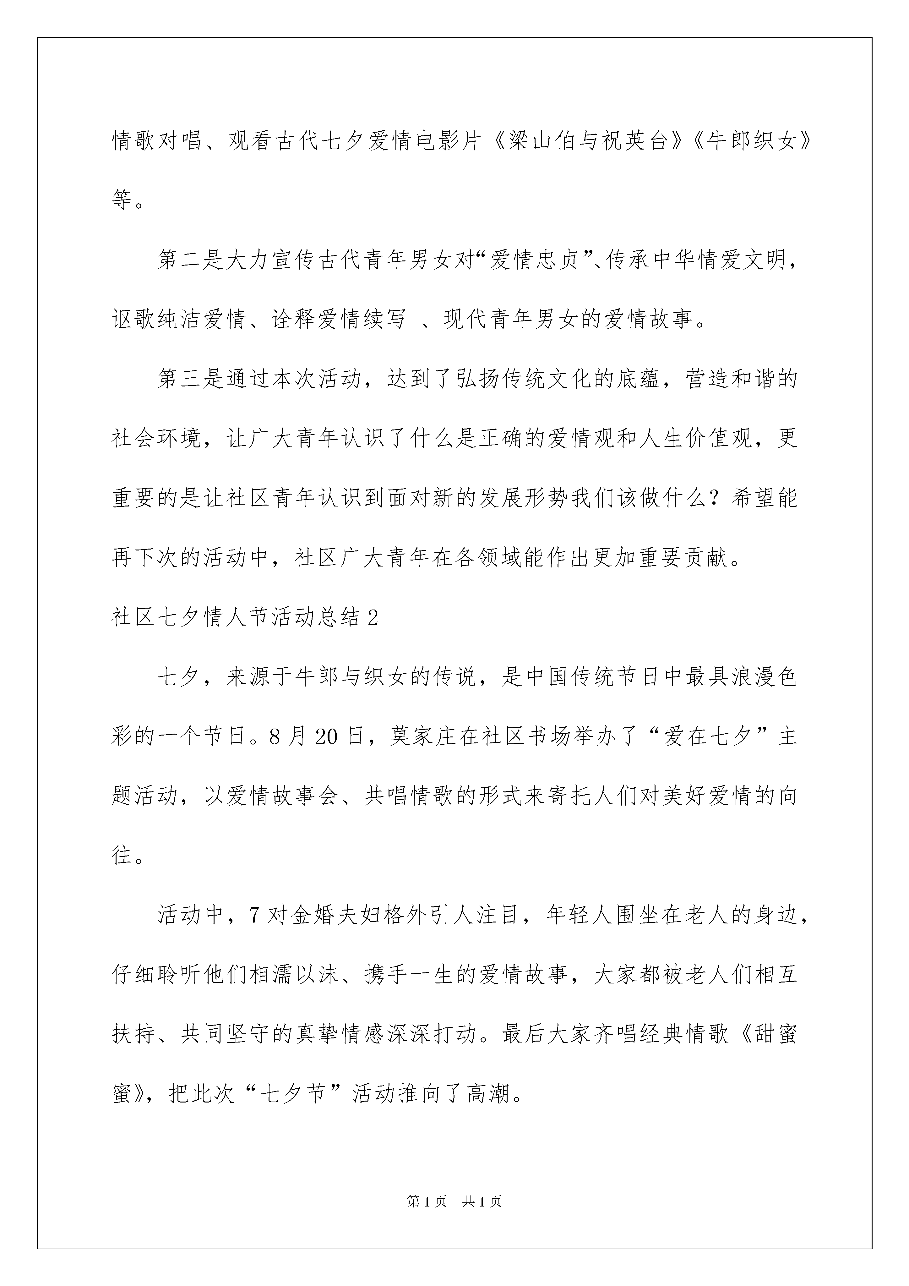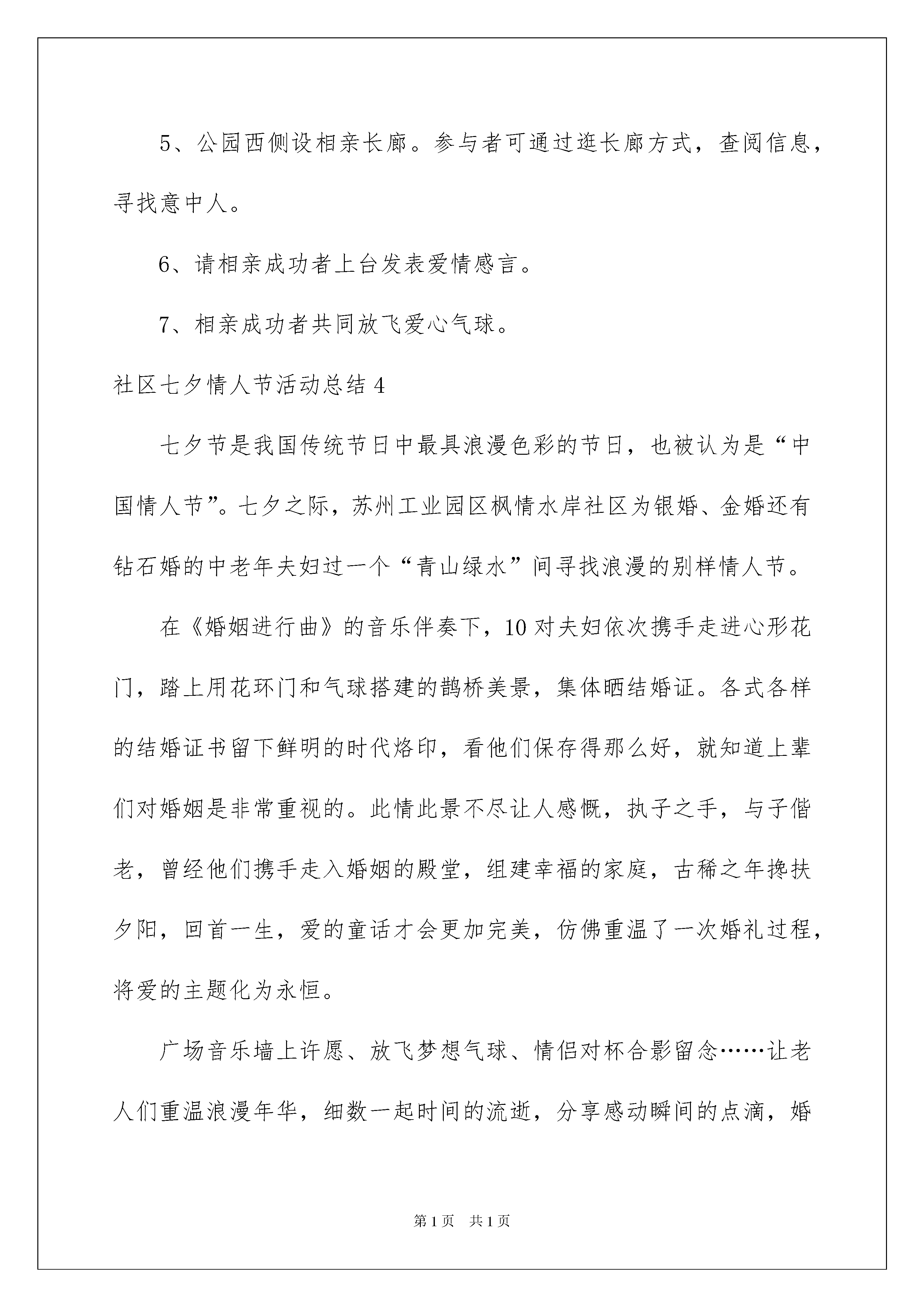 2022社区七夕情人节活动总结社区七夕情人节活动总结总结就是把一个时间段取得的成绩、存在的问题及得到的经验和教训进行一次全面系统的总结的书面材料,它可以帮助我们有寻找学习和工作中的规律,让我们一起来学习写总结吧。如何把总结做到重点突出呢?以下是我为大家整理的社区七夕情人节活动总结,欢迎阅读,希望大家能够喜欢。社区七夕情人节活动总结1每年农历七月初七这一天是我国汉族的传统节日七夕节。七夕节是我国传统节日中最具浪漫色彩的一个节日,也是过去青年男女最为重视的日子。社区举办这次七夕节传统文化节日活动,主要为了继承和弘扬中华民族的优秀传统文化精神,积极营造和谐社区、家庭幸福的生活环境,并且树立广大青年正确的爱情观、人生观。社区开展的活动总结如下:第一是围绕“我们的节日·七夕”为主题,社区成员在支部书记带领下,组织了部分青年男女参与此次活动,活动内容有:诗朗诵、情歌对唱、观看古代七夕爱情电影片《梁山伯与祝英台》《牛郎织女》等。第二是大力宣传古代青年男女对“爱情忠贞”、传承中华情爱文明,讴歌纯洁爱情、诠释爱情续写、现代青年男女的爱情故事。第三是通过本次活动,达到了弘扬传统文化的底蕴,营造和谐的社会环境,让广大青年认识了什么是正确的爱情观和人生价值观,更重要的是让社区青年认识到面对新的发展形势我们该做什么?希望能再下次的活动中,社区广大青年在各领域能作出更加重要贡献。社区七夕情人节活动总结2七夕,来源于牛郎与织女的传说,是中国传统节日中最具浪漫色彩的一个节日。8月20日,莫家庄在社区书场举办了“爱在七夕”主题活动,以爱情故事会、共唱情歌的形式来寄托人们对美好爱情的向往。活动中,7对金婚夫妇格外引人注目,年轻人围坐在老人的身边,仔细聆听他们相濡以沫、携手一生的爱情故事,大家都被老人们相互扶持、共同坚守的真挚情感深深打动。最后大家齐唱经典情歌《甜蜜蜜》,把此次“七夕节”活动推向了高潮。莫家庄社区希望借此活动,引导居民树立健康的爱情观和婚恋观,引导大家追求一种美好与和睦。社区七夕情人节活动总结3众所周知,农历七月初七是中国传统的节日——七夕情人节,这是牛郎、织女一年一度鹊桥相会的日子。近年来,七夕情人节已成为青年男女追崇时尚、表达爱意的一个特殊节日。随着社会经济高速发展,生活与工作的压力也与日俱增,以至于许多人虽然工作稳定,事业有成,但由于自身和社会因素的'影响,仍然过着"自由而寂寞"的单身生活。为给青年男女搭建沟通交流、相识相爱的平台,助推"幸福宜居新来西"的建设进程,办事处拟在七夕节前夕,举办"爱在七夕"相亲联谊会活动,特制定如下活动方案:一、活动宗旨:坚持公平、公开、公正的组织原则,通过自由和浪漫的活动形式,为青年男女择偶和选择爱情搭建平台。二、活动主题:"七夕寻梦缘,爱在沙岭河"三、活动时间:X月XX日四、活动地点:待定五、参与对象:在莱西市内工作和生活,年满20周岁,热爱生活、品行端正、遵纪守法、具有正确的婚恋观、职业相对稳定的青年男女均可报名。六、报名要求:(1)每个参加相亲大会的人需提供2张2寸免冠彩照,并填写报名表。(2)报名者需提供个人身份证、毕业证原件及复印件各2张。(3)采取近到各社区居委会办公室报名,再汇总到居管办的报名方式。七、相亲大会活动日程:1、主持人介绍活动形式、内容及参加人员活动区域划分。2、水集街道XXX同志致辞。3、文艺演出。4、猜谜者到谜语区参与有奖竞猜、交友、设兑奖区。5、公园西侧设相亲长廊。参与者可通过逛长廊方式,查阅信息,寻找意中人。6、请相亲成功者上台发表爱情感言。7、相亲成功者共同放飞爱心气球。社区七夕情人节活动总结4七夕节是我国传统节日中最具浪漫色彩的节日,也被认为是“中国情人节”。七夕之际,苏州工业园区枫情水岸社区为银婚、金婚还有钻石婚的中老年夫妇过一个“青山绿水”间寻找浪漫的别样情人节。在《婚姻进行曲》的音乐伴奏下,10对夫妇依次携手走进心形花门,踏上用花环门和气球搭建的鹊桥美景,集体晒结婚证。各式各样的结婚证书留下鲜明的时代烙印,看他们保存得那么好,就知道上辈们对婚姻是非常重视的。此情此景不尽让人感慨,执子之手,与子偕老,曾经他们携手走入婚姻的殿堂,组建幸福的家庭,古稀之年搀扶夕阳,回首一生,爱的童话才会更加完美,仿佛重温了一次婚礼过程,将爱的主题化为永恒。广场音乐墙上许愿、放飞梦想气球、情侣对杯合影留念……让老人们重温浪漫年华,细数一起时间的流逝,分享感动瞬间的点滴,婚姻就像一坛老酒,时间越长久越醇香。喻梦龙老夫妇已经有六十周年的婚龄,迈入人生难得最隆重庆典钻石婚;冯文虎夫妇也有54周年婚龄,名副其实的金婚老人。而今又到七夕,感受身边
