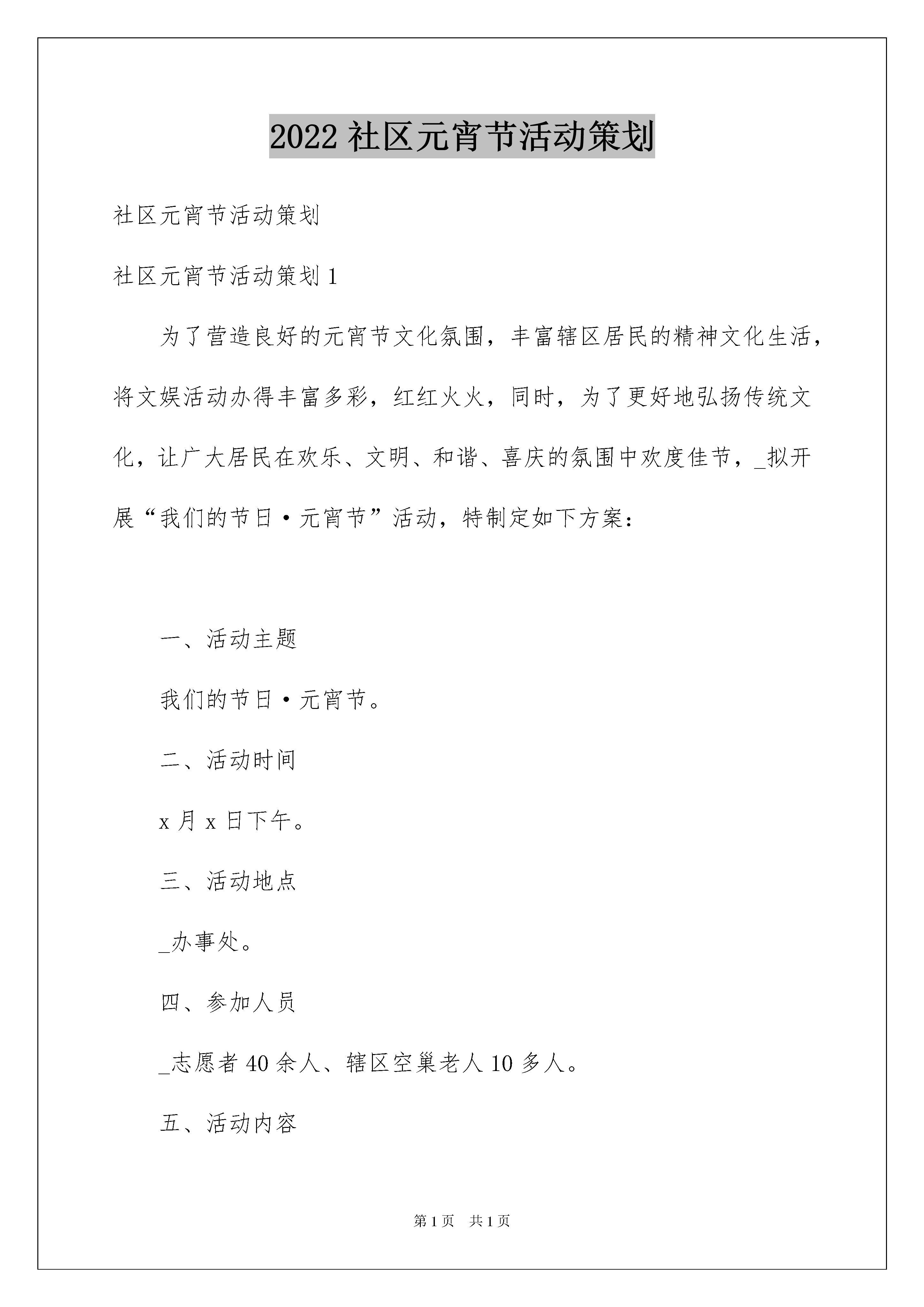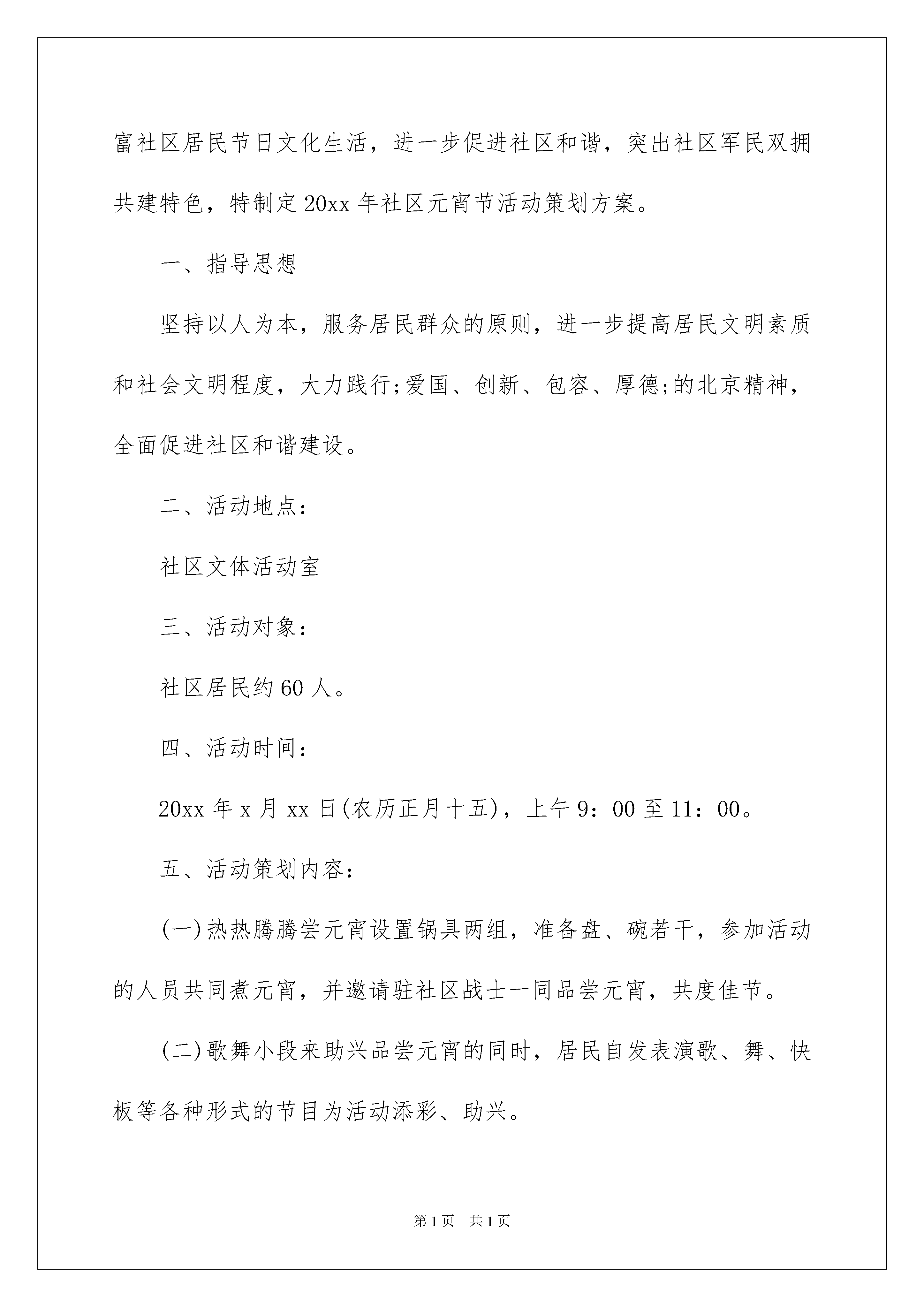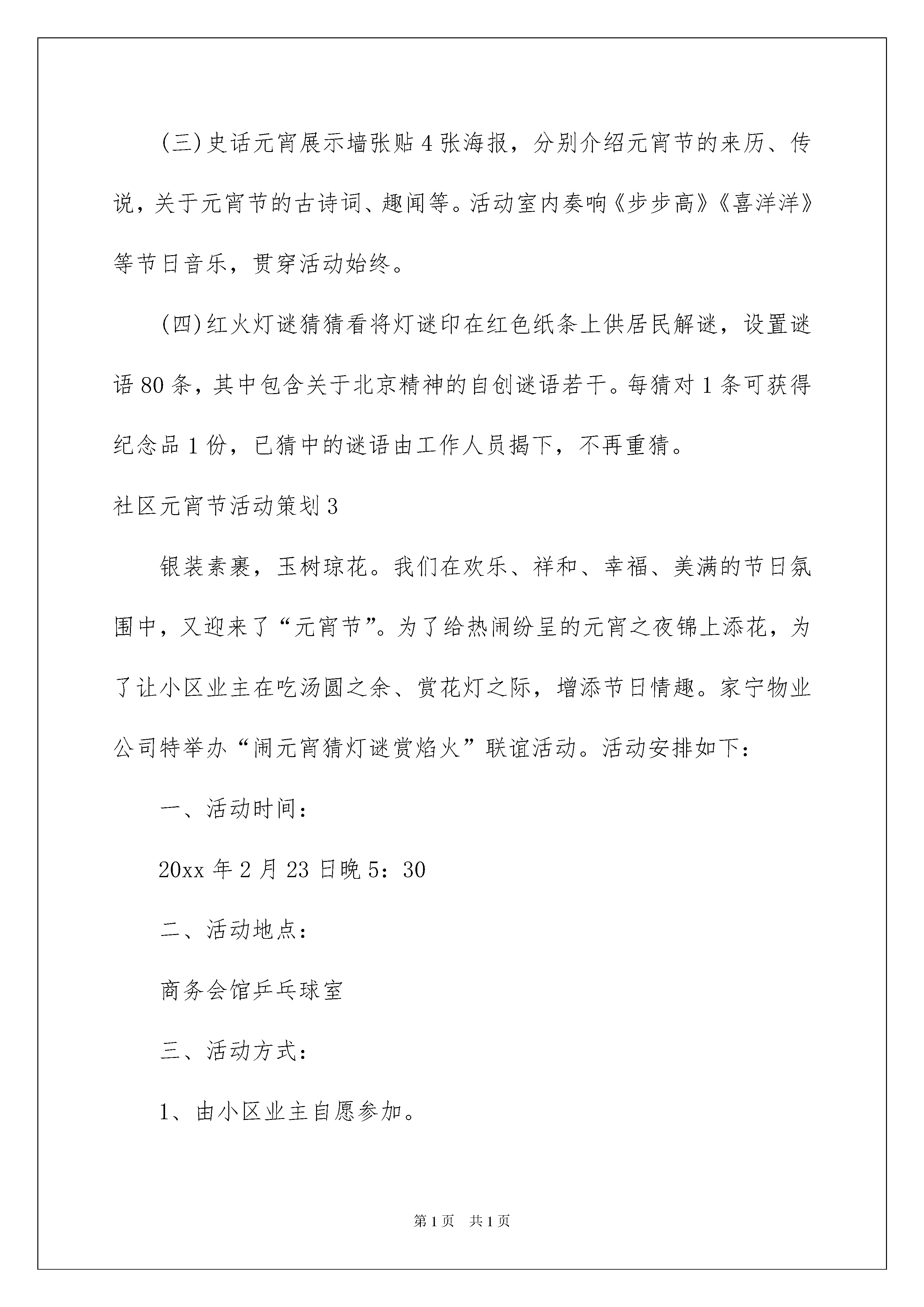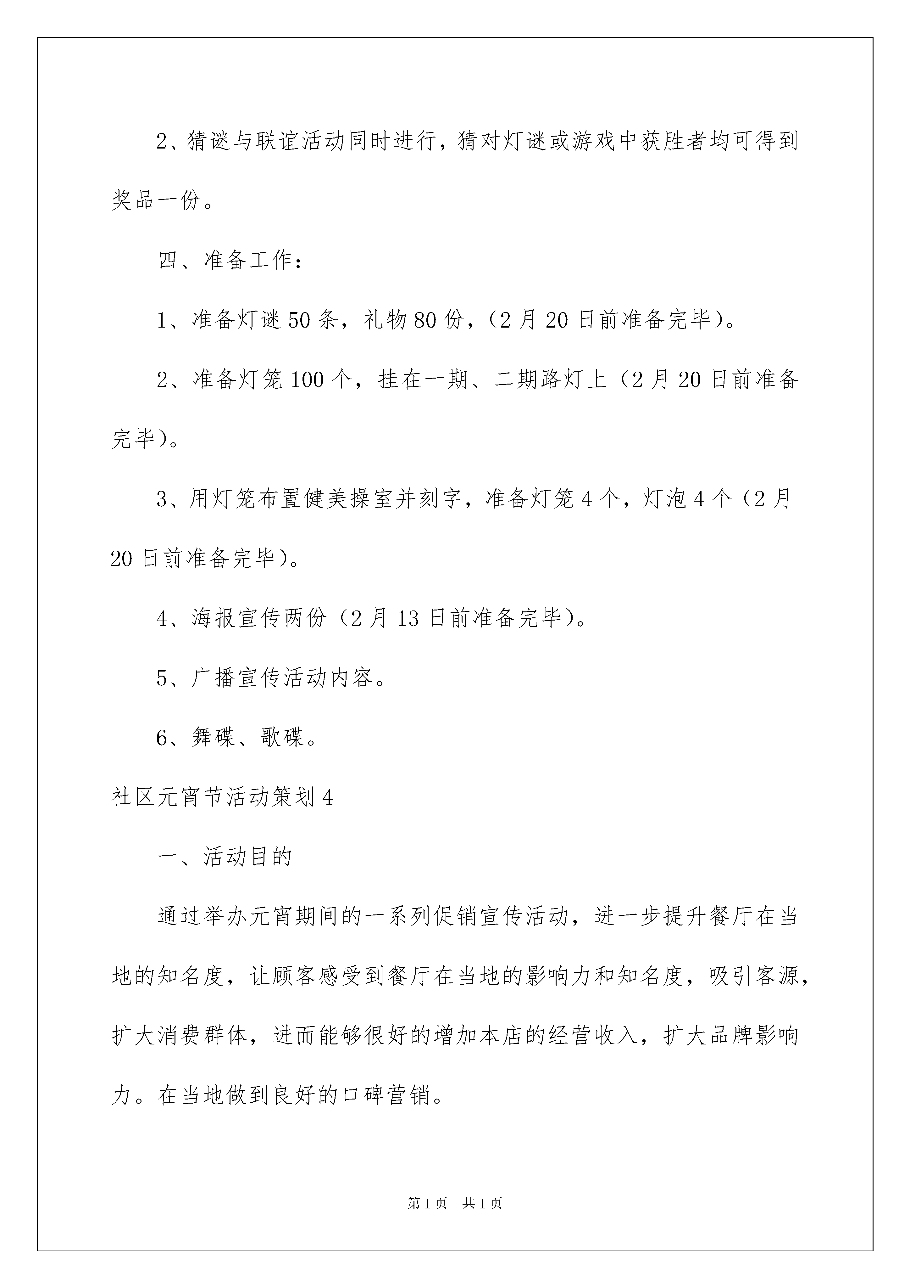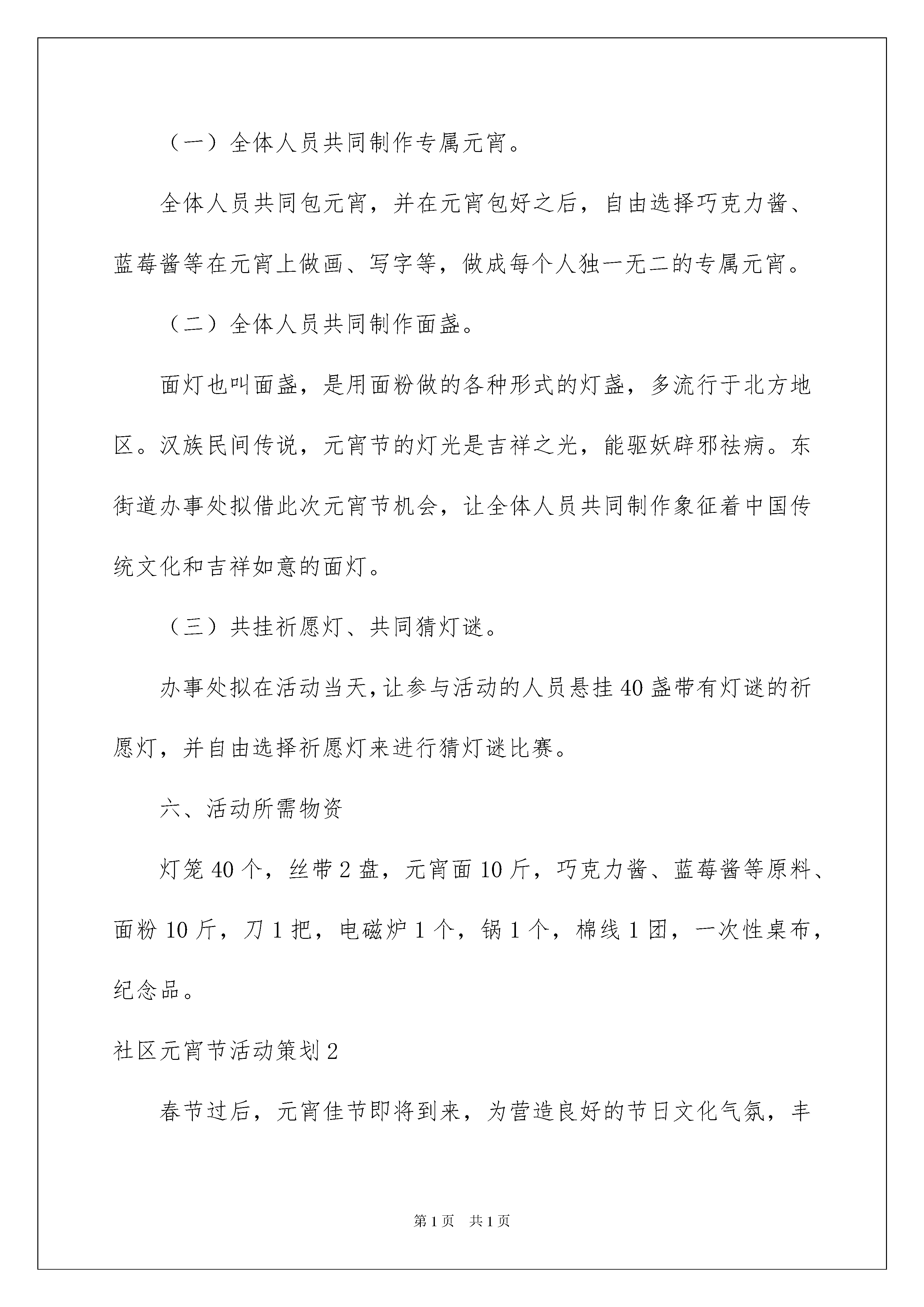 2022社区元宵节活动策划社区元宵节活动策划社区元宵节活动策划1为了营造良好的元宵节文化氛围,丰富辖区居民的精神文化生活,将文娱活动办得丰富多彩,红红火火,同时,为了更好地弘扬传统文化,让广大居民在欢乐、文明、和谐、喜庆的氛围中欢度佳节,_拟开展“我们的节日·元宵节”活动,特制定如下方案:一、活动主题我们的节日·元宵节。二、活动时间x月x日下午。三、活动地点_办事处。四、参加人员_志愿者40余人、辖区空巢老人10多人。五、活动内容(一)全体人员共同制作专属元宵。全体人员共同包元宵,并在元宵包好之后,自由选择巧克力酱、蓝莓酱等在元宵上做画、写字等,做成每个人独一无二的专属元宵。(二)全体人员共同制作面盏。面灯也叫面盏,是用面粉做的各种形式的灯盏,多流行于北方地区。汉族民间传说,元宵节的灯光是吉祥之光,能驱妖辟邪祛病。东街道办事处拟借此次元宵节机会,让全体人员共同制作象征着中国传统文化和吉祥如意的面灯。(三)共挂祈愿灯、共同猜灯谜。办事处拟在活动当天,让参与活动的人员悬挂40盏带有灯谜的祈愿灯,并自由选择祈愿灯来进行猜灯谜比赛。六、活动所需物资灯笼40个,丝带2盘,元宵面10斤,巧克力酱、蓝莓酱等原料、面粉10斤,刀1把,电磁炉1个,锅1个,棉线1团,一次性桌布,纪念品。社区元宵节活动策划2春节过后,元宵佳节即将到来,为营造良好的节日文化气氛,丰富社区居民节日文化生活,进一步促进社区和谐,突出社区军民双拥共建特色,特制定20xx年社区元宵节活动策划方案。一、指导思想坚持以人为本,服务居民群众的原则,进一步提高居民文明素质和社会文明程度,大力践行;爱国、创新、包容、厚德;的北京精神,全面促进社区和谐建设。二、活动地点:社区文体活动室三、活动对象:社区居民约60人。四、活动时间:20xx年x月xx日(农历正月十五),上午9:00至11:00。五、活动策划内容:(一)热热腾腾尝元宵设置锅具两组,准备盘、碗若干,参加活动的人员共同煮元宵,并邀请驻社区战士一同品尝元宵,共度佳节。(二)歌舞小段来助兴品尝元宵的同时,居民自发表演歌、舞、快板等各种形式的节目为活动添彩、助兴。(三)史话元宵展示墙张贴4张海报,分别介绍元宵节的来历、传说,关于元宵节的古诗词、趣闻等。活动室内奏响《步步高》《喜洋洋》等节日音乐,贯穿活动始终。(四)红火灯谜猜猜看将灯谜印在红色纸条上供居民解谜,设置谜语80条,其中包含关于北京精神的自创谜语若干。每猜对1条可获得纪念品1份,已猜中的谜语由工作人员揭下,不再重猜。社区元宵节活动策划3银装素裹,玉树琼花。我们在欢乐、祥和、幸福、美满的节日氛围中,又迎来了“元宵节”。为了给热闹纷呈的元宵之夜锦上添花,为了让小区业主在吃汤圆之余、赏花灯之际,增添节日情趣。家宁物业公司特举办“闹元宵猜灯谜赏焰火”联谊活动。活动安排如下:一、活动时间:20xx年2月23日晚5:30二、活动地点:商务会馆乒乓球室三、活动方式:1、由小区业主自愿参加。2、猜谜与联谊活动同时进行,猜对灯谜或游戏中获胜者均可得到奖品一份。四、准备工作:1、准备灯谜50条,礼物80份,(2月20日前准备完毕)。2、准备灯笼100个,挂在一期、二期路灯上(2月20日前准备完毕)。3、用灯笼布置健美操室并刻字,准备灯笼4个,灯泡4个(2月20日前准备完毕)。4、海报宣传两份(2月13日前准备完毕)。5、广播宣传活动内容。6、舞碟、歌碟。社区元宵节活动策划4一、活动目的通过举办元宵期间的一系列促销宣传活动,进一步提升餐厅在当地的知名度,让顾客感受到餐厅在当地的影响力和知名度,吸引客源,扩大消费群体,进而能够很好的增加本店的经营收入,扩大品牌影响力。在当地做到良好的口碑营销。二、活动内容根据元宵期间的节日特点,选择适合自己的促销方式。三、店内装饰、气氛1、餐厅店面贴一些与元宵相关的图片及店内的宣传促销内容海报,以红色为主,突出节日的喜庆氛围。2、由餐厅在周末分别布置礼品展台,对就餐客人进行有针对性的促销工作。3、从2月初开始每天的午、晚在店内一定时间段内播放相关的宣传资料。四、广告宣传1、宣传单张。2、报纸广告。3、海报制作。解释说明:有广告宣传需要的加盟店可提前与企划部联系,配合其制作宣传效果图,并提前做好广告预热宣传。五、促销分工1、宣传单的派发由相关部门完成。2、散客、常客预订工作由各店面具体负责。3、促销及预订工作由店经理全面负责。六、具体促销活动1、“大型团体餐促销活动”活动内容:活动期间,凡是到本店就餐的顾客,可以根据相应的人数享受不同的优惠(正月十五当日除外)。2人——4人可以享受9折优惠。5人——8人可以享受