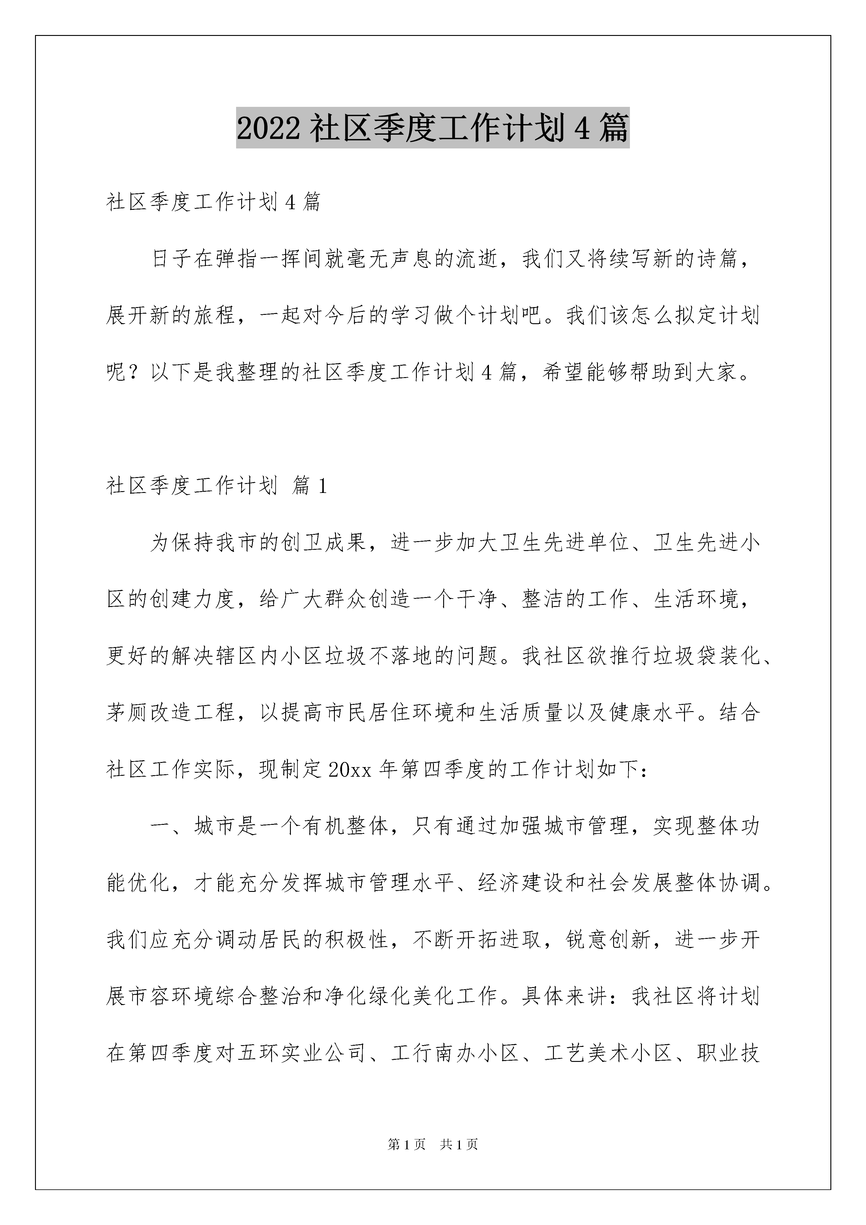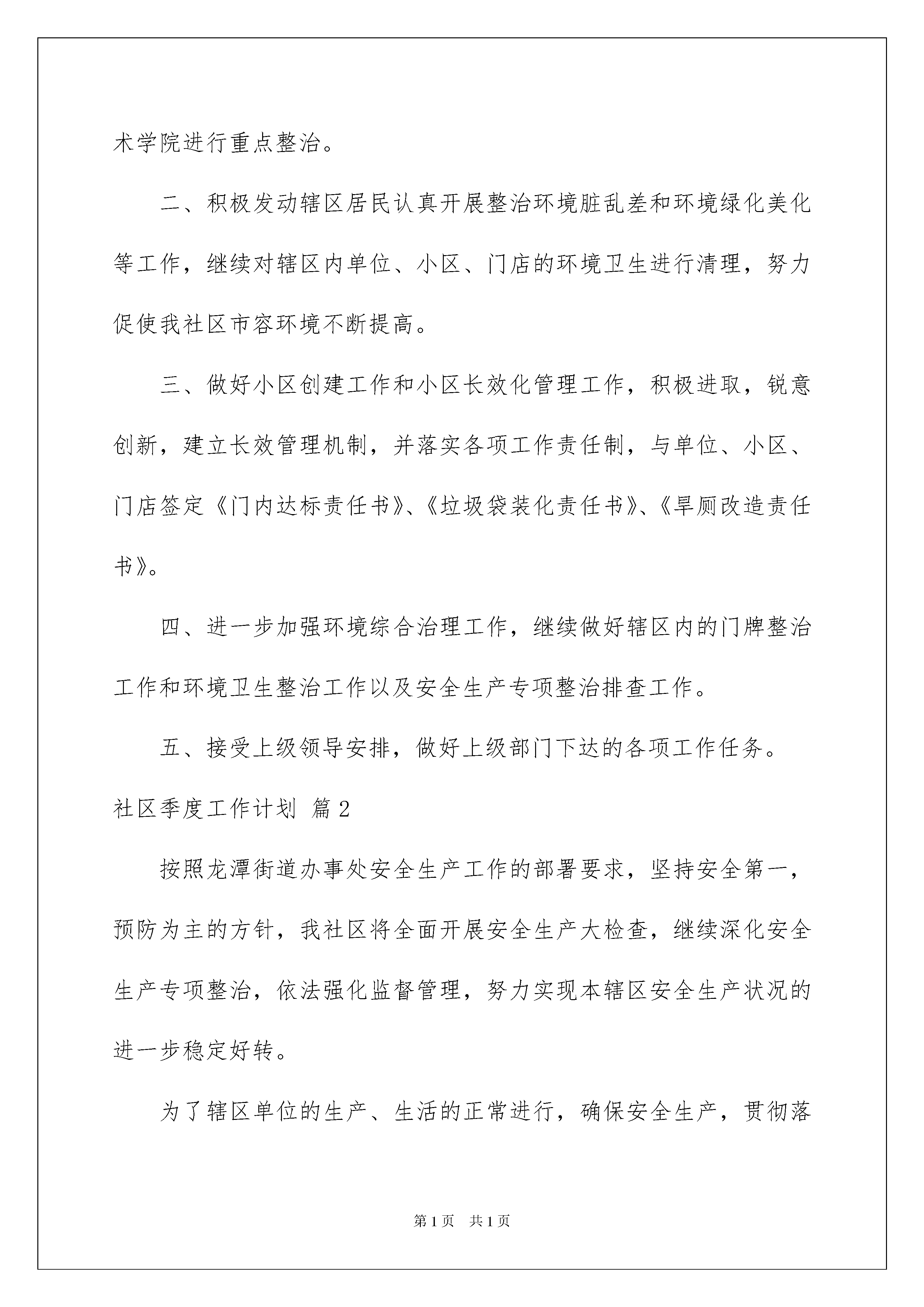 2022社区季度工作计划4篇社区季度工作计划4篇日子在弹指一挥间就毫无声息的流逝,我们又将续写新的诗篇,展开新的旅程,一起对今后的学习做个计划吧。我们该怎么拟定计划呢?以下是我整理的社区季度工作计划4篇,希望能够帮助到大家。社区季度工作计划篇1为保持我市的创卫成果,进一步加大卫生先进单位、卫生先进小区的创建力度,给广大群众创造一个干净、整洁的工作、生活环境,更好的解决辖区内小区垃圾不落地的问题。我社区欲推行垃圾袋装化、茅厕改造工程,以提高市民居住环境和生活质量以及健康水平。结合社区工作实际,现制定20xx年第四季度的工作计划如下:一、城市是一个有机整体,只有通过加强城市管理,实现整体功能优化,才能充分发挥城市管理水平、经济建设和社会发展整体协调。我们应充分调动居民的积极性,不断开拓进取,锐意创新,进一步开展市容环境综合整治和净化绿化美化工作。具体来讲:我社区将计划在第四季度对五环实业公司、工行南办小区、工艺美术小区、职业技术学院进行重点整治。二、积极发动辖区居民认真开展整治环境脏乱差和环境绿化美化等工作,继续对辖区内单位、小区、门店的环境卫生进行清理,努力促使我社区市容环境不断提高。三、做好小区创建工作和小区长效化管理工作,积极进取,锐意创新,建立长效管理机制,并落实各项工作责任制,与单位、小区、门店签定《门内达标责任书》、《垃圾袋装化责任书》、《旱厕改造责任书》。四、进一步加强环境综合治理工作,继续做好辖区内的门牌整治工作和环境卫生整治工作以及安全生产专项整治排查工作。五、接受上级领导安排,做好上级部门下达的各项工作任务。社区季度工作计划篇2按照龙潭街道办事处安全生产工作的部署要求,坚持安全第一,预防为主的方针,我社区将全面开展安全生产大检查,继续深化安全生产专项整治,依法强化监督管理,努力实现本辖区安全生产状况的进一步稳定好转。为了辖区单位的生产、生活的正常进行,确保安全生产,贯彻落实安全生产目标责任制,层层落实责任制,加强对社区单位安全生产的监督和管理,确保社区稳定,更好地开展安全生产工作、特制定安全生产工作计划如下:一、加强领导,全面落实安全生产责任。切实把安全生产摆在重要的议事日程,要把安全生产放在重要位置,强化推进安全生产工作,切实抓好安全生产工作的落实。二、继续加大安全的宣传、学习、教育,从而形成人人重视安全、人人参与到安全的活动中。积极配合上级有关文件和会议精神,切实做好安全生产宣传工作,坚持打赢预防为主的胜利战,切实增强员工的安全生产法制观念,做到人人讲安全,事事保安全,继续深化安全生产宣传活动,进一步完善形式,丰富内容,增强实效。1、社区居委会安全员负责对国家的法律法规宣传,及时对辖区内各单位和个体户的安全生产工作进行监督、检查,对于重点部位的安全管理,进行双重管理,杜绝重大恶性事故的发生。2、按要求对辖区企业职工进行专业培训,保证专业技术人员经培训考核过合格持证上岗。安全员进行现场检查,发现有危及职工安全健康的情况,有权要求立即改正,或限期解决,情况紧急时,有权要求立即从危险区内撤除作业人员;停止生产;对违反安全规定的领导和职工有权制止作业,提出处罚建议;发生事故后,有权直接参加调查,按规定进行处理。三、标本兼治,认真做好安全生产隐患排查工作要牢固树立安全防范意识,对发现的隐患特别是重大隐患,要加大投入,不仅治标,更要治本。进一步完善安全生产的`工作机制。对影响安全生产的隐患和问题进行全面排查整治,做到排查不留死角,重大隐患及时消除,实现排查治理工作的经常化、制度化。对于排查出的各类隐患,要按照定措施、定标准、定期限、定责任人的要求分类治理坚决整改。四、继续加大打非治违力度,保障人民群众生命财产安全。加强对烟花爆竹及危险化学品经营的管理,严厉打击非法制、售、运输、储藏烟花爆竹和危险化学品行为,有效遏制各类事故的发生,保障人民群众生命财产安全。社区季度工作计划篇3一、着力践行群众路线活动我村将以“钉钉子”精神狠抓整改落实,认真制定整改方案,确保教育实践活动取得实效。一是需持之以恒抓好学习教育,保证活动取得实效、不走过场;二是进一步找准“四风”突出问题,坚持不懈改进作风;三是立行立改抓好整改落实,对查摆出来的问题,逐项研究、细化解决方案,一项项兑现落实;四是善始善终抓好教育实践活动,把制度建设作为解决“四风”问题的治本之策;五是全面加强村“两委”班子自身建设,注重密切联系群众,做到为民务实清廉,解决服务群众“最后一公里”问题。二、真正打好“黄赌毒”持久战我村将继续打好清查“黄赌毒”持久战,不断净化社会风气和增强社会安全感。一是组织人员每天排查出租屋、小商