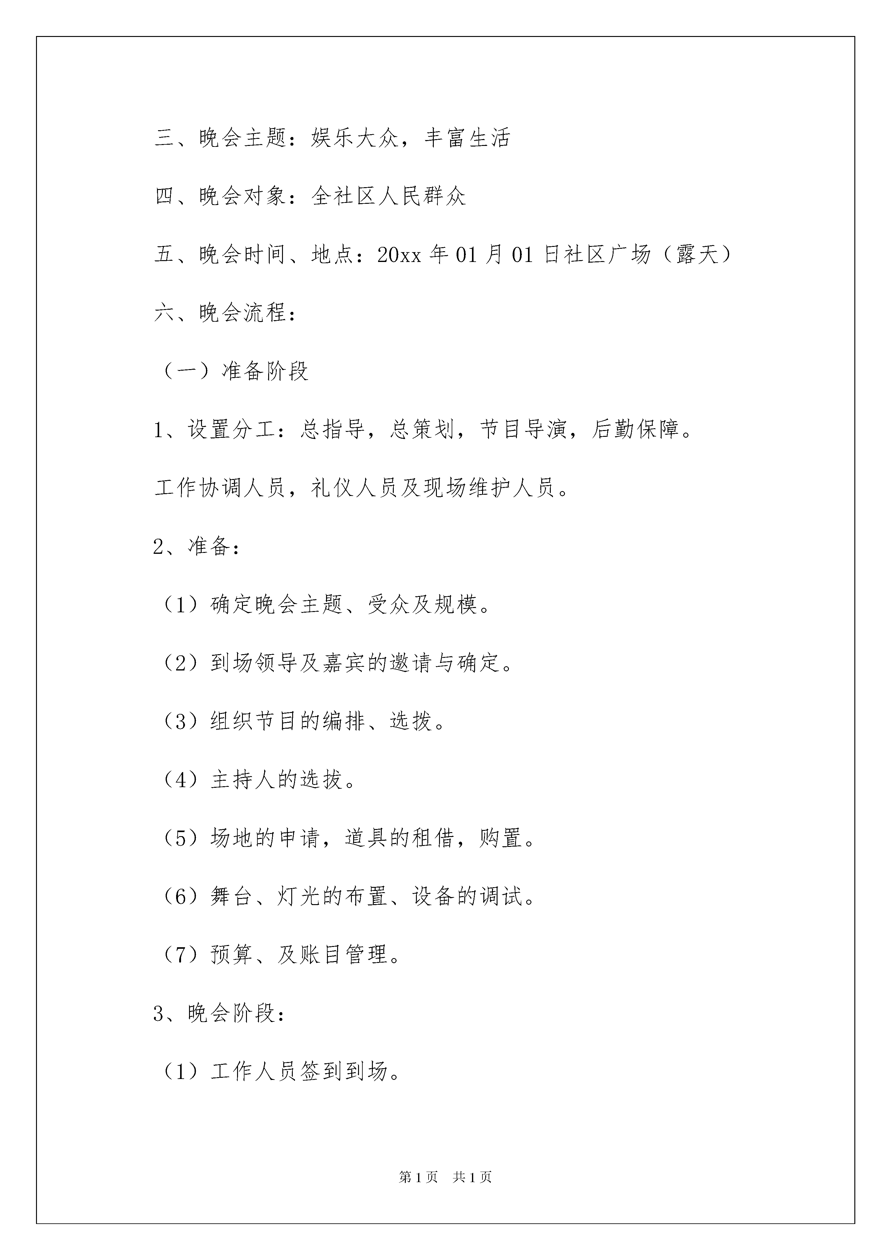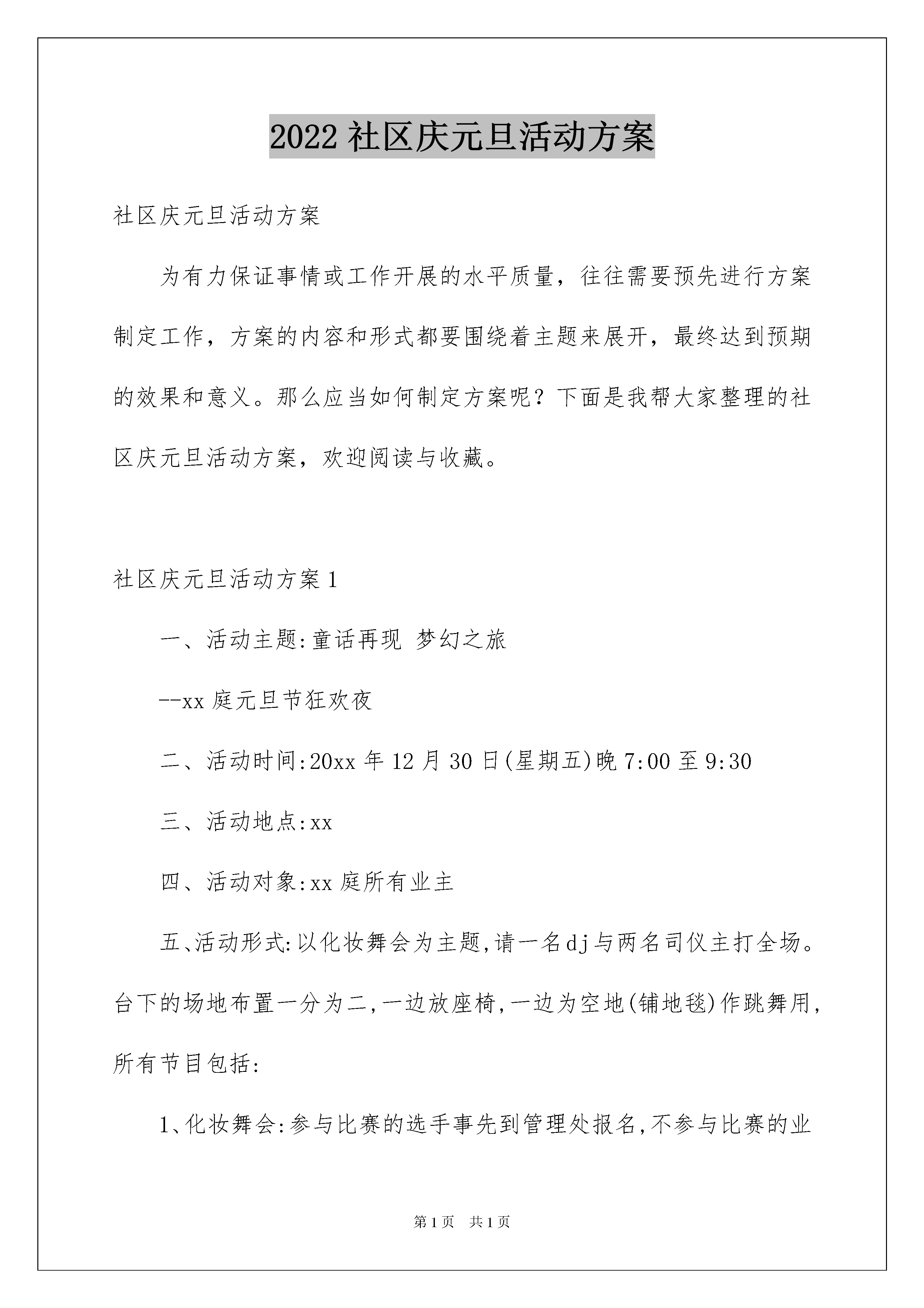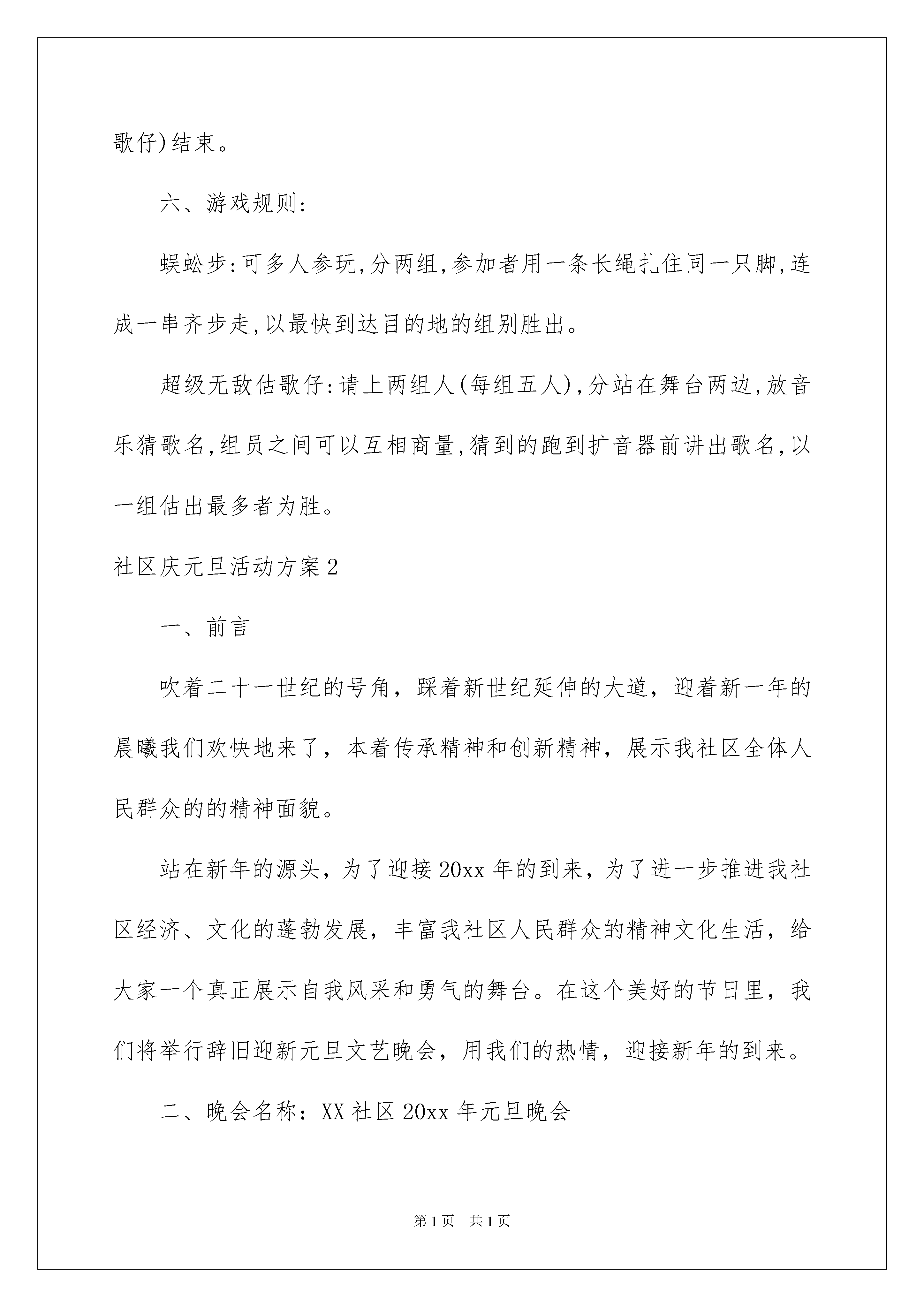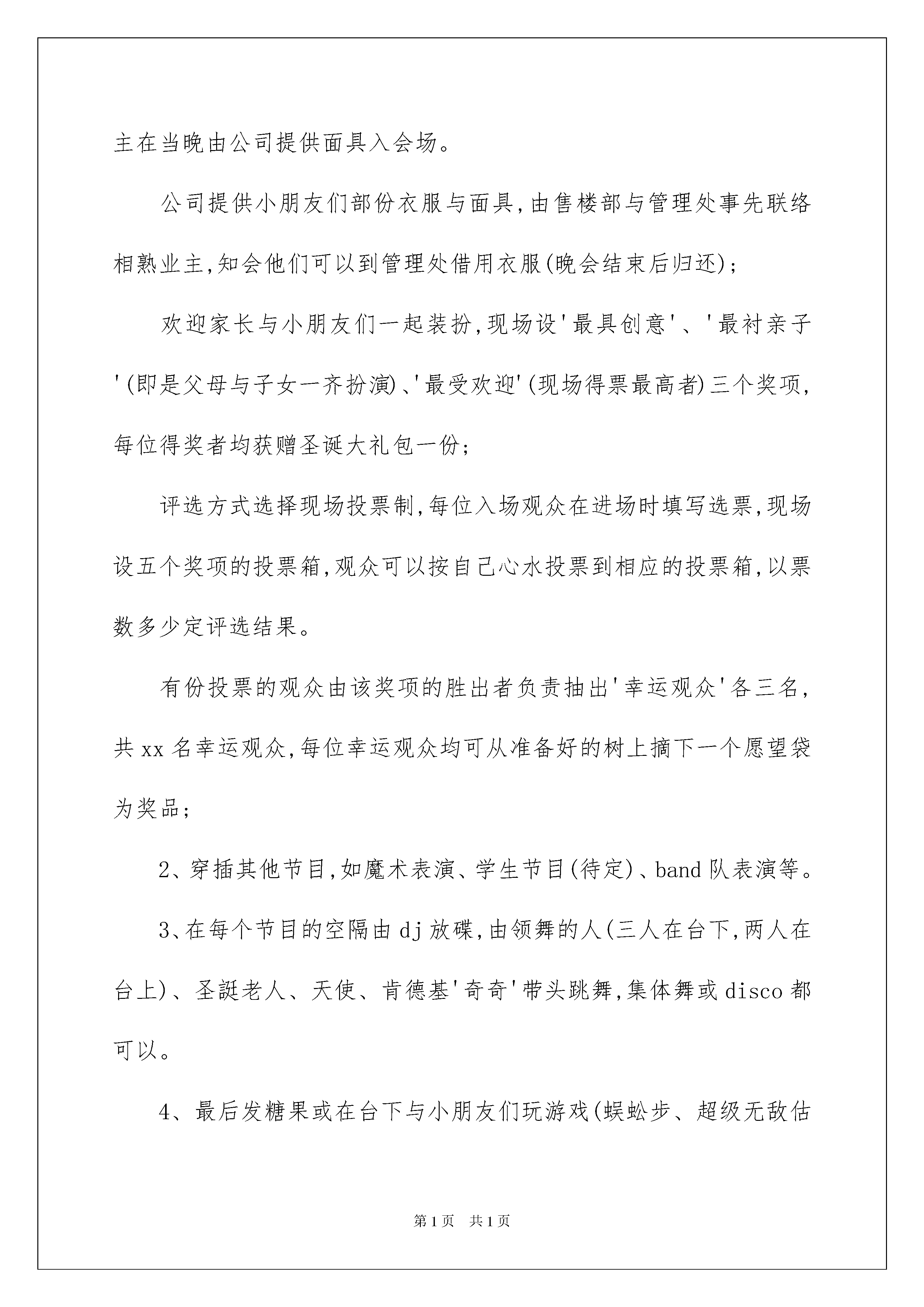 2022社区庆元旦活动方案社区庆元旦活动方案为有力保证事情或工作开展的水平质量,往往需要预先进行方案制定工作,方案的内容和形式都要围绕着主题来展开,最终达到预期的效果和意义。那么应当如何制定方案呢?下面是我帮大家整理的社区庆元旦活动方案,欢迎阅读与收藏。社区庆元旦活动方案1一、活动主题:童话再现梦幻之旅--xx庭元旦节狂欢夜二、活动时间:20xx年12月30日(星期五)晚7:00至9:30三、活动地点:xx四、活动对象:xx庭所有业主五、活动形式:以化妆舞会为主题,请一名dj与两名司仪主打全场。台下的场地布置一分为二,一边放座椅,一边为空地(铺地毯)作跳舞用,所有节目包括:1、化妆舞会:参与比赛的选手事先到管理处报名,不参与比赛的业主在当晚由公司提供面具入会场。公司提供小朋友们部份衣服与面具,由售楼部与管理处事先联络相熟业主,知会他们可以到管理处借用衣服(晚会结束后归还);欢迎家长与小朋友们一起装扮,现场设'最具创意'、'最衬亲子'(即是父母与子女一齐扮演)、'最受欢迎'(现场得票最高者)三个奖项,每位得奖者均获赠圣诞大礼包一份;评选方式选择现场投票制,每位入场观众在进场时填写选票,现场设五个奖项的投票箱,观众可以按自己心水投票到相应的投票箱,以票数多少定评选结果。有份投票的观众由该奖项的胜出者负责抽出'幸运观众'各三名,共xx名幸运观众,每位幸运观众均可从准备好的树上摘下一个愿望袋为奖品;2、穿插其他节目,如魔术表演、学生节目(待定)、band队表演等。3、在每个节目的空隔由dj放碟,由领舞的人(三人在台下,两人在台上)、圣誔老人、天使、肯德基'奇奇'带头跳舞,集体舞或disco都可以。4、最后发糖果或在台下与小朋友们玩游戏(蜈蚣步、超级无敌估歌仔)结束。六、游戏规则:蜈蚣步:可多人参玩,分两组,参加者用一条长绳扎住同一只脚,连成一串齐步走,以最快到达目的地的组别胜出。超级无敌估歌仔:请上两组人(每组五人),分站在舞台两边,放音乐猜歌名,组员之间可以互相商量,猜到的跑到扩音器前讲出歌名,以一组估出最多者为胜。社区庆元旦活动方案2一、前言吹着二十一世纪的号角,踩着新世纪延伸的大道,迎着新一年的晨曦我们欢快地来了,本着传承精神和创新精神,展示我社区全体人民群众的的精神面貌。站在新年的源头,为了迎接20xx年的到来,为了进一步推进我社区经济、文化的蓬勃发展,丰富我社区人民群众的精神文化生活,给大家一个真正展示自我风采和勇气的舞台。在这个美好的节日里,我们将举行辞旧迎新元旦文艺晚会,用我们的热情,迎接新年的到来。二、晚会名称:XX社区20xx年元旦晚会三、晚会主题:娱乐大众,丰富生活四、晚会对象:全社区人民群众五、晚会时间、地点:20xx年01月01日社区广场(露天)六、晚会流程:(一)准备阶段1、设置分工:总指导,总策划,节目导演,后勤保障。工作协调人员,礼仪人员及现场维护人员。2、准备:(1)确定晚会主题、受众及规模。(2)到场领导及嘉宾的邀请与确定。(3)组织节目的编排、选拨。(4)主持人的选拔。(5)场地的申请,道具的租借,购置。(6)舞台、灯光的布置、设备的调试。(7)预算、及账目管理。3、晚会阶段:(1)工作人员签到到场。(2)演职人员签到到场。(3)迎接领导嘉宾入场。(4)组织观众到场。(5)晚会开始阶段。4、晚会结束:(1)领导嘉宾的退场。(2)组织引导观众退场,防止秩序混乱。(3)清理场地。(4)归还租借物品。(5)搜集民意,总结这次活动。(6)结算开支。七、应急预案1、遇到下雨情况,视雨情而定,如遇大雨,由宣传组提前告知节目顺延及时间。2、遇到停电时:如果在开场10分钟以内,由主持人宣布当天节目取消,并告知节目举办时间;如果停电发生在最后时间,则由主持人宣布晚会闭幕。3、如遇节目问题,前一个节目无法进行,后一节目立即上演。4、道具灯光突发故障。是故障而定。如果大部分无法使用,则由主持人宣布当天节目取消并告知节目举办时间。社区庆元旦活动方案3一、活动主题绿色家园·特色社区二、主办单位东西湖区慈惠街三、承办单位xxx社区四、活动时间20xx年1月1日—20xx年1月2日五、活动地点:xx广场六、活动内容(一)、领导讲话(二)、文艺演出(三)、休闲活动1、吃农家饭、住农家屋、享农家乐2、水上游艇3、走情人桥、鸳鸯桥等拓展训练项目4、滑梯、蹦床、气垫床等儿童游乐项目5、划龙舟(四)、新鲜蔬菜、草莓采摘(五)、年货售卖(年货大礼包)(六)、团年饭推介社区庆元旦活动方案2一、活动目的:为社区工作人员加强与居民间的沟通与联系,增进感情,社区将举办20xx年元旦举办迎新年活