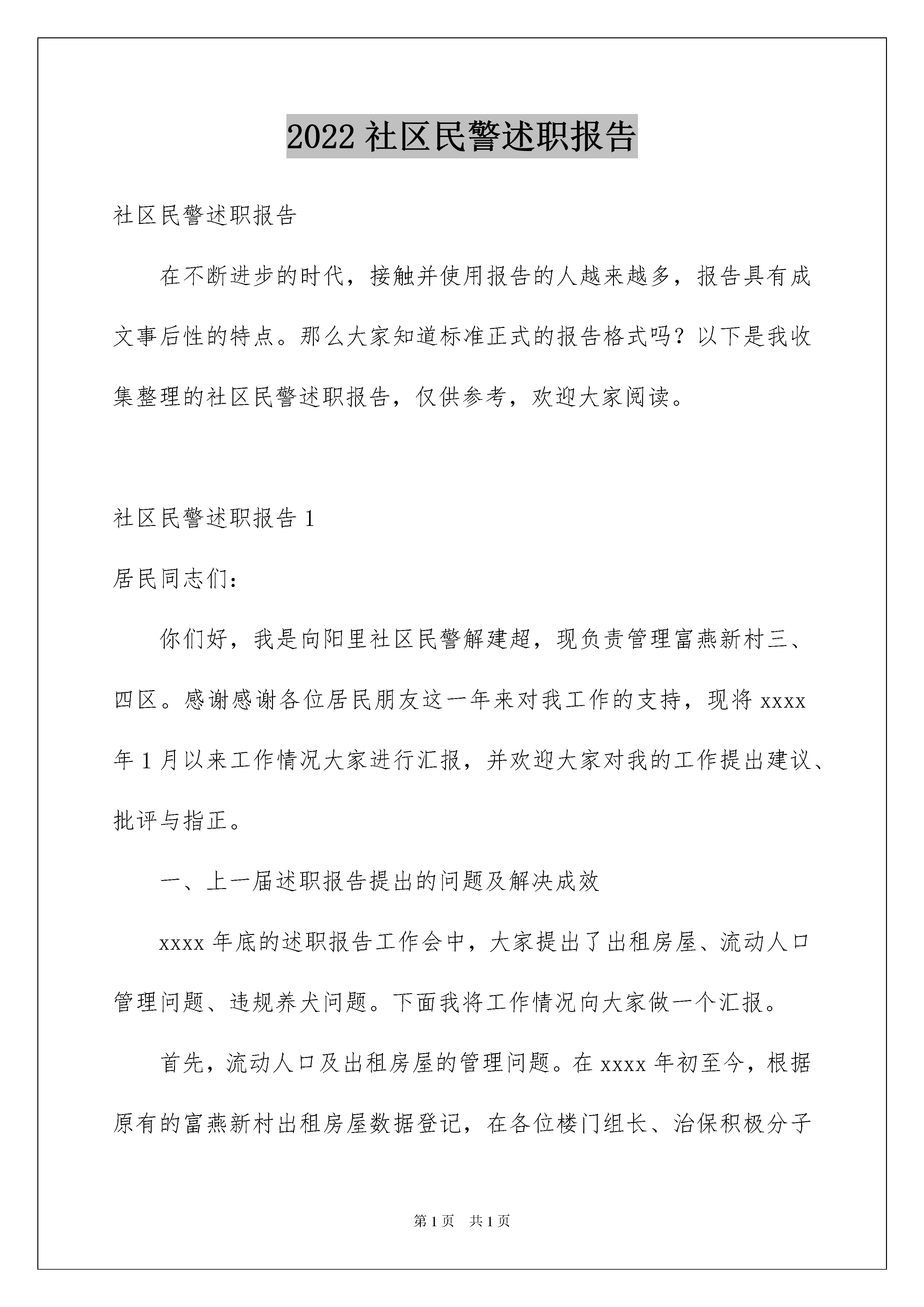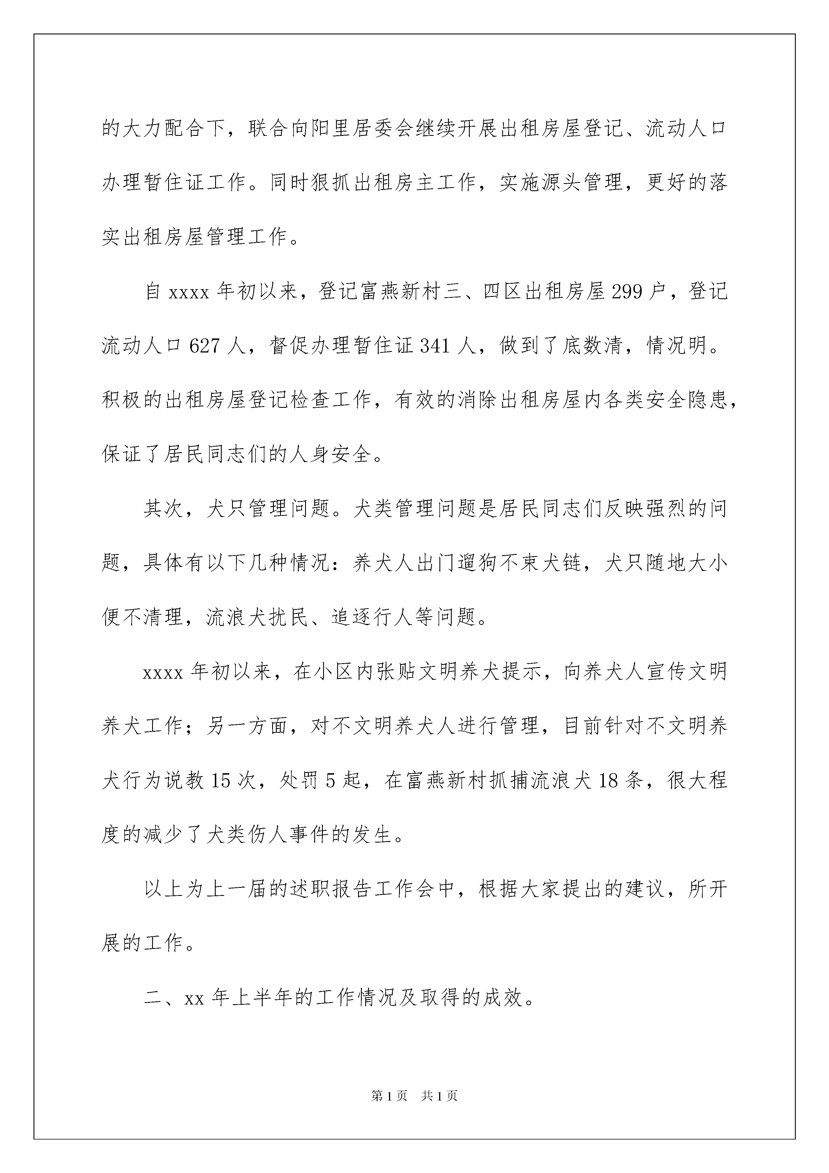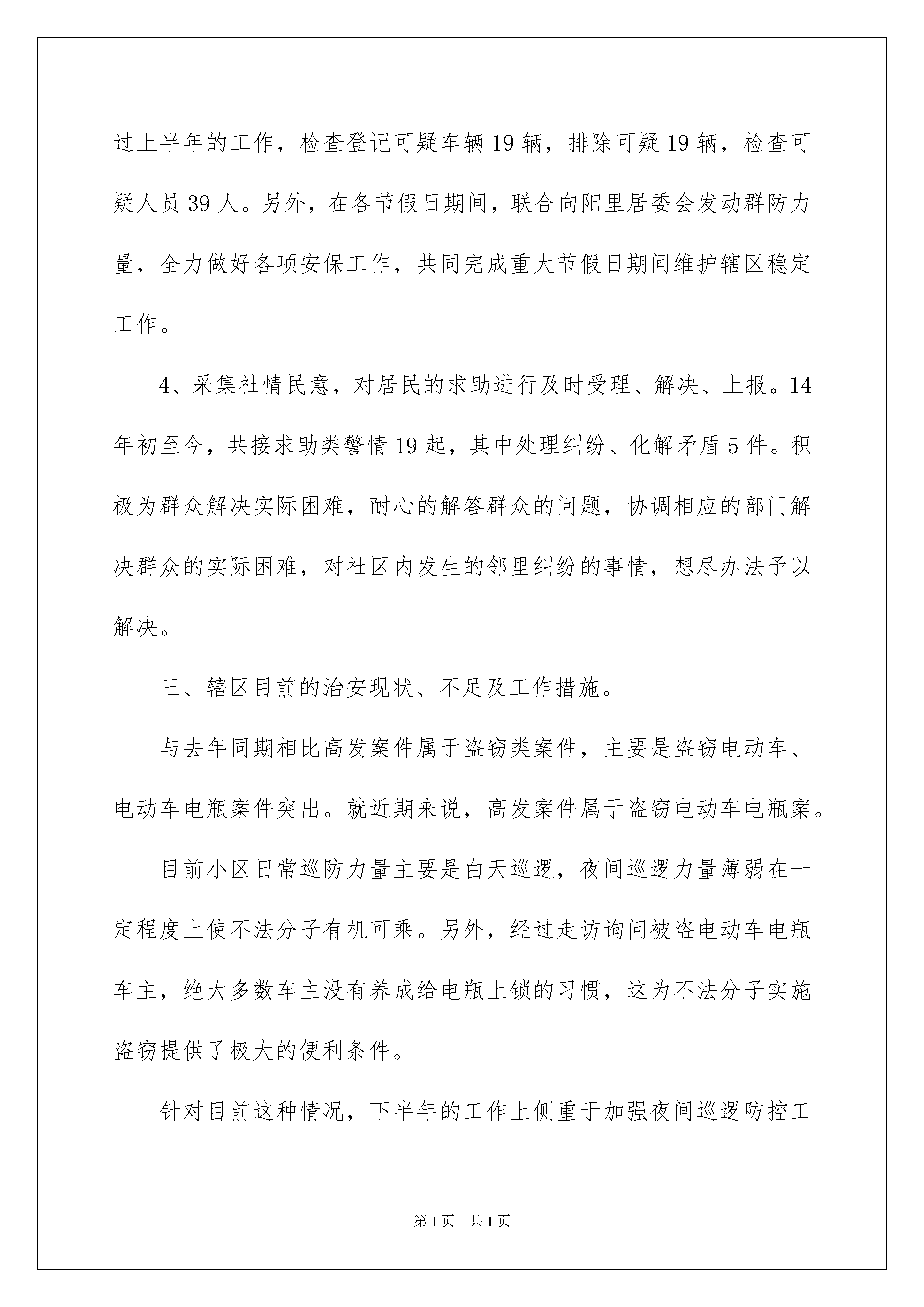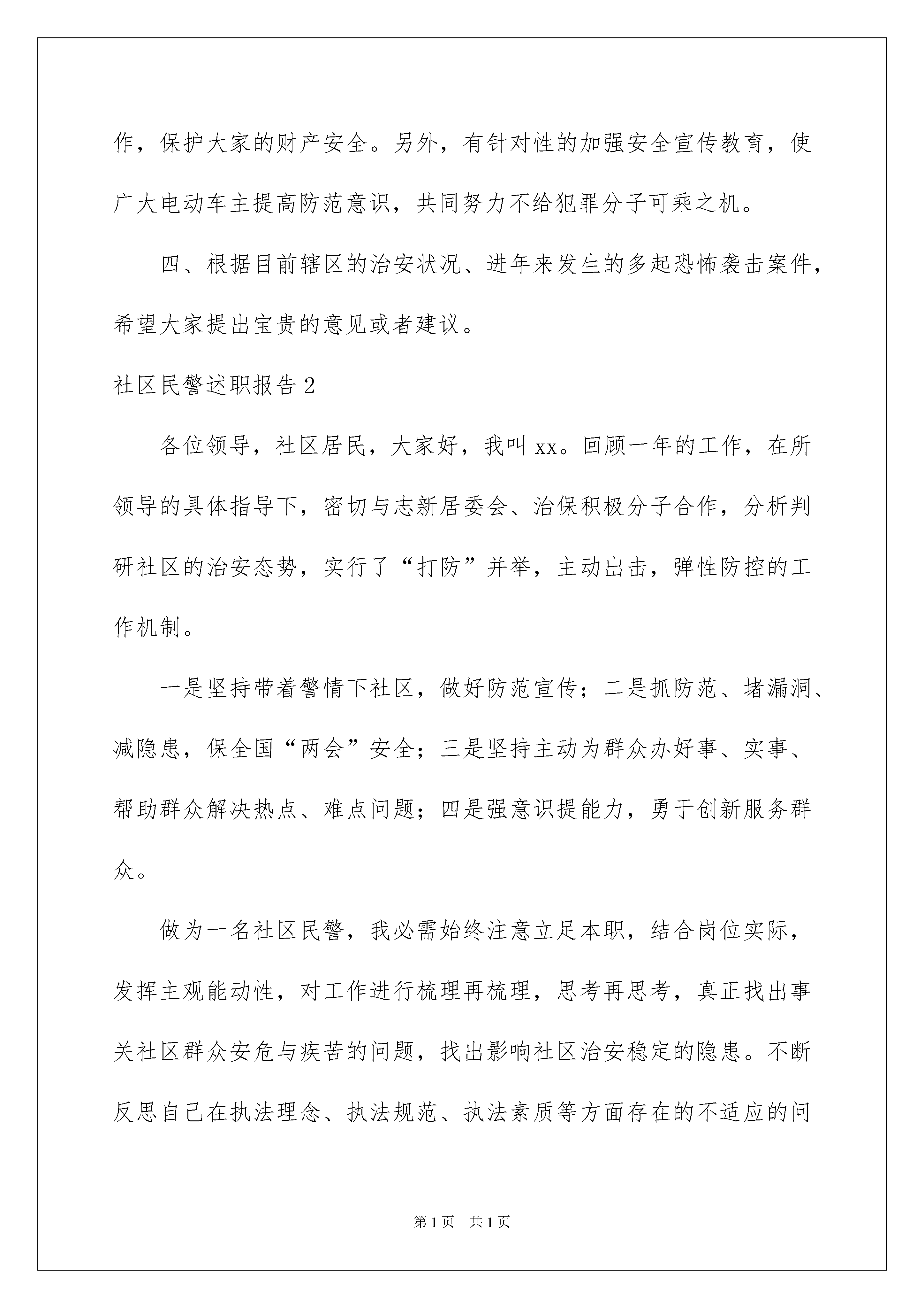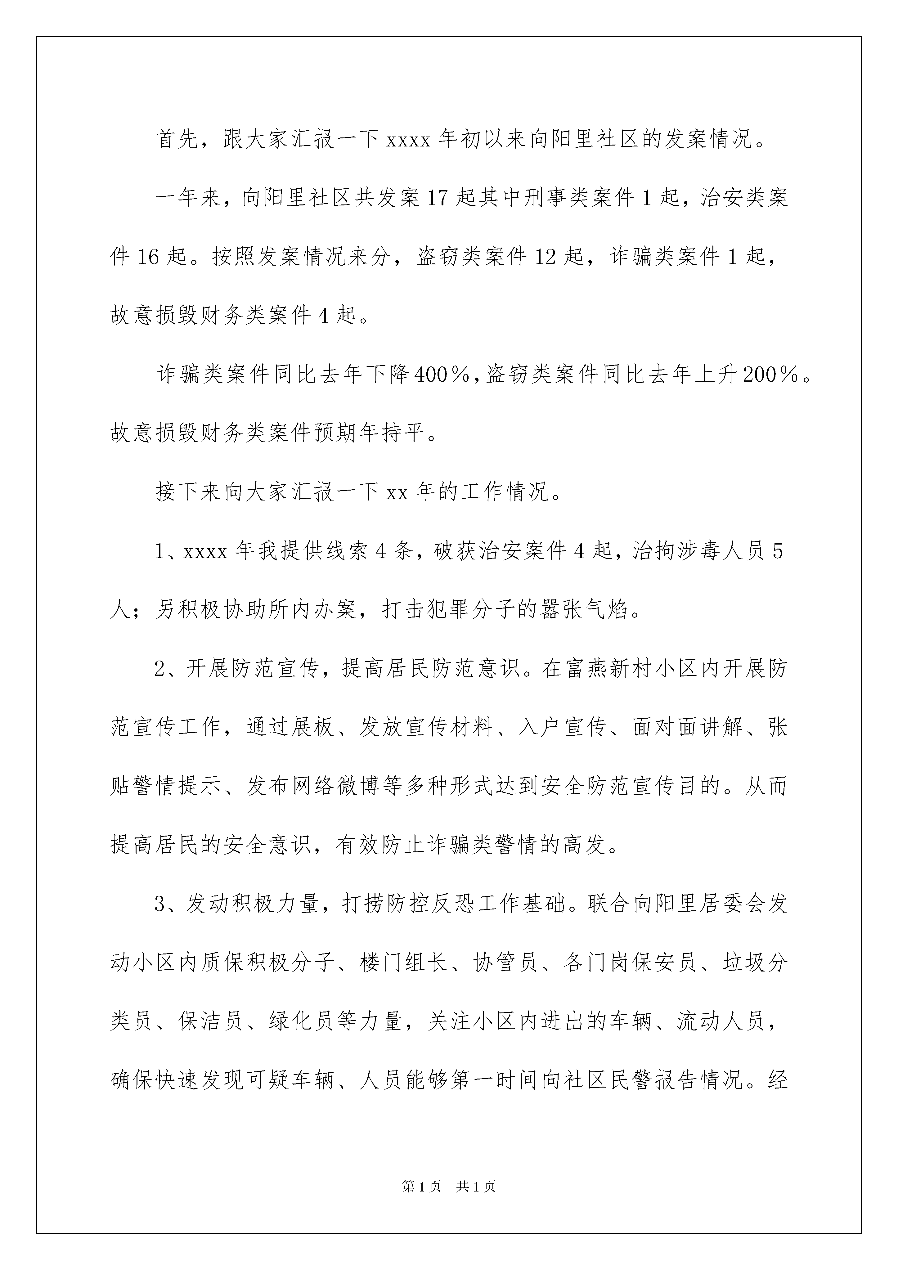 2022社区民警述职报告社区民警述职报告在不断进步的时代,接触并使用报告的人越来越多,报告具有成文事后性的特点。那么大家知道标准正式的报告格式吗?以下是我收集整理的社区民警述职报告,仅供参考,欢迎大家阅读。社区民警述职报告1居民同志们:你们好,我是向阳里社区民警解建超,现负责管理富燕新村三、四区。感谢感谢各位居民朋友这一年来对我工作的支持,现将xxxx年1月以来工作情况大家进行汇报,并欢迎大家对我的工作提出建议、批评与指正。一、上一届述职报告提出的问题及解决成效xxxx年底的述职报告工作会中,大家提出了出租房屋、流动人口管理问题、违规养犬问题。下面我将工作情况向大家做一个汇报。首先,流动人口及出租房屋的管理问题。在xxxx年初至今,根据原有的富燕新村出租房屋数据登记,在各位楼门组长、治保积极分子的大力配合下,联合向阳里居委会继续开展出租房屋登记、流动人口办理暂住证工作。同时狠抓出租房主工作,实施源头管理,更好的落实出租房屋管理工作。自xxxx年初以来,登记富燕新村三、四区出租房屋299户,登记流动人口627人,督促办理暂住证341人,做到了底数清,情况明。积极的出租房屋登记检查工作,有效的消除出租房屋内各类安全隐患,保证了居民同志们的人身安全。其次,犬只管理问题。犬类管理问题是居民同志们反映强烈的问题,具体有以下几种情况:养犬人出门遛狗不束犬链,犬只随地大小便不清理,流浪犬扰民、追逐行人等问题。xxxx年初以来,在小区内张贴文明养犬提示,向养犬人宣传文明养犬工作;另一方面,对不文明养犬人进行管理,目前针对不文明养犬行为说教15次,处罚5起,在富燕新村抓捕流浪犬18条,很大程度的减少了犬类伤人事件的发生。以上为上一届的述职报告工作会中,根据大家提出的建议,所开展的工作。二、xx年上半年的工作情况及取得的成效。首先,跟大家汇报一下xxxx年初以来向阳里社区的发案情况。一年来,向阳里社区共发案17起其中刑事类案件1起,治安类案件16起。按照发案情况来分,盗窃类案件12起,诈骗类案件1起,故意损毁财务类案件4起。诈骗类案件同比去年下降400%,盗窃类案件同比去年上升200%。故意损毁财务类案件预期年持平。接下来向大家汇报一下xx年的工作情况。1、xxxx年我提供线索4条,破获治安案件4起,治拘涉毒人员5人;另积极协助所内办案,打击犯罪分子的嚣张气焰。2、开展防范宣传,提高居民防范意识。在富燕新村小区内开展防范宣传工作,通过展板、发放宣传材料、入户宣传、面对面讲解、张贴警情提示、发布网络微博等多种形式达到安全防范宣传目的。从而提高居民的安全意识,有效防止诈骗类警情的高发。3、发动积极力量,打捞防控反恐工作基础。联合向阳里居委会发动小区内质保积极分子、楼门组长、协管员、各门岗保安员、垃圾分类员、保洁员、绿化员等力量,关注小区内进出的车辆、流动人员,确保快速发现可疑车辆、人员能够第一时间向社区民警报告情况。经过上半年的工作,检查登记可疑车辆19辆,排除可疑19辆,检查可疑人员39人。另外,在各节假日期间,联合向阳里居委会发动群防力量,全力做好各项安保工作,共同完成重大节假日期间维护辖区稳定工作。4、采集社情民意,对居民的求助进行及时受理、解决、上报。14年初至今,共接求助类警情19起,其中处理纠纷、化解矛盾5件。积极为群众解决实际困难,耐心的解答群众的问题,协调相应的部门解决群众的实际困难,对社区内发生的邻里纠纷的事情,想尽办法予以解决。三、辖区目前的治安现状、不足及工作措施。与去年同期相比高发案件属于盗窃类案件,主要是盗窃电动车、电动车电瓶案件突出。就近期来说,高发案件属于盗窃电动车电瓶案。目前小区日常巡防力量主要是白天巡逻,夜间巡逻力量薄弱在一定程度上使不法分子有机可乘。另外,经过走访询问被盗电动车电瓶车主,绝大多数车主没有养成给电瓶上锁的习惯,这为不法分子实施盗窃提供了极大的便利条件。针对目前这种情况,下半年的工作上侧重于加强夜间巡逻防控工作,保护大家的财产安全。另外,有针对性的加强安全宣传教育,使广大电动车主提高防范意识,共同努力不给犯罪分子可乘之机。四、根据目前辖区的治安状况、进年来发生的多起恐怖袭击案件,希望大家提出宝贵的意见或者建议。社区民警述职报告2各位领导,社区居民,大家好,我叫xx。回顾一年的工作,在所领导的具体指导下,密切与志新居委会、治保积极分子合作,分析判研社区的治安态势,实行了“打防”并举,主动出击,弹性防控的工作机制。一是坚持带着警情下社区,做好防范宣传;二是抓防范、堵漏洞、减隐患,保全国“两会”安全;三是坚持主动为群众办好事、实事、帮助群众解决热点、难点