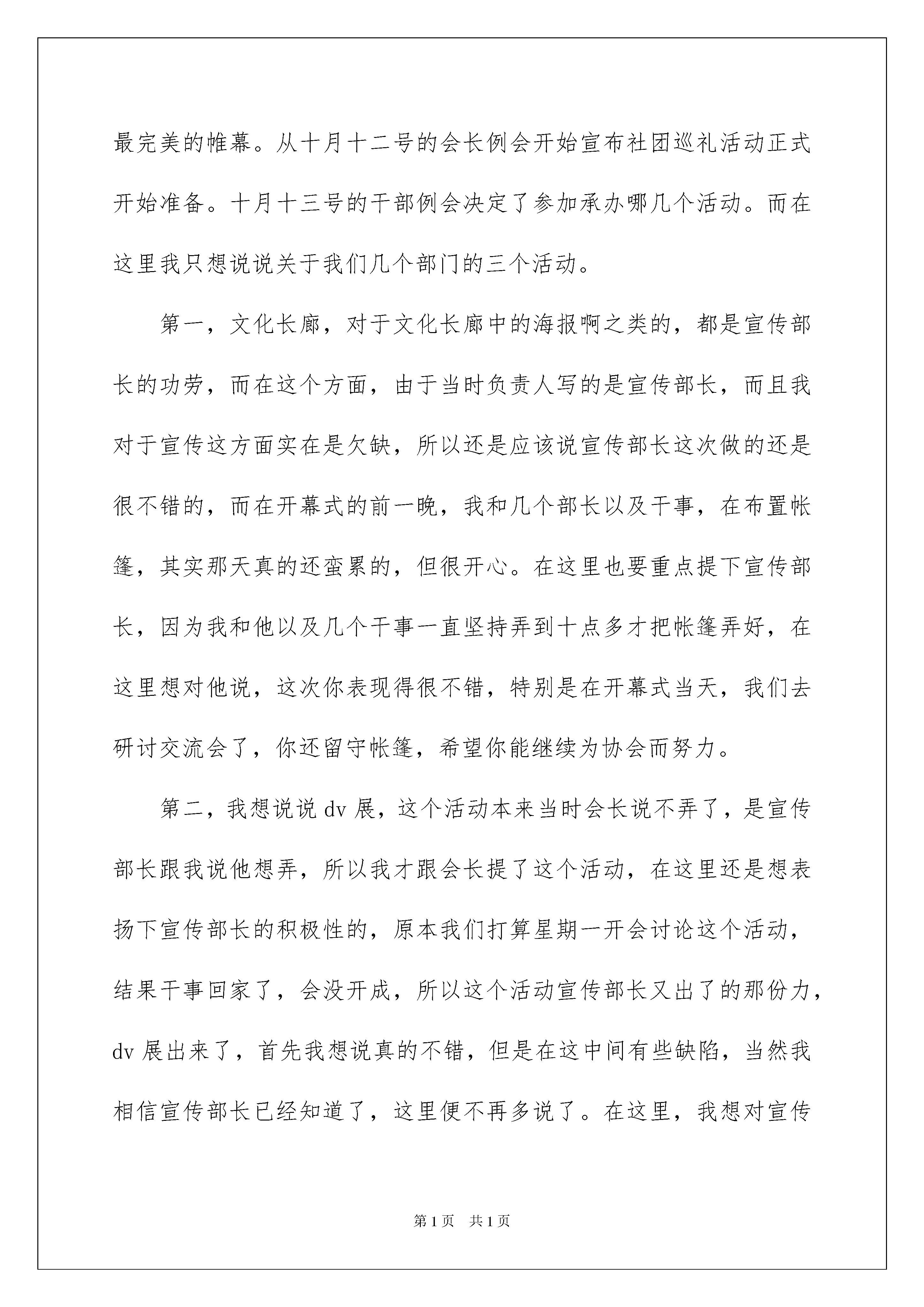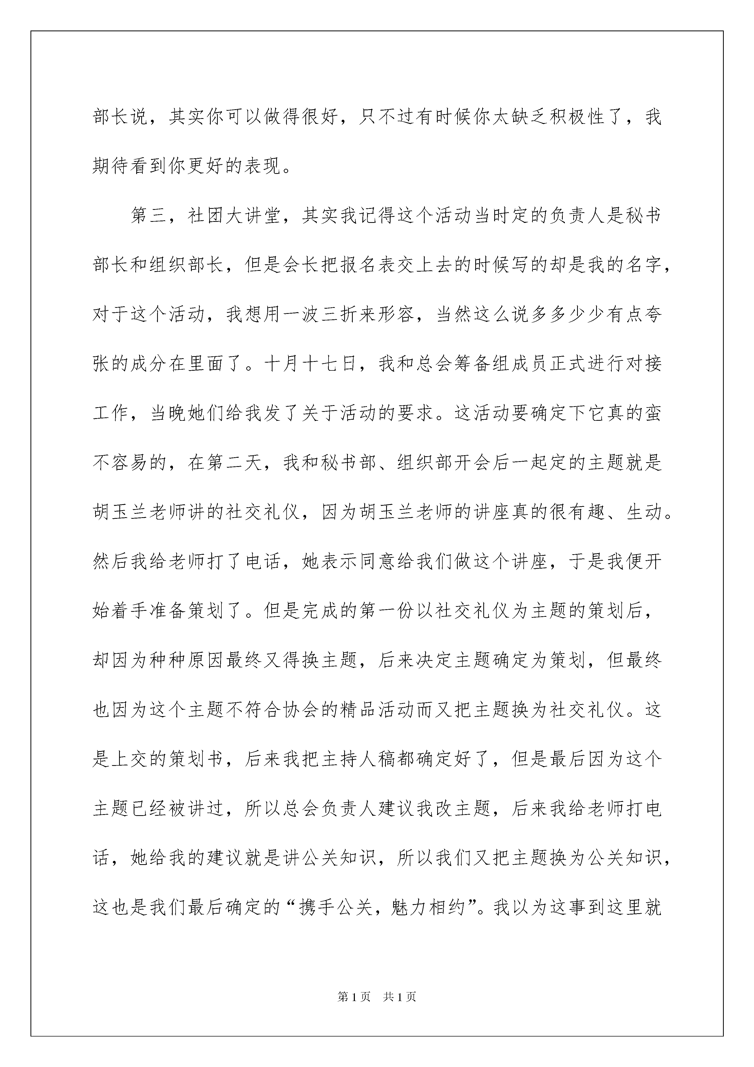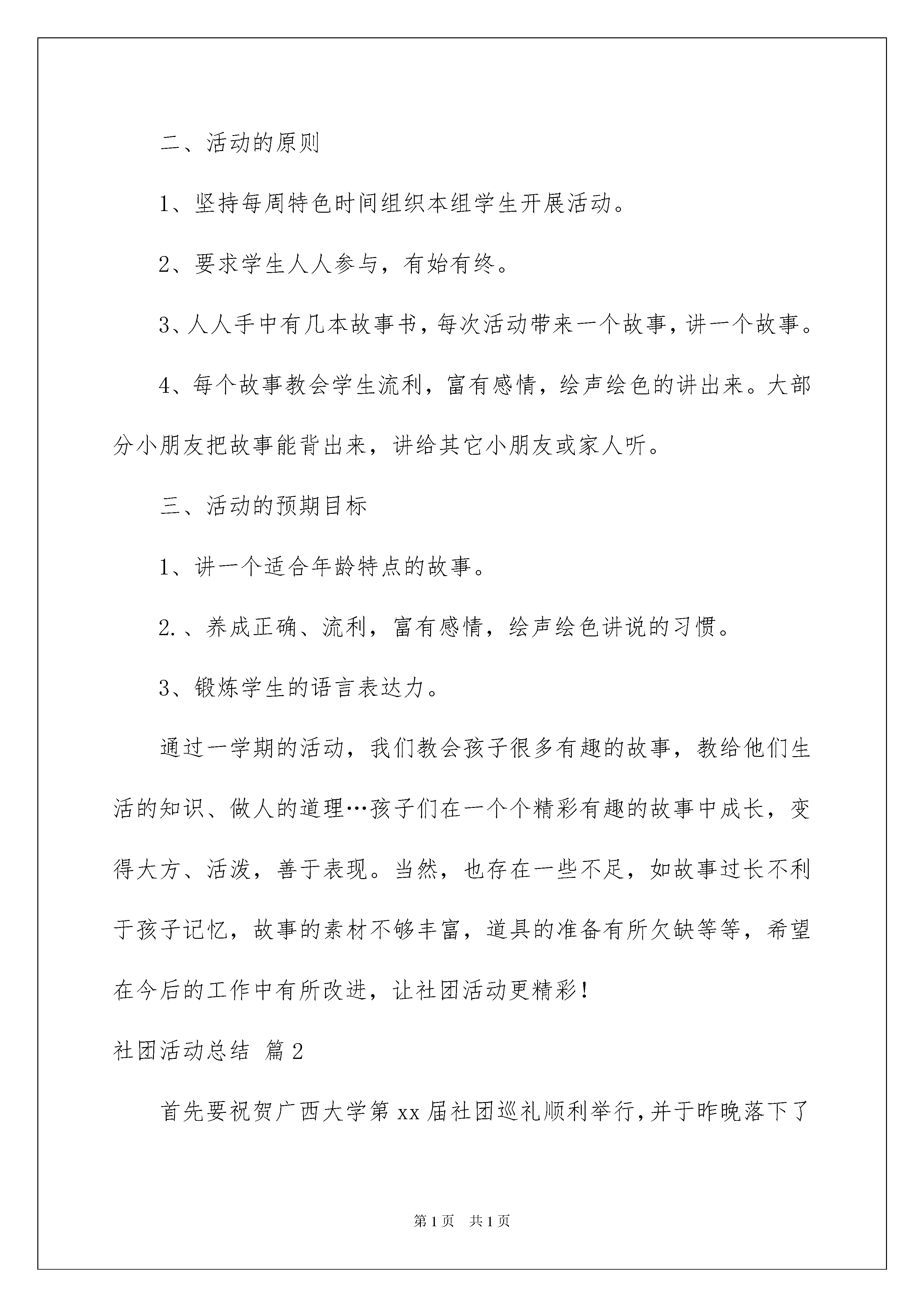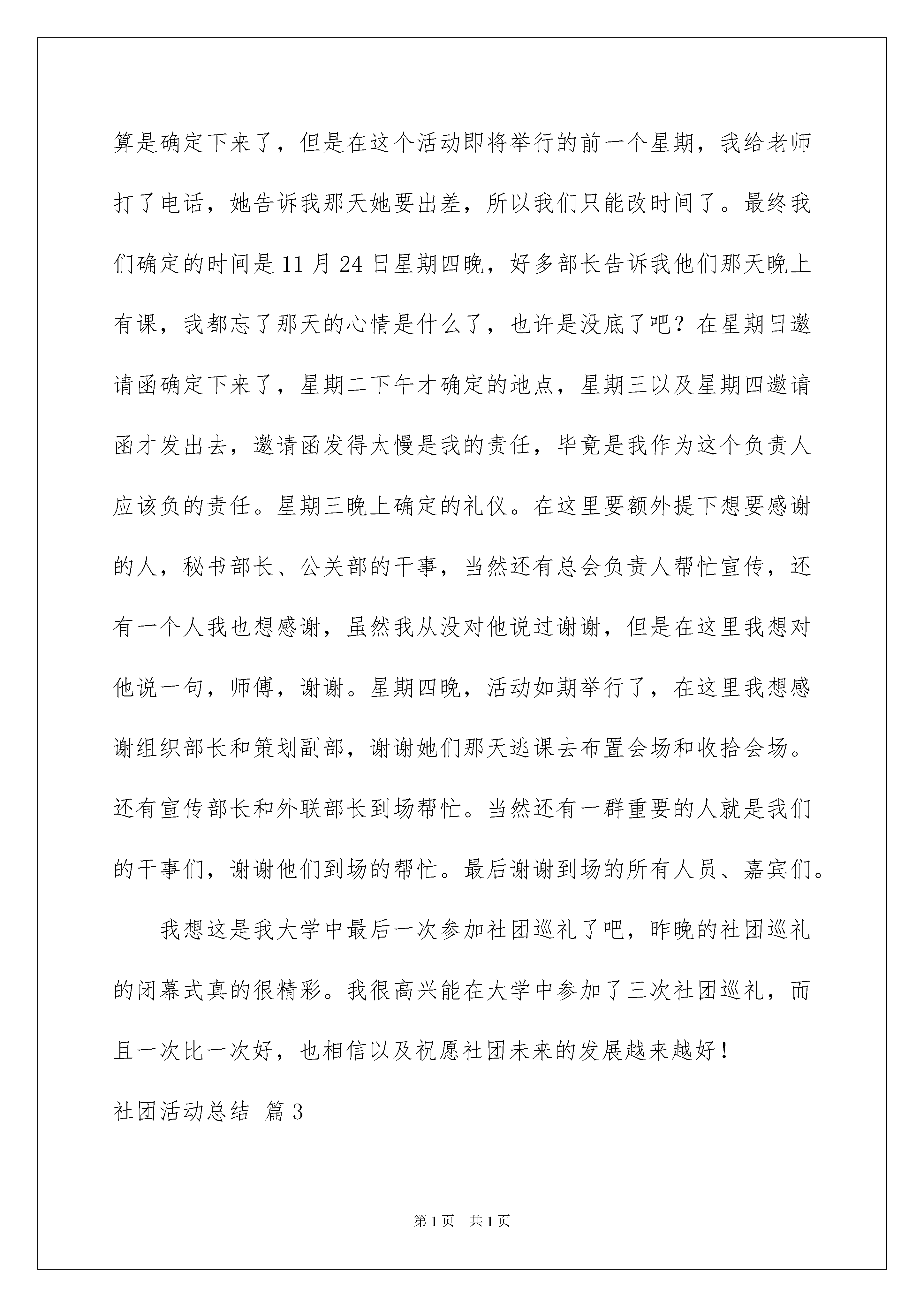 2022社团活动总结合集9篇社团活动总结合集9篇总结就是把一个时段的学习、工作或其完成情况进行一次全面系统的总结,它有助于我们寻找工作和事物发展的规律,从而掌握并运用这些规律,让我们好好写一份总结吧。但是总结有什么要求呢?以下是我为大家收集的社团活动总结9篇,仅供参考,欢迎大家阅读。社团活动总结篇1上半年的活动已接近尾声,回头展望,我社从起步至今取得了很大的进步,孩子们在活动获得了很多乐趣。为了克服和改进以前活动中的缺点和不足,为了使我们以后的步伐更加坚定,在此,我们对一年级故事大王上半学年的活动做一个全面的总结。一、活动的意义为了丰富校园文化,为了培养小学生对语文的兴趣,引导小学生掌握方法,扩展思维,口语表达能力,促进语文水平的提高。为了丰富学生的精神世界,让学生尽早地吸吮知道,故事的启发中迅速成长起来,根据学生学爱好兴趣开展讲故事特色活动。二、活动的原则1、坚持每周特色时间组织本组学生开展活动。2、要求学生人人参与,有始有终。3、人人手中有几本故事书,每次活动带来一个故事,讲一个故事。4、每个故事教会学生流利,富有感情,绘声绘色的讲出来。大部分小朋友把故事能背出来,讲给其它小朋友或家人听。三、活动的预期目标1、讲一个适合年龄特点的故事。2.、养成正确、流利,富有感情,绘声绘色讲说的习惯。3、锻炼学生的语言表达力。通过一学期的活动,我们教会孩子很多有趣的故事,教给他们生活的知识、做人的道理…孩子们在一个个精彩有趣的故事中成长,变得大方、活泼,善于表现。当然,也存在一些不足,如故事过长不利于孩子记忆,故事的素材不够丰富,道具的准备有所欠缺等等,希望在今后的工作中有所改进,让社团活动更精彩!社团活动总结篇2首先要祝贺广西大学第xx届社团巡礼顺利举行,并于昨晚落下了最完美的帷幕。从十月十二号的会长例会开始宣布社团巡礼活动正式开始准备。十月十三号的干部例会决定了参加承办哪几个活动。而在这里我只想说说关于我们几个部门的三个活动。第一,文化长廊,对于文化长廊中的海报啊之类的,都是宣传部长的功劳,而在这个方面,由于当时负责人写的是宣传部长,而且我对于宣传这方面实在是欠缺,所以还是应该说宣传部长这次做的还是很不错的,而在开幕式的前一晚,我和几个部长以及干事,在布置帐篷,其实那天真的还蛮累的,但很开心。在这里也要重点提下宣传部长,因为我和他以及几个干事一直坚持弄到十点多才把帐篷弄好,在这里想对他说,这次你表现得很不错,特别是在开幕式当天,我们去研讨交流会了,你还留守帐篷,希望你能继续为协会而努力。第二,我想说说dv展,这个活动本来当时会长说不弄了,是宣传部长跟我说他想弄,所以我才跟会长提了这个活动,在这里还是想表扬下宣传部长的积极性的,原本我们打算星期一开会讨论这个活动,结果干事回家了,会没开成,所以这个活动宣传部长又出了的那份力,dv展出来了,首先我想说真的不错,但是在这中间有些缺陷,当然我相信宣传部长已经知道了,这里便不再多说了。在这里,我想对宣传部长说,其实你可以做得很好,只不过有时候你太缺乏积极性了,我期待看到你更好的表现。第三,社团大讲堂,其实我记得这个活动当时定的负责人是秘书部长和组织部长,但是会长把报名表交上去的时候写的却是我的名字,对于这个活动,我想用一波三折来形容,当然这么说多多少少有点夸张的成分在里面了。十月十七日,我和总会筹备组成员正式进行对接工作,当晚她们给我发了关于活动的要求。这活动要确定下它真的蛮不容易的,在第二天,我和秘书部、组织部开会后一起定的主题就是胡玉兰老师讲的社交礼仪,因为胡玉兰老师的讲座真的很有趣、生动。然后我给老师打了电话,她表示同意给我们做这个讲座,于是我便开始着手准备策划了。但是完成的第一份以社交礼仪为主题的策划后,却因为种种原因最终又得换主题,后来决定主题确定为策划,但最终也因为这个主题不符合协会的精品活动而又把主题换为社交礼仪。这是上交的策划书,后来我把主持人稿都确定好了,但是最后因为这个主题已经被讲过,所以总会负责人建议我改主题,后来我给老师打电话,她给我的建议就是讲公关知识,所以我们又把主题换为公关知识,这也是我们最后确定的“携手公关,魅力相约”。我以为这事到这里就算是确定下来了,但是在这个活动即将举行的前一个星期,我给老师打了电话,她告诉我那天她要出差,所以我们只能改时间了。最终我们确定的时间是11月24日星期四晚,好多部长告诉我他们那天晚上有课,我都忘了那天的心情是什么了,也许是没底了吧?在星期日邀请函确定下来了,星期二下午才确定的地点,星期三以及星期四邀请函才发出去,邀请函发得太慢是我的责任,毕竟是我作为这个负责人应该负的责任。