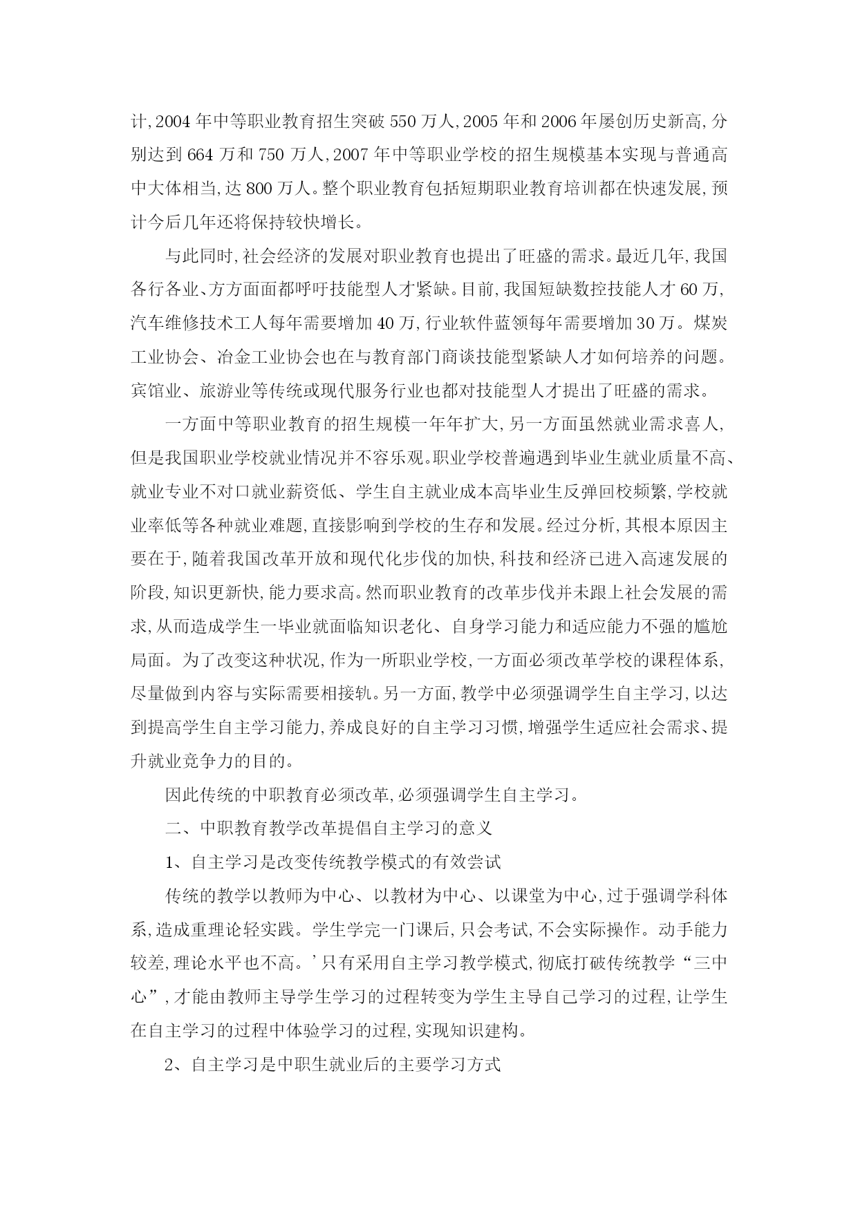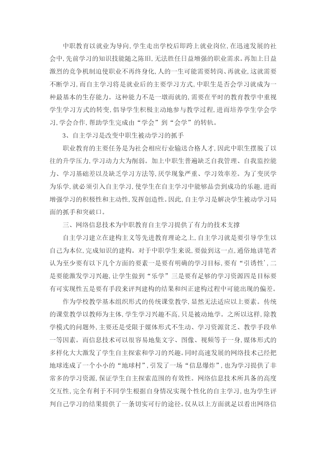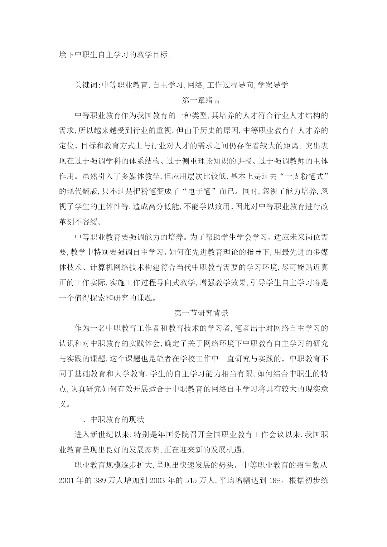 摘要 中职教育以就业为导向,要求学生具备不断适应社会需求的能力,自主学习是培养终身学习能力的有效方式,是保持自身可持续发展的基础和前提。随着多媒体技术和网络技术的不断成熟,如何利用网络环境丰富的、共享的、多媒体化的资源以及更加个性化的学习方式来更好的支持中职生的自主学习能力的培养己经成为当前职业教育改革的重点内容,也是本文研究的主要内容。 经过分析,影响中职教育的自主学习有以下三个要素一、教学内容与实际工作需求有一定距离。二、教学手段上未能充分发挥网络环境下的多媒体辅助教学的优势和潜能,大多是过去“一支粉笔”式的传统教学转变为“电子笔”的现代翻版。三、教学模式的改革未能采用贴近职业教育强调学以致用的先进教学模式为支撑,造成人才培养与市场对接不紧密。 本文从理论与实践相结合的角度研究了如何在网络环境下开展中职教育的自主学习。首先从中职教育的现状和对网络环境下开展自主学习的需求分析入手,进而梳理了中职教育和自主学习的概念及本质特征。通过问卷调查法分析了中职生自主学习的能力要求及构成现状。在此基础上,根据中职生存在的元认知能力低、自我约束力弱、而合作与交流意识比较强等特点,提出了把建构主义、元认知论以及联结主义作为网络环境下中职教育自主学习研究的三大理论依据,通过渐进式方法实现中职网络自主学习由他控到自控的过程转变,最终实现联结 主义的无监督学习的思想。在这一思想的指导下,通过案例法研究了网络环境下中职教育开展自主学习的实施策略。研究了网络环境下自主学习课程的设计原则,网络环境的建设原则和方法,教师和学生的角色变化等。最后通过实践,展示了如何基于网络环境利用“基于工作过程导向的学案导学”教学模式开展自主学习,并总结了应用的原则和应用方法。 本文认为,开展网络环境下的中职教育必须认真进行课程设计,改革教学内容,实施模块分解,通过任务式做到内容与工作实际相结合。其次,要从教学手段和教学模式两方面协同进行改革。实施以“基于工作过程导向的学案导学”教学模式为核心,以网络环境为手段,达到两者的有机整合,从而实现有效开展网络环境下中职生自主学习的教学目标。 关键词:中等职业教育,自主学习,网络,工作过程导向,学案导学 第一章绪言 中等职业教育作为我国教育的一种类型,其培养的人才符合行业人才结构的需求,所以越来越受到行业的重视。但由于历史的原因,中等职业教育在人才养的定位、目标和教育方式上与行业对人才的需求之间仍存在着较大的距离。突出表现在过于强调学科的体系结构、过于侧重理论知识的讲授、过于强调教师的主体作用。虽然引入了多媒体教学,但应用层次比较低,基本上是过去“一支粉笔式”的现代翻版,只不过是把粉笔变成了“电子笔”而已。同时,忽视了能力培养,忽视了学生的主体性等,造成高分低能,不能学以致用。因此对中等职业教育进行改革刻不容缓。 中等职业教育要强调能力的培养。为了帮助学生学会学习、适应未来岗位需要,教学中特别要强调自主学习。如何在先进教育理论的指导下,用最先进的多媒体技术、计算机网络技术构建符合当代中职教育需要的学习环境,尽可能贴近真正的工作实际,实施工作过程导向式教学,增强教学效果,引导学生自主学习将是一个值得探索和研究的课题。 第一节研究背景 作为一名中职教育工作者和教育技术的学习者,笔者出于对网络自主学习的认识和对中职教育的实践体会,确定了关于网络环境下中职教育自主学习的研究与实践的课题,这个课题也是笔者在学校工作中一直研究与实践的。中职教育不同于基础教育和大学教育,学生的自主学习能力相当有限,如何结合中职生的特点,认真研究如何有效开展适合于中职教育的网络自主学习将具有较大的现实意义。 一、中职教育的现状 进入新世纪以来,特别是年国务院召开全国职业教育工作会议以来,我国职业教育呈现出良好的发展态势,正在迎来新的发展机遇。 职业教育规模逐步扩大,呈现出快速发展的势头。中等职业教育的招生数从2001年的389万人增加到2003年的515万人,平均增幅达到18%。根据初步统计,2004年中等职业教育招生突破550万人,2005年和2006年屡创历史新高,分别达到664万和750万人,2007年中等职业学校的招生规模基本实现与普通高中大体相当,达800万人。整个职业教育包括短期职业教育培训都在快速发展,预计今后几年还将保持较快增长。 与此同时,社会经济的发展对职业教育也提出了旺盛的需求。最近几年,我国各行各业、方方面面都呼吁技能型人才紧缺。目前,我国短缺数控技能人才60万,汽车维修技术工人每年需要增加40万,行业软件蓝领每年需要增加30万。煤炭工业协会、冶金工业协会也在与教育部门商谈技能型紧缺人才如何培养的问题。宾馆业、旅游业等传统或现代服务行业也都对技能型人才提出了旺盛的需求。 一方面中等职业教育的招生规模一年年扩大,另一方面虽然就业需求喜人