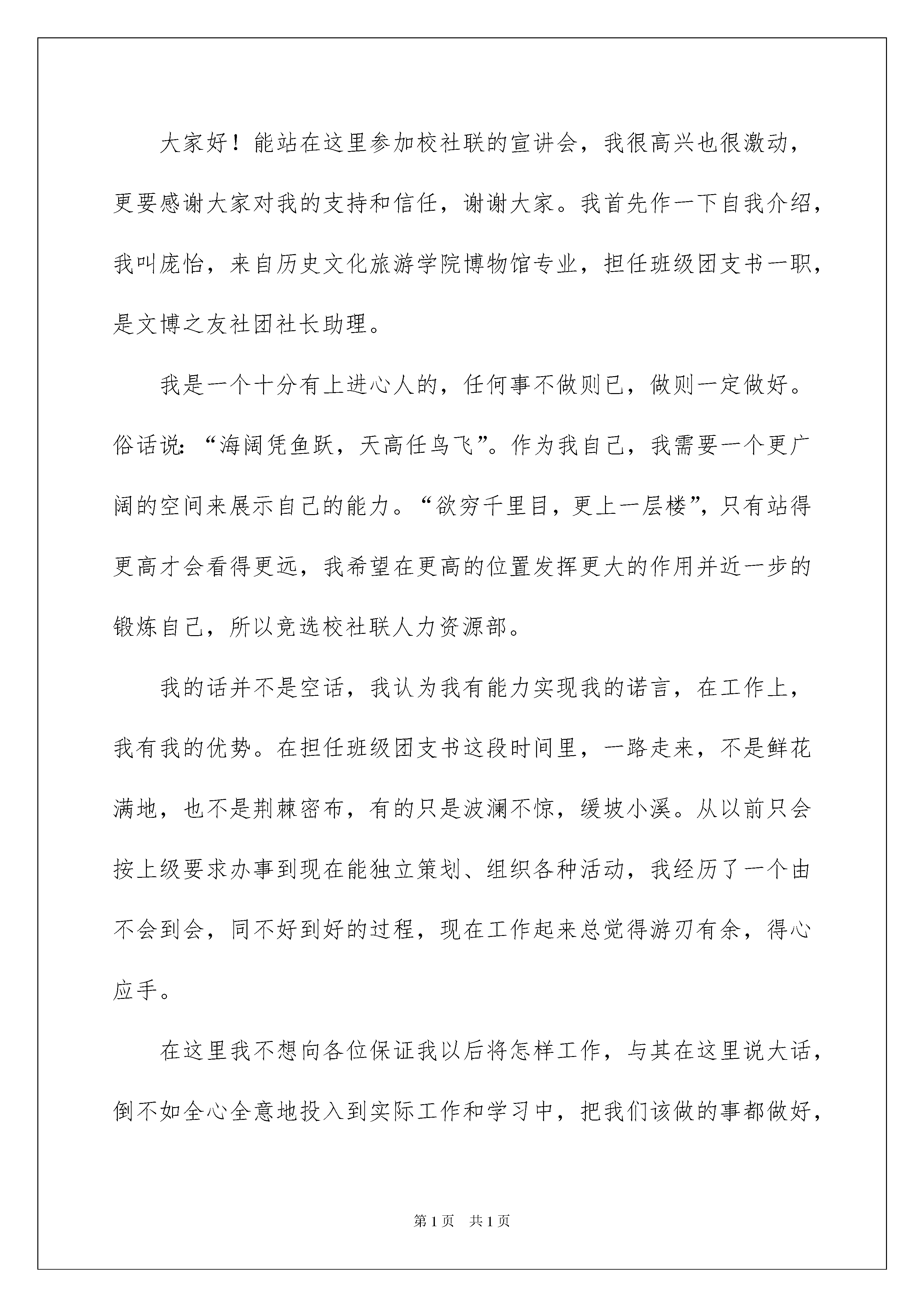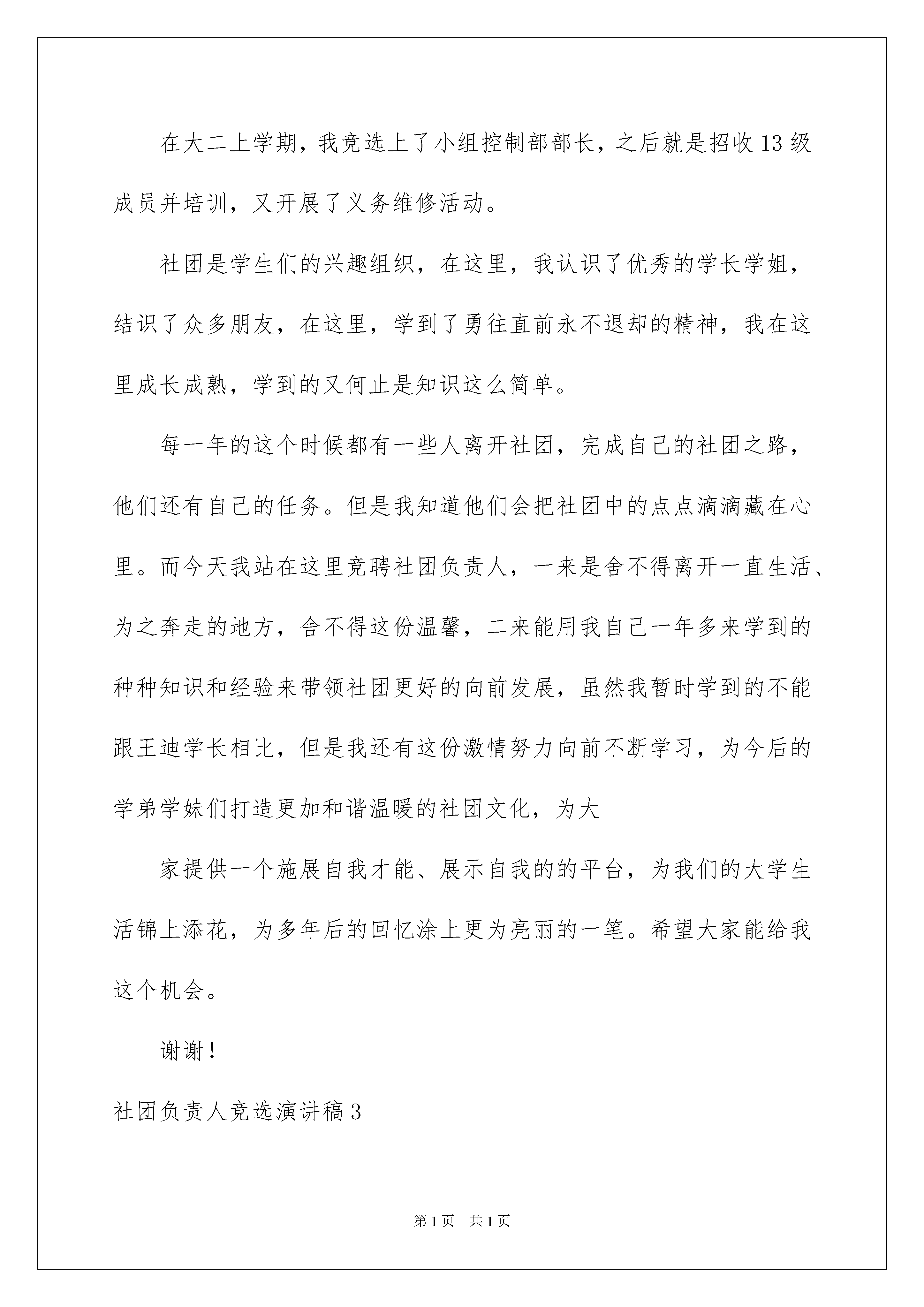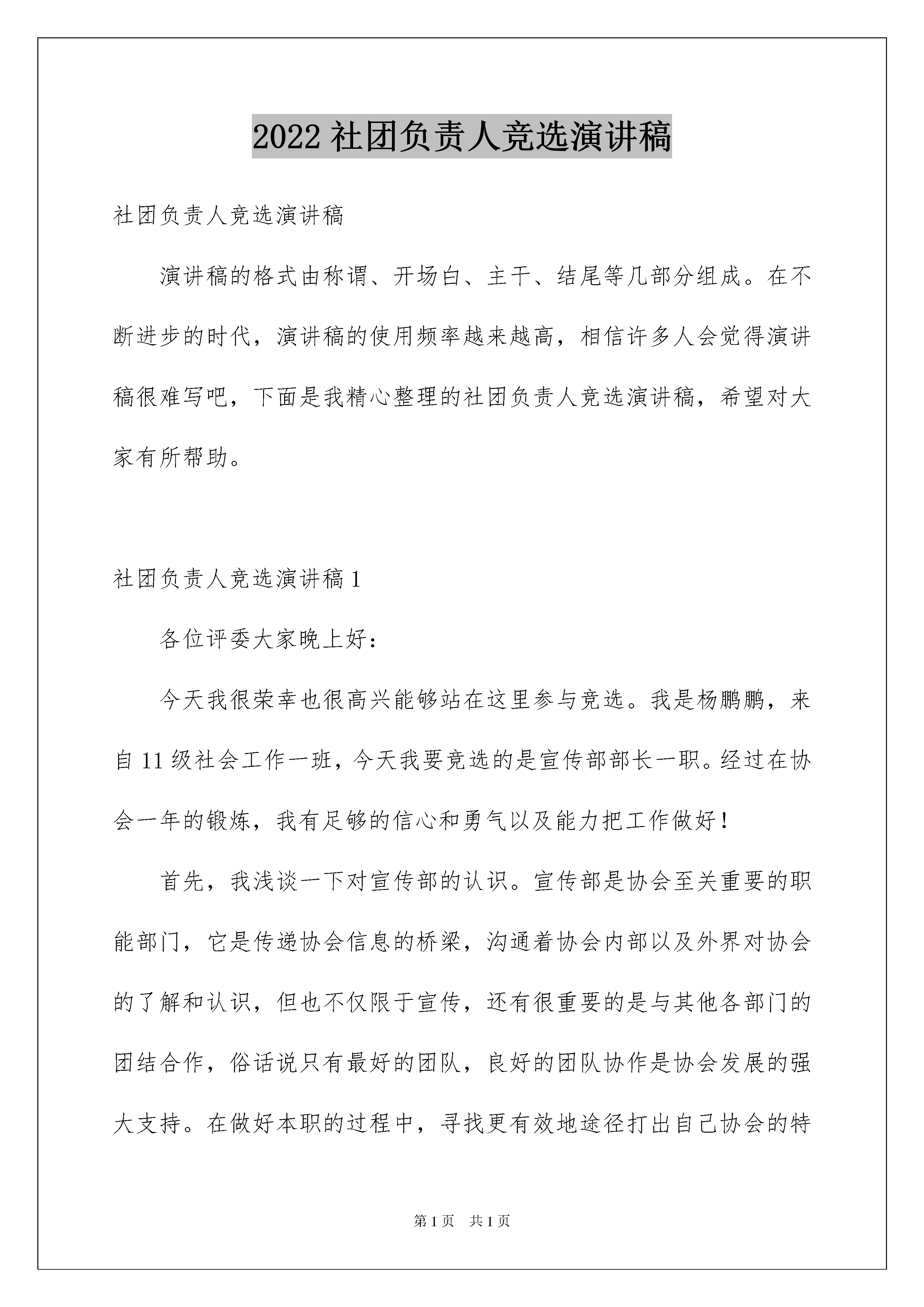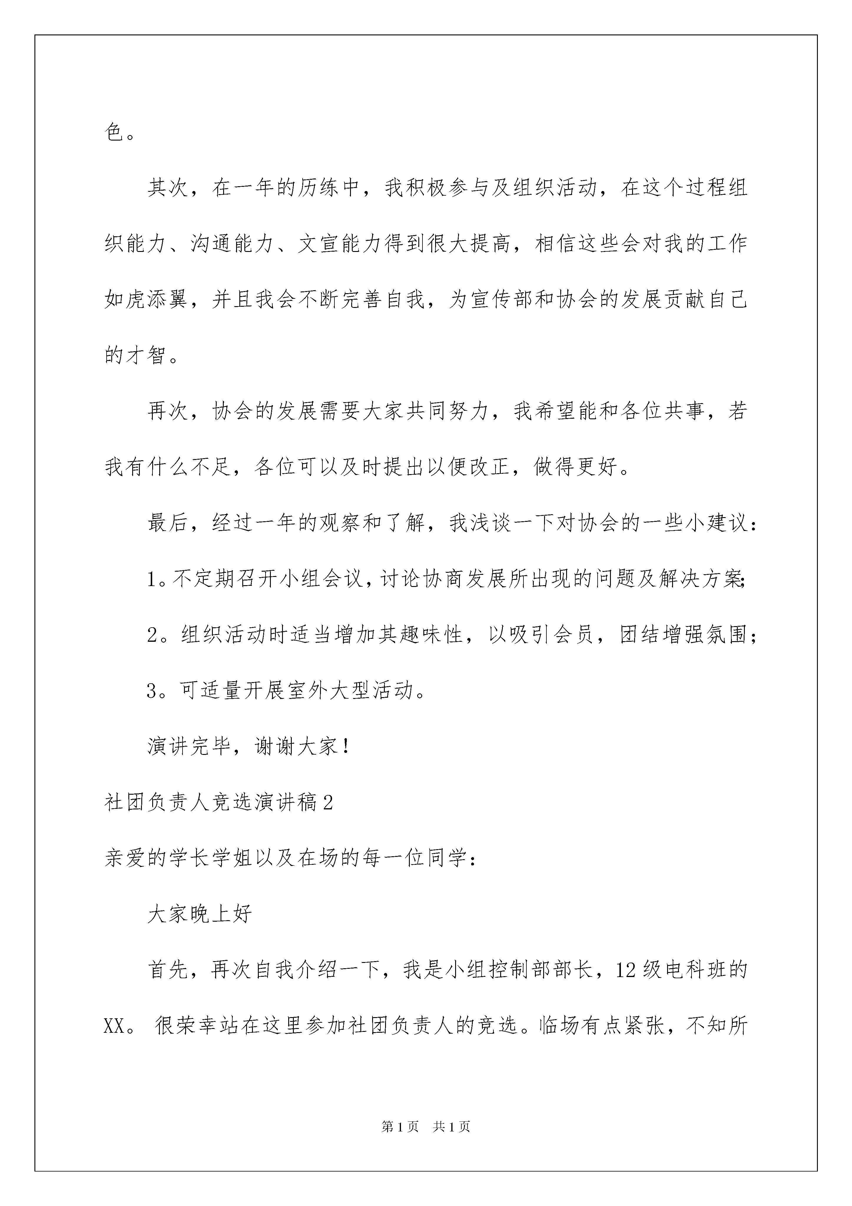 2022社团负责人竞选演讲稿社团负责人竞选演讲稿演讲稿的格式由称谓、开场白、主干、结尾等几部分组成。在不断进步的时代,演讲稿的使用频率越来越高,相信许多人会觉得演讲稿很难写吧,下面是我精心整理的社团负责人竞选演讲稿,希望对大家有所帮助。社团负责人竞选演讲稿1各位评委大家晚上好:今天我很荣幸也很高兴能够站在这里参与竞选。我是杨鹏鹏,来自11级社会工作一班,今天我要竞选的是宣传部部长一职。经过在协会一年的锻炼,我有足够的信心和勇气以及能力把工作做好!首先,我浅谈一下对宣传部的认识。宣传部是协会至关重要的职能部门,它是传递协会信息的桥梁,沟通着协会内部以及外界对协会的了解和认识,但也不仅限于宣传,还有很重要的是与其他各部门的团结合作,俗话说只有最好的团队,良好的团队协作是协会发展的强大支持。在做好本职的过程中,寻找更有效地途径打出自己协会的特色。其次,在一年的历练中,我积极参与及组织活动,在这个过程组织能力、沟通能力、文宣能力得到很大提高,相信这些会对我的工作如虎添翼,并且我会不断完善自我,为宣传部和协会的发展贡献自己的才智。再次,协会的发展需要大家共同努力,我希望能和各位共事,若我有什么不足,各位可以及时提出以便改正,做得更好。最后,经过一年的观察和了解,我浅谈一下对协会的一些小建议:1。不定期召开小组会议,讨论协商发展所出现的问题及解决方案;2。组织活动时适当增加其趣味性,以吸引会员,团结增强氛围;3。可适量开展室外大型活动。演讲完毕,谢谢大家!社团负责人竞选演讲稿2亲爱的学长学姐以及在场的每一位同学:大家晚上好首先,再次自我介绍一下,我是小组控制部部长,12级电科班的XX。很荣幸站在这里参加社团负责人的竞选。临场有点紧张,不知所云。12年9月我来到师大,距离现在已经有一年半的时间了,也就是我加入无线电小组经过的时间。从那时起,我就想在小组里学到点什么,这也许跟在场的学弟学妹们是一样的心思。记得小组招收成员时候的三次实验,一开始我连怎么用电烙铁都不知道,焊出来的电路要么短路要么难看。我还记得小组一开始进行的培训,那时真的是一点都不懂,什么单片机,什么C语言,每周五晚上的培训简直是大眼瞪小眼,学长在上面讲,我们在下面听得稀里糊涂,尽管如此,我还要在这里感谢学长学姐的耐心付出。万事开头难,只要你想有所为。直到小组举办的上一届电子工程师基本技能大赛,我们选的题目是智能小车,选好题后根本不知道该怎么进行下去,只好在网上查资料,但是查的资料跟实际比赛总有差距,就是这样小心翼翼的探索,有一种如履薄冰的感觉,到比赛成果展示的前一天晚上,我跟胡林他们又在六楼的实验室熬了一个晚上,可惜在程序编写方面不足,最后还有一项大要求没有达到,应该是评委看我们只是大一学生,考虑到我们能做出这些已经不错了,给了我们二等奖的好成绩。在大二上学期,我竞选上了小组控制部部长,之后就是招收13级成员并培训,又开展了义务维修活动。社团是学生们的兴趣组织,在这里,我认识了优秀的学长学姐,结识了众多朋友,在这里,学到了勇往直前永不退却的精神,我在这里成长成熟,学到的又何止是知识这么简单。每一年的这个时候都有一些人离开社团,完成自己的社团之路,他们还有自己的任务。但是我知道他们会把社团中的点点滴滴藏在心里。而今天我站在这里竞聘社团负责人,一来是舍不得离开一直生活、为之奔走的地方,舍不得这份温馨,二来能用我自己一年多来学到的种种知识和经验来带领社团更好的向前发展,虽然我暂时学到的不能跟王迪学长相比,但是我还有这份激情努力向前不断学习,为今后的学弟学妹们打造更加和谐温暖的社团文化,为大家提供一个施展自我才能、展示自我的的平台,为我们的大学生活锦上添花,为多年后的回忆涂上更为亮丽的一笔。希望大家能给我这个机会。谢谢!社团负责人竞选演讲稿3大家好!能站在这里参加校社联的宣讲会,我很高兴也很激动,更要感谢大家对我的支持和信任,谢谢大家。我首先作一下自我介绍,我叫庞怡,来自历史文化旅游学院博物馆专业,担任班级团支书一职,是文博之友社团社长助理。我是一个十分有上进心人的,任何事不做则已,做则一定做好。俗话说:“海阔凭鱼跃,天高任鸟飞”。作为我自己,我需要一个更广阔的空间来展示自己的能力。“欲穷千里目,更上一层楼”,只有站得更高才会看得更远,我希望在更高的位置发挥更大的作用并近一步的锻炼自己,所以竞选校社联人力资源部。我的话并不是空话,我认为我有能力实现我的诺言,在工作上,我有我的优势。在担任班级团支书这段时间里,一路走来,不是鲜花满地,也不是荆棘密布,有的只是波澜不惊,缓坡小溪。从以前只会按上级要求办事到现在能独立策划、组织各种活动,
