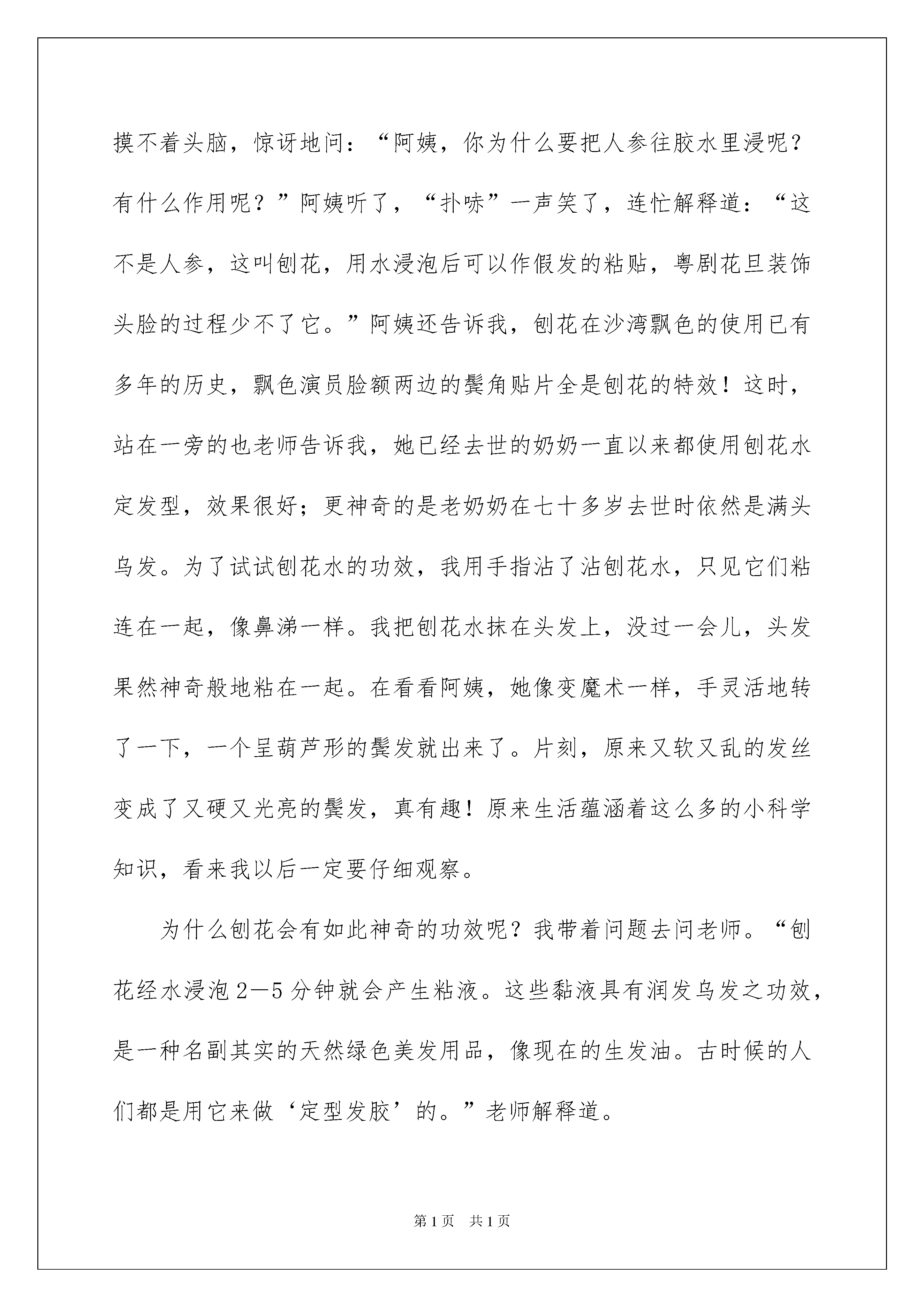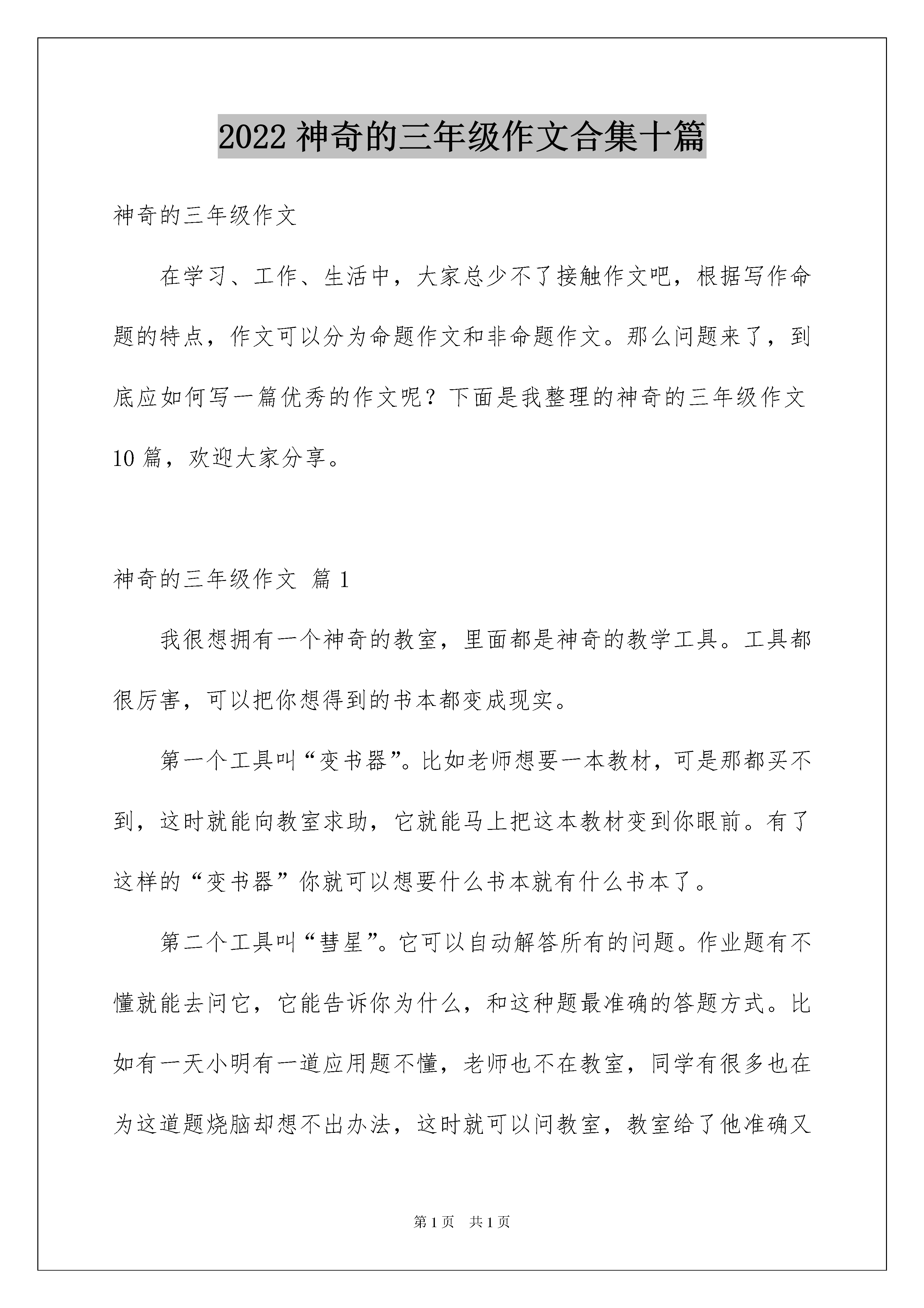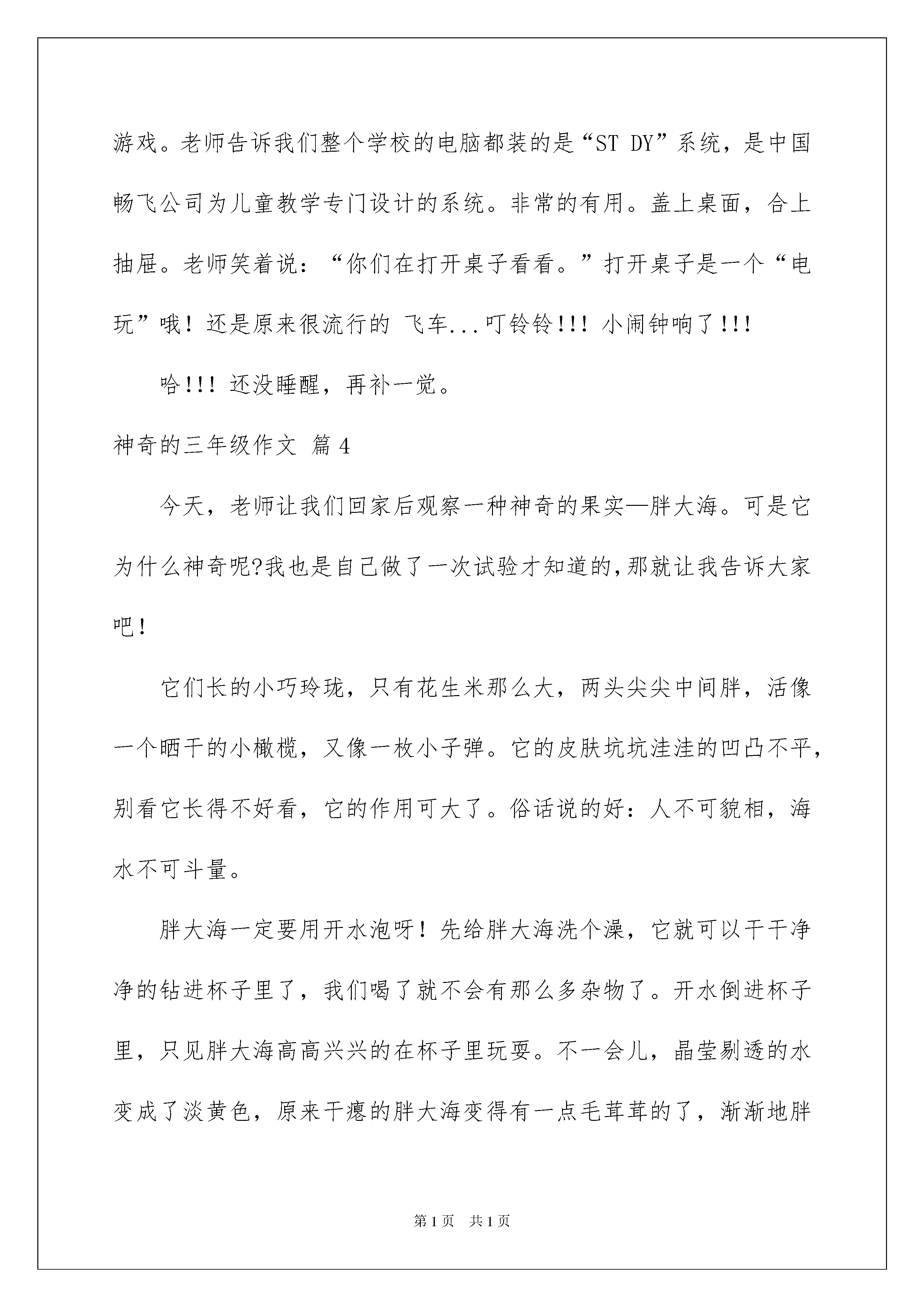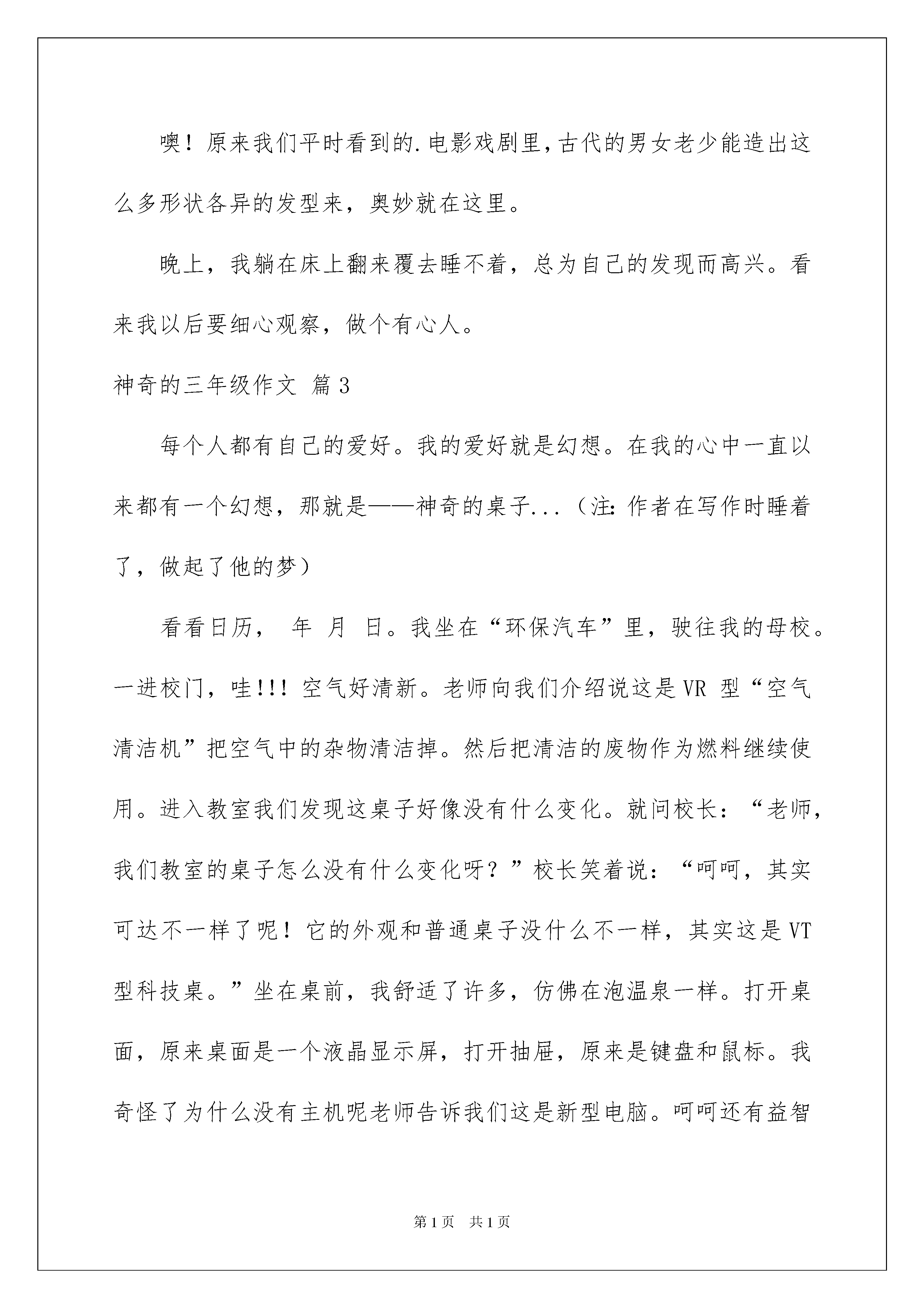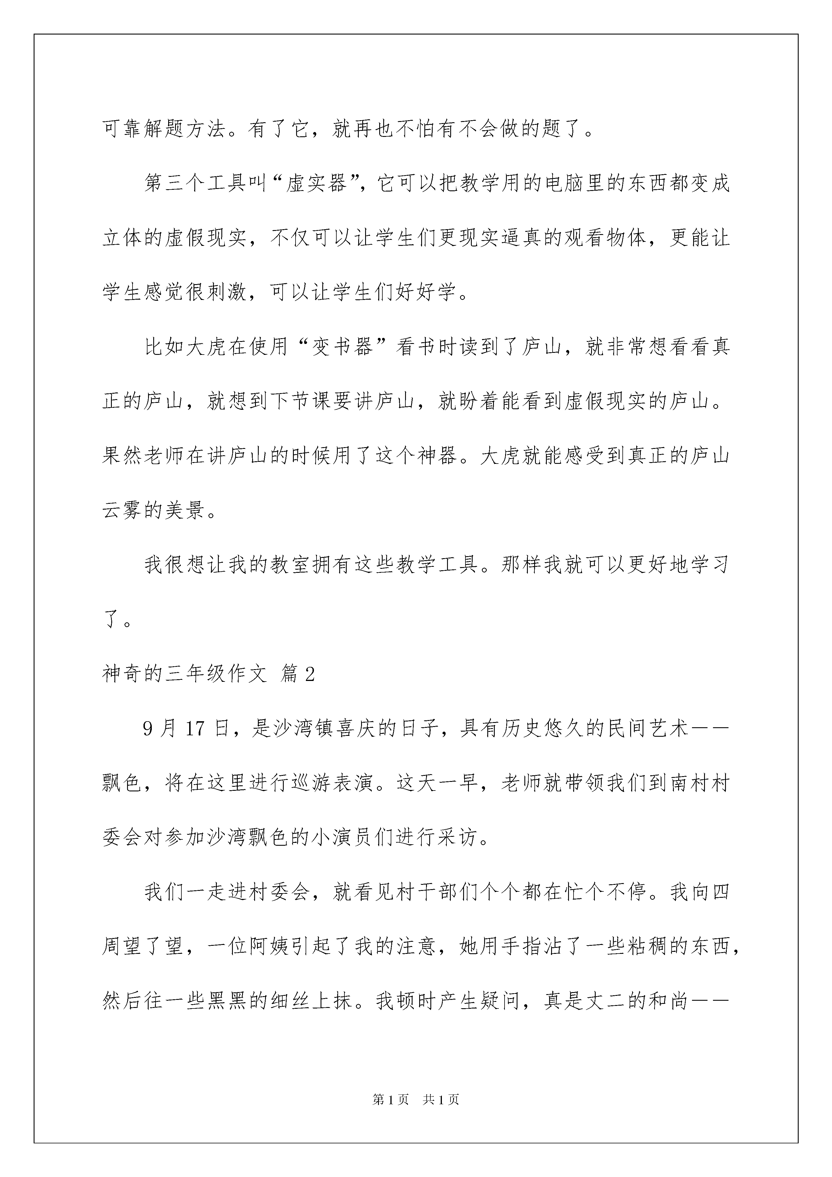 2022神奇的三年级作文合集十篇神奇的三年级作文在学习、工作、生活中,大家总少不了接触作文吧,根据写作命题的特点,作文可以分为命题作文和非命题作文。那么问题来了,到底应如何写一篇优秀的作文呢?下面是我整理的神奇的三年级作文10篇,欢迎大家分享。神奇的三年级作文篇1我很想拥有一个神奇的教室,里面都是神奇的教学工具。工具都很厉害,可以把你想得到的书本都变成现实。第一个工具叫“变书器”。比如老师想要一本教材,可是那都买不到,这时就能向教室求助,它就能马上把这本教材变到你眼前。有了这样的“变书器”你就可以想要什么书本就有什么书本了。第二个工具叫“彗星”。它可以自动解答所有的问题。作业题有不懂就能去问它,它能告诉你为什么,和这种题最准确的答题方式。比如有一天小明有一道应用题不懂,老师也不在教室,同学有很多也在为这道题烧脑却想不出办法,这时就可以问教室,教室给了他准确又可靠解题方法。有了它,就再也不怕有不会做的题了。第三个工具叫“虚实器”,它可以把教学用的电脑里的东西都变成立体的虚假现实,不仅可以让学生们更现实逼真的观看物体,更能让学生感觉很刺激,可以让学生们好好学。比如大虎在使用“变书器”看书时读到了庐山,就非常想看看真正的庐山,就想到下节课要讲庐山,就盼着能看到虚假现实的庐山。果然老师在讲庐山的时候用了这个神器。大虎就能感受到真正的庐山云雾的美景。我很想让我的教室拥有这些教学工具。那样我就可以更好地学习了。神奇的三年级作文篇29月17日,是沙湾镇喜庆的日子,具有历史悠久的民间艺术――飘色,将在这里进行巡游表演。这天一早,老师就带领我们到南村村委会对参加沙湾飘色的小演员们进行采访。我们一走进村委会,就看见村干部们个个都在忙个不停。我向四周望了望,一位阿姨引起了我的注意,她用手指沾了一些粘稠的东西,然后往一些黑黑的细丝上抹。我顿时产生疑问,真是丈二的和尚――摸不着头脑,惊讶地问:“阿姨,你为什么要把人参往胶水里浸呢?有什么作用呢?”阿姨听了,“扑哧”一声笑了,连忙解释道:“这不是人参,这叫刨花,用水浸泡后可以作假发的粘贴,粤剧花旦装饰头脸的过程少不了它。”阿姨还告诉我,刨花在沙湾飘色的使用已有多年的历史,飘色演员脸额两边的鬓角贴片全是刨花的特效!这时,站在一旁的也老师告诉我,她已经去世的奶奶一直以来都使用刨花水定发型,效果很好;更神奇的是老奶奶在七十多岁去世时依然是满头乌发。为了试试刨花水的功效,我用手指沾了沾刨花水,只见它们粘连在一起,像鼻涕一样。我把刨花水抹在头发上,没过一会儿,头发果然神奇般地粘在一起。在看看阿姨,她像变魔术一样,手灵活地转了一下,一个呈葫芦形的鬓发就出来了。片刻,原来又软又乱的发丝变成了又硬又光亮的鬓发,真有趣!原来生活蕴涵着这么多的小科学知识,看来我以后一定要仔细观察。为什么刨花会有如此神奇的功效呢?我带着问题去问老师。“刨花经水浸泡2―5分钟就会产生粘液。这些黏液具有润发乌发之功效,是一种名副其实的天然绿色美发用品,像现在的生发油。古时候的人们都是用它来做‘定型发胶’的。”老师解释道。噢!原来我们平时看到的.电影戏剧里,古代的男女老少能造出这么多形状各异的发型来,奥妙就在这里。晚上,我躺在床上翻来覆去睡不着,总为自己的发现而高兴。看来我以后要细心观察,做个有心人。神奇的三年级作文篇3每个人都有自己的爱好。我的爱好就是幻想。在我的心中一直以来都有一个幻想,那就是——神奇的桌子...(注:作者在写作时睡着了,做起了他的梦)看看日历,年月日。我坐在“环保汽车”里,驶往我的母校。一进校门,哇!!!空气好清新。老师向我们介绍说这是VR型“空气清洁机”把空气中的杂物清洁掉。然后把清洁的废物作为燃料继续使用。进入教室我们发现这桌子好像没有什么变化。就问校长:“老师,我们教室的桌子怎么没有什么变化呀?”校长笑着说:“呵呵,其实可达不一样了呢!它的外观和普通桌子没什么不一样,其实这是VT型科技桌。”坐在桌前,我舒适了许多,仿佛在泡温泉一样。打开桌面,原来桌面是一个液晶显示屏,打开抽屉,原来是键盘和鼠标。我奇怪了为什么没有主机呢老师告诉我们这是新型电脑。呵呵还有益智游戏。老师告诉我们整个学校的电脑都装的是“STDY”系统,是中国畅飞公司为儿童教学专门设计的系统。非常的有用。盖上桌面,合上抽屉。老师笑着说:“你们在打开桌子看看。”打开桌子是一个“电玩”哦!还是原来很流行的飞车...叮铃铃!!!小闹钟响了!!!哈!!!还没睡醒,再补一觉。神奇的三年级作文篇4今天,老师让我们回家后观察一种神奇的果实—胖大海。可是它为什么神奇呢?我也是自己做了一次试验才知道的,那就让我告诉大家吧!它