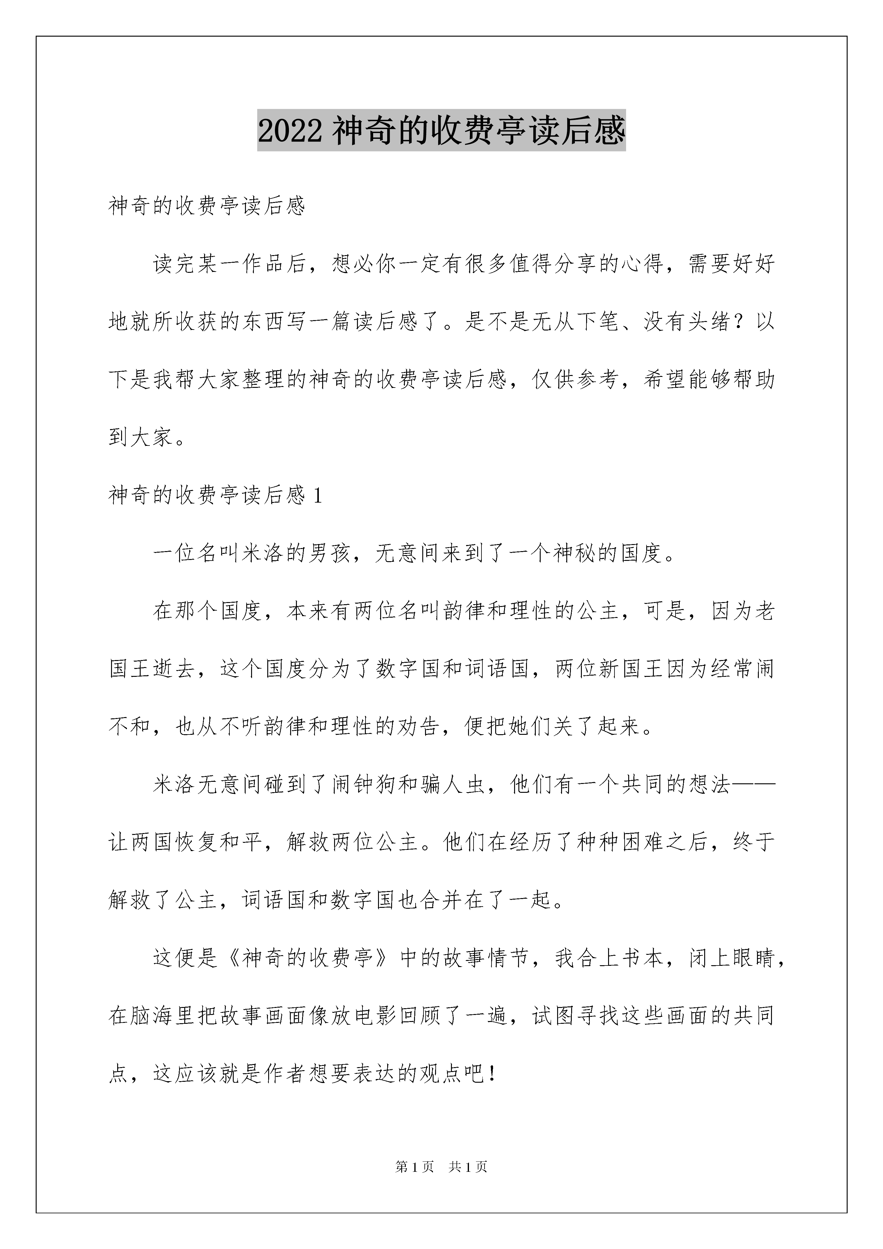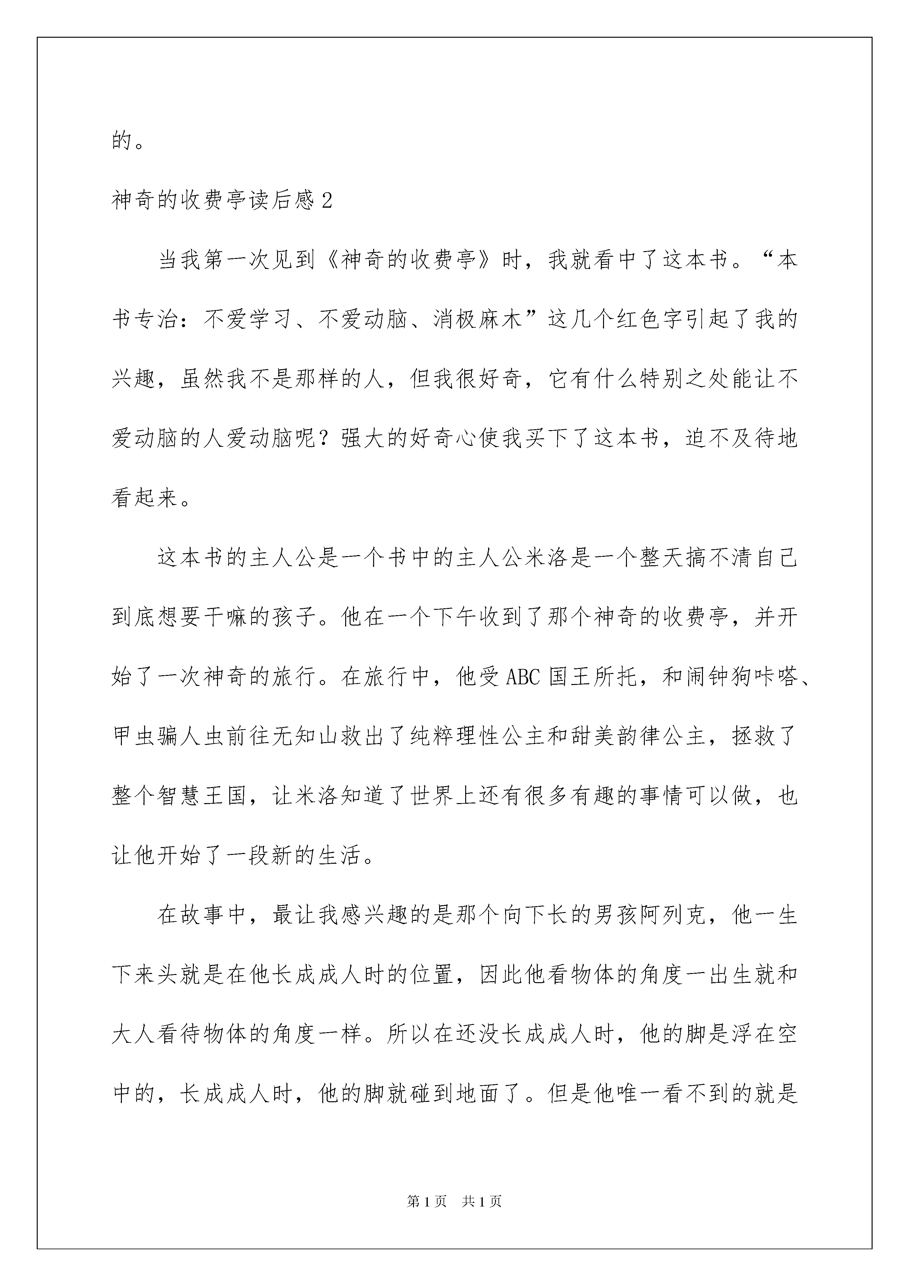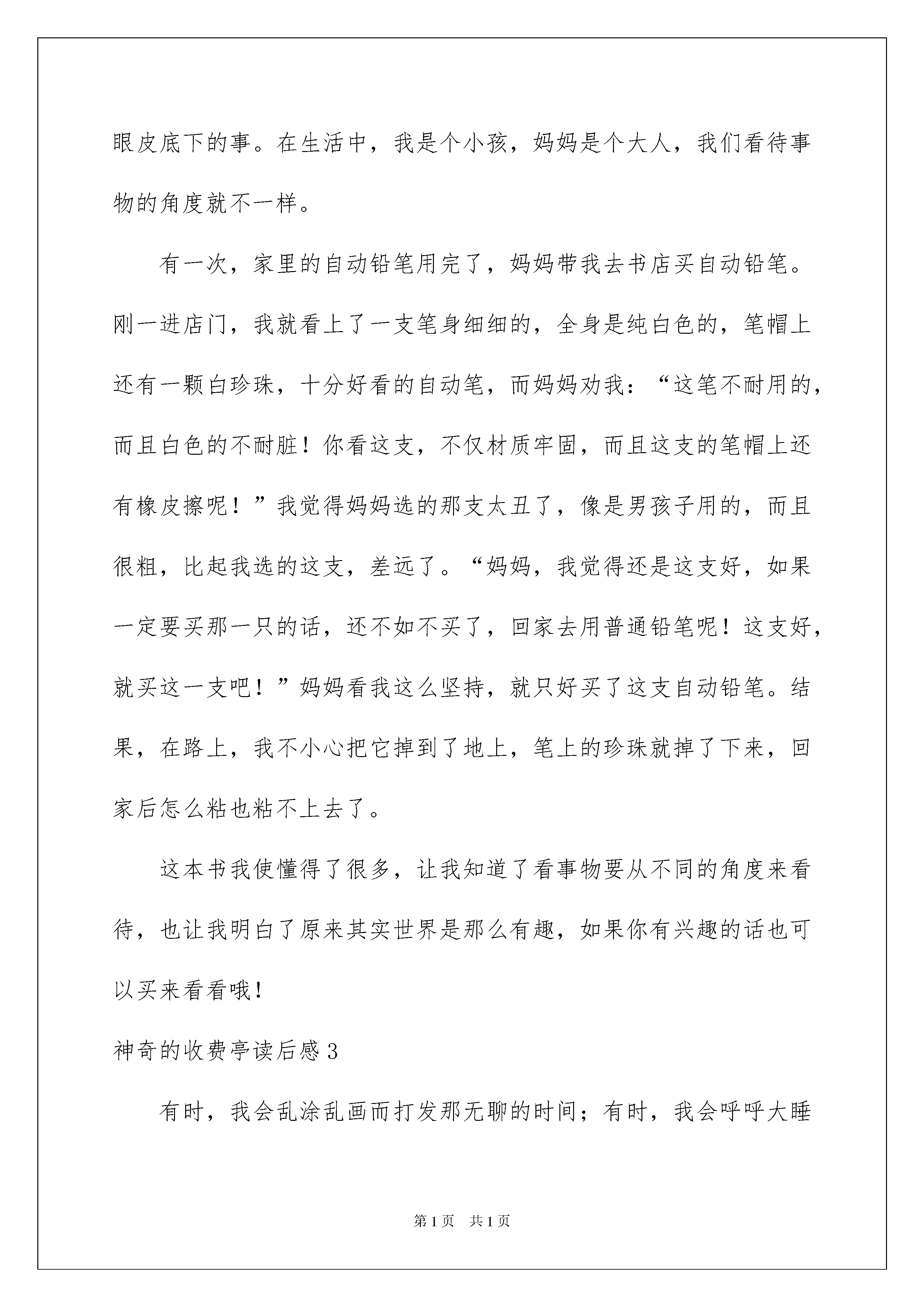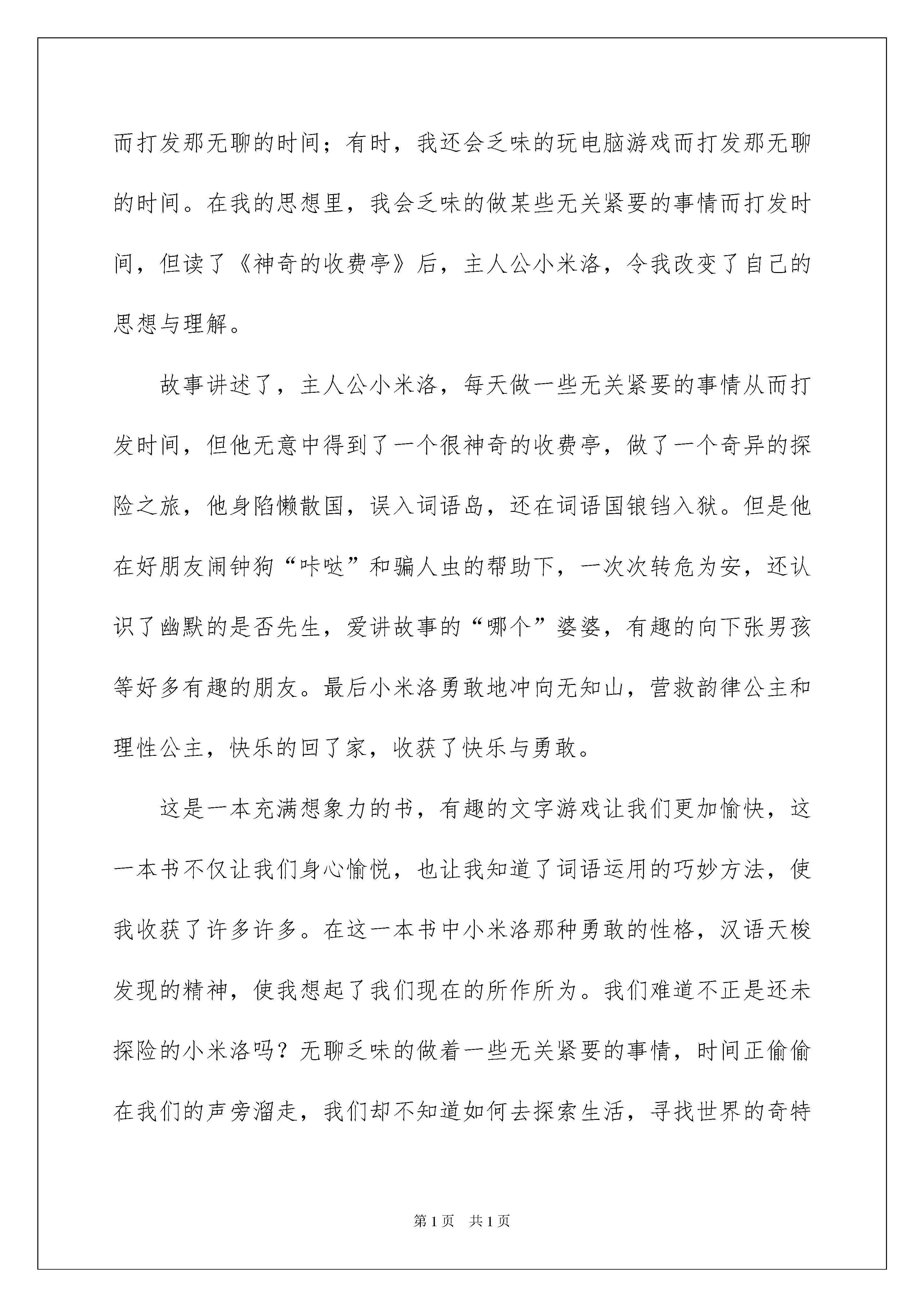 2022神奇的收费亭读后感神奇的收费亭读后感读完某一作品后,想必你一定有很多值得分享的心得,需要好好地就所收获的东西写一篇读后感了。是不是无从下笔、没有头绪?以下是我帮大家整理的神奇的收费亭读后感,仅供参考,希望能够帮助到大家。神奇的收费亭读后感1一位名叫米洛的男孩,无意间来到了一个神秘的国度。在那个国度,本来有两位名叫韵律和理性的公主,可是,因为老国王逝去,这个国度分为了数字国和词语国,两位新国王因为经常闹不和,也从不听韵律和理性的劝告,便把她们关了起来。米洛无意间碰到了闹钟狗和骗人虫,他们有一个共同的想法——让两国恢复和平,解救两位公主。他们在经历了种种困难之后,终于解救了公主,词语国和数字国也合并在了一起。这便是《神奇的收费亭》中的故事情节,我合上书本,闭上眼睛,在脑海里把故事画面像放电影回顾了一遍,试图寻找这些画面的共同点,这应该就是作者想要表达的观点吧!为什么他们遇到困难都不放弃呢?为什么他们坚持要去帮助两位国王?我想,在他们身上除了坚持不懈,应该还有诚实守信。不然,他们完全可以对国王说:“对不起,国王,我们试图去解救公主,可无奈路途太遥远,路上有些困难我们克服不了,无法解救两位公主。”但他们并没有这样做,而是想方设法克服了一个又一个困难。所以我认为他们最大的特点还是诚实守信。一个人如果诚实守信,那么他们的亲朋好友应该会喜欢他。我有一个朋友,他十分讲信用,你让他做的一些事,如果他做得到,他就会说:“好的,稍等。”如果他做不到,他就会说:“对不起,这事我做不到。”一次,他借了我一本书,说好5天还给我,而他看了以后,似乎被书中的情节所吸引了,5天的时间一晃而过,他十分想继续看下去,但他还是遵守信用,恋恋不舍的把书还给我,当然,在还书的时候,他还不忘对我说:“下次,还能借我看吗?”因为他十分守信,所以我爽快地说:“当然可以!”我还了解到,他的朋友特别多,似乎都是因为他诚实守信而跟他交朋友的。或许,“诚实守信,人人皆爱”这句话,还是有一定依据的。神奇的收费亭读后感2当我第一次见到《神奇的收费亭》时,我就看中了这本书。“本书专治:不爱学习、不爱动脑、消极麻木”这几个红色字引起了我的兴趣,虽然我不是那样的人,但我很好奇,它有什么特别之处能让不爱动脑的人爱动脑呢?强大的好奇心使我买下了这本书,迫不及待地看起来。这本书的主人公是一个书中的主人公米洛是一个整天搞不清自己到底想要干嘛的孩子。他在一个下午收到了那个神奇的收费亭,并开始了一次神奇的旅行。在旅行中,他受ABC国王所托,和闹钟狗咔嗒、甲虫骗人虫前往无知山救出了纯粹理性公主和甜美韵律公主,拯救了整个智慧王国,让米洛知道了世界上还有很多有趣的事情可以做,也让他开始了一段新的生活。在故事中,最让我感兴趣的是那个向下长的男孩阿列克,他一生下来头就是在他长成成人时的位置,因此他看物体的角度一出生就和大人看待物体的角度一样。所以在还没长成成人时,他的脚是浮在空中的,长成成人时,他的脚就碰到地面了。但是他唯一看不到的就是眼皮底下的事。在生活中,我是个小孩,妈妈是个大人,我们看待事物的角度就不一样。有一次,家里的自动铅笔用完了,妈妈带我去书店买自动铅笔。刚一进店门,我就看上了一支笔身细细的,全身是纯白色的,笔帽上还有一颗白珍珠,十分好看的自动笔,而妈妈劝我:“这笔不耐用的,而且白色的不耐脏!你看这支,不仅材质牢固,而且这支的笔帽上还有橡皮擦呢!”我觉得妈妈选的那支太丑了,像是男孩子用的,而且很粗,比起我选的这支,差远了。“妈妈,我觉得还是这支好,如果一定要买那一只的话,还不如不买了,回家去用普通铅笔呢!这支好,就买这一支吧!”妈妈看我这么坚持,就只好买了这支自动铅笔。结果,在路上,我不小心把它掉到了地上,笔上的珍珠就掉了下来,回家后怎么粘也粘不上去了。这本书我使懂得了很多,让我知道了看事物要从不同的角度来看待,也让我明白了原来其实世界是那么有趣,如果你有兴趣的话也可以买来看看哦!神奇的收费亭读后感3有时,我会乱涂乱画而打发那无聊的时间;有时,我会呼呼大睡而打发那无聊的时间;有时,我还会乏味的玩电脑游戏而打发那无聊的时间。在我的思想里,我会乏味的做某些无关紧要的事情而打发时间,但读了《神奇的收费亭》后,主人公小米洛,令我改变了自己的思想与理解。故事讲述了,主人公小米洛,每天做一些无关紧要的事情从而打发时间,但他无意中得到了一个很神奇的收费亭,做了一个奇异的探险之旅,他身陷懒散国,误入词语岛,还在词语国锒铛入狱。但是他在好朋友闹钟狗“咔哒”和骗人虫的帮助下,一次次转危为安,还认识了幽默的是否先生,爱讲故事的“哪个”婆婆,有趣的向下张男孩等好多