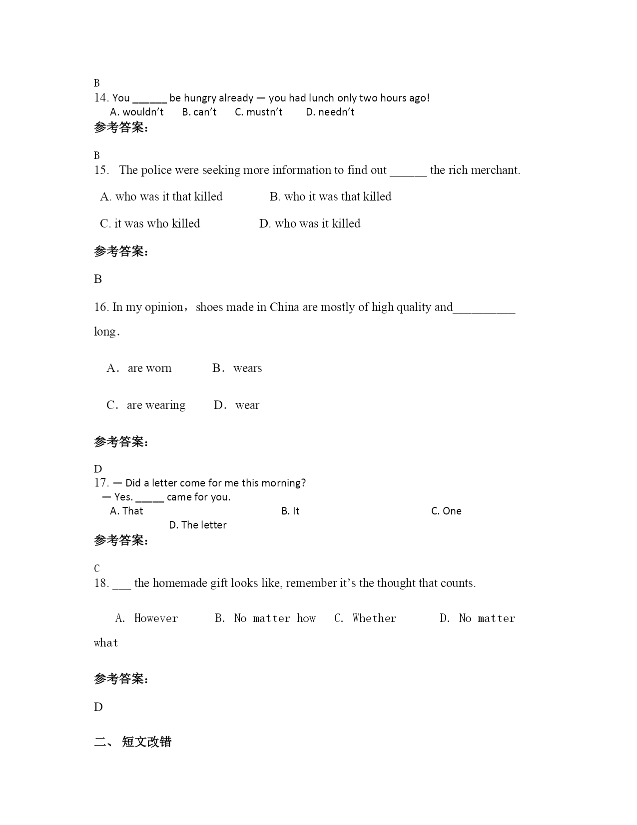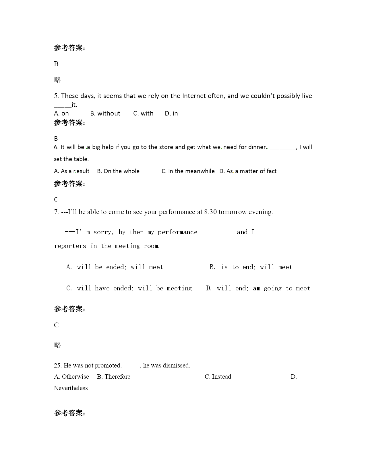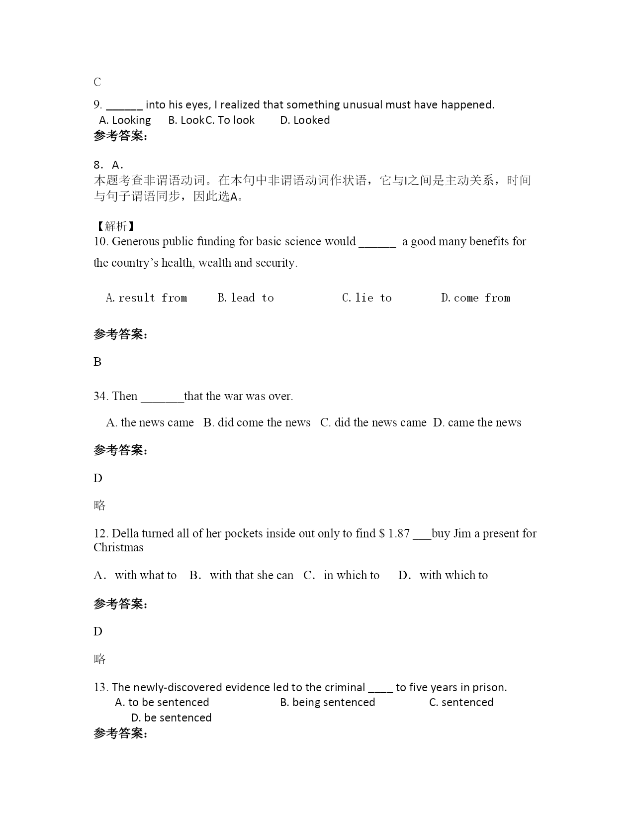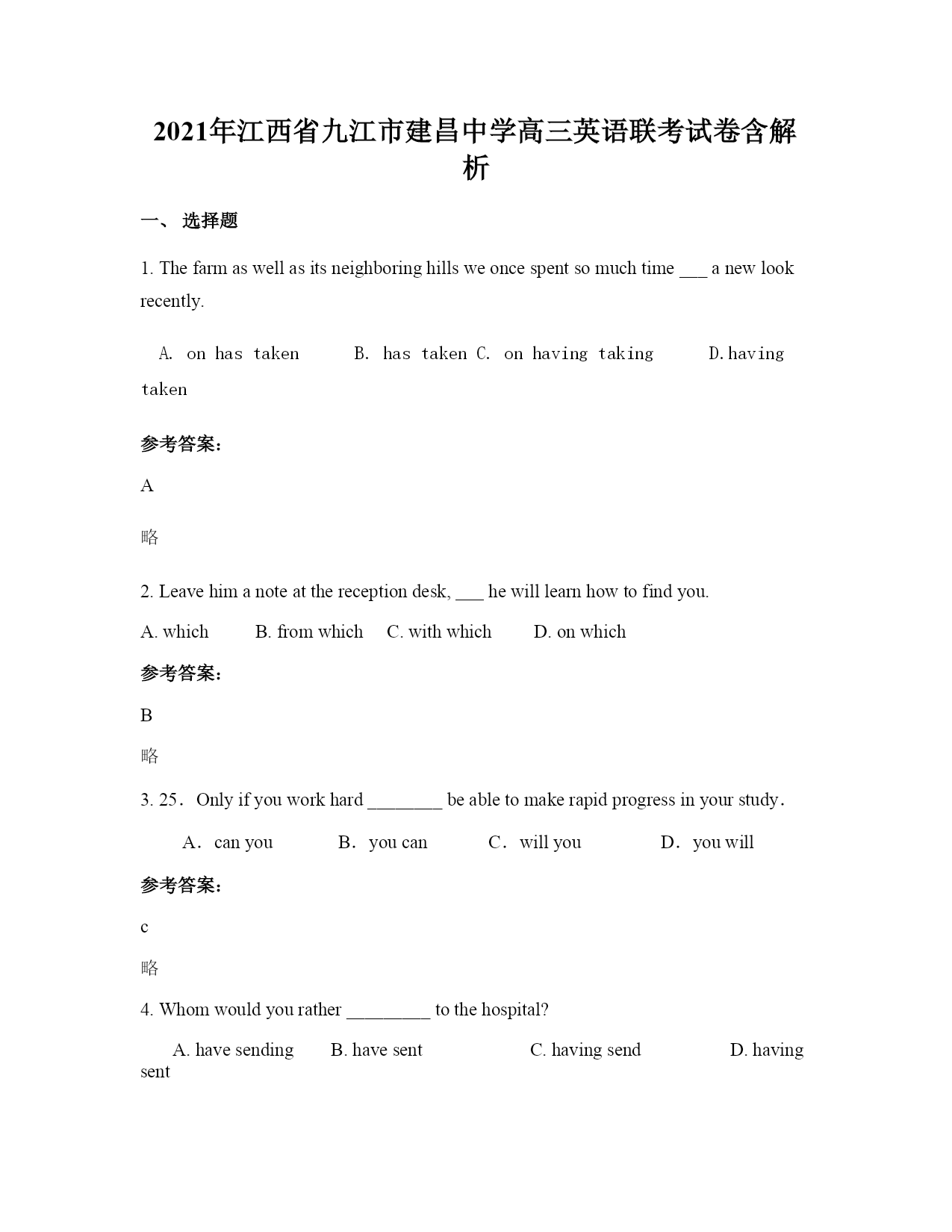 2021年江西省九江市建昌中学高三英语联考试卷含解析 一、选择题 1.Thefarmaswellasitsneighboringhillsweoncespentsomuchtime___anewlookrecently. A.onhastakenB.hastakenC.onhavingtakingD.havingtaken 参考答案: A 略 2.Leavehimanoteatthereceptiondesk,hewilllearnhowtofindyou. A.whichB.fromwhichC.withwhichD.onwhich 参考答案: B 略 3.25.Onlyifyouworkhard________beabletomakerapidprogressinyourstudy. A.canyouB.youcanC.willyouD.youwill 参考答案: c 略 4.Whomwouldyourather_________tothehospital? A.havesendingB.havesentC.havingsendD.havingsent 参考答案: B 略 5.Thesedays,itseemsthatwerelyontheInternetoften,andwecouldn’tpossiblylive_____it. A.onB.withoutC.withD.in 参考答案: B 6.Itwillbeabighelpifyougotothestoreandgetwhatweneedfordinner.________,Iwillsetthetable. A.Asaresult B.Onthewhole C.InthemeanwhileD.Asamatteroffact 参考答案: C 7.---I’llbeabletocometoseeyourperformanceat8:30tomorrowevening. ---I’msorry,bythenmyperformance_________andI________reportersinthemeetingroom. A.willbeended;willmeetB.istoend;willmeet C.willhaveended;willbemeetingD.willend;amgoingtomeet 参考答案: C 略 25.Hewasnotpromoted._____,hewasdismissed. A.Otherwise B.Therefore C.Instead D.Nevertheless 参考答案: C 9.______intohiseyes,Irealizedthatsomethingunusualmusthavehappened. A.Looking B.Look C.Tolook D.Looked 参考答案: 8.A. 本题考查非谓语动词。在本句中非谓语动词作状语,它与I之间是主动关系,时间与句子谓语同步,因此选A。 【解析】 10.Generouspublicfundingforbasicsciencewould______agoodmanybenefitsforthecountry’shealth,wealthandsecurity. A.resultfromB.leadtoC.lietoD.comefrom 参考答案: B 34.Then_______thatthewarwasover. A.thenewscameB.didcomethenewsC.didthenewscameD.camethenews 参考答案: D 略 12.Dellaturnedallofherpocketsinsideoutonlytofind$1.87___buyJimapresentforChristmas A.withwhattoB.withthatshecanC.inwhichtoD.withwhichto 参考答案: D 略 13.Thenewly-discoveredevidenceledtothecriminal____tofiveyearsinprison. A.tobesentenced B.beingsentenced C.sentenced D.besentenced 参考答案: B 14.You______behungryalready—youhadlunchonlytwohoursago! A.wouldn’tB.can’tC.mustn’tD.needn’t 参考答案: B 15.Thepolicewereseekingmoreinformationtofindout______therichmerchant.
