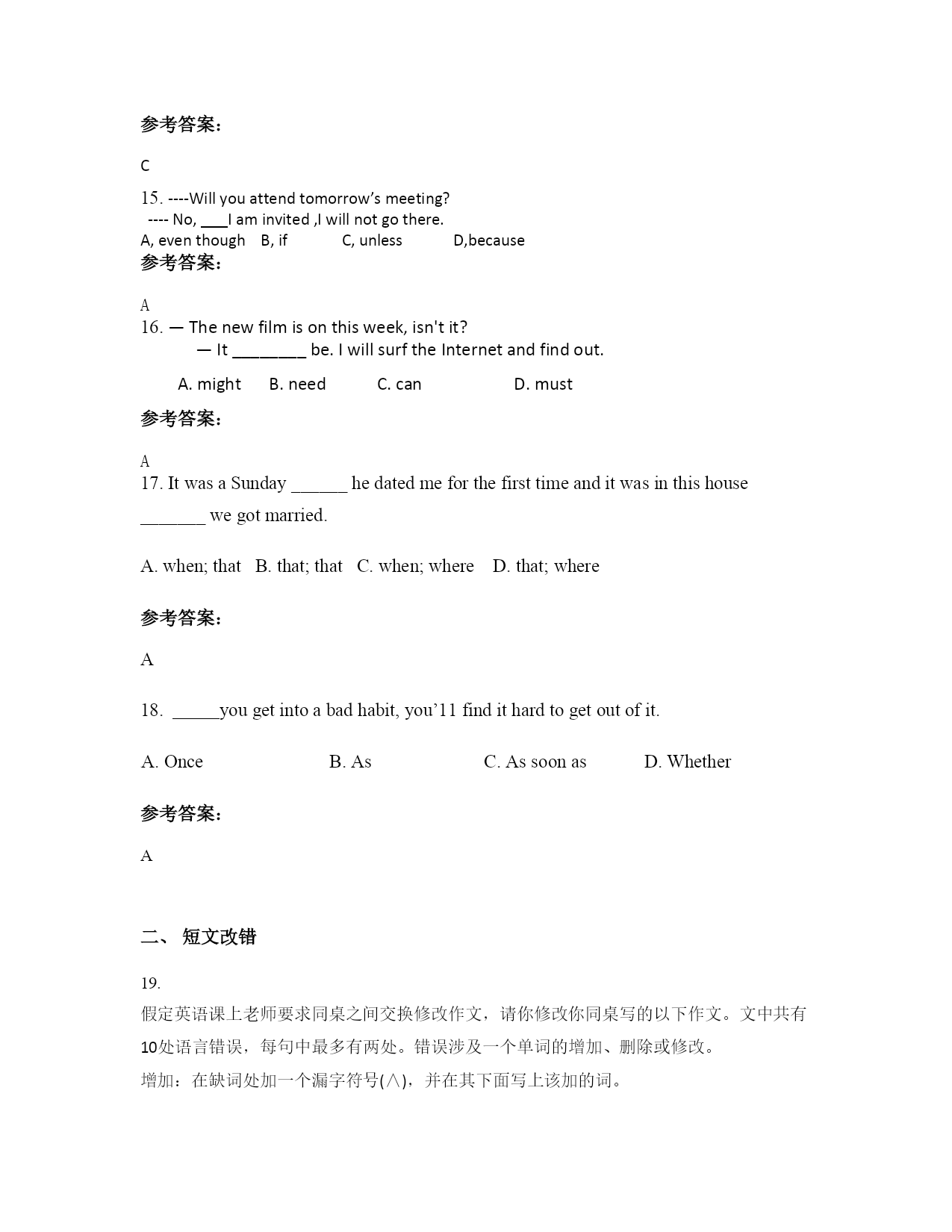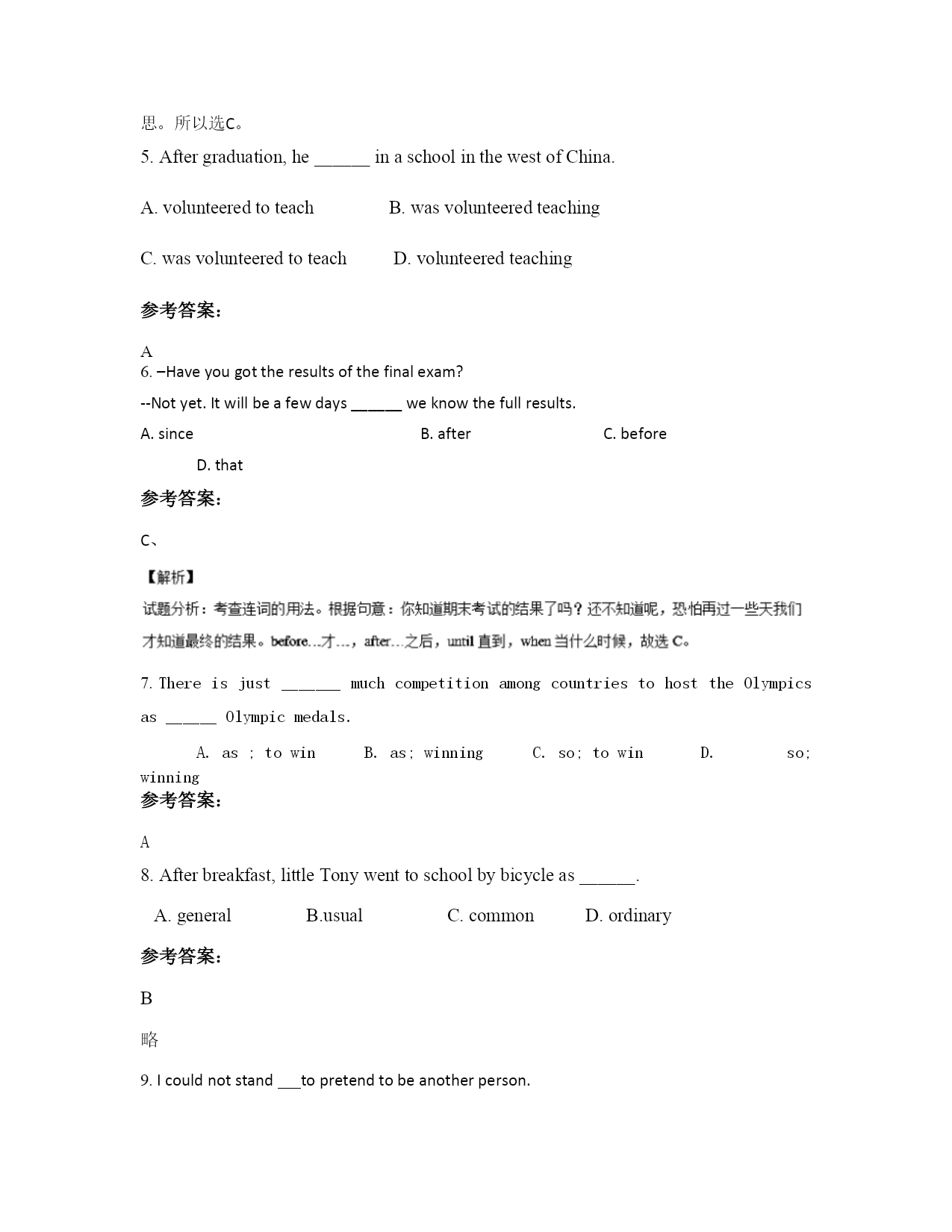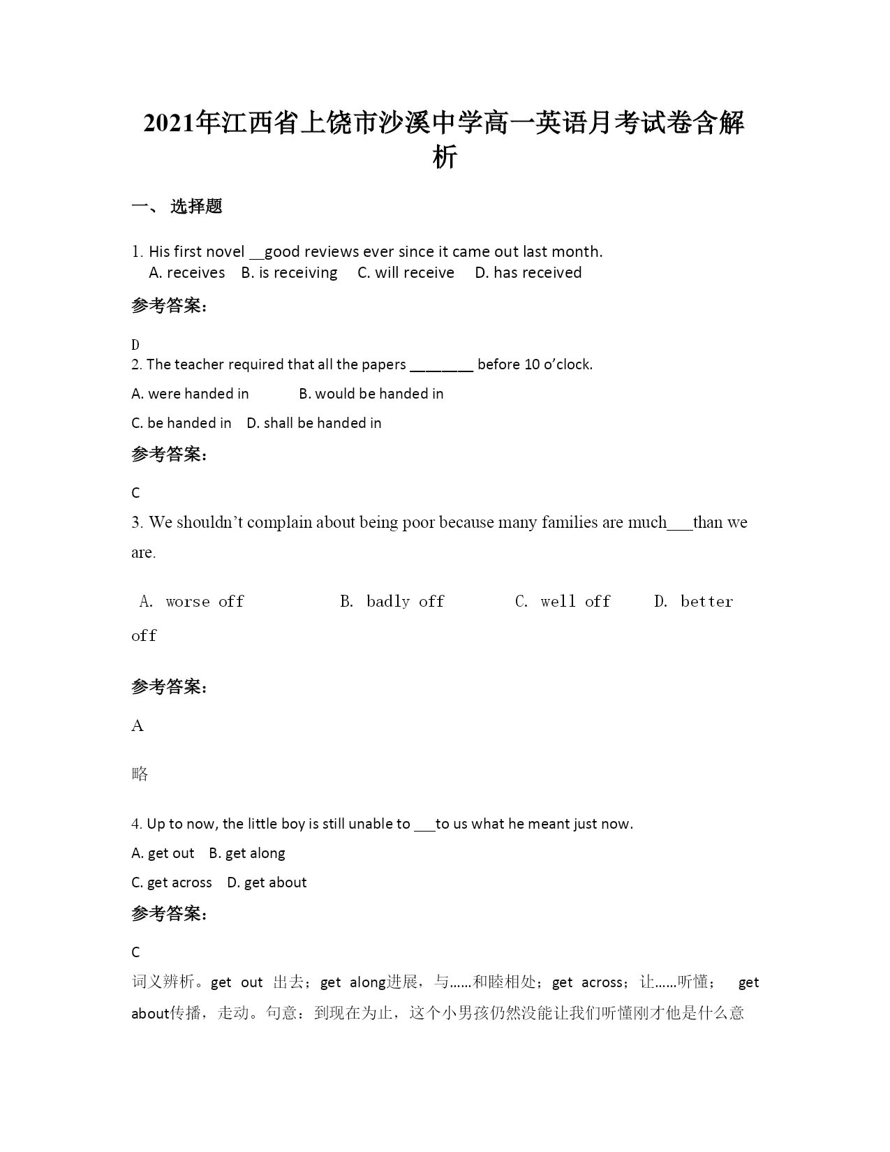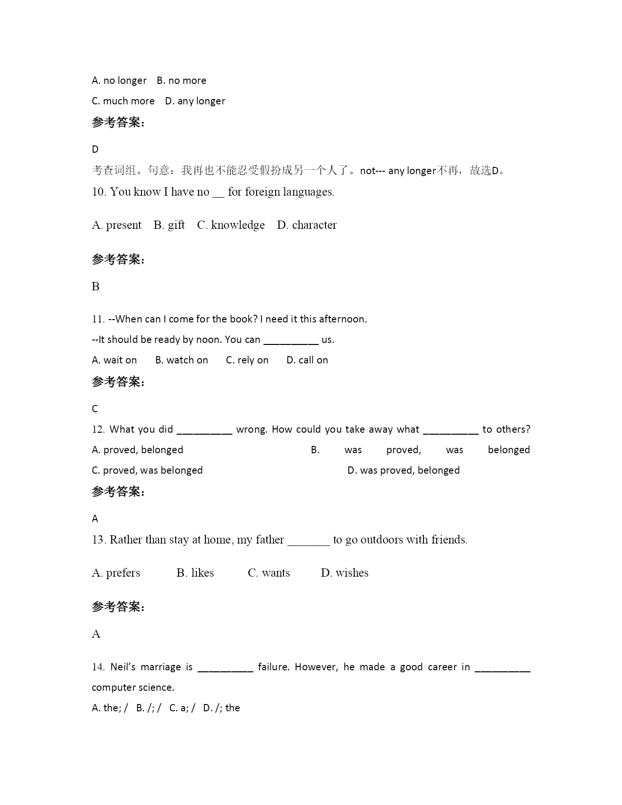 2021年江西省上饶市沙溪中学高一英语月考试卷含解析 一、选择题 1.Hisfirstnovelgoodreviewseversinceitcameoutlastmonth. A.receivesB.isreceivingC.willreceiveD.hasreceived 参考答案: D 2.Theteacherrequiredthatallthepapers________before10o’clock. A.werehandedin B.wouldbehandedin C.behandedin D.shallbehandedin 参考答案: C 3.Weshouldn’tcomplainaboutbeingpoorbecausemanyfamiliesaremuchthanweare. A.worseoffB.badlyoffC.welloffD.betteroff 参考答案: A 略 4.Uptonow,thelittleboyisstillunabletotouswhathemeantjustnow. A.getoutB.getalong C.getacrossD.getabout 参考答案: C 词义辨析。getout出去;getalong进展,与……和睦相处;getacross;让……听懂;getabout传播,走动。句意:到现在为止,这个小男孩仍然没能让我们听懂刚才他是什么意思。所以选C。 5.Aftergraduation,he______inaschoolinthewestofChina. A.volunteeredtoteachB.wasvolunteeredteaching C.wasvolunteeredtoteachD.volunteeredteaching 参考答案: A 6.–Haveyougottheresultsofthefinalexam? --Notyet.Itwillbeafewdays______weknowthefullresults. A.since B.after C.before D.that 参考答案: C、 7.Thereisjust_______muchcompetitionamongcountriestohosttheOlympicsas______Olympicmedals. A.as;towin B.as;winning C.so;towin D.so;winning 参考答案: A 8.Afterbreakfast,littleTonywenttoschoolbybicycleas______. A.generalB.usualC.commonD.ordinary 参考答案: B 略 9.Icouldnotstandtopretendtobeanotherperson. A.nolongerB.nomore C.muchmoreD.anylonger 参考答案: D 考查词组。句意:我再也不能忍受假扮成另一个人了。not---anylonger不再,故选D。 10.YouknowIhavenoforforeignlanguages. A.presentB.giftC.knowledgeD.character 参考答案: B 11.--WhencanIcomeforthebook?Ineeditthisafternoon. --Itshouldbereadybynoon.Youcan__________us. A.waitonB.watchonC.relyonD.callon 参考答案: C 12.Whatyoudid__________wrong.Howcouldyoutakeawaywhat__________toothers?A.proved,belonged B.wasproved,wasbelongedC.proved,wasbelonged D.wasproved,belonged 参考答案: A 13.Ratherthanstayathome,myfather_______togooutdoorswithfriends. A.prefersB.likesC.wantsD.wishes 参考答案: A 14.Neil’smarriageis__________failure.However,hemadeagoodcareerin__________computerscience. A.the;/B./;/C.a;/D./;the 参考答案: C 15.----Willyouattendtomorrow’smeeting? ----No,Iaminvited,Iwillnotgothere. A,eventhoughB,
