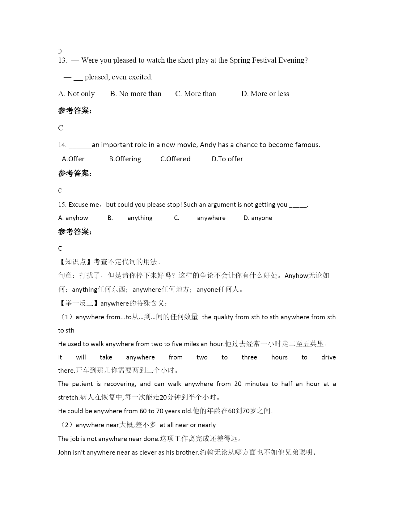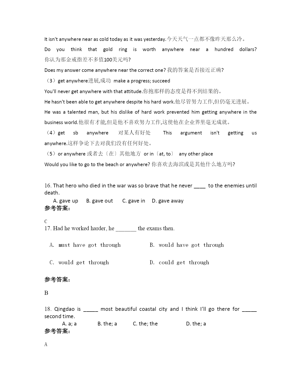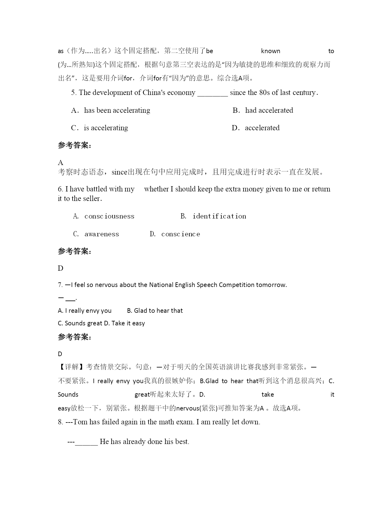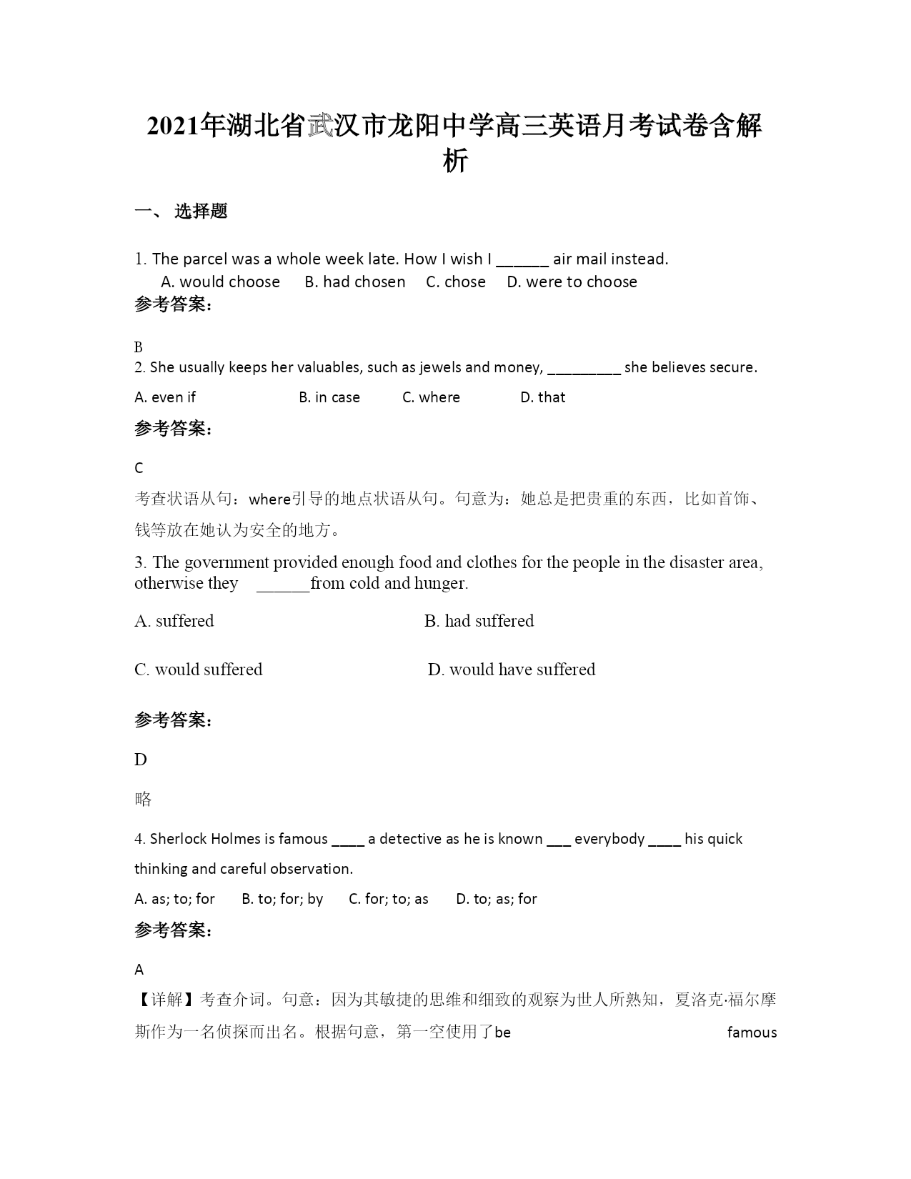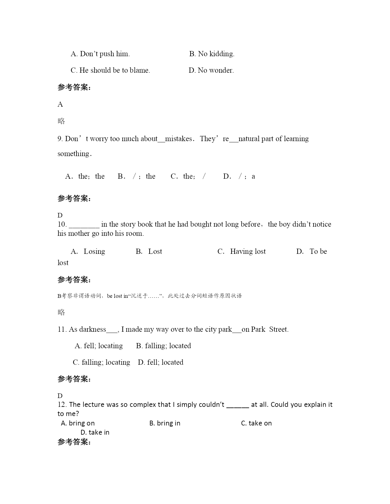 2021年湖北省武汉市龙阳中学高三英语月考试卷含解析 一、选择题 1.Theparcelwasawholeweeklate.HowIwishI______airmailinstead. A.wouldchooseB.hadchosenC.choseD.weretochoose 参考答案: B 2.Sheusuallykeepshervaluables,suchasjewelsandmoney,_________shebelievessecure. A.evenif B.incase C.where D.that 参考答案: C 考查状语从句:where引导的地点状语从句。句意为:她总是把贵重的东西,比如首饰、钱等放在她认为安全的地方。 3.Thegovernmentprovidedenoughfoodandclothesforthepeopleinthedisasterarea,otherwisethey______fromcoldandhunger. A.sufferedB.hadsuffered C.wouldsufferedD.wouldhavesuffered 参考答案: D 略 4.SherlockHolmesisfamous____adetectiveasheisknown___everybody____hisquickthinkingandcarefulobservation. A.as;to;for B.to;for;by C.for;to;as D.to;as;for 参考答案: A 【详解】考查介词。句意:因为其敏捷的思维和细致的观察为世人所熟知,夏洛克·福尔摩斯作为一名侦探而出名。根据句意,第一空使用了befamousas(作为…..出名)这个固定搭配,第二空使用了beknownto(为…所熟知)这个固定搭配,根据句意第三空表达的是“因为敏捷的思维和细致的观察力而出名”,这是要用介词for,介词for有“因为”的意思。综合选A项。 5.ThedevelopmentofChina'seconomy________sincethe80soflastcentury. A.hasbeenacceleratingB.hadaccelerated C.isacceleratingD.accelerated 参考答案: A考察时态语态,since出现在句中应用完成时,且用完成进行时表示一直在发展。 6.IhavebattledwithmywhetherIshouldkeeptheextramoneygiventomeorreturnittotheseller. A.consciousnessB.identification C.awarenessD.conscience 参考答案: D 7.—IfeelsonervousabouttheNationalEnglishSpeechCompetitiontomorrow. —. A.Ireallyenvyyou B.Gladtohearthat C.Soundsgreat D.Takeiteasy 参考答案: D 【详解】考查情景交际。句意:—对于明天的全国英语演讲比赛我感到非常紧张。—不要紧张。Ireallyenvyyou我真的很嫉妒你;B.Gladtohearthat听到这个消息很高兴;C.Soundsgreat听起来太好了。D.takeiteasy放松一下,别紧张。根据题干中的nervous(紧张)可推知答案为A。故选A项。 8.---Tomhasfailedagaininthemathexam.Iamreallyletdown. ---______Hehasalreadydonehisbest. A.Don’tpushhim.B.Nokidding. C.Heshouldbetoblame.D.Nowonder. 参考答案: A 略 9.Don’tworrytoomuchaboutmistakes.They’renaturalpartoflearningsomething. A.the;theB./;theC.the;/D./;a 参考答案: D 10.________inthestorybookthathehadboughtnotlongbefore,theboydidn’tnoticehismothergointohisroom. A.LosingB.LostC.HavinglostD.Tobelost 参考答案: B考察非谓语动词,belostin“沉迷于……”,此处过去分词短语作原因状语 略 11.Asdarkness,ImademywayovertothecityparkonParkStreet. A.fell;locatingB.falling;lo