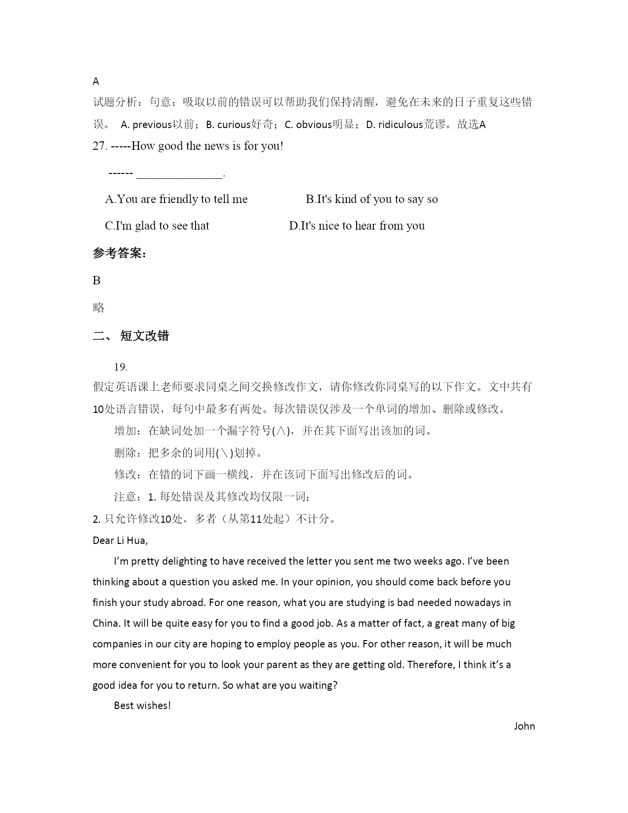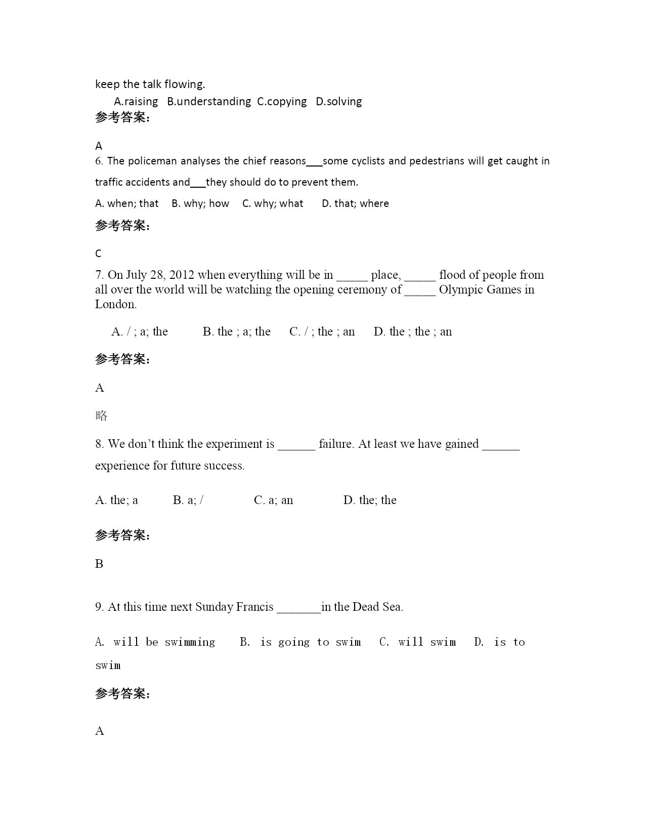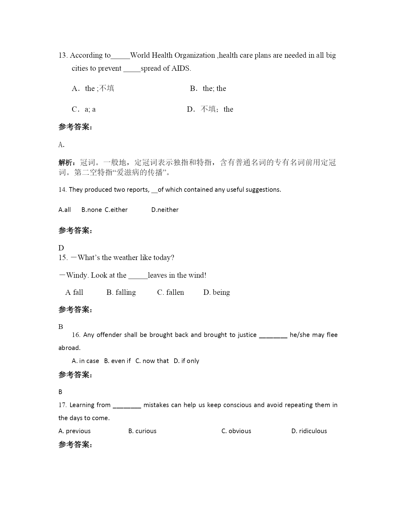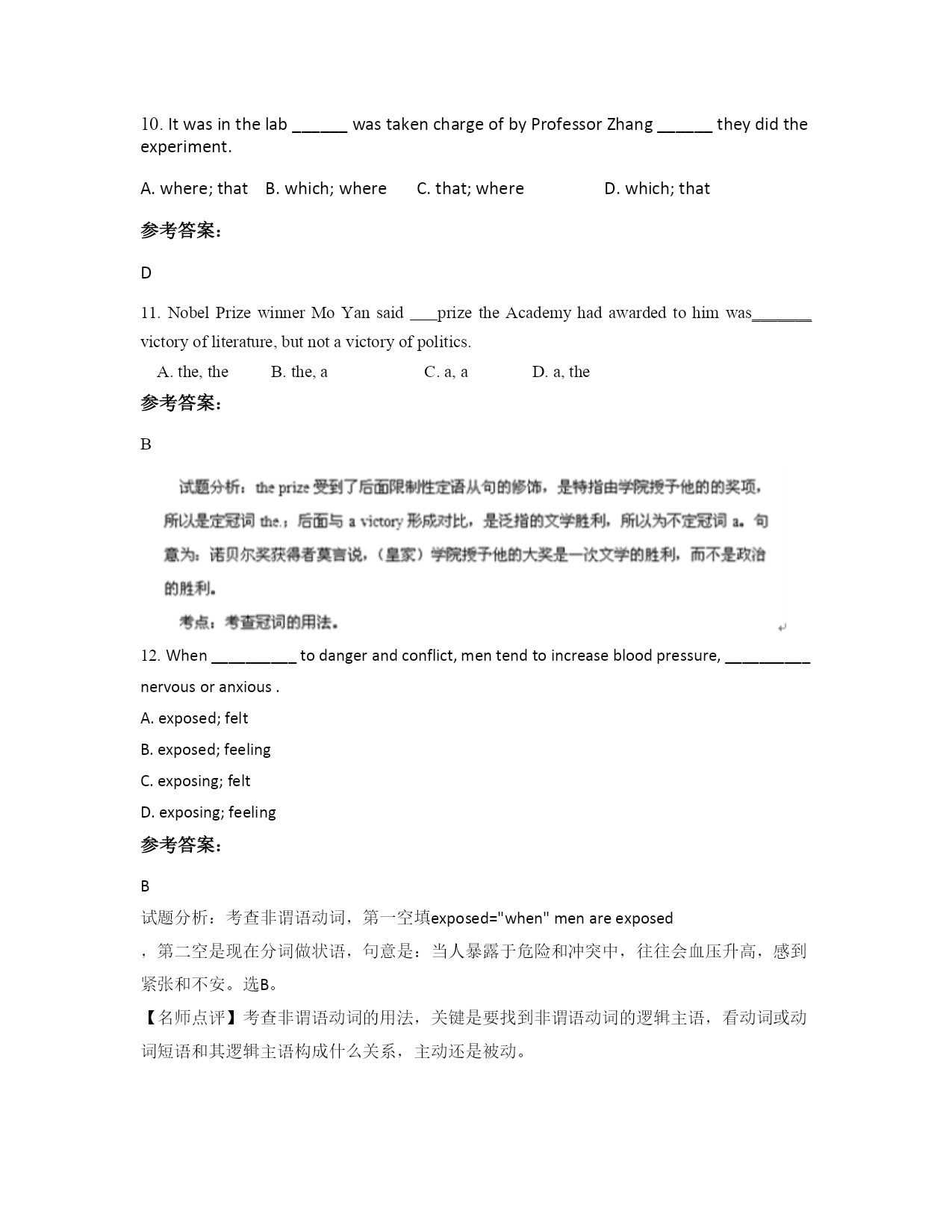2021年四川省眉山市东坡区职业高级中学高三英语期末试题含解析 一、选择题 1._____heappearedtobeonlyaboutten,heseemedtohaveknownthebitternessoflife. A.SinceB.Besides C.ThoughD.Aslongas 参考答案: C 2.It’salwaysdifficultbeinginaforeigncountry,___________ifyoucan’tspeakthelanguage. A.extremelyB.naturallyC.basicallyD.especially 参考答案: D 3.Althoughhesometimesloseshistemper,hisstudentslikehim________forit.A.notsomuchB.notsolittleC.nomoreD.noless 参考答案: D 解析:noless意为“还是,仍旧”,相当于nonetheless. 4.Childrenbetweentheagesof3and6attendkindergartens,_____areoftenrunbythegovernment. A.whichB.thatC.whereD.who 参考答案: A 5.Agoodlistenertakespartintheconversation,offeringideasand___questionstokeepthetalkflowing. A.raisingB.understandingC.copyingD.solving 参考答案: A 6.Thepolicemananalysesthechiefreasonssomecyclistsandpedestrianswillgetcaughtintrafficaccidentsandtheyshoulddotopreventthem. A.when;thatB.why;howC.why;whatD.that;where 参考答案: C 7.OnJuly28,2012wheneverythingwillbein_____place,_____floodofpeoplefromallovertheworldwillbewatchingtheopeningceremonyof_____OlympicGamesinLondon. A./;a;theB.the;a;theC./;the;anD.the;the;an 参考答案: A 略 8.Wedon’tthinktheexperimentis______failure.Atleastwehavegained______experienceforfuturesuccess. A.the;aB.a;/C.a;anD.the;the 参考答案: B 9.AtthistimenextSundayFrancis_______intheDeadSea. A.willbeswimmingB.isgoingtoswimC.willswimD.istoswim 参考答案: A 10.Itwasinthelab______wastakenchargeofbyProfessorZhang______theydidtheexperiment. A.where;thatB.which;whereC.that;whereD.which;that 参考答案: D 11.NobelPrizewinnerMoYansaidprizetheAcademyhadawardedtohimwas_______victoryofliterature,butnotavictoryofpolitics. A.the,theB.the,a C.a,a D.a,the 参考答案: B 12.When__________todangerandconflict,mentendtoincreasebloodpressure,__________nervousoranxious. A.exposed;felt B.exposed;feeling C.exposing;felt D.exposing;feeling 参考答案: B 试题分析:考查非谓语动词,第一空填exposed="when"menareexposed,第二空是现在分词做状语,句意是:当人暴露于危险和冲突中,往往会血压升高,感到紧张和不安。选B。 【名师点评】考查非谓语动词的用法,关键是要找到非谓语动词的逻辑主语,看动词或动词短语和其逻辑主语构成什么关系,主动还是被动。 13.AccordingtoWorldHealthOrganization,healthcareplansar