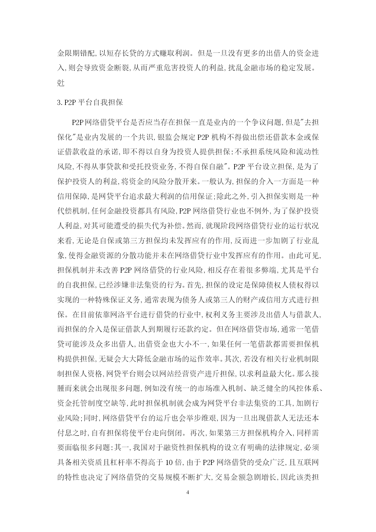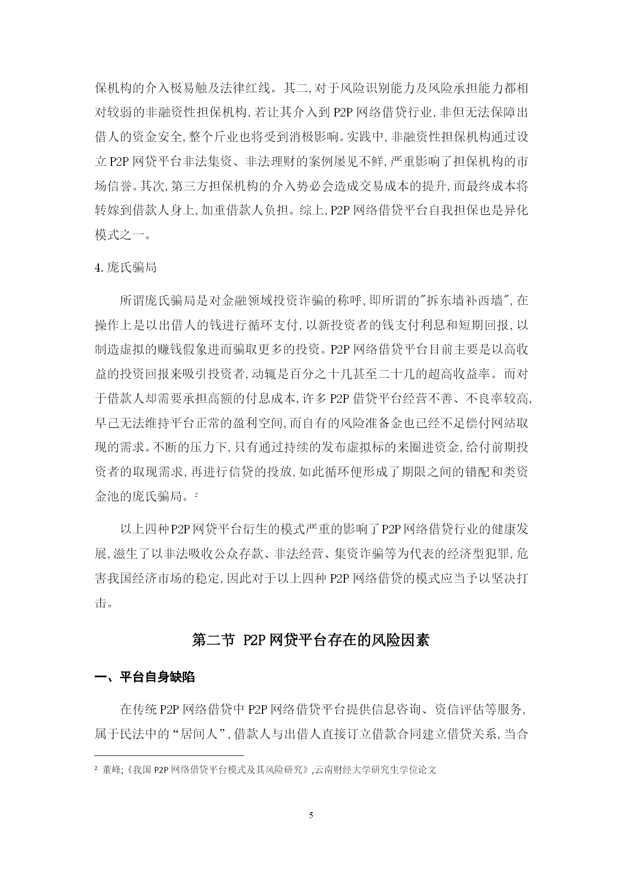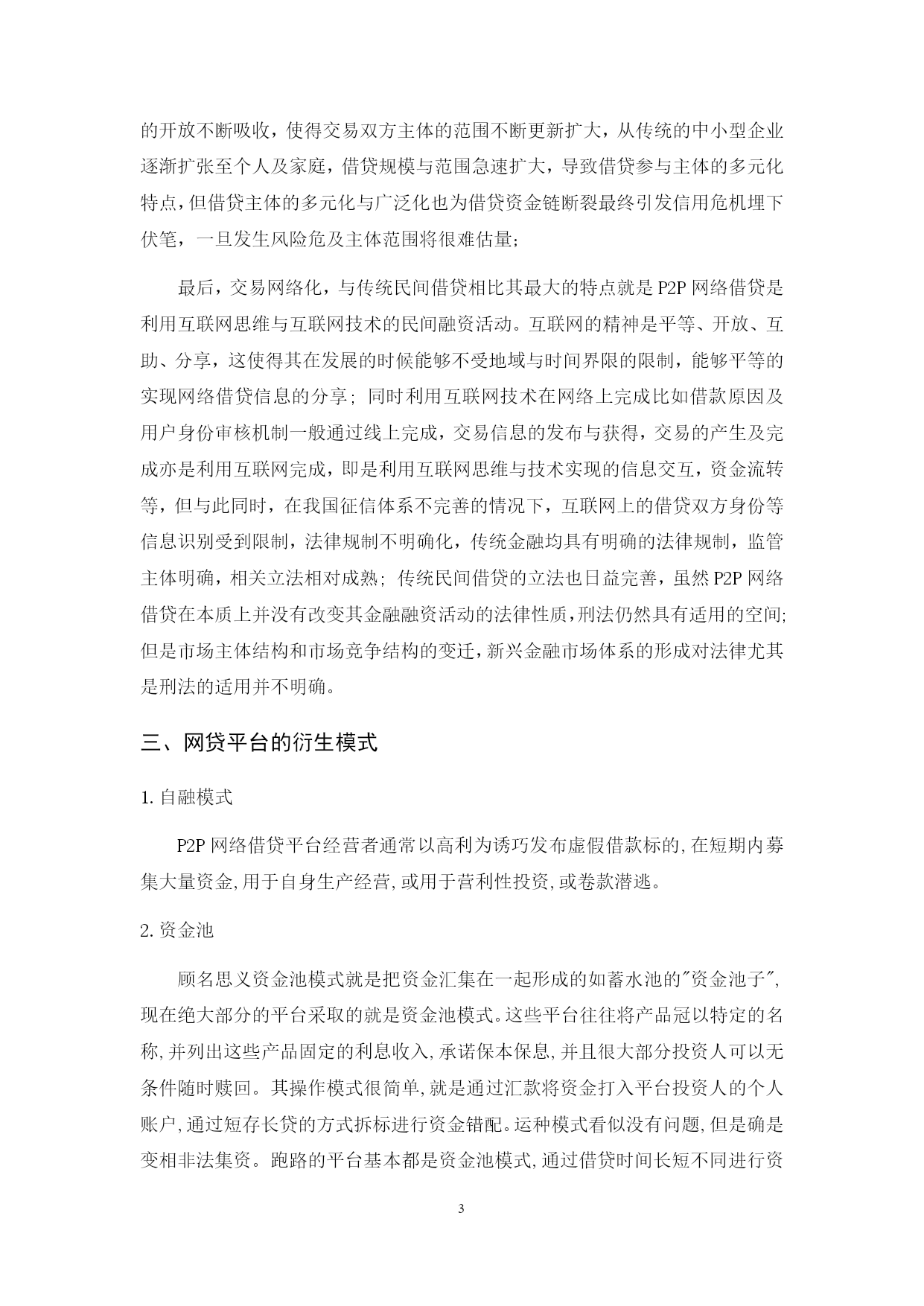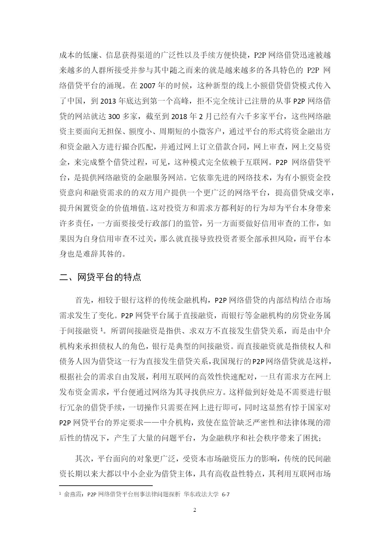 第一章P2P网络借贷现象观察 网络的发展无疑为市场上一大批的企业成立带来不小机遇,在互联网的带动下,逐渐由小数量的点对点模式企业扩大到几千家的规模。我们知道万事万物当量的积累达到了一定程度即使不发生质的变化也能在数量的累积中寻求客观存在的自然规律,互联网市场亦然。 网贷平台发展轨迹及特点 一、P2P网络借贷在我国的发展背景 作为P2P网络借贷平台本身而言,我国的P2P最早是小额的个贷民营企业发展而成的。在那个时代我国在工业,农业以及服务业等方面都刚刚起步,各项事业发展都尚未成熟,人民生活水平普遍较低,对物质需求极大但获取的渠道却是有限的,而像一些没有资产又想要以个人的名义做资本运作的人,就受到了大大的限制,在这种情况下,社会上自然就出现了少数“慈善者”,即把吸收来的现有的资金借给这些没有能力用自己的资本作抵押的普通人,以达到帮助困难户,拉小贫富差距的目的。在这同一时期里,以国外的“乡村银行”最具代表,它是孟加拉国经济学家默罕默德·尤努斯创建的,叫作格莱珉银行。作为一个具有公益性质的银行,其经营与运行模式和普通的银行基本一致,但不同的是在贷款这一方面,由于它的公益性决定在贷款时,贷款人享受无抵押无担保的贷款,当然这些贷款的数额是有限制的,只是够他们做一些小本买卖,目的是帮助那些真正需要钱来维持生计的人,给他们一个能自主创业、自给自足的机会。这种方式很快被各国认可并采纳,以英、美最为迅速。而我们国家的经济起步较晚,在西方国家已经开始不断创新中我们才有了小额借贷这种最初始的模式,慢慢的一些中小企业开始发现除去银行之外的借贷路径,而这种方式似乎更合人心,伴随着我国市场经济的发展,民营经济获得了广泛而快速的发展,由此产生的民间借贷市场也发展迅速,小额贷款公司、投资担保公司等民间形式的借贷公司大量涌现,所以小额借贷在我国经济发展初期站稳了脚步。伴随着互联网的普及和信息技术的迅速发展,小额信贷开始与互联网技术相融合,并主要形式也有线下的实体存在转变为线上的“互联网+”模式,由此出现了P2P网络借贷平台。由于其交易成本的低廉、信息获得渠道的广泛性以及手续方便快捷,P2P网络借贷迅速被越来越多的人群所接受并参与其中,随之而来的就是越来越多的各具特色的P2P网络借贷平台的涌现。在2007年的时候,这种新型的线上小额借贷借贷模式传入了中国,到2013年底达到第一个高峰,拒不完全统计已注册的从事P2P网络借贷的网站就达300多家,截至到2018年2月已经有六千多家平台,这些网络融资主要面向无担保、额度小、周期短的小微客户,通过平台的形式将资金融出方和资金融入方进行撮合匹配,并通过网上订立借款合同,网上审查,网上交易资金,来完成整个借贷过程,可见,这种模式完全依赖于互联网。P2P网络借贷平台,是提供网络融资的金融服务网站。它依靠先进的网络技术,为有小额资金投资意向和融资需求的的双方用户提供一个更广泛的网络平台,提高借贷成交率,提升闲置资金的价值增值。这对投资方和需求方都利好的行为却为平台本身带来许多责任,一方面要接受行政部门的监管,另一方面要做好信用审查的工作,如果因为自身信用审查不过关,那么就直接导致投资者要全部承担风险,而平台本身也是难辞其咎的。 二、网贷平台的特点 首先,相较于银行这样的传统金融机构,P2P网络借贷的内部结构结合市场需求发生了变化。P2P网贷平台属于直接融资,而银行等金融机构的房贷业务属于间接融资俞燕霞:P2P网络借贷平台刑事法律问题探析华东政法大学6-7 。所谓间接融资是指供、求双方不直接发生借贷关系,而是由中介机构来承担债权人的角色,银行是典型的间接融资。而直接融资就是指债权人和债务人因为借贷这一行为直接发生借贷关系,我国现行的P2P网络借贷就是这样,根据社会的需求自由发展,利用互联网的高效性快速配对,一旦有需求方在网上发布资金需求,平台便通过网络为其寻找供应方。这样做到好处是不需要进行银行冗杂的借贷手续,一切操作只需要在网上进行即可,同时这显然有悖于国家对P2P网贷平台的界定要求——中介机构,致使在监管缺乏严密性和法律体现的滞后性的情况下,产生了大量的问题平台,为金融秩序和社会秩序带来了困扰; 其次,平台面向的对象更广泛,受资本市场融资压力的影响,传统的民间融资长期以来大都以中小企业为借贷主体,具有高收益性特点,其利用互联网市场的开放不断吸收,使得交易双方主体的范围不断更新扩大,从传统的中小型企业逐渐扩张至个人及家庭,借贷规模与范围急速扩大,导致借贷参与主体的多元化特点,但借贷主体的多元化与广泛化也为借贷资金链断裂最终引发信用危机埋下伏笔,一旦发生风险危及主体范围将很难估量; 最后,交易网络化,与传统民间借贷相比其最大的特点就是P2P网络借贷是利用互联网思维与互联网技术的民间融资活动。互联网的精神是平等、开放、互助、分