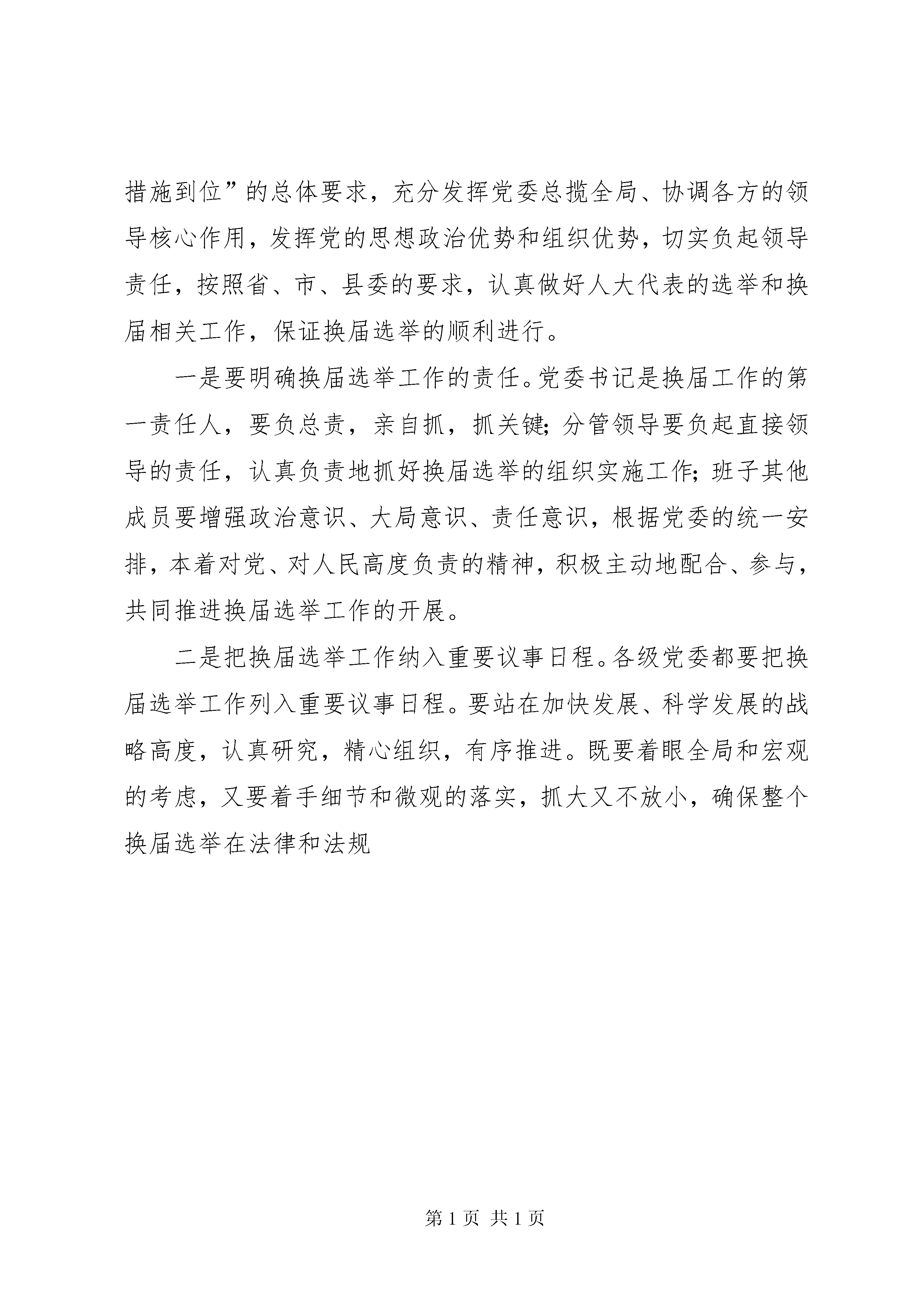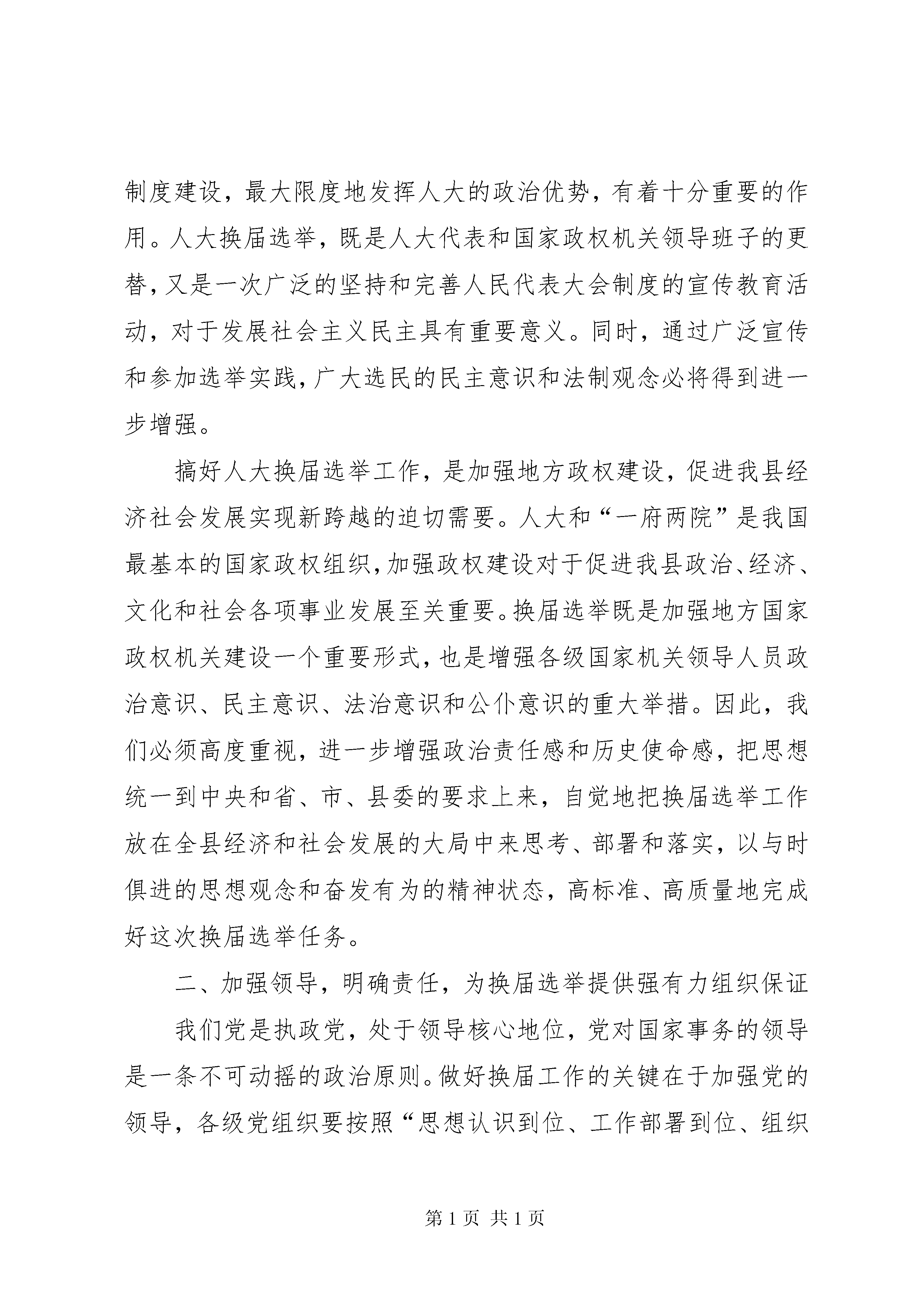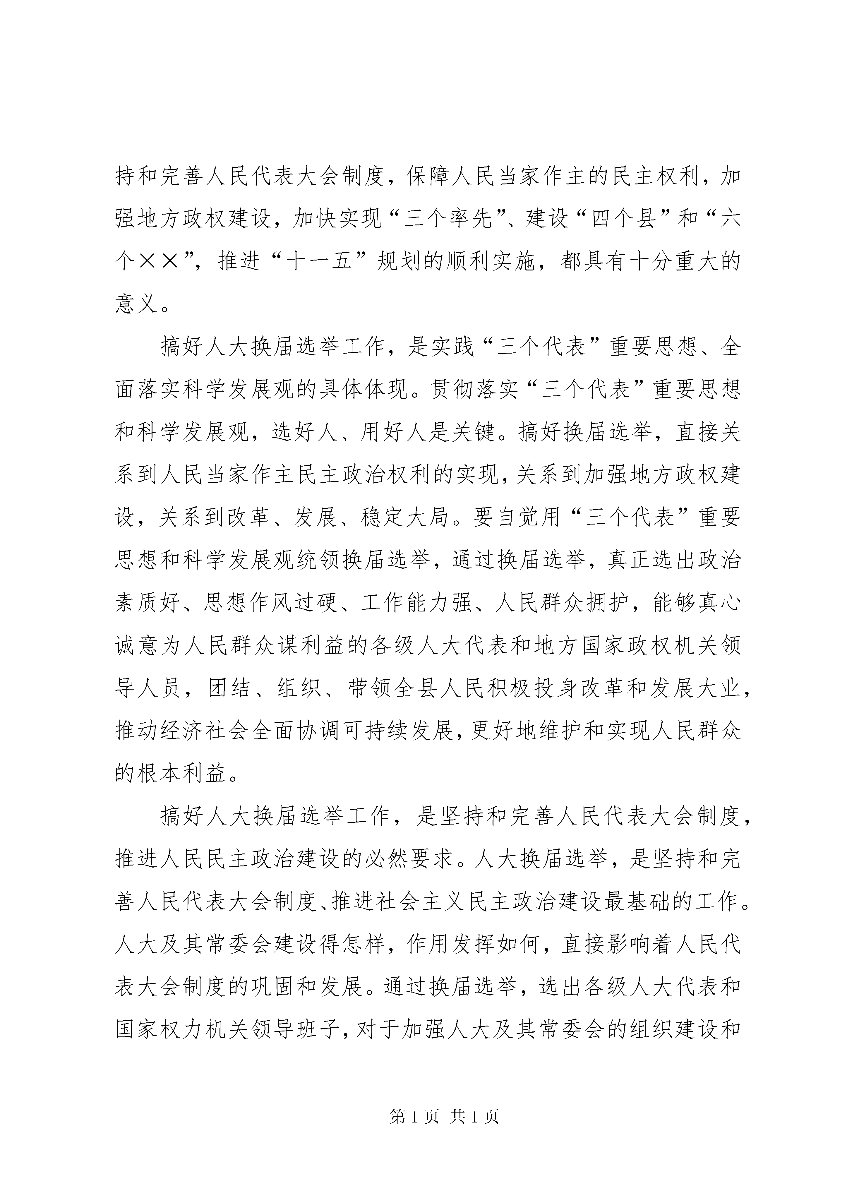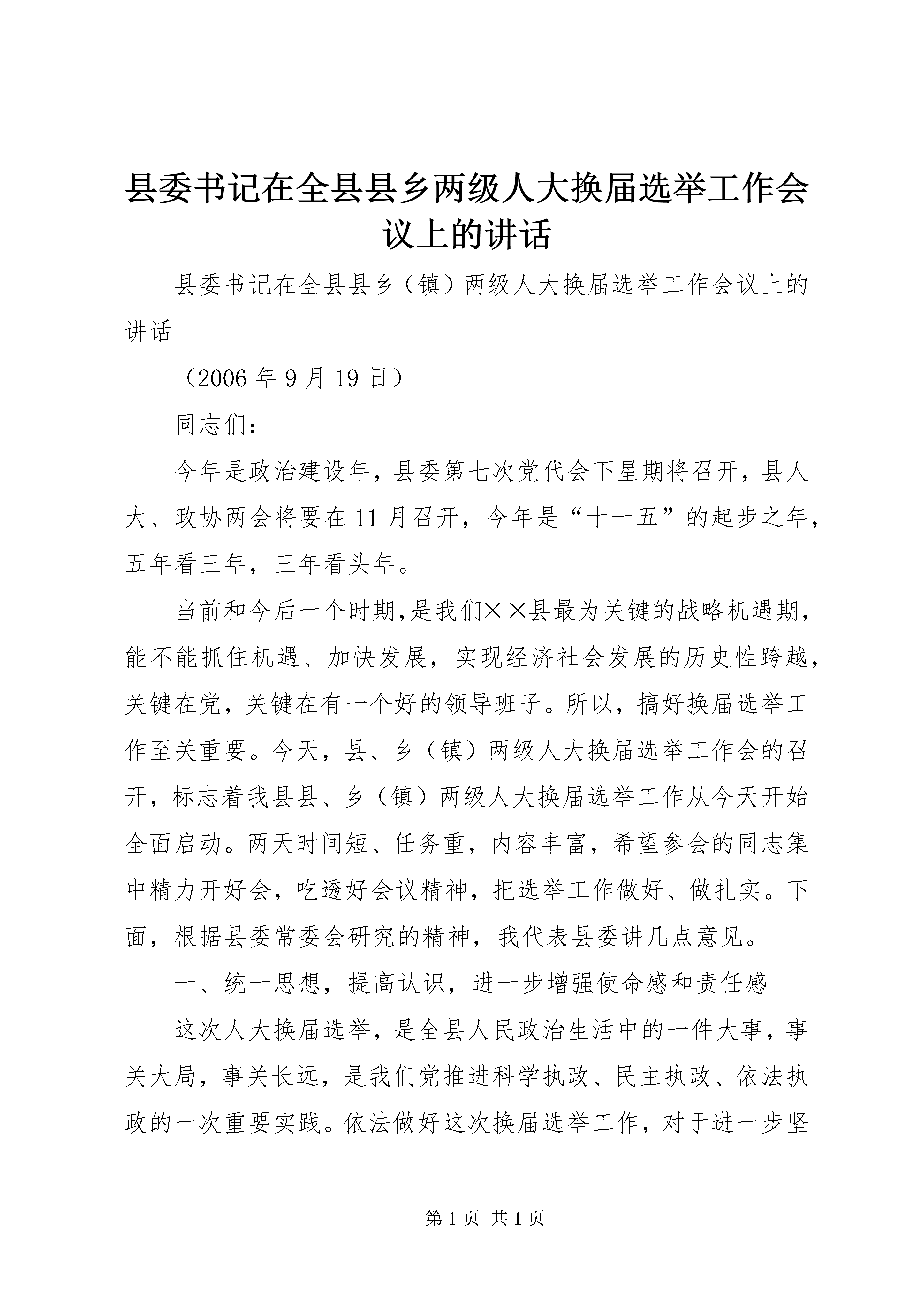 县委书记在全县县乡两级人大换届选举工作会议上的讲话县委书记在全县县乡(镇)两级人大换届选举工作会议上的讲话(2006年9月19日)同志们:今年是政治建设年,县委第七次党代会下星期将召开,县人大、政协两会将要在11月召开,今年是“十一五”的起步之年,五年看三年,三年看头年。当前和今后一个时期,是我们××县最为关键的战略机遇期,能不能抓住机遇、加快发展,实现经济社会发展的历史性跨越,关键在党,关键在有一个好的领导班子。所以,搞好换届选举工作至关重要。今天,县、乡(镇)两级人大换届选举工作会的召开,标志着我县县、乡(镇)两级人大换届选举工作从今天开始全面启动。两天时间短、任务重,内容丰富,希望参会的同志集中精力开好会,吃透好会议精神,把选举工作做好、做扎实。下面,根据县委常委会研究的精神,我代表县委讲几点意见。一、统一思想,提高认识,进一步增强使命感和责任感这次人大换届选举,是全县人民政治生活中的一件大事,事关大局,事关长远,是我们党推进科学执政、民主执政、依法执政的一次重要实践。依法做好这次换届选举工作,对于进一步坚持和完善人民代表大会制度,保障人民当家作主的民主权利,加强地方政权建设,加快实现“三个率先”、建设“四个县”和“六个××”,推进“十一五”规划的顺利实施,都具有十分重大的意义。搞好人大换届选举工作,是实践“三个代表”重要思想、全面落实科学发展观的具体体现。贯彻落实“三个代表”重要思想和科学发展观,选好人、用好人是关键。搞好换届选举,直接关系到人民当家作主民主政治权利的实现,关系到加强地方政权建设,关系到改革、发展、稳定大局。要自觉用“三个代表”重要思想和科学发展观统领换届选举,通过换届选举,真正选出政治素质好、思想作风过硬、工作能力强、人民群众拥护,能够真心诚意为人民群众谋利益的各级人大代表和地方国家政权机关领导人员,团结、组织、带领全县人民积极投身改革和发展大业,推动经济社会全面协调可持续发展,更好地维护和实现人民群众的根本利益。搞好人大换届选举工作,是坚持和完善人民代表大会制度,推进人民民主政治建设的必然要求。人大换届选举,是坚持和完善人民代表大会制度、推进社会主义民主政治建设最基础的工作。人大及其常委会建设得怎样,作用发挥如何,直接影响着人民代表大会制度的巩固和发展。通过换届选举,选出各级人大代表和国家权力机关领导班子,对于加强人大及其常委会的组织建设和制度建设,最大限度地发挥人大的政治优势,有着十分重要的作用。人大换届选举,既是人大代表和国家政权机关领导班子的更替,又是一次广泛的坚持和完善人民代表大会制度的宣传教育活动,对于发展社会主义民主具有重要意义。同时,通过广泛宣传和参加选举实践,广大选民的民主意识和法制观念必将得到进一步增强。搞好人大换届选举工作,是加强地方政权建设,促进我县经济社会发展实现新跨越的迫切需要。人大和“一府两院”是我国最基本的国家政权组织,加强政权建设对于促进我县政治、经济、文化和社会各项事业发展至关重要。换届选举既是加强地方国家政权机关建设一个重要形式,也是增强各级国家机关领导人员政治意识、民主意识、法治意识和公仆意识的重大举措。因此,我们必须高度重视,进一步增强政治责任感和历史使命感,把思想统一到中央和省、市、县委的要求上来,自觉地把换届选举工作放在全县经济和社会发展的大局中来思考、部署和落实,以与时俱进的思想观念和奋发有为的精神状态,高标准、高质量地完成好这次换届选举任务。二、加强领导,明确责任,为换届选举提供强有力组织保证我们党是执政党,处于领导核心地位,党对国家事务的领导是一条不可动摇的政治原则。做好换届工作的关键在于加强党的领导,各级党组织要按照“思想认识到位、工作部署到位、组织措施到位”的总体要求,充分发挥党委总揽全局、协调各方的领导核心作用,发挥党的思想政治优势和组织优势,切实负起领导责任,按照省、市、县委的要求,认真做好人大代表的选举和换届相关工作,保证换届选举的顺利进行。一是要明确换届选举工作的责任。党委书记是换届工作的第一责任人,要负总责,亲自抓,抓关键;分管领导要负起直接领导的责任,认真负责地抓好换届选举的组织实施工作;班子其他成员要增强政治意识、大局意识、责任意识,根据党委的统一安排,本着对党、对人民高度负责的精神,积极主动地配合、参与,共同推进换届选举工作的开展。二是把换届选举工作纳入重要议事日程。各级党委都要把换届选举工作列入重要议事日程。要站在加快发展、科学发展的战略高度,认真研究,精心组织,有序推进。既要着眼全局和宏观的考虑,又要着手细节和微观的落实,抓大又不放小,确保整个换届选举在法律和法规