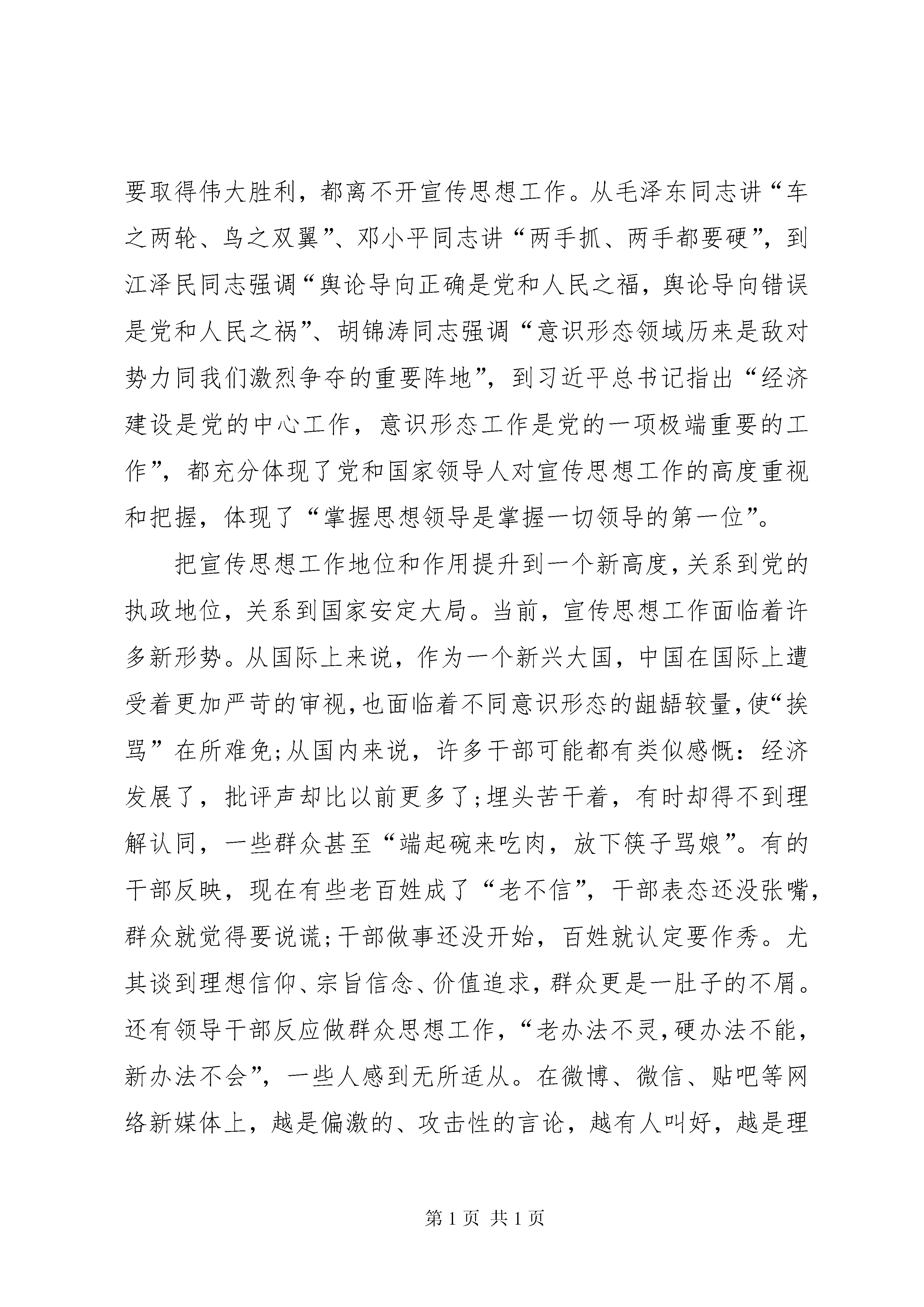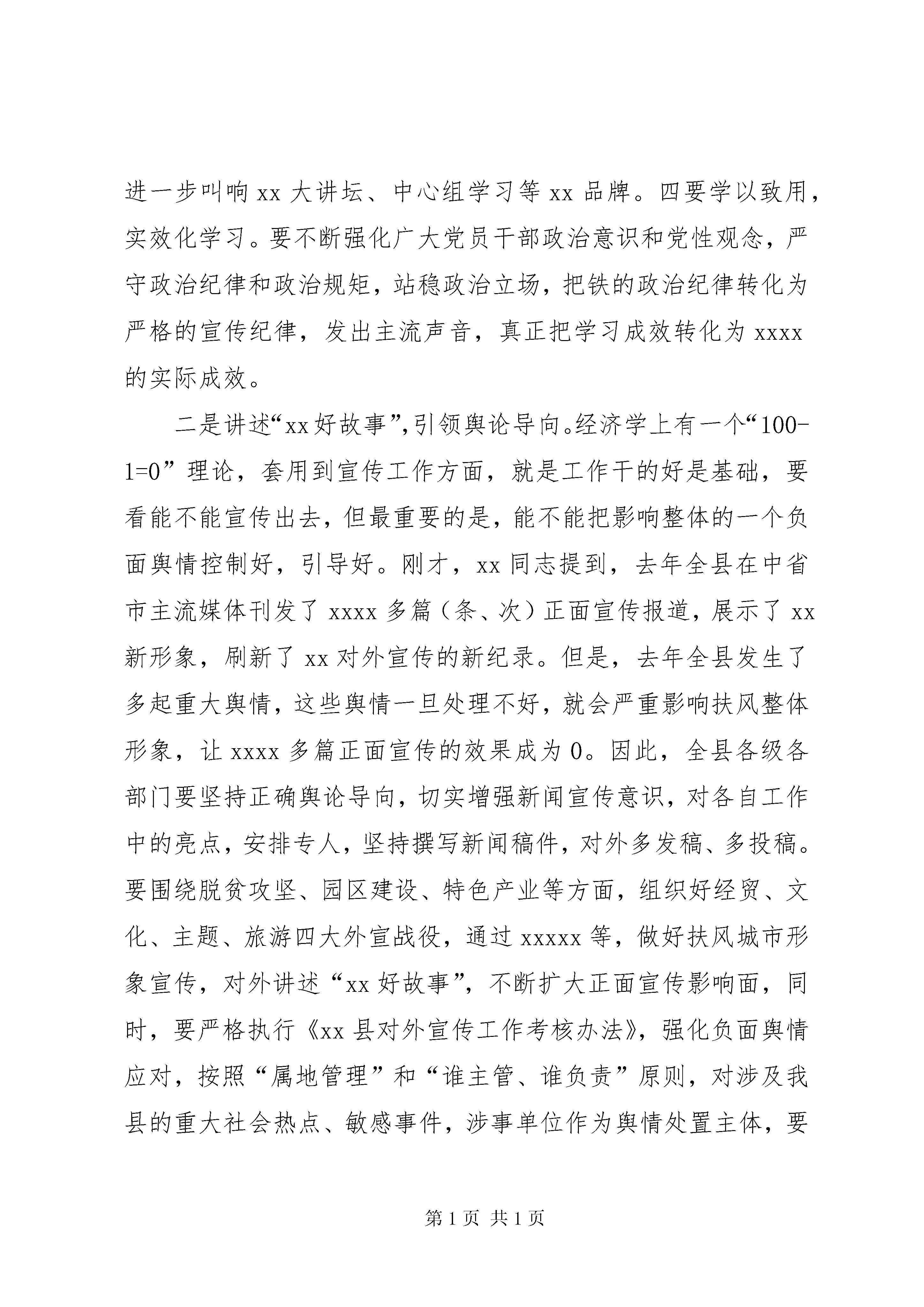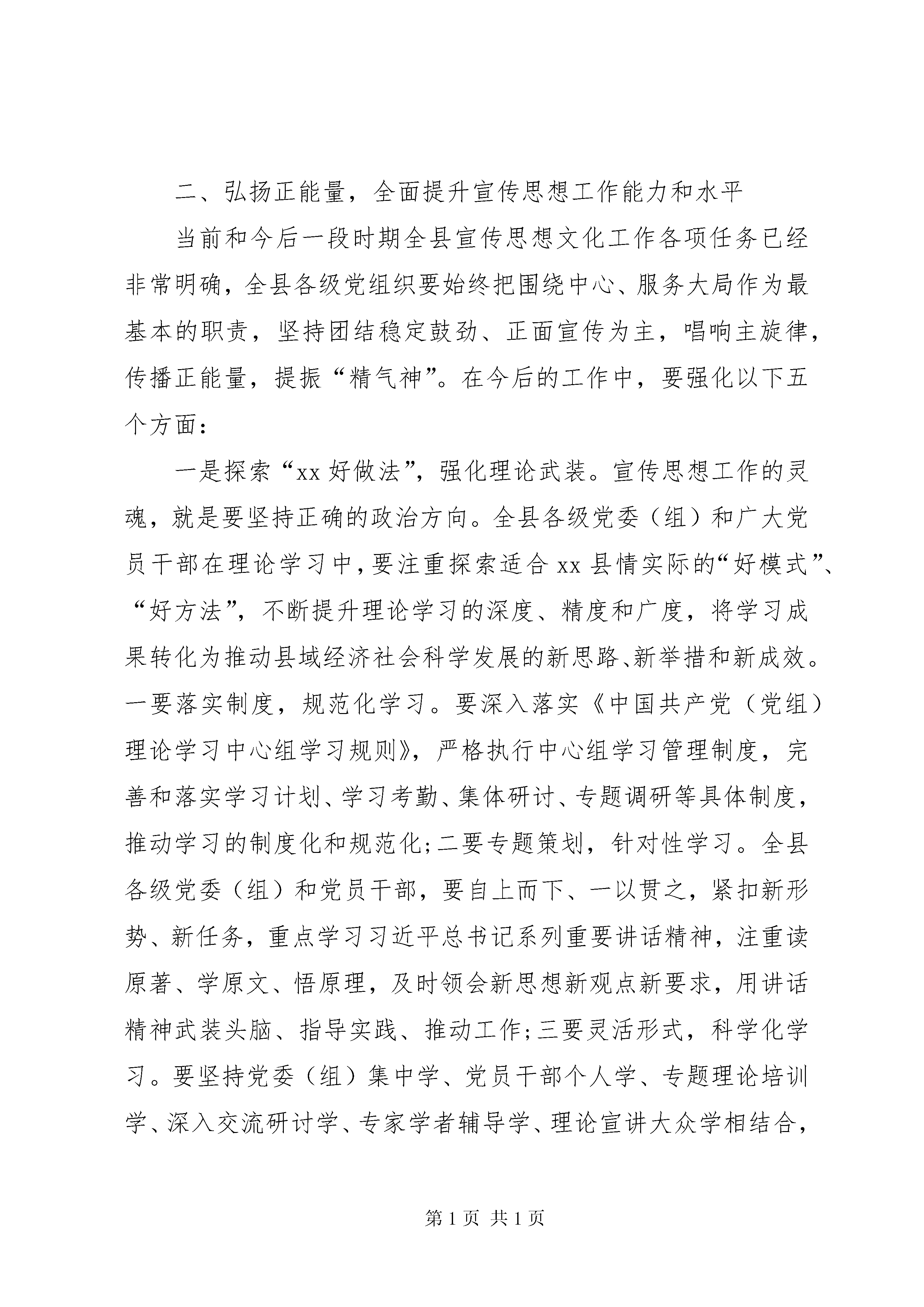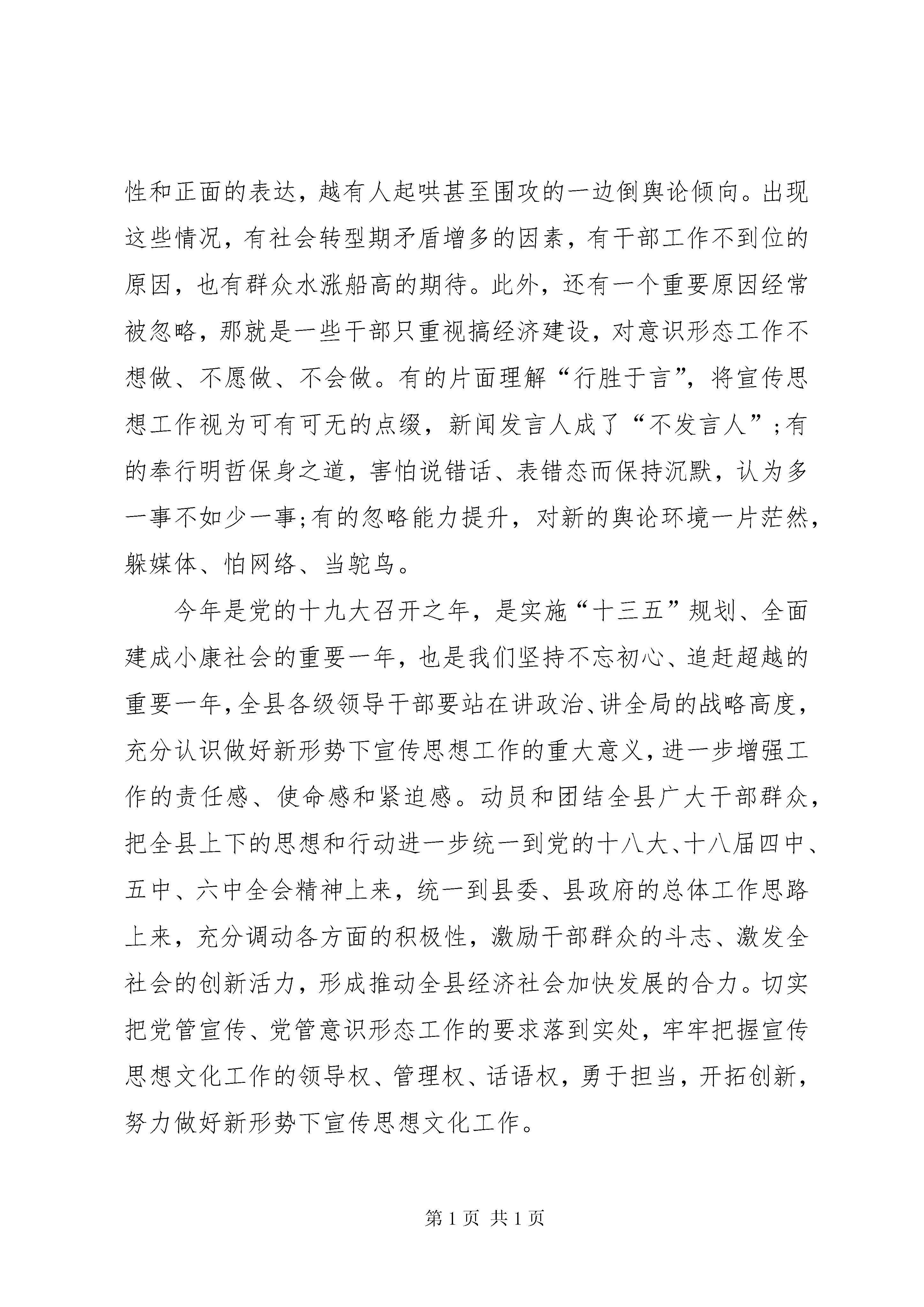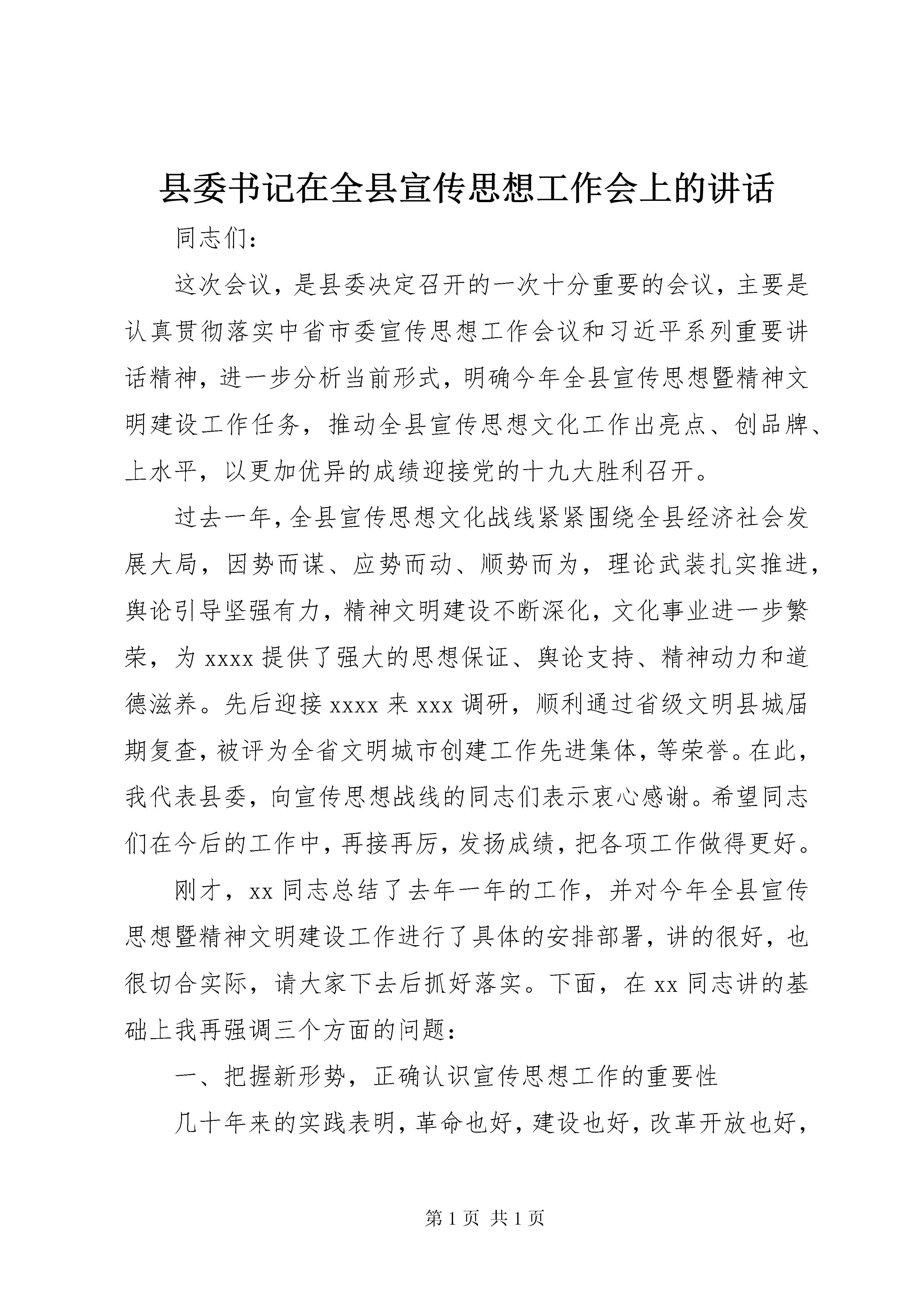 县委书记在全县宣传思想工作会上的讲话同志们:这次会议,是县委决定召开的一次十分重要的会议,主要是认真贯彻落实中省市委宣传思想工作会议和习近平系列重要讲话精神,进一步分析当前形式,明确今年全县宣传思想暨精神文明建设工作任务,推动全县宣传思想文化工作出亮点、创品牌、上水平,以更加优异的成绩迎接党的十九大胜利召开。过去一年,全县宣传思想文化战线紧紧围绕全县经济社会发展大局,因势而谋、应势而动、顺势而为,理论武装扎实推进,舆论引导坚强有力,精神文明建设不断深化,文化事业进一步繁荣,为xxxx提供了强大的思想保证、舆论支持、精神动力和道德滋养。先后迎接xxxx来xxx调研,顺利通过省级文明县城届期复查,被评为全省文明城市创建工作先进集体,等荣誉。在此,我代表县委,向宣传思想战线的同志们表示衷心感谢。希望同志们在今后的工作中,再接再厉,发扬成绩,把各项工作做得更好。刚才,xx同志总结了去年一年的工作,并对今年全县宣传思想暨精神文明建设工作进行了具体的安排部署,讲的很好,也很切合实际,请大家下去后抓好落实。下面,在xx同志讲的基础上我再强调三个方面的问题:一、把握新形势,正确认识宣传思想工作的重要性几十年来的实践表明,革命也好,建设也好,改革开放也好,要取得伟大胜利,都离不开宣传思想工作。从毛泽东同志讲“车之两轮、鸟之双翼”、邓小平同志讲“两手抓、两手都要硬”,到江泽民同志强调“舆论导向正确是党和人民之福,舆论导向错误是党和人民之祸”、胡锦涛同志强调“意识形态领域历来是敌对势力同我们激烈争夺的重要阵地”,到习近平总书记指出“经济建设是党的中心工作,意识形态工作是党的一项极端重要的工作”,都充分体现了党和国家领导人对宣传思想工作的高度重视和把握,体现了“掌握思想领导是掌握一切领导的第一位”。把宣传思想工作地位和作用提升到一个新高度,关系到党的执政地位,关系到国家安定大局。当前,宣传思想工作面临着许多新形势。从国际上来说,作为一个新兴大国,中国在国际上遭受着更加严苛的审视,也面临着不同意识形态的龃龉较量,使“挨骂”在所难免;从国内来说,许多干部可能都有类似感慨:经济发展了,批评声却比以前更多了;埋头苦干着,有时却得不到理解认同,一些群众甚至“端起碗来吃肉,放下筷子骂娘”。有的干部反映,现在有些老百姓成了“老不信”,干部表态还没张嘴,群众就觉得要说谎;干部做事还没开始,百姓就认定要作秀。尤其谈到理想信仰、宗旨信念、价值追求,群众更是一肚子的不屑。还有领导干部反应做群众思想工作,“老办法不灵,硬办法不能,新办法不会”,一些人感到无所适从。在微博、微信、贴吧等网络新媒体上,越是偏激的、攻击性的言论,越有人叫好,越是理性和正面的表达,越有人起哄甚至围攻的一边倒舆论倾向。出现这些情况,有社会转型期矛盾增多的因素,有干部工作不到位的原因,也有群众水涨船高的期待。此外,还有一个重要原因经常被忽略,那就是一些干部只重视搞经济建设,对意识形态工作不想做、不愿做、不会做。有的片面理解“行胜于言”,将宣传思想工作视为可有可无的点缀,新闻发言人成了“不发言人”;有的奉行明哲保身之道,害怕说错话、表错态而保持沉默,认为多一事不如少一事;有的忽略能力提升,对新的舆论环境一片茫然,躲媒体、怕网络、当鸵鸟。今年是党的十九大召开之年,是实施“十三五”规划、全面建成小康社会的重要一年,也是我们坚持不忘初心、追赶超越的重要一年,全县各级领导干部要站在讲政治、讲全局的战略高度,充分认识做好新形势下宣传思想工作的重大意义,进一步增强工作的责任感、使命感和紧迫感。动员和团结全县广大干部群众,把全县上下的思想和行动进一步统一到党的十八大、十八届四中、五中、六中全会精神上来,统一到县委、县政府的总体工作思路上来,充分调动各方面的积极性,激励干部群众的斗志、激发全社会的创新活力,形成推动全县经济社会加快发展的合力。切实把党管宣传、党管意识形态工作的要求落到实处,牢牢把握宣传思想文化工作的领导权、管理权、话语权,勇于担当,开拓创新,努力做好新形势下宣传思想文化工作。二、弘扬正能量,全面提升宣传思想工作能力和水平当前和今后一段时期全县宣传思想文化工作各项任务已经非常明确,全县各级党组织要始终把围绕中心、服务大局作为最基本的职责,坚持团结稳定鼓劲、正面宣传为主,唱响主旋律,传播正能量,提振“精气神”。在今后的工作中,要强化以下五个方面:一是探索“xx好做法”,强化理论武装。宣传思想工作的灵魂,就是要坚持正确的政治方向。全县各级党委(组)和广大党员干部在理论学习中,要注重探索适合xx县情实际的“好模式”、“好方法”,不断提升理论学习的深度、精度和广度,将学习成果转化为推动县域经济社会科学发展的新思路、新举措和新成效。一要落实制度,规范化学习。要深入落实《中国共产党(党组)理论