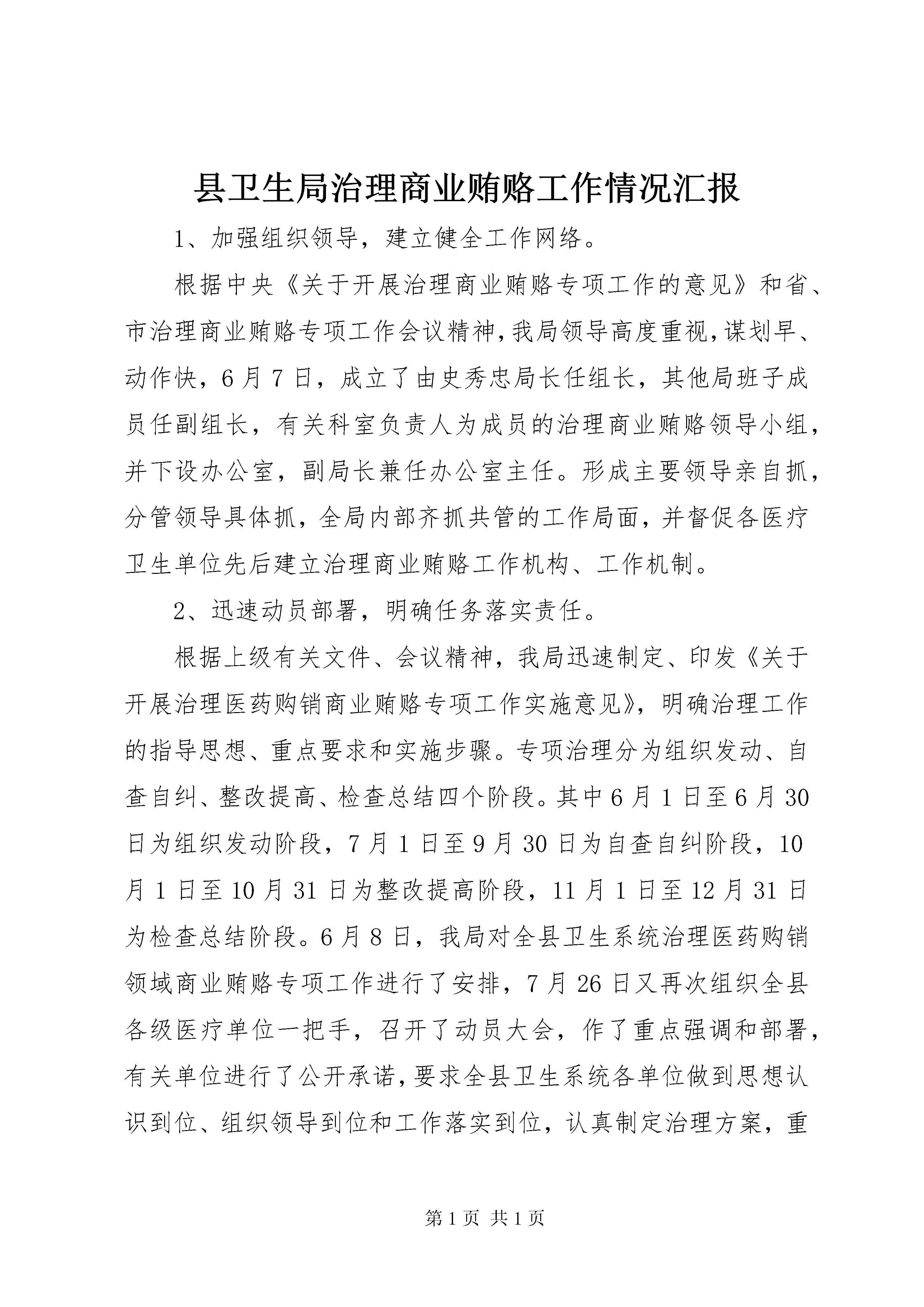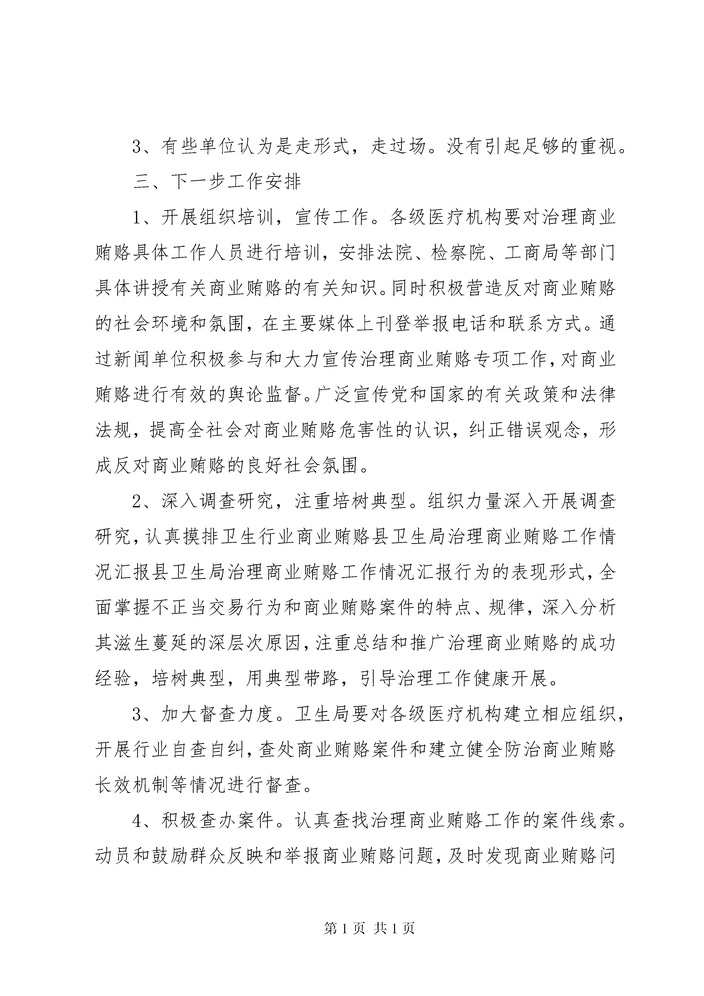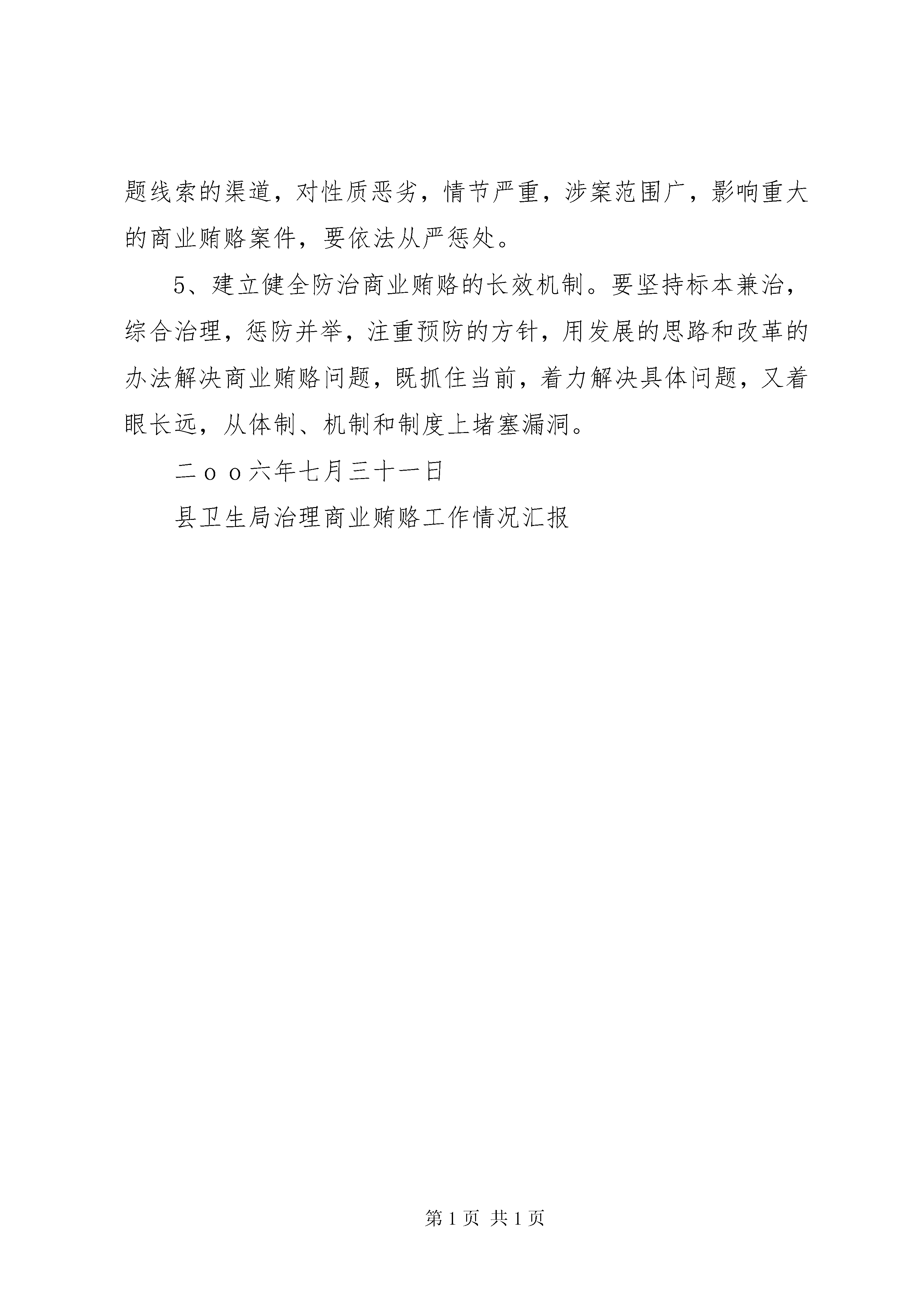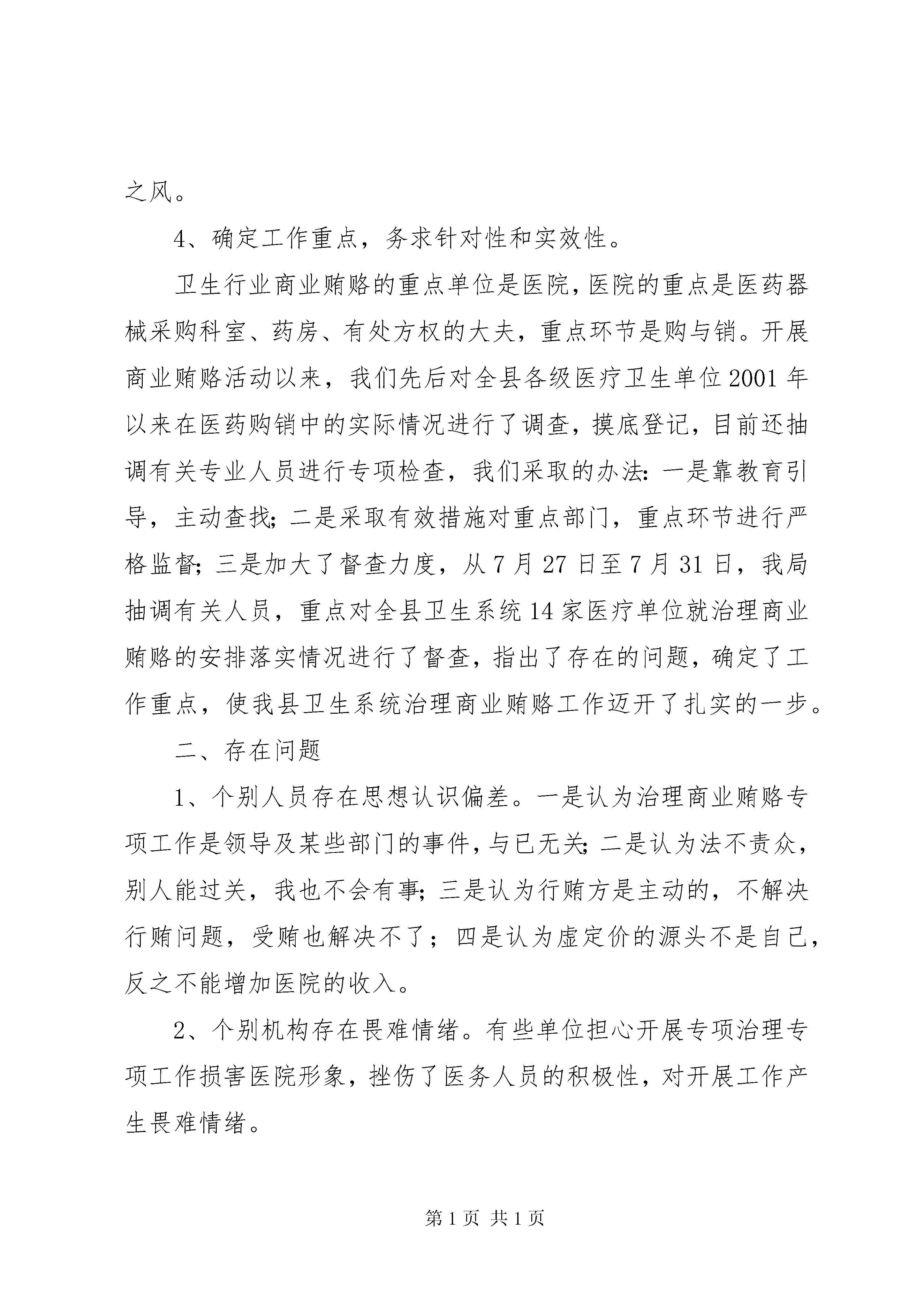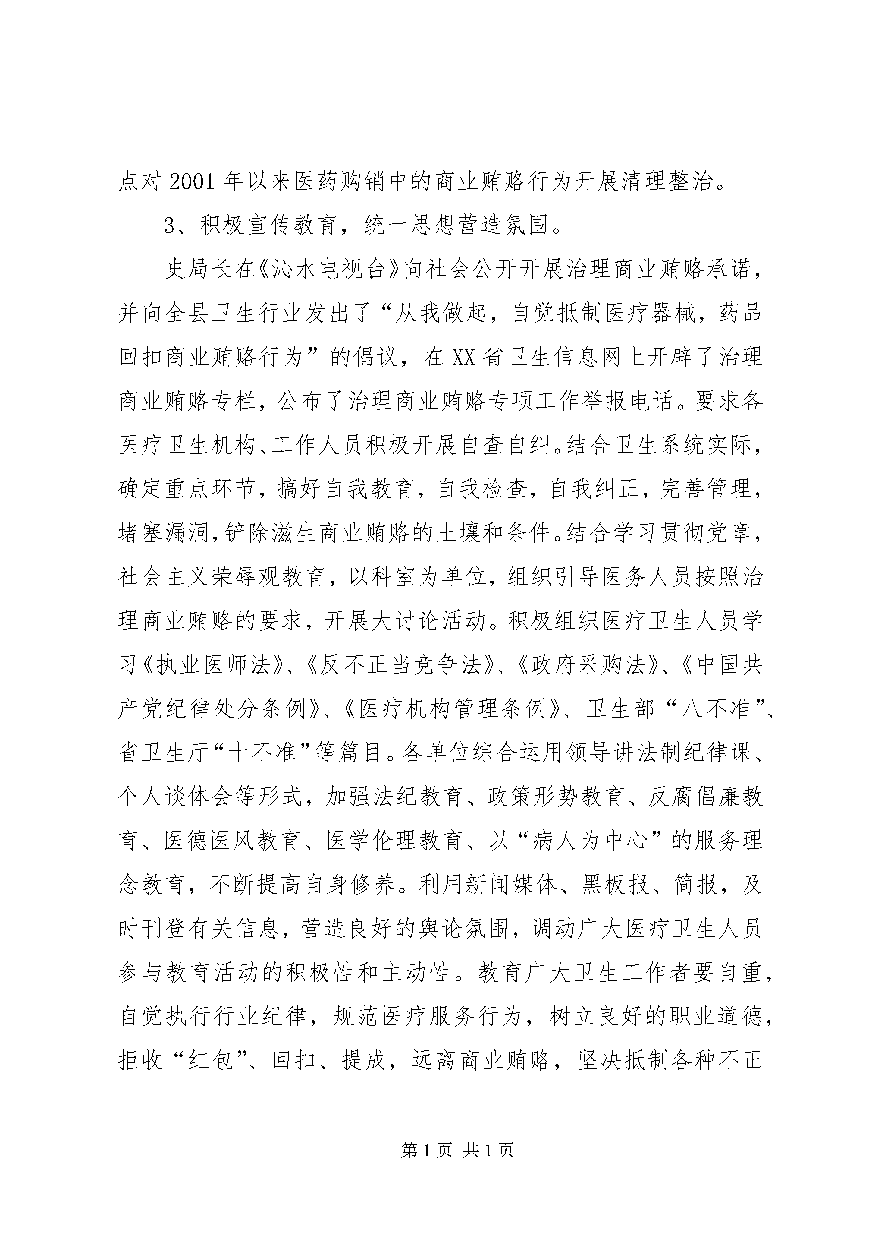 县卫生局治理商业贿赂工作情况汇报1、加强组织领导,建立健全工作网络。根据中央《关于开展治理商业贿赂专项工作的意见》和省、市治理商业贿赂专项工作会议精神,我局领导高度重视,谋划早、动作快,6月7日,成立了由史秀忠局长任组长,其他局班子成员任副组长,有关科室负责人为成员的治理商业贿赂领导小组,并下设办公室,副局长兼任办公室主任。形成主要领导亲自抓,分管领导具体抓,全局内部齐抓共管的工作局面,并督促各医疗卫生单位先后建立治理商业贿赂工作机构、工作机制。2、迅速动员部署,明确任务落实责任。根据上级有关文件、会议精神,我局迅速制定、印发《关于开展治理医药购销商业贿赂专项工作实施意见》,明确治理工作的指导思想、重点要求和实施步骤。专项治理分为组织发动、自查自纠、整改提高、检查总结四个阶段。其中6月1日至6月30日为组织发动阶段,7月1日至9月30日为自查自纠阶段,10月1日至10月31日为整改提高阶段,11月1日至12月31日为检查总结阶段。6月8日,我局对全县卫生系统治理医药购销领域商业贿赂专项工作进行了安排,7月26日又再次组织全县各级医疗单位一把手,召开了动员大会,作了重点强调和部署,有关单位进行了公开承诺,要求全县卫生系统各单位做到思想认识到位、组织领导到位和工作落实到位,认真制定治理方案,重点对2001年以来医药购销中的商业贿赂行为开展清理整治。3、积极宣传教育,统一思想营造氛围。史局长在《沁水电视台》向社会公开开展治理商业贿赂承诺,并向全县卫生行业发出了“从我做起,自觉抵制医疗器械,药品回扣商业贿赂行为”的倡议,在XX省卫生信息网上开辟了治理商业贿赂专栏,公布了治理商业贿赂专项工作举报电话。要求各医疗卫生机构、工作人员积极开展自查自纠。结合卫生系统实际,确定重点环节,搞好自我教育,自我检查,自我纠正,完善管理,堵塞漏洞,铲除滋生商业贿赂的土壤和条件。结合学习贯彻党章,社会主义荣辱观教育,以科室为单位,组织引导医务人员按照治理商业贿赂的要求,开展大讨论活动。积极组织医疗卫生人员学习《执业医师法》、《反不正当竞争法》、《政府采购法》、《中国共产党纪律处分条例》、《医疗机构管理条例》、卫生部“八不准”、省卫生厅“十不准”等篇目。各单位综合运用领导讲法制纪律课、个人谈体会等形式,加强法纪教育、政策形势教育、反腐倡廉教育、医德医风教育、医学伦理教育、以“病人为中心”的服务理念教育,不断提高自身修养。利用新闻媒体、黑板报、简报,及时刊登有关信息,营造良好的舆论氛围,调动广大医疗卫生人员参与教育活动的积极性和主动性。教育广大卫生工作者要自重,自觉执行行业纪律,规范医疗服务行为,树立良好的职业道德,拒收“红包”、回扣、提成,远离商业贿赂,坚决抵制各种不正之风。4、确定工作重点,务求针对性和实效性。卫生行业商业贿赂的重点单位是医院,医院的重点是医药器械采购科室、药房、有处方权的大夫,重点环节是购与销。开展商业贿赂活动以来,我们先后对全县各级医疗卫生单位2001年以来在医药购销中的实际情况进行了调查,摸底登记,目前还抽调有关专业人员进行专项检查,我们采取的办法:一是靠教育引导,主动查找;二是采取有效措施对重点部门,重点环节进行严格监督;三是加大了督查力度,从7月27日至7月31日,我局抽调有关人员,重点对全县卫生系统14家医疗单位就治理商业贿赂的安排落实情况进行了督查,指出了存在的问题,确定了工作重点,使我县卫生系统治理商业贿赂工作迈开了扎实的一步。二、存在问题1、个别人员存在思想认识偏差。一是认为治理商业贿赂专项工作是领导及某些部门的事件,与已无关;二是认为法不责众,别人能过关,我也不会有事;三是认为行贿方是主动的,不解决行贿问题,受贿也解决不了;四是认为虚定价的源头不是自己,反之不能增加医院的收入。2、个别机构存在畏难情绪。有些单位担心开展专项治理专项工作损害医院形象,挫伤了医务人员的积极性,对开展工作产生畏难情绪。3、有些单位认为是走形式,走过场。没有引起足够的重视。三、下一步工作安排1、开展组织培训,宣传工作。各级医疗机构要对治理商业贿赂具体工作人员进行培训,安排法院、检察院、工商局等部门具体讲授有关商业贿赂的有关知识。同时积极营造反对商业贿赂的社会环境和氛围,在主要媒体上刊登举报电话和联系方式。通过新闻单位积极参与和大力宣传治理商业贿赂专项工作,对商业贿赂进行有效的舆论监督。广泛宣传党和国家的有关政策和法律法规,提高全社会对商业贿赂危害性的认识,纠正错误观念,形成反对商业贿赂的良好社会氛围。2、深入调查研究,注重培树典型。组织力量深入开展调查研究,认真摸排卫生行业商业贿赂县卫生局治理商业贿赂工作情况汇报县卫生局治理商业贿赂工作情况汇报行为的表现形式,全面掌握不正当交易行为和商业贿赂案件的特点、规律,深入分析其滋