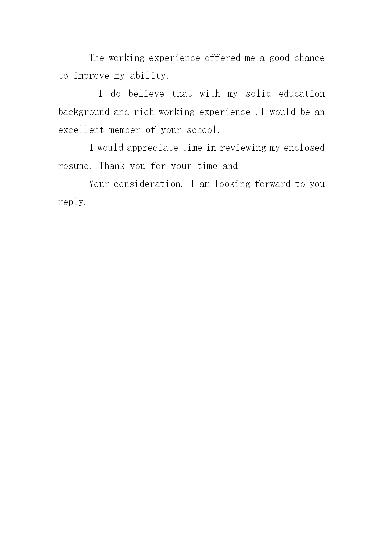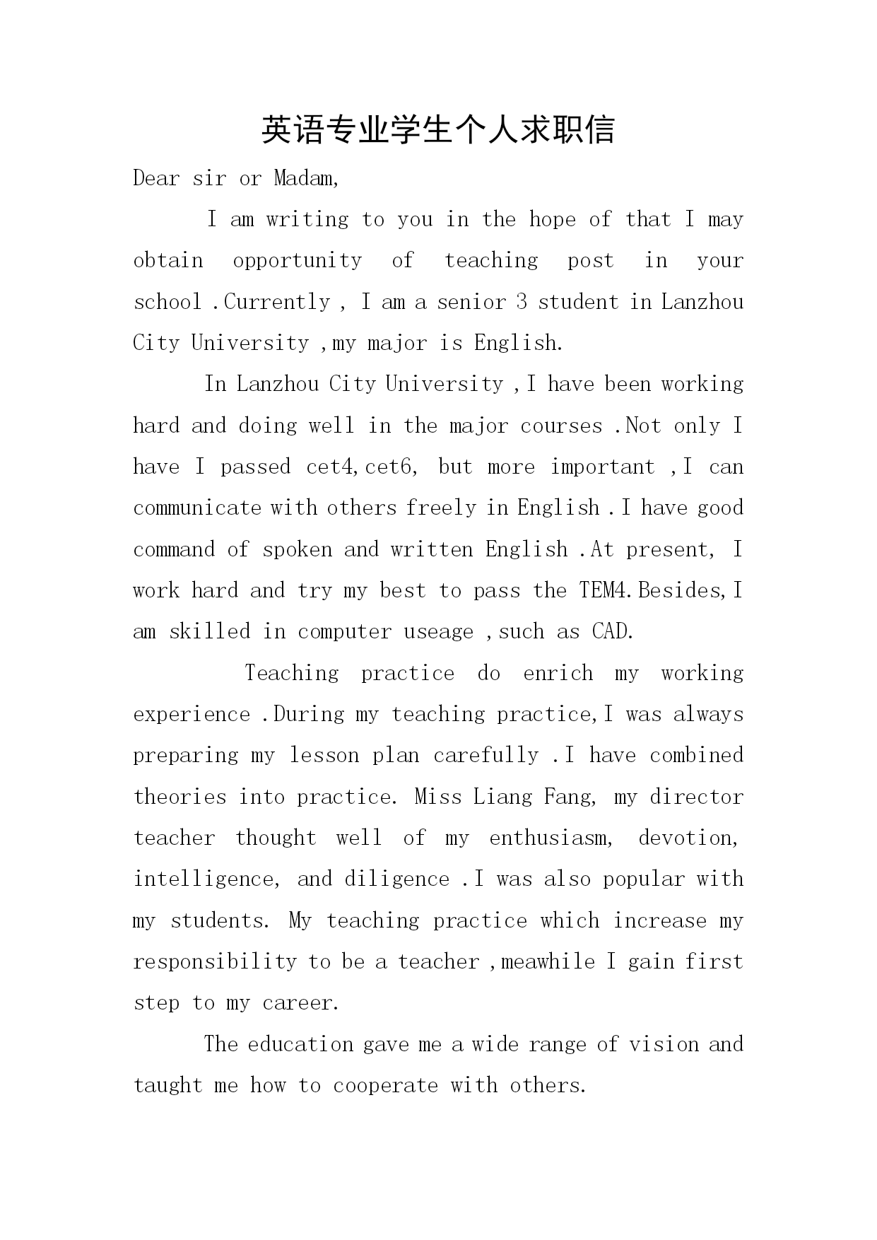 英语专业学生个人求职信 DearsirorMadam, IamwritingtoyouinthehopeofthatImayobtainopportunityofteachingpostinyourschool.Currently,Iamasenior3studentinLanzhouCityUniversity,mymajorisEnglish. InLanzhouCityUniversity,Ihavebeenworkinghardanddoingwellinthemajorcourses.NotonlyIhaveIpassedcet4,cet6,butmoreimportant,IcancommunicatewithothersfreelyinEnglish.IhavegoodcommandofspokenandwrittenEnglish.Atpresent,IworkhardandtrymybesttopasstheTEM4.Besides,Iamskilledincomputeruseage,suchasCAD. Teachingpracticedoenrichmyworkingexperience.Duringmyteachingpractice,Iwasalwayspreparingmylessonplancarefully.Ihavecombinedtheoriesintopractice.MissLiangFang,mydirectorteacherthoughtwellofmyenthusiasm,devotion,intelligence,anddiligence.Iwasalsopopularwithmystudents.Myteachingpracticewhichincreasemyresponsibilitytobeateacher,meawhileIgainfirststeptomycareer. Theeducationgavemeawiderangeofvisionandtaughtmehowtocooperatewithothers. Theworkingexperienceofferedmeagoodchancetoimprovemyability. Idobelievethatwithmysolideducationbackgroundandrichworkingexperience,Iwouldbeanexcellentmemberofyourschool. Iwouldappreciatetimeinreviewingmyenclosedresume.Thankyouforyourtimeand Yourconsideration.Iamlookingforwardtoyoureply.