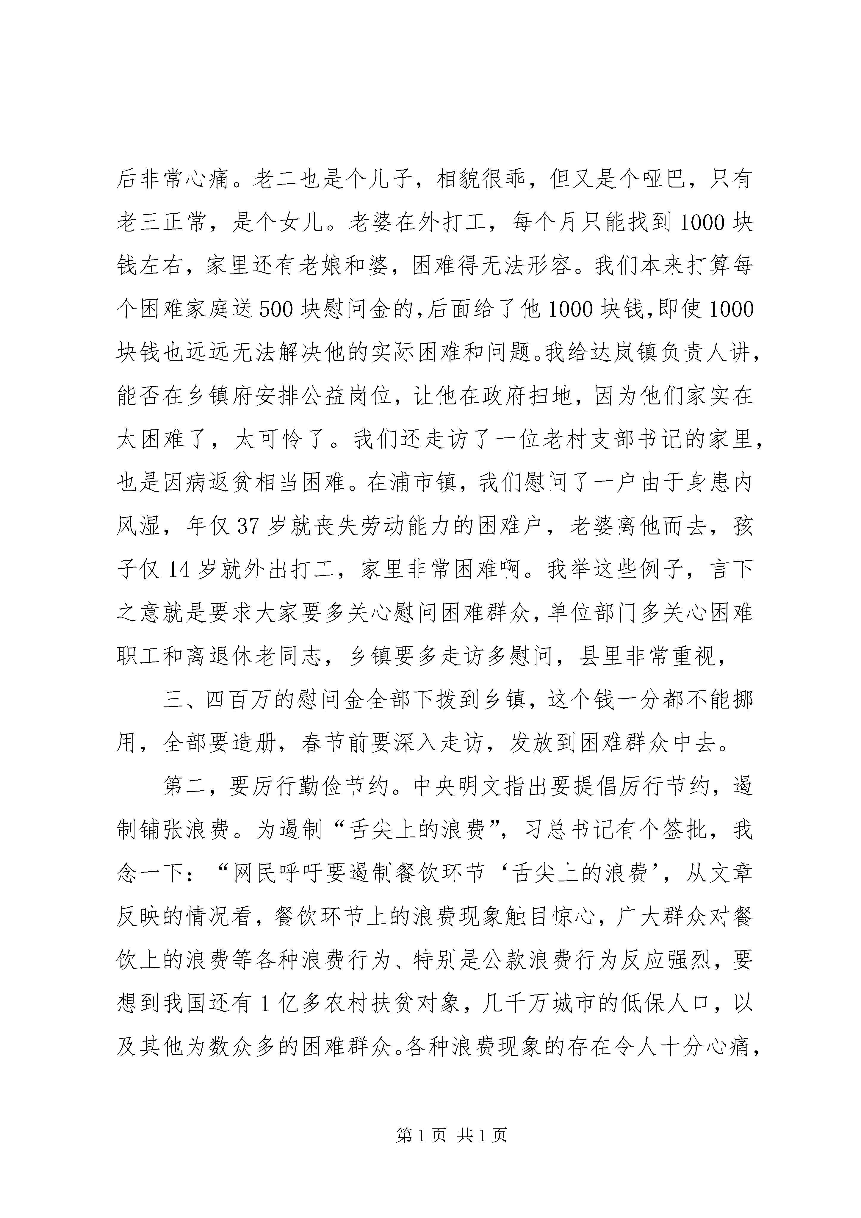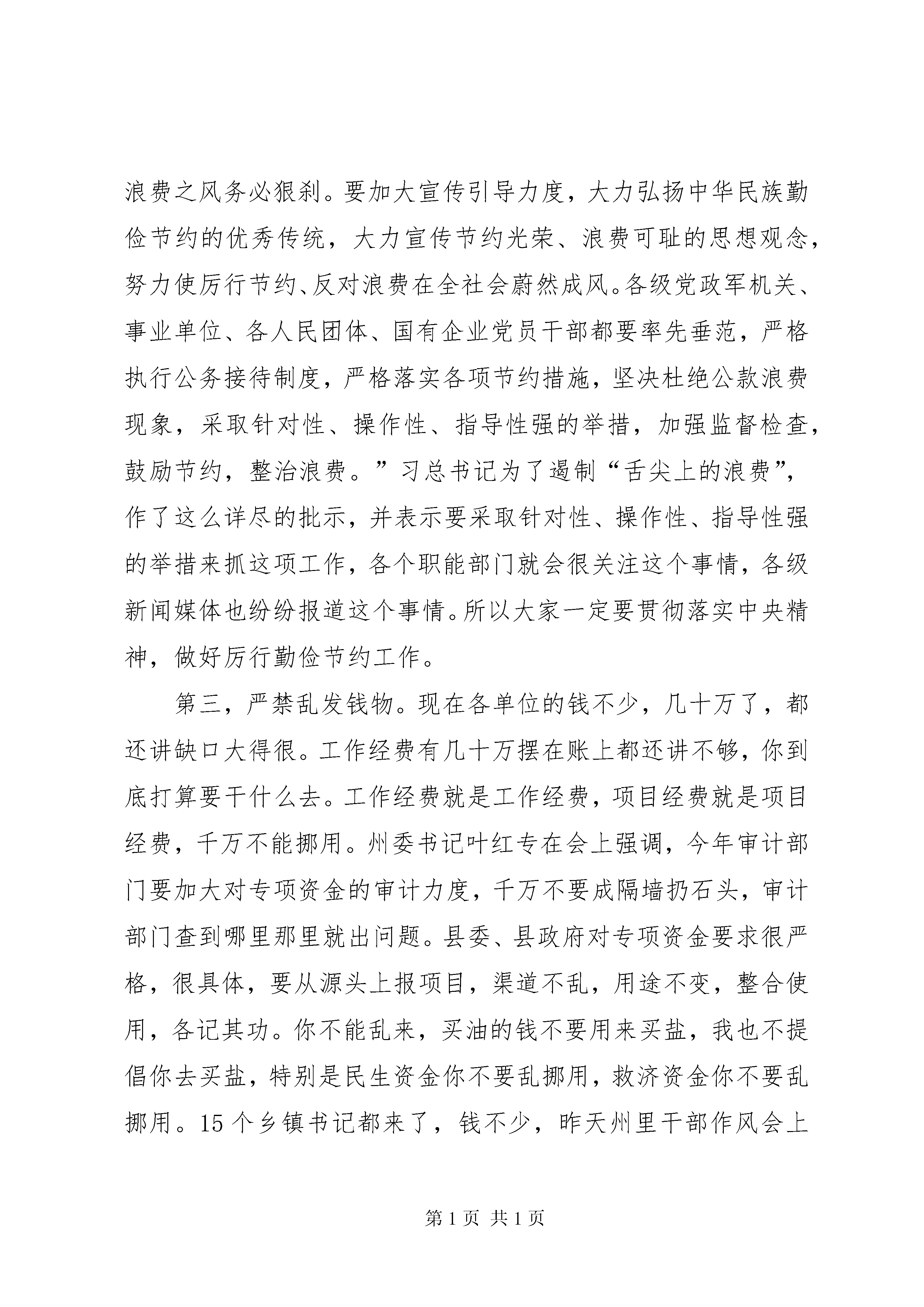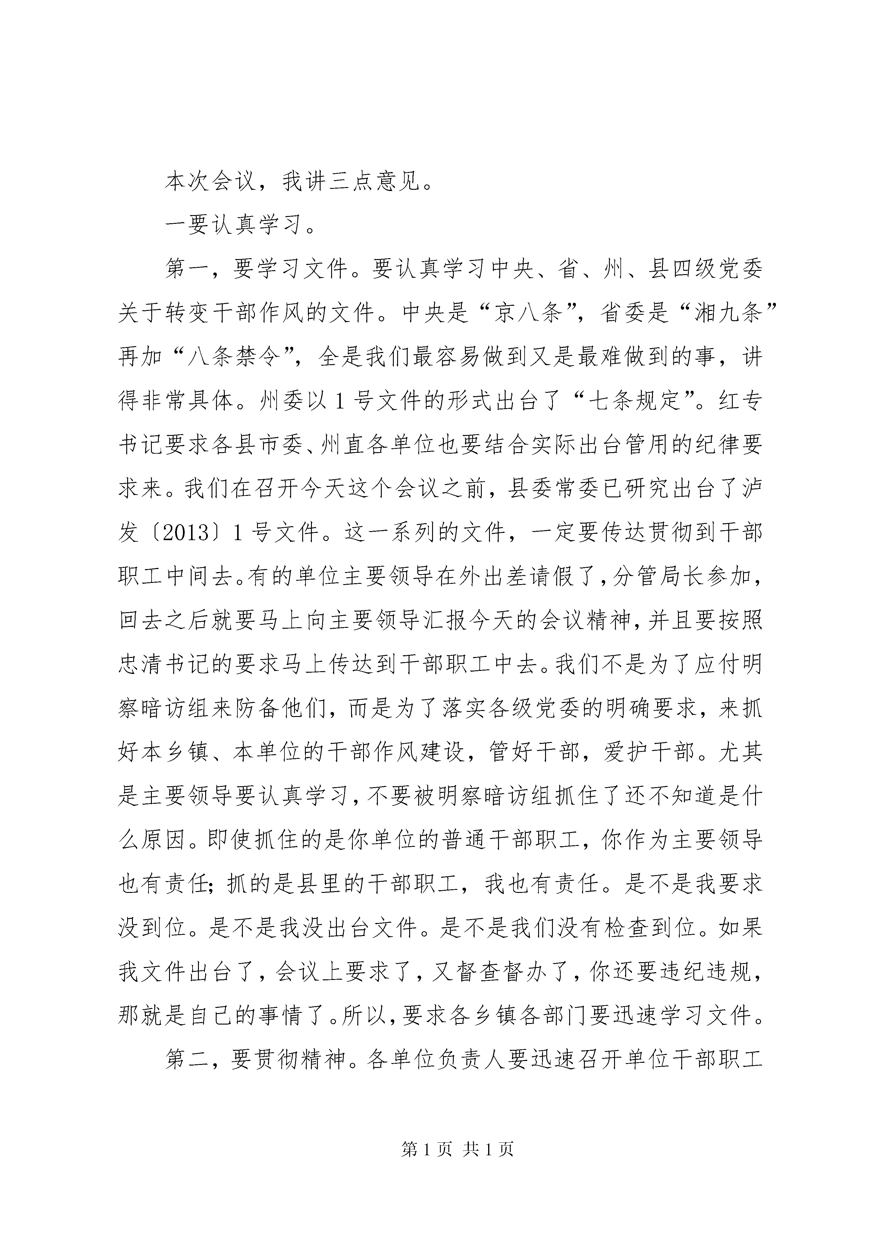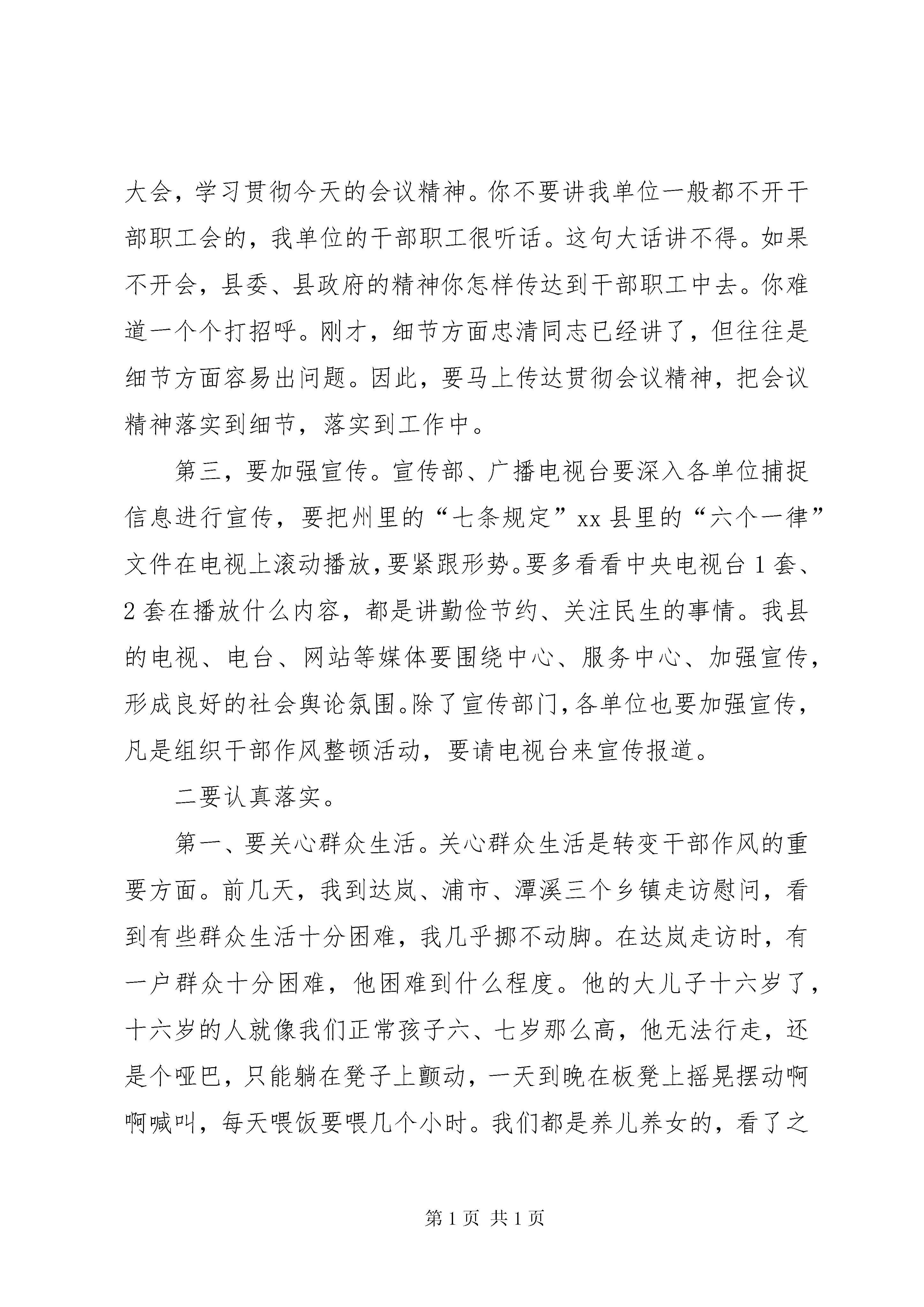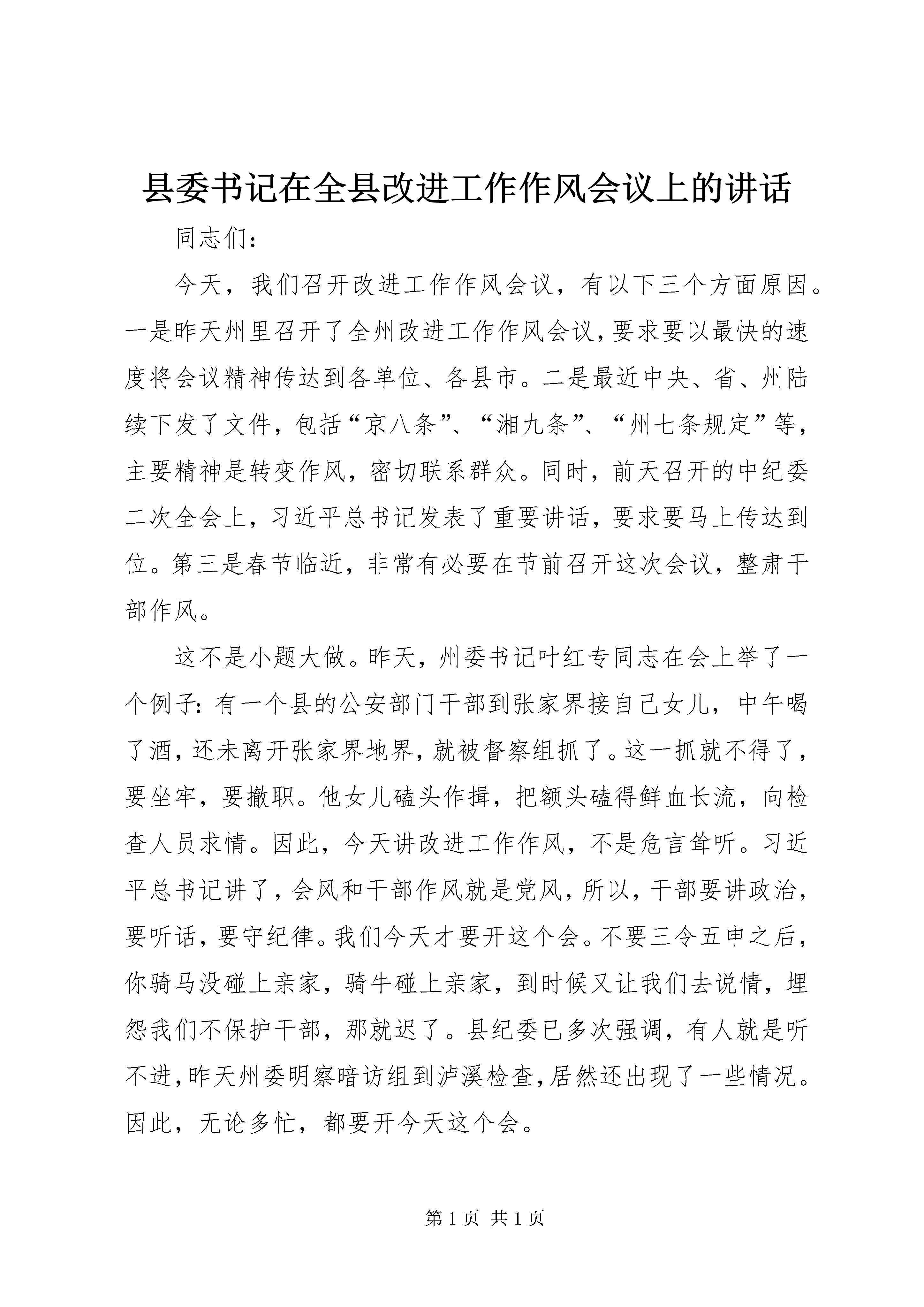 县委书记在全县改进工作作风会议上的讲话同志们:今天,我们召开改进工作作风会议,有以下三个方面原因。一是昨天州里召开了全州改进工作作风会议,要求要以最快的速度将会议精神传达到各单位、各县市。二是最近中央、省、州陆续下发了文件,包括“京八条”、“湘九条”、“州七条规定”等,主要精神是转变作风,密切联系群众。同时,前天召开的中纪委二次全会上,习近平总书记发表了重要讲话,要求要马上传达到位。第三是春节临近,非常有必要在节前召开这次会议,整肃干部作风。这不是小题大做。昨天,州委书记叶红专同志在会上举了一个例子:有一个县的公安部门干部到张家界接自己女儿,中午喝了酒,还未离开张家界地界,就被督察组抓了。这一抓就不得了,要坐牢,要撤职。他女儿磕头作揖,把额头磕得鲜血长流,向检查人员求情。因此,今天讲改进工作作风,不是危言耸听。习近平总书记讲了,会风和干部作风就是党风,所以,干部要讲政治,要听话,要守纪律。我们今天才要开这个会。不要三令五申之后,你骑马没碰上亲家,骑牛碰上亲家,到时候又让我们去说情,埋怨我们不保护干部,那就迟了。县纪委已多次强调,有人就是听不进,昨天州委明察暗访组到泸溪检查,居然还出现了一些情况。因此,无论多忙,都要开今天这个会。本次会议,我讲三点意见。一要认真学习。第一,要学习文件。要认真学习中央、省、州、县四级党委关于转变干部作风的文件。中央是“京八条”,省委是“湘九条”再加“八条禁令”,全是我们最容易做到又是最难做到的事,讲得非常具体。州委以1号文件的形式出台了“七条规定”。红专书记要求各县市委、州直各单位也要结合实际出台管用的纪律要求来。我们在召开今天这个会议之前,县委常委已研究出台了泸发〔2013〕1号文件。这一系列的文件,一定要传达贯彻到干部职工中间去。有的单位主要领导在外出差请假了,分管局长参加,回去之后就要马上向主要领导汇报今天的会议精神,并且要按照忠清书记的要求马上传达到干部职工中去。我们不是为了应付明察暗访组来防备他们,而是为了落实各级党委的明确要求,来抓好本乡镇、本单位的干部作风建设,管好干部,爱护干部。尤其是主要领导要认真学习,不要被明察暗访组抓住了还不知道是什么原因。即使抓住的是你单位的普通干部职工,你作为主要领导也有责任;抓的是县里的干部职工,我也有责任。是不是我要求没到位。是不是我没出台文件。是不是我们没有检查到位。如果我文件出台了,会议上要求了,又督查督办了,你还要违纪违规,那就是自己的事情了。所以,要求各乡镇各部门要迅速学习文件。第二,要贯彻精神。各单位负责人要迅速召开单位干部职工大会,学习贯彻今天的会议精神。你不要讲我单位一般都不开干部职工会的,我单位的干部职工很听话。这句大话讲不得。如果不开会,县委、县政府的精神你怎样传达到干部职工中去。你难道一个个打招呼。刚才,细节方面忠清同志已经讲了,但往往是细节方面容易出问题。因此,要马上传达贯彻会议精神,把会议精神落实到细节,落实到工作中。第三,要加强宣传。宣传部、广播电视台要深入各单位捕捉信息进行宣传,要把州里的“七条规定”xx县里的“六个一律”文件在电视上滚动播放,要紧跟形势。要多看看中央电视台1套、2套在播放什么内容,都是讲勤俭节约、关注民生的事情。我县的电视、电台、网站等媒体要围绕中心、服务中心、加强宣传,形成良好的社会舆论氛围。除了宣传部门,各单位也要加强宣传,凡是组织干部作风整顿活动,要请电视台来宣传报道。二要认真落实。第一、要关心群众生活。关心群众生活是转变干部作风的重要方面。前几天,我到达岚、浦市、潭溪三个乡镇走访慰问,看到有些群众生活十分困难,我几乎挪不动脚。在达岚走访时,有一户群众十分困难,他困难到什么程度。他的大儿子十六岁了,十六岁的人就像我们正常孩子六、七岁那么高,他无法行走,还是个哑巴,只能躺在凳子上颤动,一天到晚在板凳上摇晃摆动啊啊喊叫,每天喂饭要喂几个小时。我们都是养儿养女的,看了之后非常心痛。老二也是个儿子,相貌很乖,但又是个哑巴,只有老三正常,是个女儿。老婆在外打工,每个月只能找到1000块钱左右,家里还有老娘和婆,困难得无法形容。我们本来打算每个困难家庭送500块慰问金的,后面给了他1000块钱,即使1000块钱也远远无法解决他的实际困难和问题。我给达岚镇负责人讲,能否在乡镇府安排公益岗位,让他在政府扫地,因为他们家实在太困难了,太可怜了。我们还走访了一位老村支部书记的家里,也是因病返贫相当困难。在浦市镇,我们慰问了一户由于身患内风湿,年仅37岁就丧失劳动能力的困难户,老婆离他而去,孩子仅14岁就外出打工,家里非常困难啊。我举这些例子,言下之意就是要求大家要多关心慰问困难群众,单位部门多关心困难职工和离退休老同志,乡镇要多走访多慰问,县里非常重视,三、四百万的慰问金全部下拨到乡镇,这个钱一