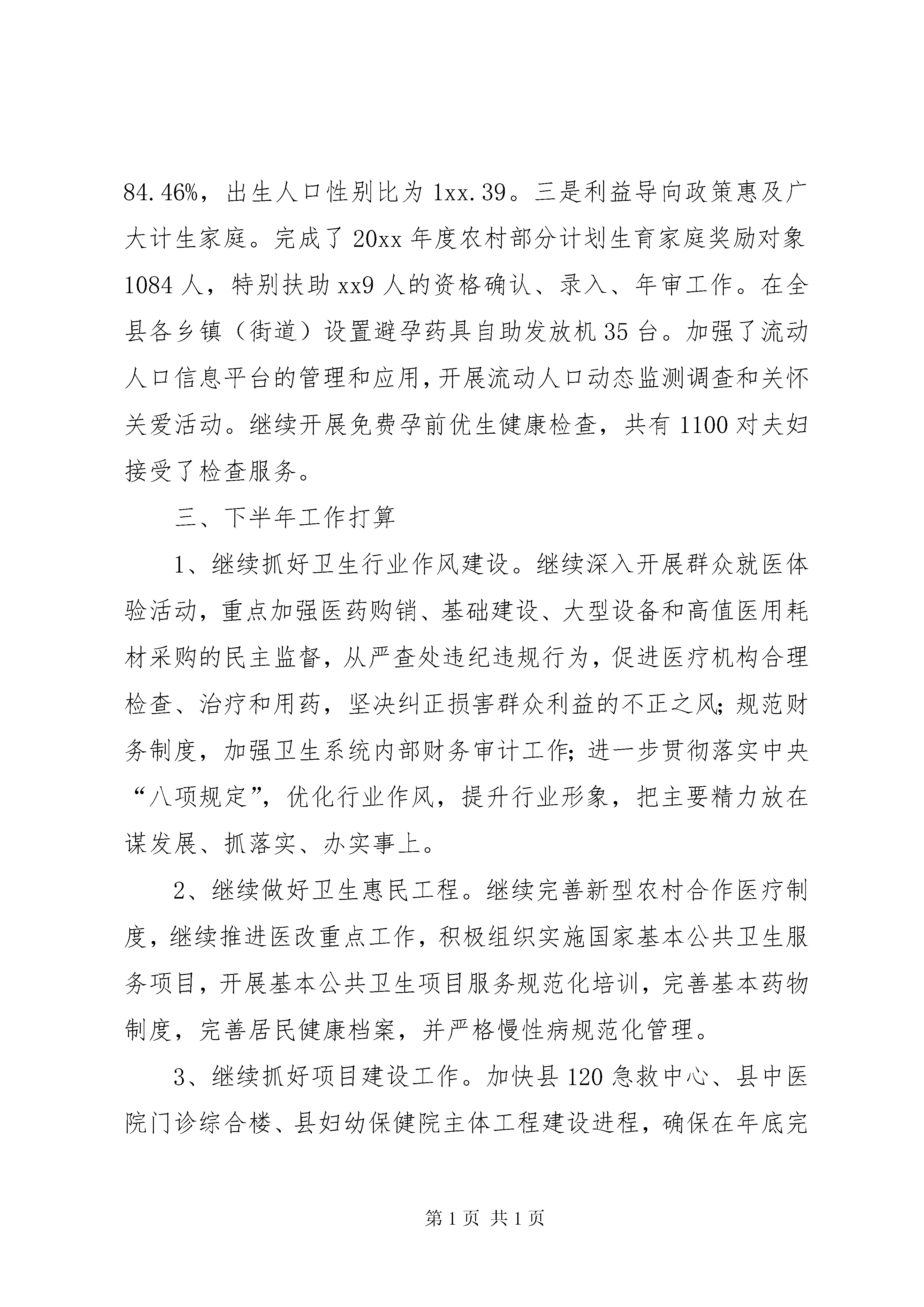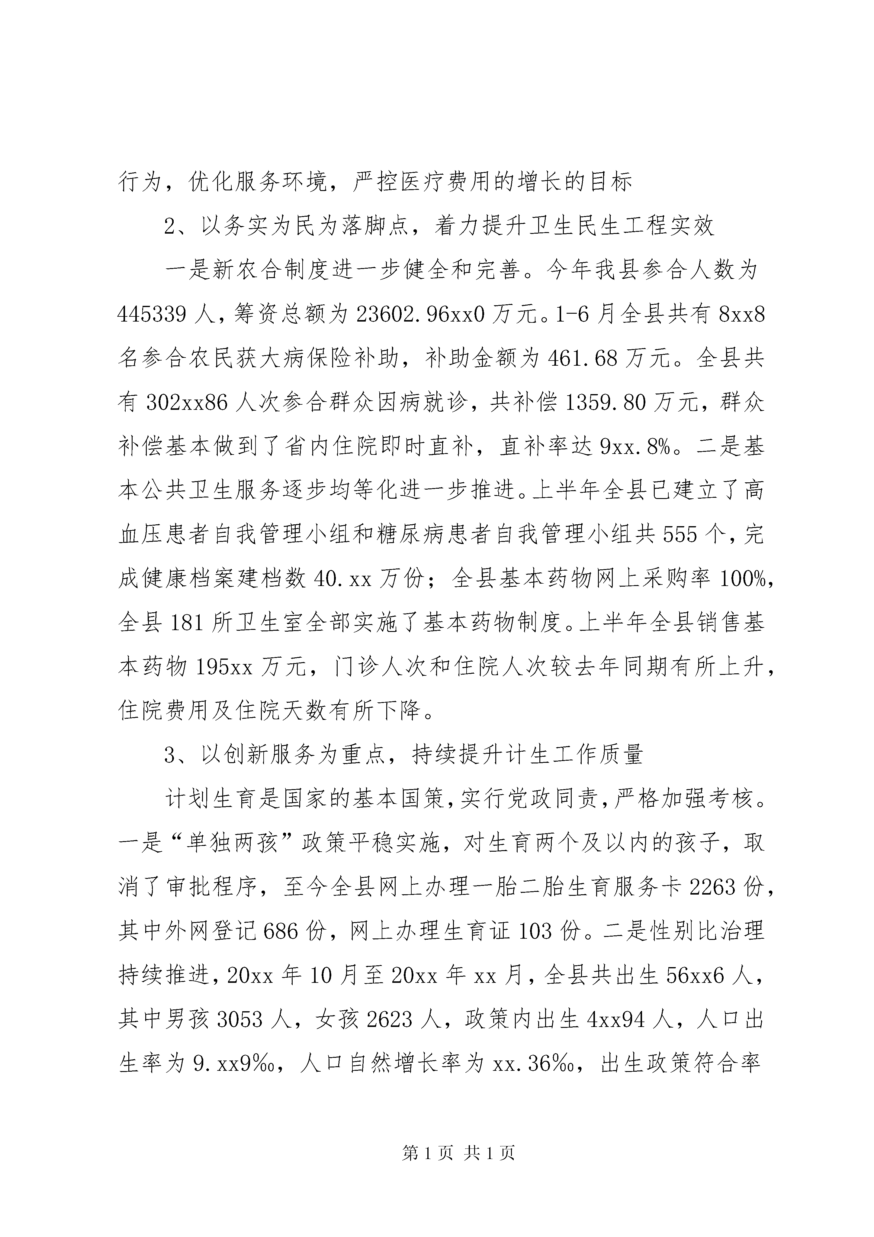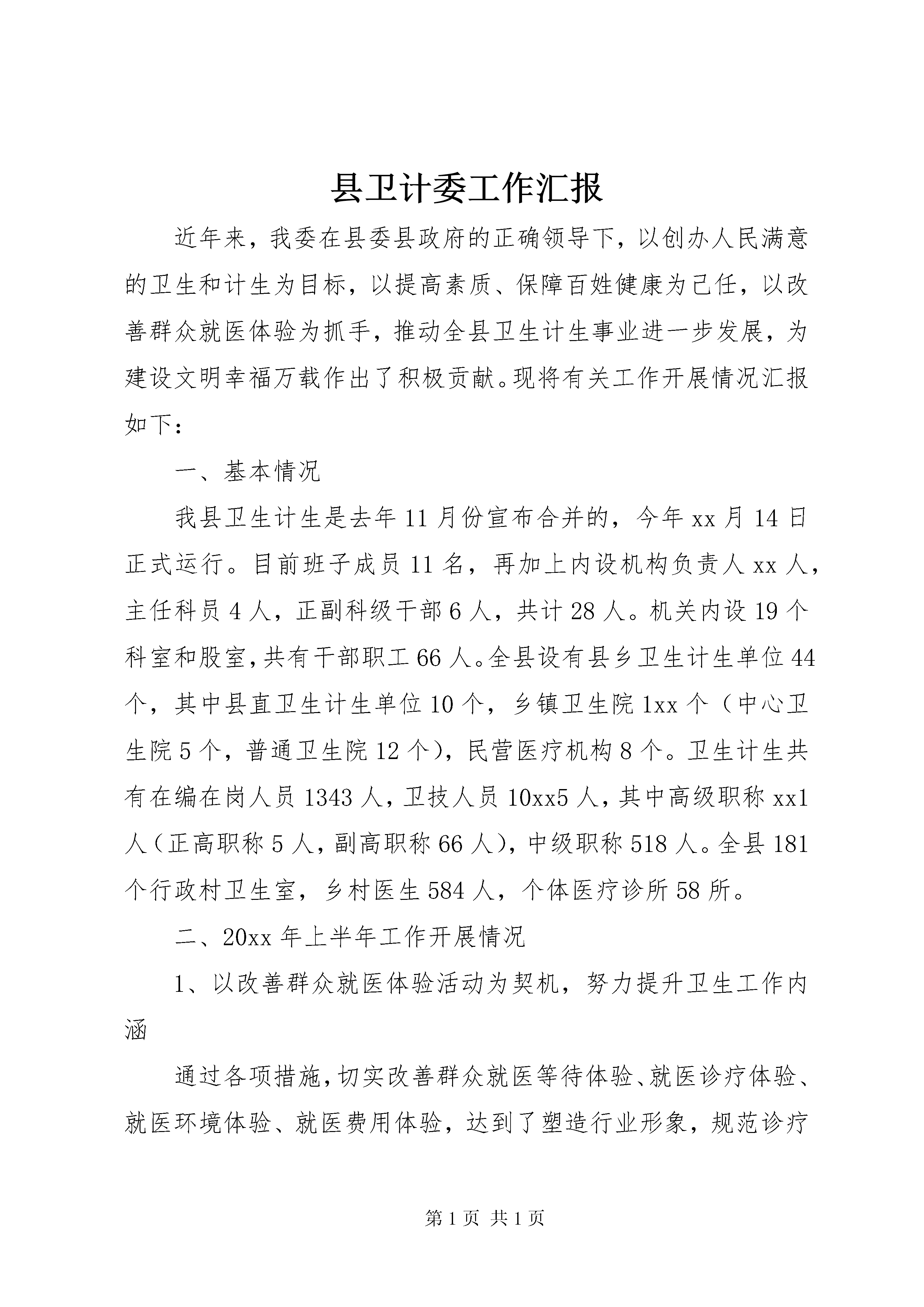 县卫计委工作汇报近年来,我委在县委县政府的正确领导下,以创办人民满意的卫生和计生为目标,以提高素质、保障百姓健康为己任,以改善群众就医体验为抓手,推动全县卫生计生事业进一步发展,为建设文明幸福万载作出了积极贡献。现将有关工作开展情况汇报如下:一、基本情况我县卫生计生是去年11月份宣布合并的,今年xx月14日正式运行。目前班子成员11名,再加上内设机构负责人xx人,主任科员4人,正副科级干部6人,共计28人。机关内设19个科室和股室,共有干部职工66人。全县设有县乡卫生计生单位44个,其中县直卫生计生单位10个,乡镇卫生院1xx个(中心卫生院5个,普通卫生院12个),民营医疗机构8个。卫生计生共有在编在岗人员1343人,卫技人员10xx5人,其中高级职称xx1人(正高职称5人,副高职称66人),中级职称518人。全县181个行政村卫生室,乡村医生584人,个体医疗诊所58所。二、20xx年上半年工作开展情况1、以改善群众就医体验活动为契机,努力提升卫生工作内涵通过各项措施,切实改善群众就医等待体验、就医诊疗体验、就医环境体验、就医费用体验,达到了塑造行业形象,规范诊疗行为,优化服务环境,严控医疗费用的增长的目标2、以务实为民为落脚点,着力提升卫生民生工程实效一是新农合制度进一步健全和完善。今年我县参合人数为445339人,筹资总额为23602.96xx0万元。1-6月全县共有8xx8名参合农民获大病保险补助,补助金额为461.68万元。全县共有302xx86人次参合群众因病就诊,共补偿1359.80万元,群众补偿基本做到了省内住院即时直补,直补率达9xx.8%。二是基本公共卫生服务逐步均等化进一步推进。上半年全县已建立了高血压患者自我管理小组和糖尿病患者自我管理小组共555个,完成健康档案建档数40.xx万份;全县基本药物网上采购率100%,全县181所卫生室全部实施了基本药物制度。上半年全县销售基本药物195xx万元,门诊人次和住院人次较去年同期有所上升,住院费用及住院天数有所下降。3、以创新服务为重点,持续提升计生工作质量计划生育是国家的基本国策,实行党政同责,严格加强考核。一是“单独两孩”政策平稳实施,对生育两个及以内的孩子,取消了审批程序,至今全县网上办理一胎二胎生育服务卡2263份,其中外网登记686份,网上办理生育证103份。二是性别比治理持续推进,20xx年10月至20xx年xx月,全县共出生56xx6人,其中男孩3053人,女孩2623人,政策内出生4xx94人,人口出生率为9.xx9‰,人口自然增长率为xx.36‰,出生政策符合率84.46%,出生人口性别比为1xx.39。三是利益导向政策惠及广大计生家庭。完成了20xx年度农村部分计划生育家庭奖励对象1084人,特别扶助xx9人的资格确认、录入、年审工作。在全县各乡镇(街道)设置避孕药具自助发放机35台。加强了流动人口信息平台的管理和应用,开展流动人口动态监测调查和关怀关爱活动。继续开展免费孕前优生健康检查,共有1100对夫妇接受了检查服务。三、下半年工作打算1、继续抓好卫生行业作风建设。继续深入开展群众就医体验活动,重点加强医药购销、基础建设、大型设备和高值医用耗材采购的民主监督,从严查处违纪违规行为,促进医疗机构合理检查、治疗和用药,坚决纠正损害群众利益的不正之风;规范财务制度,加强卫生系统内部财务审计工作;进一步贯彻落实中央“八项规定”,优化行业作风,提升行业形象,把主要精力放在谋发展、抓落实、办实事上。2、继续做好卫生惠民工程。继续完善新型农村合作医疗制度,继续推进医改重点工作,积极组织实施国家基本公共卫生服务项目,开展基本公共卫生项目服务规范化培训,完善基本药物制度,完善居民健康档案,并严格慢性病规范化管理。3、继续抓好项目建设工作。加快县120急救中心、县中医院门诊综合楼、县妇幼保健院主体工程建设进程,确保在年底完成建设任务。4、继续推进计生服务工作。开展秋季计划生育集中服务活动,时间从20xx年8月10日至20xx年10月31日,重点做三个方面的工作。一是重点做好计划生育政策的宣传贯彻,大力宣传计划生育法律法规,各乡镇(街道)要做到出动一辆宣传车、设置一幅宣传画、每村设置一个宣传栏和一条以上永久性宣传标语、每户发放一本宣传手册的“五个一”。要引导已经生育两个子女的群众落实以上环为主的避孕节育措施,预防和减少非意愿妊娠;计划外怀孕的,应当落实补救措施。二是重点做好社会抚养费征收管理,严格按照坚持首次征收标准不降低。计划外生育一胎的,首次征收金额不低于25000元(征收标准不足25000元的按原标准全额征收);超计划生育两胎及以上的,首次征收金额不低于32000元。对擅自降低首次征收标准的,不予发放社会抚养费征收票据,不足部