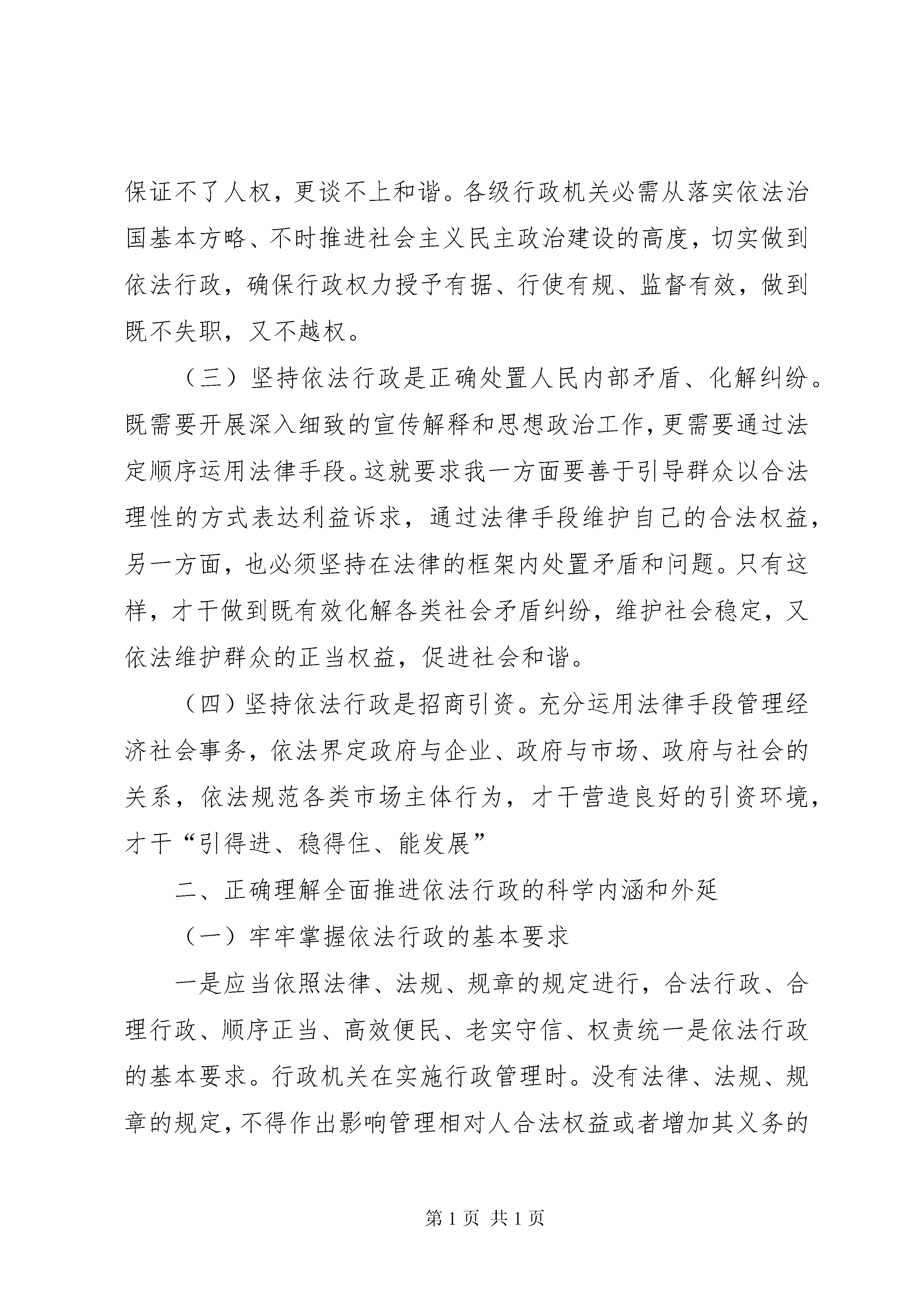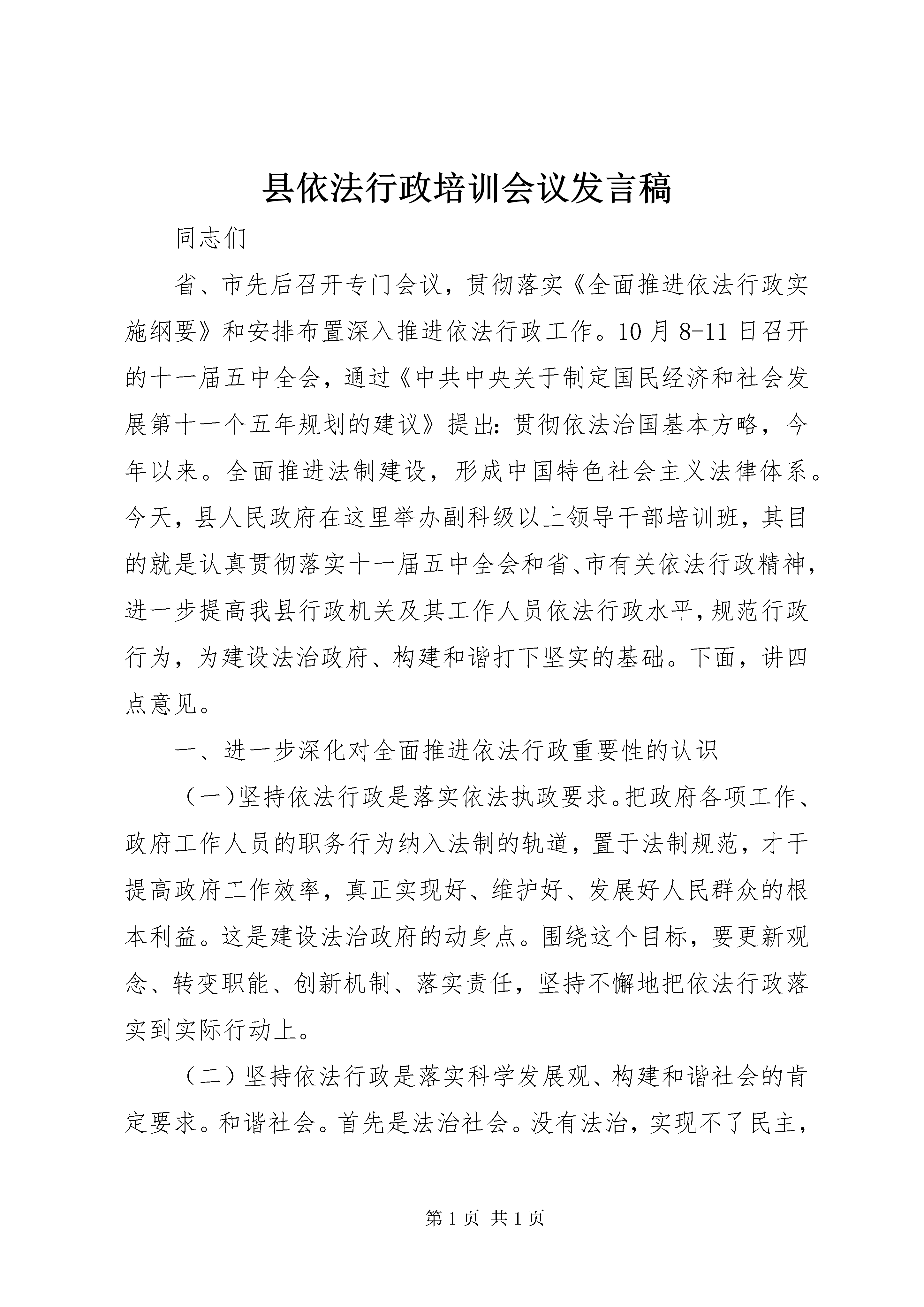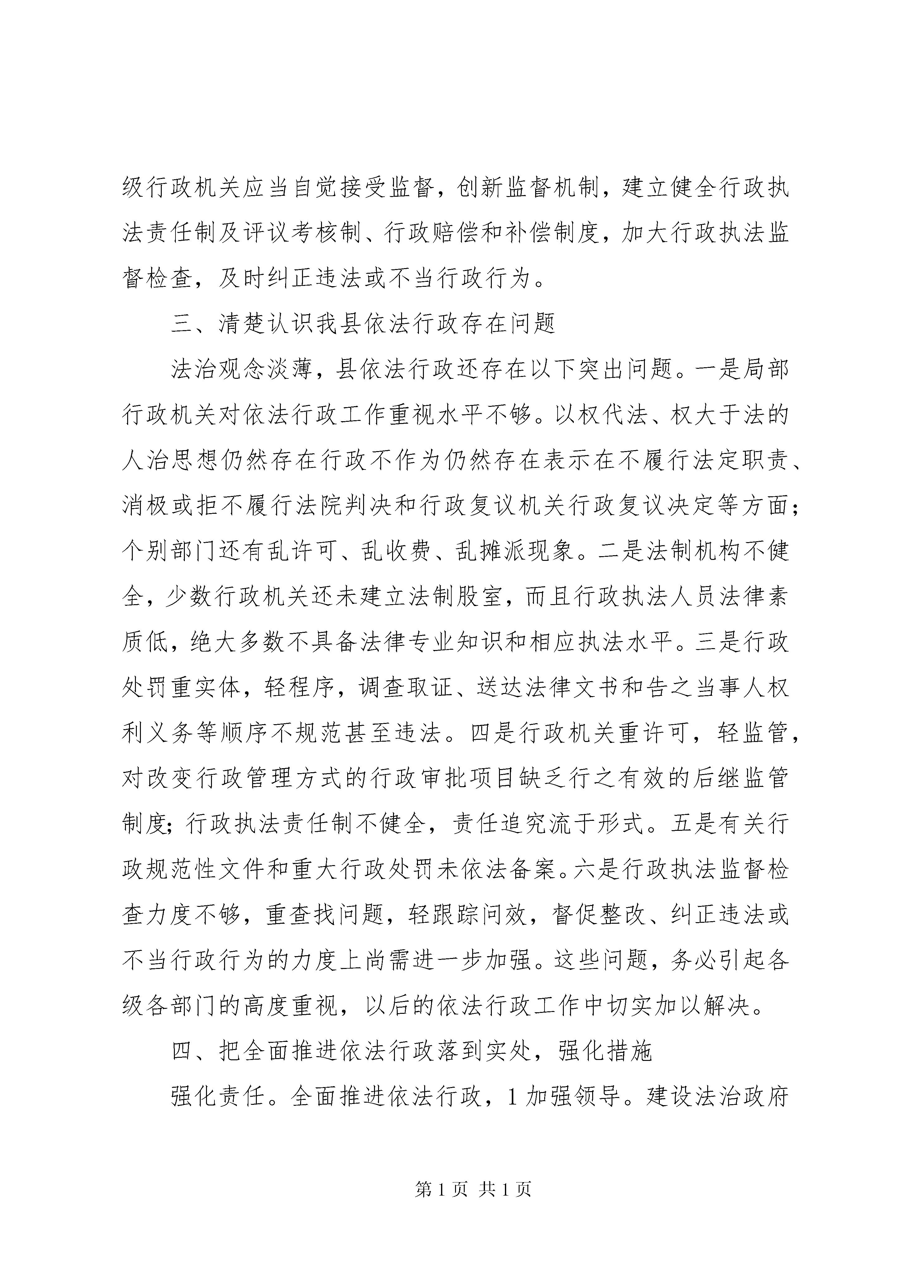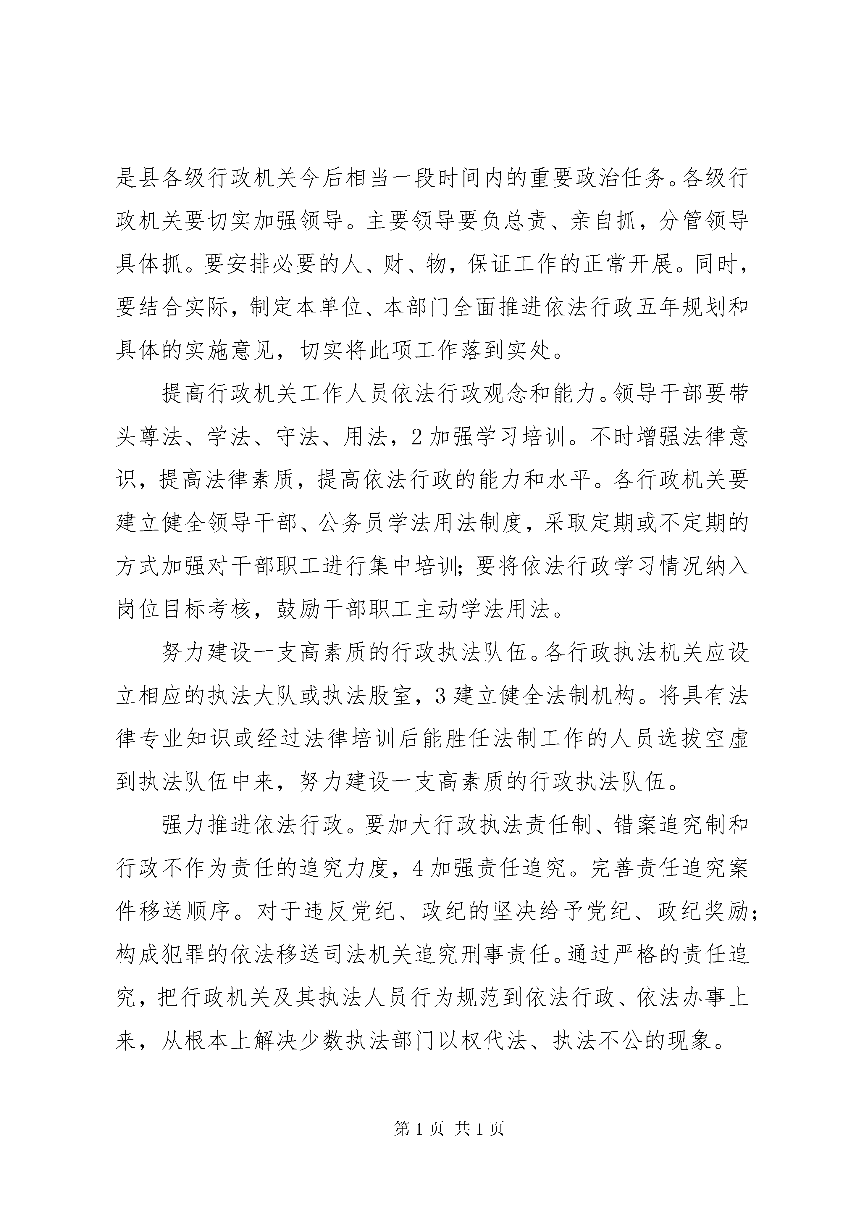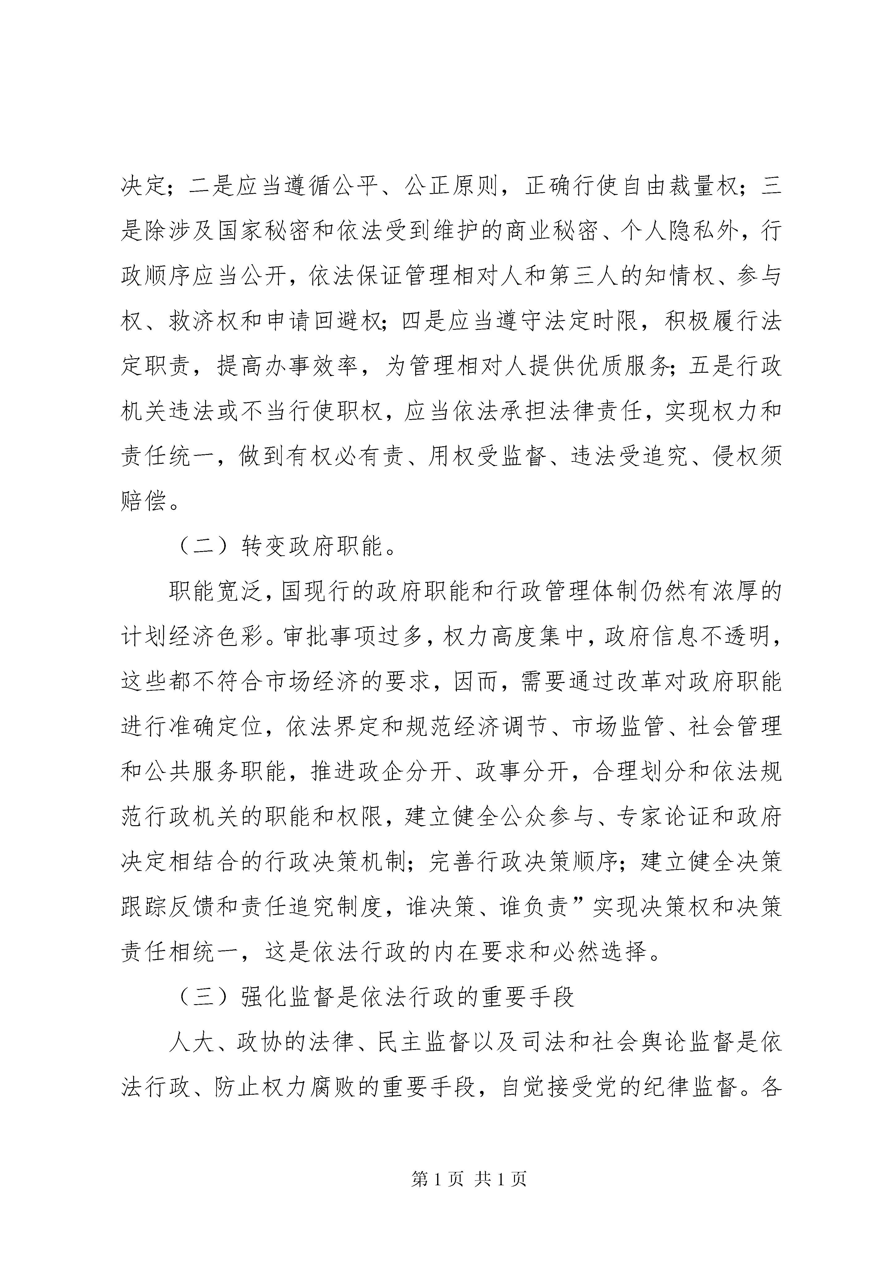 县依法行政培训会议发言稿同志们省、市先后召开专门会议,贯彻落实《全面推进依法行政实施纲要》和安排布置深入推进依法行政工作。10月8-11日召开的十一届五中全会,通过《中共中央关于制定国民经济和社会发展第十一个五年规划的建议》提出:贯彻依法治国基本方略,今年以来。全面推进法制建设,形成中国特色社会主义法律体系。今天,县人民政府在这里举办副科级以上领导干部培训班,其目的就是认真贯彻落实十一届五中全会和省、市有关依法行政精神,进一步提高我县行政机关及其工作人员依法行政水平,规范行政行为,为建设法治政府、构建和谐打下坚实的基础。下面,讲四点意见。一、进一步深化对全面推进依法行政重要性的认识(一)坚持依法行政是落实依法执政要求。把政府各项工作、政府工作人员的职务行为纳入法制的轨道,置于法制规范,才干提高政府工作效率,真正实现好、维护好、发展好人民群众的根本利益。这是建设法治政府的动身点。围绕这个目标,要更新观念、转变职能、创新机制、落实责任,坚持不懈地把依法行政落实到实际行动上。(二)坚持依法行政是落实科学发展观、构建和谐社会的肯定要求。和谐社会。首先是法治社会。没有法治,实现不了民主,保证不了人权,更谈不上和谐。各级行政机关必需从落实依法治国基本方略、不时推进社会主义民主政治建设的高度,切实做到依法行政,确保行政权力授予有据、行使有规、监督有效,做到既不失职,又不越权。(三)坚持依法行政是正确处置人民内部矛盾、化解纠纷。既需要开展深入细致的宣传解释和思想政治工作,更需要通过法定顺序运用法律手段。这就要求我一方面要善于引导群众以合法理性的方式表达利益诉求,通过法律手段维护自己的合法权益,另一方面,也必须坚持在法律的框架内处置矛盾和问题。只有这样,才干做到既有效化解各类社会矛盾纠纷,维护社会稳定,又依法维护群众的正当权益,促进社会和谐。(四)坚持依法行政是招商引资。充分运用法律手段管理经济社会事务,依法界定政府与企业、政府与市场、政府与社会的关系,依法规范各类市场主体行为,才干营造良好的引资环境,才干“引得进、稳得住、能发展”二、正确理解全面推进依法行政的科学内涵和外延(一)牢牢掌握依法行政的基本要求一是应当依照法律、法规、规章的规定进行,合法行政、合理行政、顺序正当、高效便民、老实守信、权责统一是依法行政的基本要求。行政机关在实施行政管理时。没有法律、法规、规章的规定,不得作出影响管理相对人合法权益或者增加其义务的决定;二是应当遵循公平、公正原则,正确行使自由裁量权;三是除涉及国家秘密和依法受到维护的商业秘密、个人隐私外,行政顺序应当公开,依法保证管理相对人和第三人的知情权、参与权、救济权和申请回避权;四是应当遵守法定时限,积极履行法定职责,提高办事效率,为管理相对人提供优质服务;五是行政机关违法或不当行使职权,应当依法承担法律责任,实现权力和责任统一,做到有权必有责、用权受监督、违法受追究、侵权须赔偿。(二)转变政府职能。职能宽泛,国现行的政府职能和行政管理体制仍然有浓厚的计划经济色彩。审批事项过多,权力高度集中,政府信息不透明,这些都不符合市场经济的要求,因而,需要通过改革对政府职能进行准确定位,依法界定和规范经济调节、市场监管、社会管理和公共服务职能,推进政企分开、政事分开,合理划分和依法规范行政机关的职能和权限,建立健全公众参与、专家论证和政府决定相结合的行政决策机制;完善行政决策顺序;建立健全决策跟踪反馈和责任追究制度,谁决策、谁负责”实现决策权和决策责任相统一,这是依法行政的内在要求和必然选择。(三)强化监督是依法行政的重要手段人大、政协的法律、民主监督以及司法和社会舆论监督是依法行政、防止权力腐败的重要手段,自觉接受党的纪律监督。各级行政机关应当自觉接受监督,创新监督机制,建立健全行政执法责任制及评议考核制、行政赔偿和补偿制度,加大行政执法监督检查,及时纠正违法或不当行政行为。三、清楚认识我县依法行政存在问题法治观念淡薄,县依法行政还存在以下突出问题。一是局部行政机关对依法行政工作重视水平不够。以权代法、权大于法的人治思想仍然存在行政不作为仍然存在表示在不履行法定职责、消极或拒不履行法院判决和行政复议机关行政复议决定等方面;个别部门还有乱许可、乱收费、乱摊派现象。二是法制机构不健全,少数行政机关还未建立法制股室,而且行政执法人员法律素质低,绝大多数不具备法律专业知识和相应执法水平。三是行政处罚重实体,轻程序,调查取证、送达法律文书和告之当事人权利义务等顺序不规范甚至违法。四是行政机关重许可,轻监管,对改变行政管理方式的行政审批项目缺乏行之有效的后继监管制度;行政执法责任制不健全,责任追究流于形式。五是有关行政规范性文件和重大行政处罚未依法备案。六是行政执法监督检查力度不够,重查找问题,轻跟踪问效,