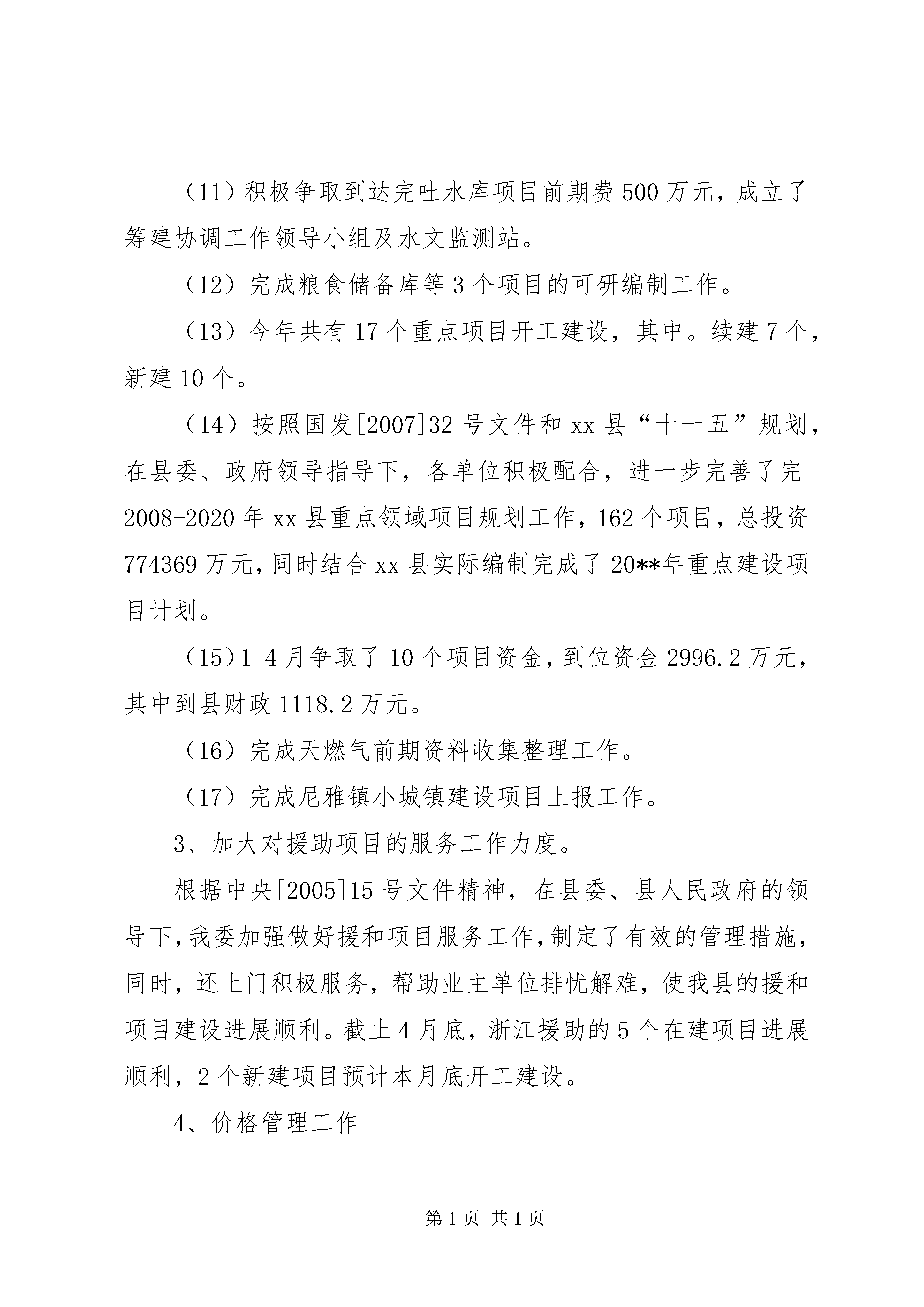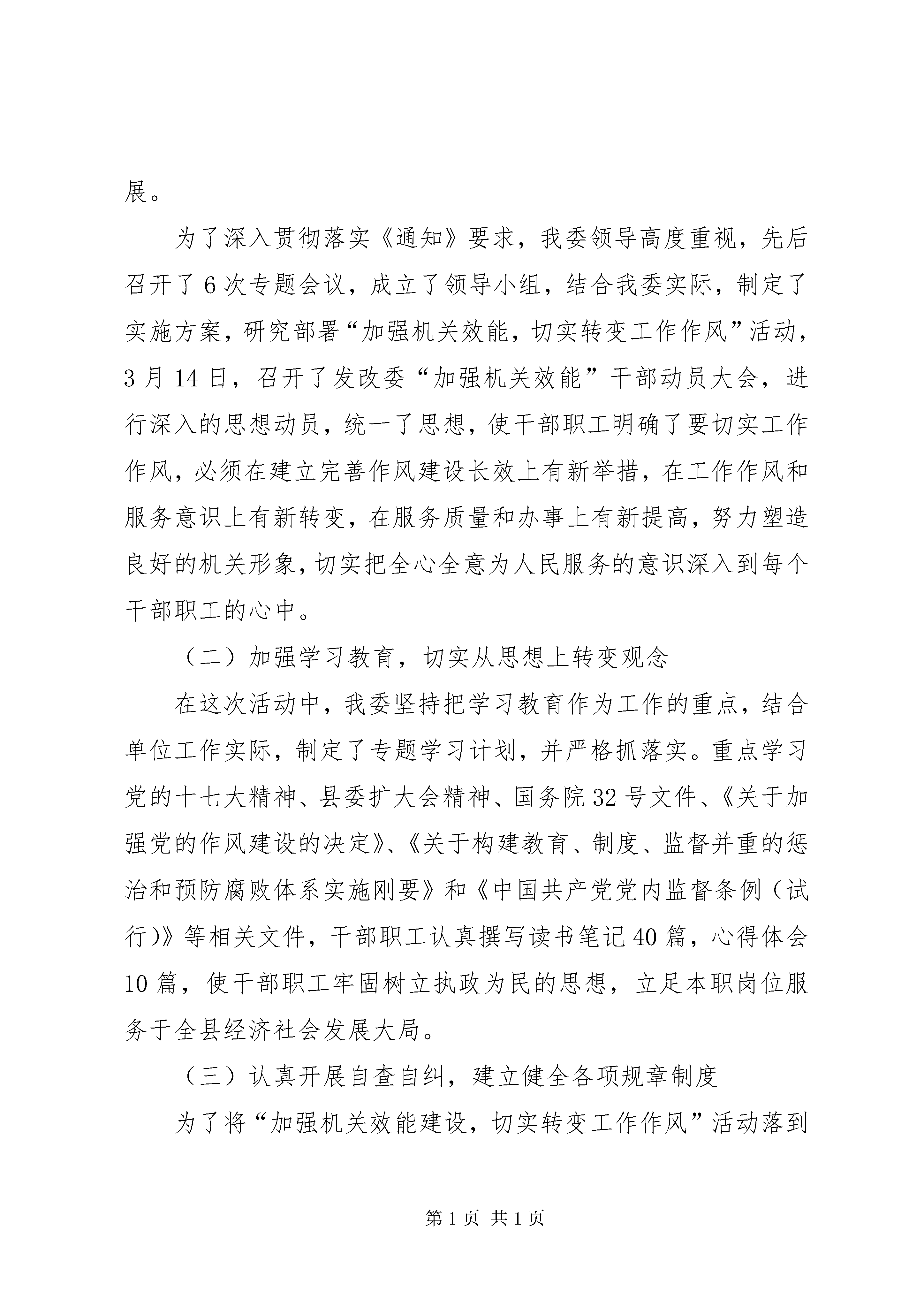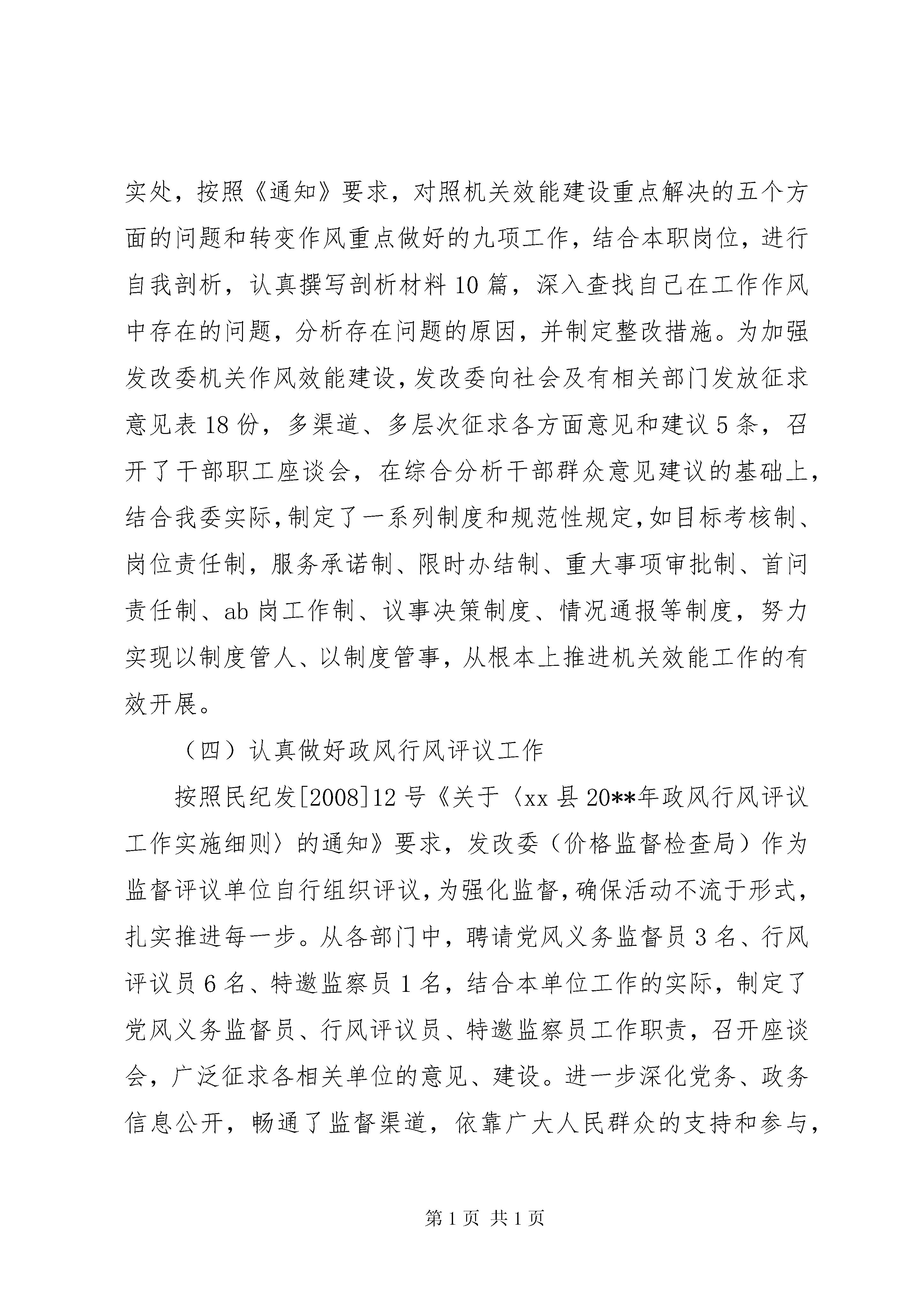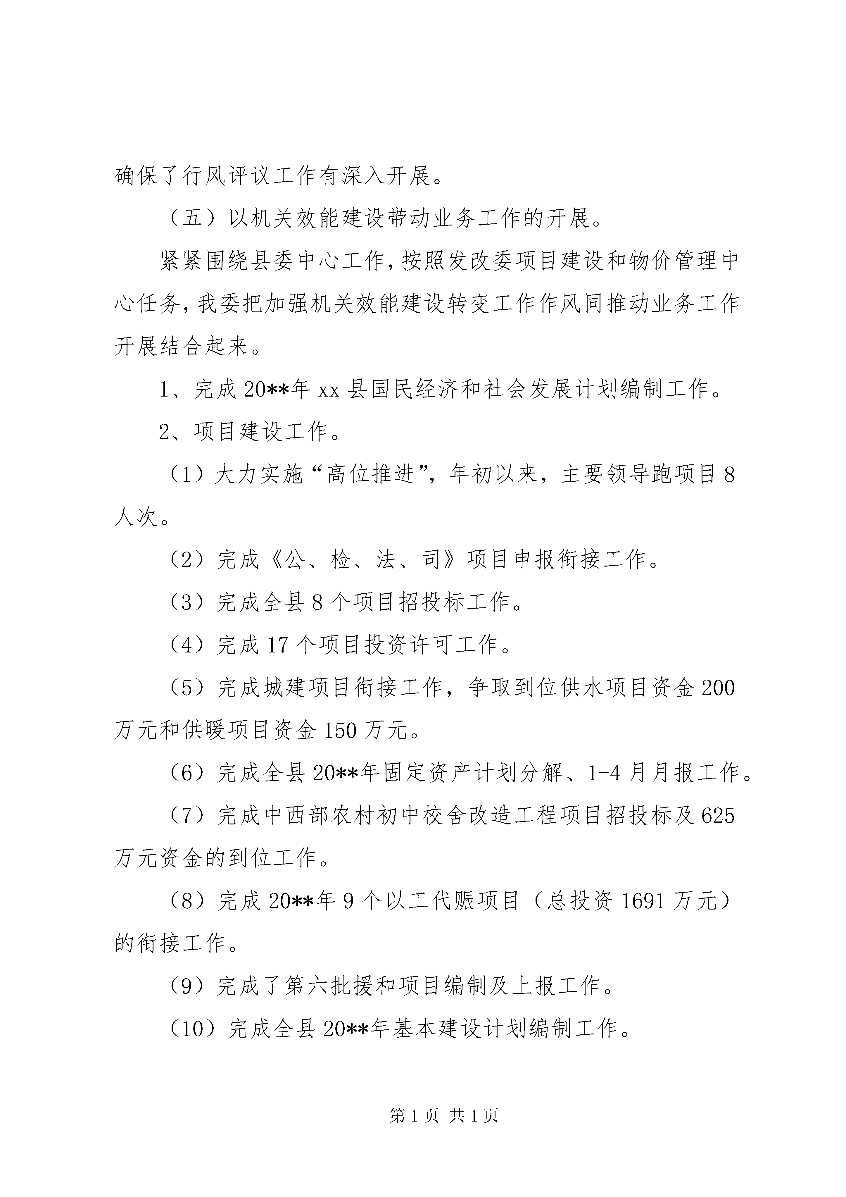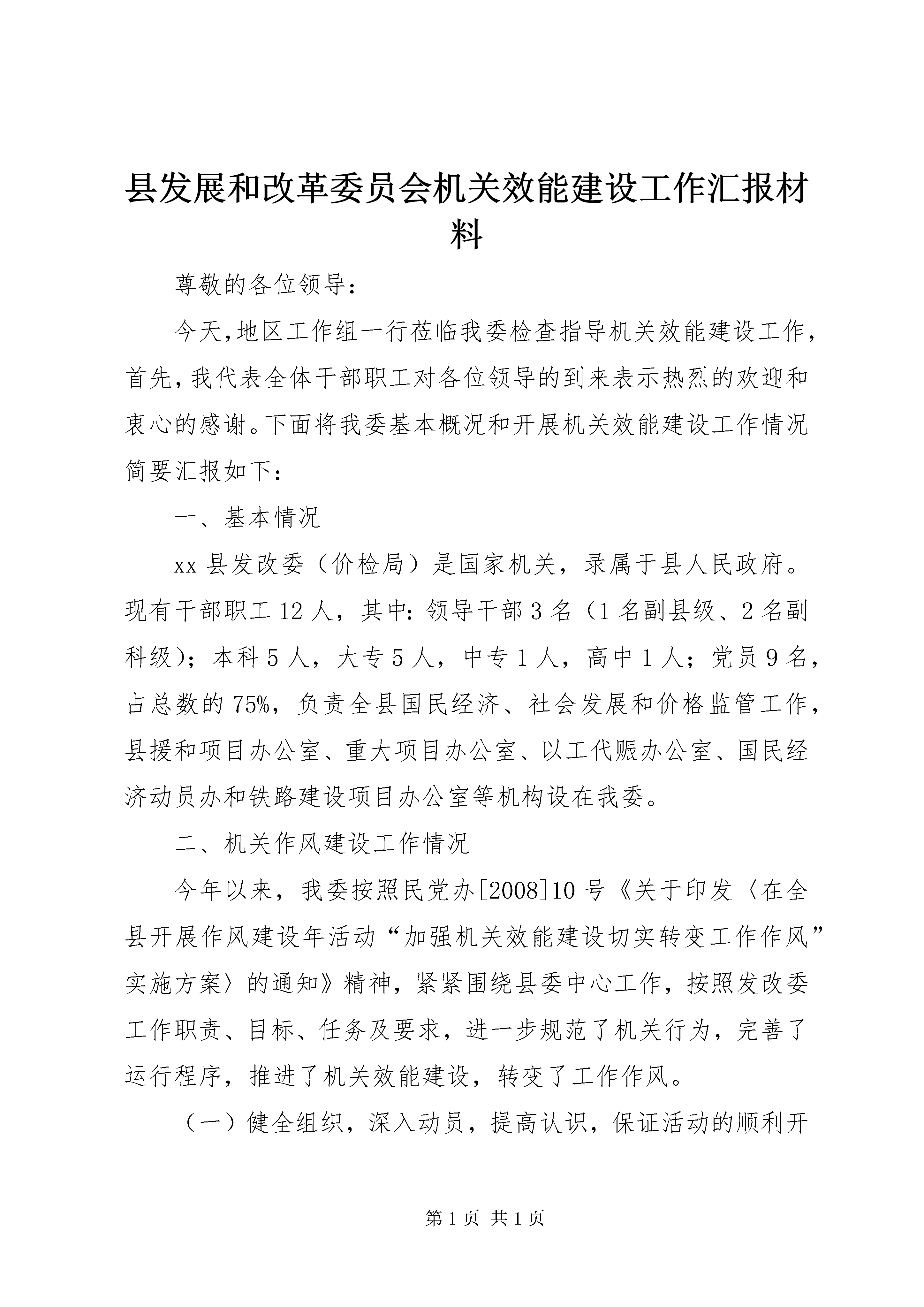县发展和改革委员会机关效能建设工作汇报材料尊敬的各位领导:今天,地区工作组一行莅临我委检查指导机关效能建设工作,首先,我代表全体干部职工对各位领导的到来表示热烈的欢迎和衷心的感谢。下面将我委基本概况和开展机关效能建设工作情况简要汇报如下:一、基本情况xx县发改委(价检局)是国家机关,录属于县人民政府。现有干部职工12人,其中:领导干部3名(1名副县级、2名副科级);本科5人,大专5人,中专1人,高中1人;党员9名,占总数的75%,负责全县国民经济、社会发展和价格监管工作,县援和项目办公室、重大项目办公室、以工代赈办公室、国民经济动员办和铁路建设项目办公室等机构设在我委。二、机关作风建设工作情况今年以来,我委按照民党办[2008]10号《关于印发〈在全县开展作风建设年活动“加强机关效能建设切实转变工作作风”实施方案〉的通知》精神,紧紧围绕县委中心工作,按照发改委工作职责、目标、任务及要求,进一步规范了机关行为,完善了运行程序,推进了机关效能建设,转变了工作作风。(一)健全组织,深入动员,提高认识,保证活动的顺利开展。为了深入贯彻落实《通知》要求,我委领导高度重视,先后召开了6次专题会议,成立了领导小组,结合我委实际,制定了实施方案,研究部署“加强机关效能,切实转变工作作风”活动,3月14日,召开了发改委“加强机关效能”干部动员大会,进行深入的思想动员,统一了思想,使干部职工明确了要切实工作作风,必须在建立完善作风建设长效上有新举措,在工作作风和服务意识上有新转变,在服务质量和办事上有新提高,努力塑造良好的机关形象,切实把全心全意为人民服务的意识深入到每个干部职工的心中。(二)加强学习教育,切实从思想上转变观念在这次活动中,我委坚持把学习教育作为工作的重点,结合单位工作实际,制定了专题学习计划,并严格抓落实。重点学习党的十七大精神、县委扩大会精神、国务院32号文件、《关于加强党的作风建设的决定》、《关于构建教育、制度、监督并重的惩治和预防腐败体系实施刚要》和《中国共产党党内监督条例(试行)》等相关文件,干部职工认真撰写读书笔记40篇,心得体会10篇,使干部职工牢固树立执政为民的思想,立足本职岗位服务于全县经济社会发展大局。(三)认真开展自查自纠,建立健全各项规章制度为了将“加强机关效能建设,切实转变工作作风”活动落到实处,按照《通知》要求,对照机关效能建设重点解决的五个方面的问题和转变作风重点做好的九项工作,结合本职岗位,进行自我剖析,认真撰写剖析材料10篇,深入查找自己在工作作风中存在的问题,分析存在问题的原因,并制定整改措施。为加强发改委机关作风效能建设,发改委向社会及有相关部门发放征求意见表18份,多渠道、多层次征求各方面意见和建议5条,召开了干部职工座谈会,在综合分析干部群众意见建议的基础上,结合我委实际,制定了一系列制度和规范性规定,如目标考核制、岗位责任制,服务承诺制、限时办结制、重大事项审批制、首问责任制、ab岗工作制、议事决策制度、情况通报等制度,努力实现以制度管人、以制度管事,从根本上推进机关效能工作的有效开展。(四)认真做好政风行风评议工作按照民纪发[2008]12号《关于〈xx县20**年政风行风评议工作实施细则〉的通知》要求,发改委(价格监督检查局)作为监督评议单位自行组织评议,为强化监督,确保活动不流于形式,扎实推进每一步。从各部门中,聘请党风义务监督员3名、行风评议员6名、特邀监察员1名,结合本单位工作的实际,制定了党风义务监督员、行风评议员、特邀监察员工作职责,召开座谈会,广泛征求各相关单位的意见、建设。进一步深化党务、政务信息公开,畅通了监督渠道,依靠广大人民群众的支持和参与,确保了行风评议工作有深入开展。(五)以机关效能建设带动业务工作的开展。紧紧围绕县委中心工作,按照发改委项目建设和物价管理中心任务,我委把加强机关效能建设转变工作作风同推动业务工作开展结合起来。1、完成20**年xx县国民经济和社会发展计划编制工作。2、项目建设工作。(1)大力实施“高位推进”,年初以来,主要领导跑项目8人次。(2)完成《公、检、法、司》项目申报衔接工作。(3)完成全县8个项目招投标工作。(4)完成17个项目投资许可工作。(5)完成城建项目衔接工作,争取到位供水项目资金200万元和供暖项目资金150万元。(6)完成全县20**年固定资产计划分解、1-4月月报工作。(7)完成中西部农村初中校舍改造工程项目招投标及625万元资金的到位工作。(8)完成20**年9个以工代赈项目(总投资1691万元)的衔接工作。(9)完成了第六批援和项目编制及上报工作。(10)完成全县20**年基本建设计划编制工作。(11)积极争取到达完吐水库项目前期费500万元,成立了筹建协调工作领导小组及水文监测站。(12