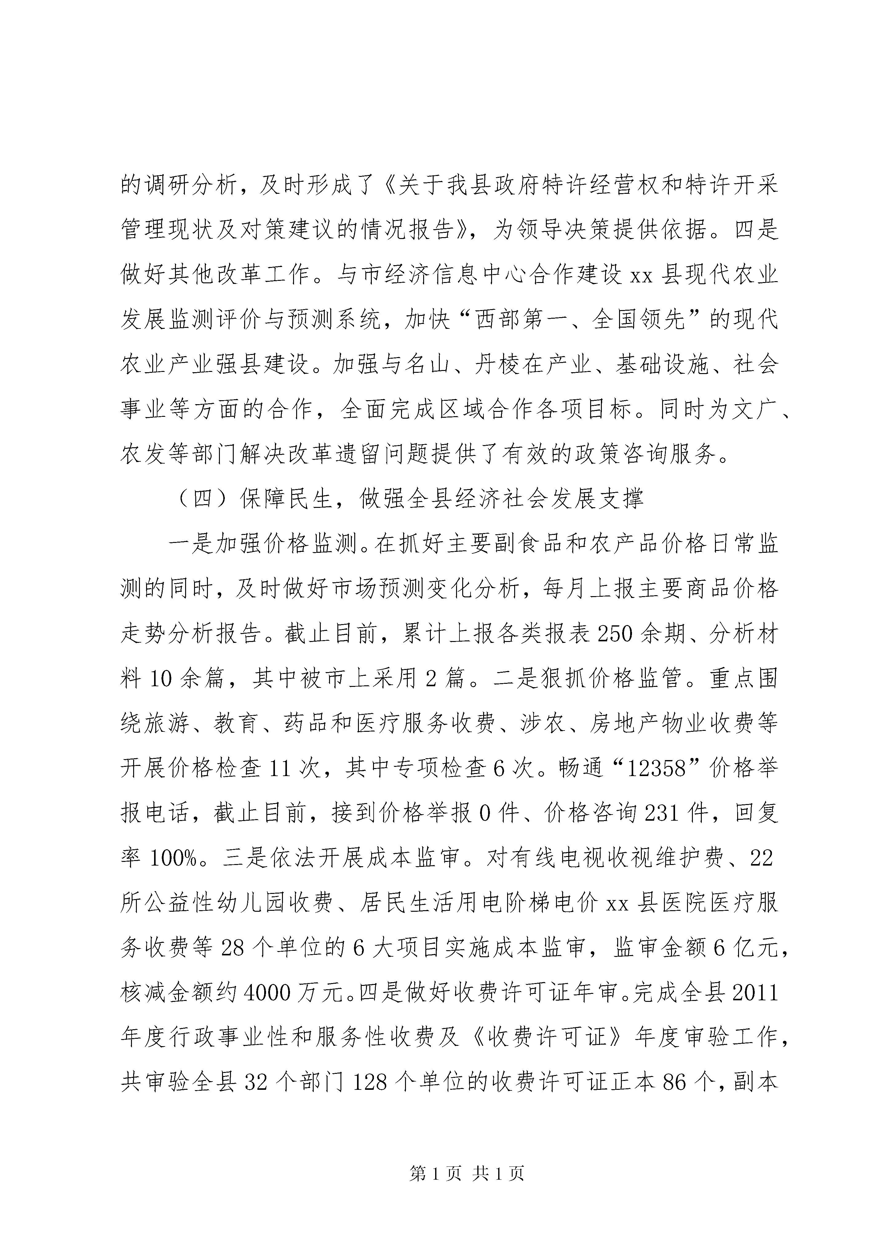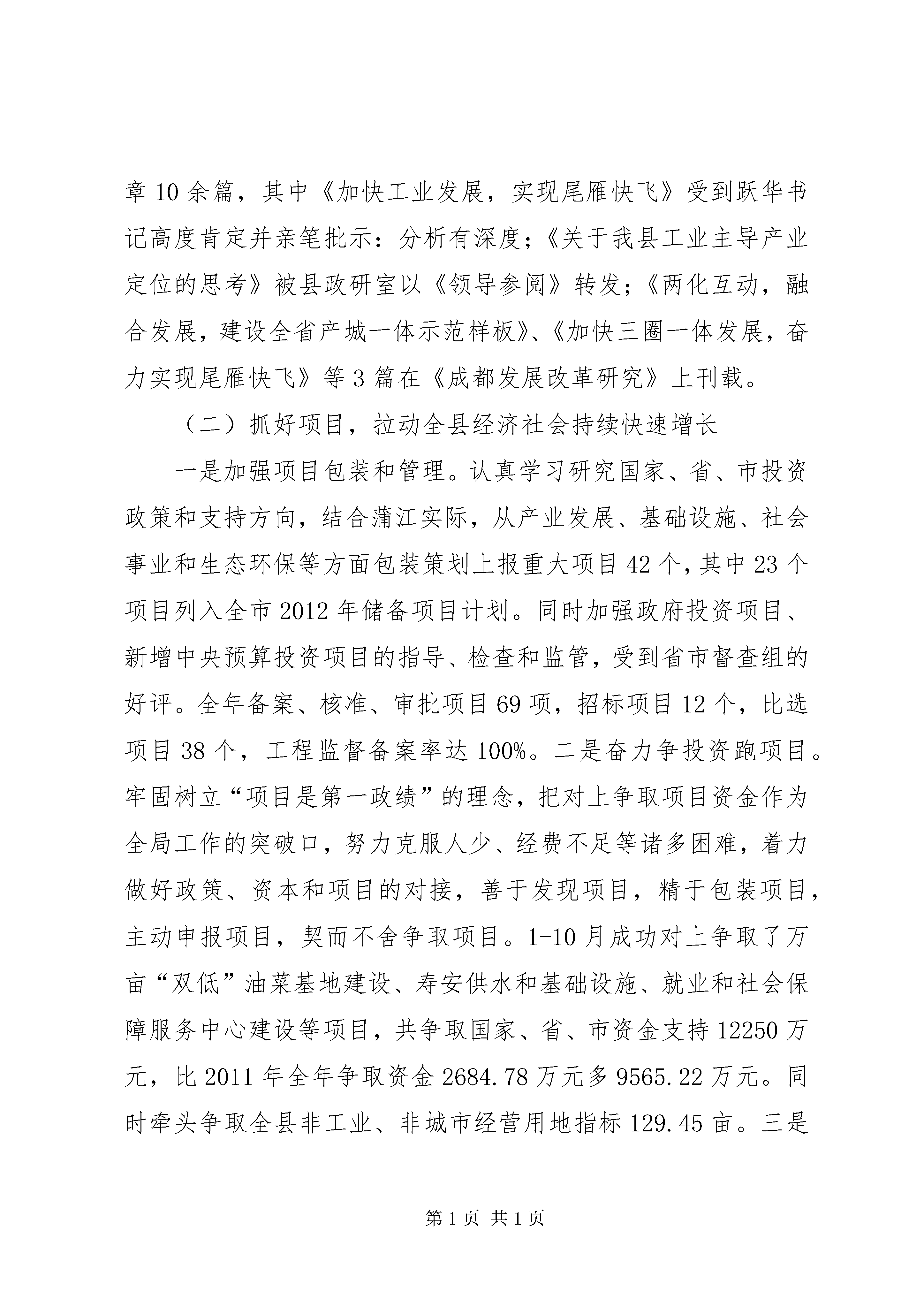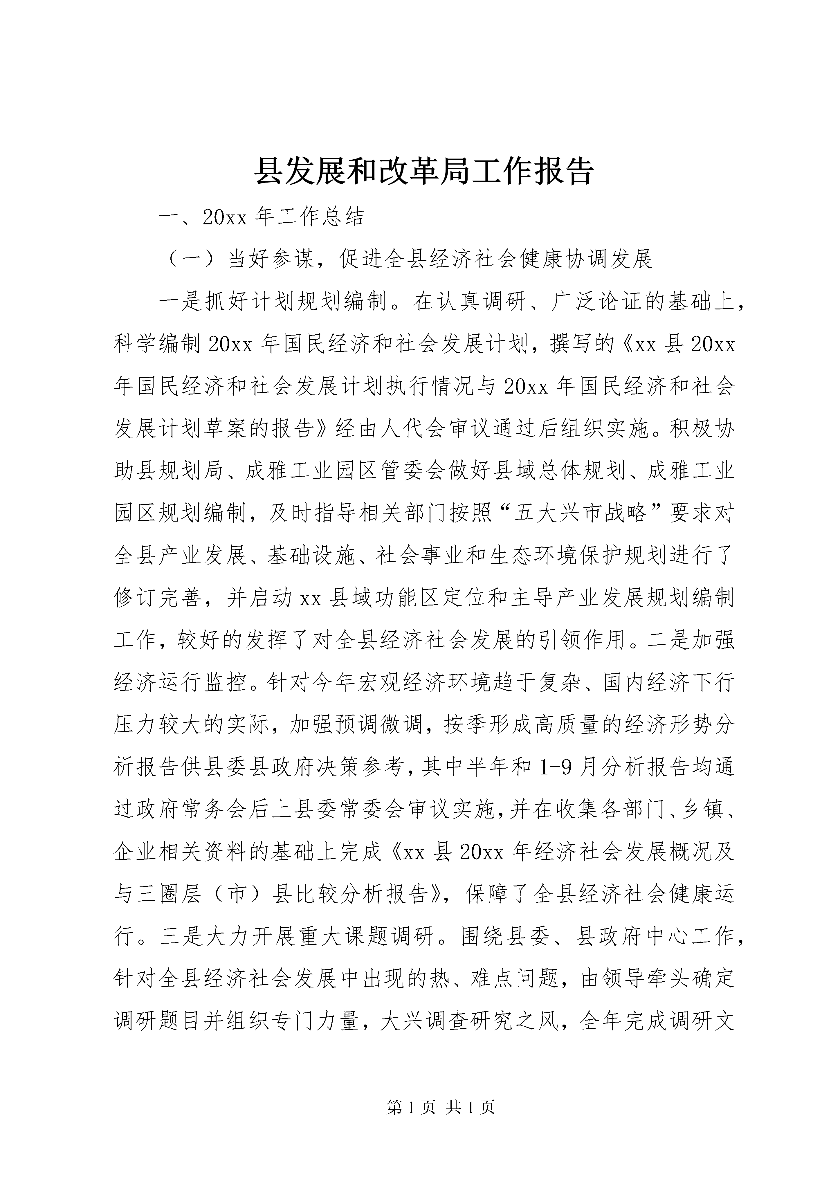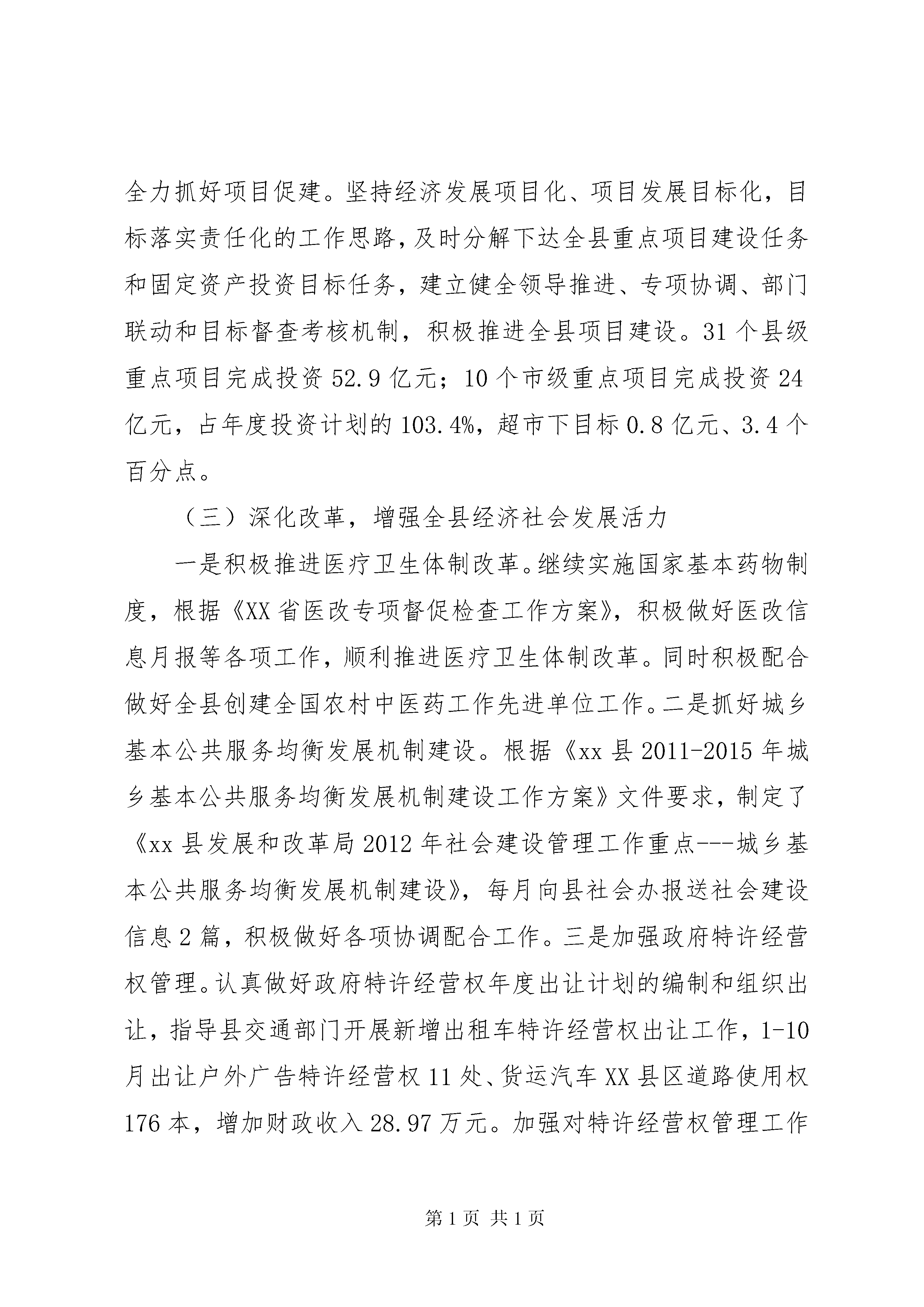 县发展和改革局工作报告一、20xx年工作总结(一)当好参谋,促进全县经济社会健康协调发展一是抓好计划规划编制。在认真调研、广泛论证的基础上,科学编制20xx年国民经济和社会发展计划,撰写的《xx县20xx年国民经济和社会发展计划执行情况与20xx年国民经济和社会发展计划草案的报告》经由人代会审议通过后组织实施。积极协助县规划局、成雅工业园区管委会做好县域总体规划、成雅工业园区规划编制,及时指导相关部门按照“五大兴市战略”要求对全县产业发展、基础设施、社会事业和生态环境保护规划进行了修订完善,并启动xx县域功能区定位和主导产业发展规划编制工作,较好的发挥了对全县经济社会发展的引领作用。二是加强经济运行监控。针对今年宏观经济环境趋于复杂、国内经济下行压力较大的实际,加强预调微调,按季形成高质量的经济形势分析报告供县委县政府决策参考,其中半年和1-9月分析报告均通过政府常务会后上县委常委会审议实施,并在收集各部门、乡镇、企业相关资料的基础上完成《xx县20xx年经济社会发展概况及与三圈层(市)县比较分析报告》,保障了全县经济社会健康运行。三是大力开展重大课题调研。围绕县委、县政府中心工作,针对全县经济社会发展中出现的热、难点问题,由领导牵头确定调研题目并组织专门力量,大兴调查研究之风,全年完成调研文章10余篇,其中《加快工业发展,实现尾雁快飞》受到跃华书记高度肯定并亲笔批示:分析有深度;《关于我县工业主导产业定位的思考》被县政研室以《领导参阅》转发;《两化互动,融合发展,建设全省产城一体示范样板》、《加快三圈一体发展,奋力实现尾雁快飞》等3篇在《成都发展改革研究》上刊载。(二)抓好项目,拉动全县经济社会持续快速增长一是加强项目包装和管理。认真学习研究国家、省、市投资政策和支持方向,结合蒲江实际,从产业发展、基础设施、社会事业和生态环保等方面包装策划上报重大项目42个,其中23个项目列入全市2012年储备项目计划。同时加强政府投资项目、新增中央预算投资项目的指导、检查和监管,受到省市督查组的好评。全年备案、核准、审批项目69项,招标项目12个,比选项目38个,工程监督备案率达100%。二是奋力争投资跑项目。牢固树立“项目是第一政绩”的理念,把对上争取项目资金作为全局工作的突破口,努力克服人少、经费不足等诸多困难,着力做好政策、资本和项目的对接,善于发现项目,精于包装项目,主动申报项目,契而不舍争取项目。1-10月成功对上争取了万亩“双低”油菜基地建设、寿安供水和基础设施、就业和社会保障服务中心建设等项目,共争取国家、省、市资金支持12250万元,比2011年全年争取资金2684.78万元多9565.22万元。同时牵头争取全县非工业、非城市经营用地指标129.45亩。三是全力抓好项目促建。坚持经济发展项目化、项目发展目标化,目标落实责任化的工作思路,及时分解下达全县重点项目建设任务和固定资产投资目标任务,建立健全领导推进、专项协调、部门联动和目标督查考核机制,积极推进全县项目建设。31个县级重点项目完成投资52.9亿元;10个市级重点项目完成投资24亿元,占年度投资计划的103.4%,超市下目标0.8亿元、3.4个百分点。(三)深化改革,增强全县经济社会发展活力一是积极推进医疗卫生体制改革。继续实施国家基本药物制度,根据《XX省医改专项督促检查工作方案》,积极做好医改信息月报等各项工作,顺利推进医疗卫生体制改革。同时积极配合做好全县创建全国农村中医药工作先进单位工作。二是抓好城乡基本公共服务均衡发展机制建设。根据《xx县2011-2015年城乡基本公共服务均衡发展机制建设工作方案》文件要求,制定了《xx县发展和改革局2012年社会建设管理工作重点---城乡基本公共服务均衡发展机制建设》,每月向县社会办报送社会建设信息2篇,积极做好各项协调配合工作。三是加强政府特许经营权管理。认真做好政府特许经营权年度出让计划的编制和组织出让,指导县交通部门开展新增出租车特许经营权出让工作,1-10月出让户外广告特许经营权11处、货运汽车XX县区道路使用权176本,增加财政收入28.97万元。加强对特许经营权管理工作的调研分析,及时形成了《关于我县政府特许经营权和特许开采管理现状及对策建议的情况报告》,为领导决策提供依据。四是做好其他改革工作。与市经济信息中心合作建设xx县现代农业发展监测评价与预测系统,加快“西部第一、全国领先”的现代农业产业强县建设。加强与名山、丹棱在产业、基础设施、社会事业等方面的合作,全面完成区域合作各项目标。同时为文广、农发等部门解决改革遗留问题提供了有效的政策咨询服务。(四)保障民生,做强全县经济社会发展支撑一是加强价格监测。在抓好主要副食品和农产品价格日常监测的同时,及时做好市场预测变化分析,每月上