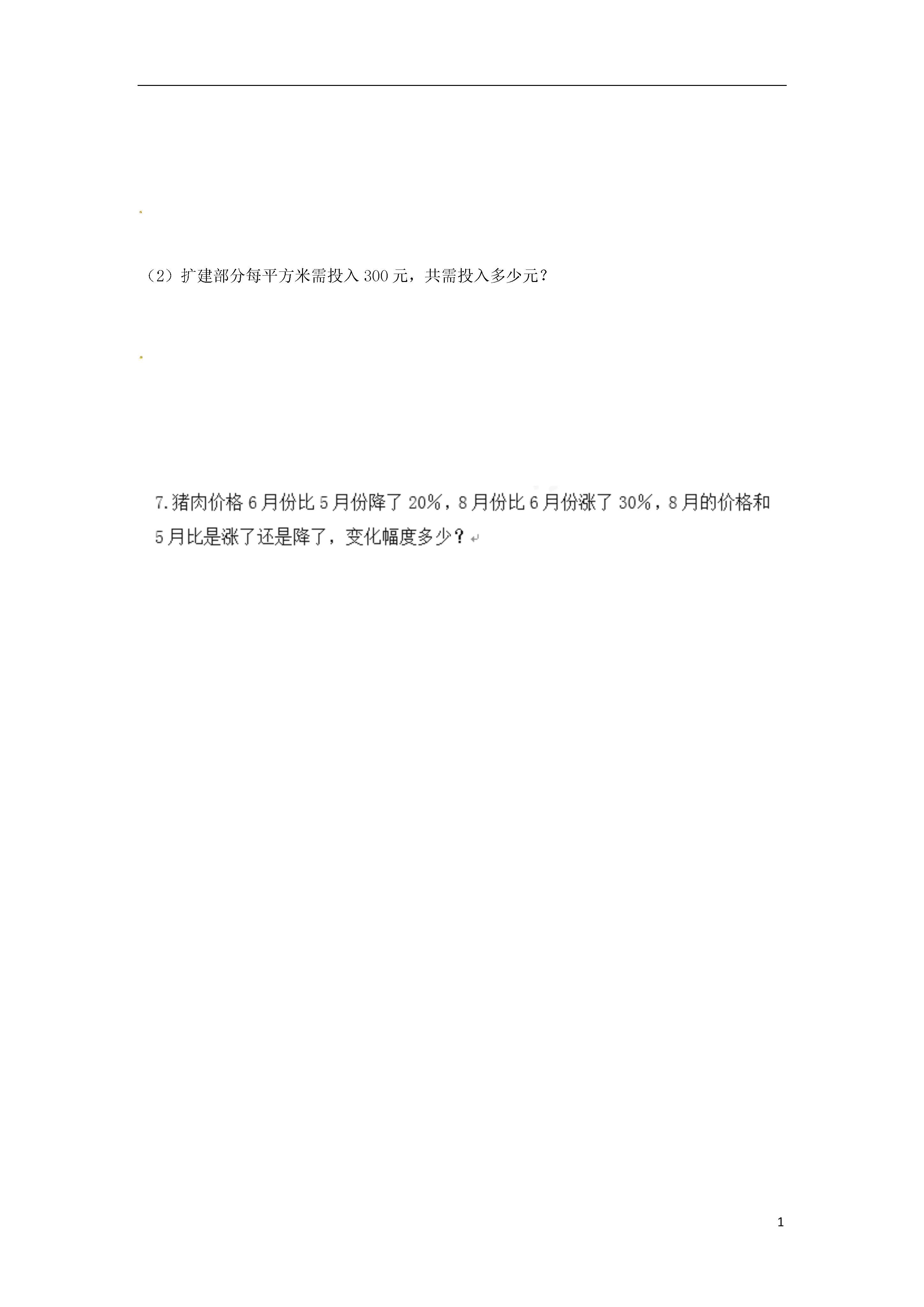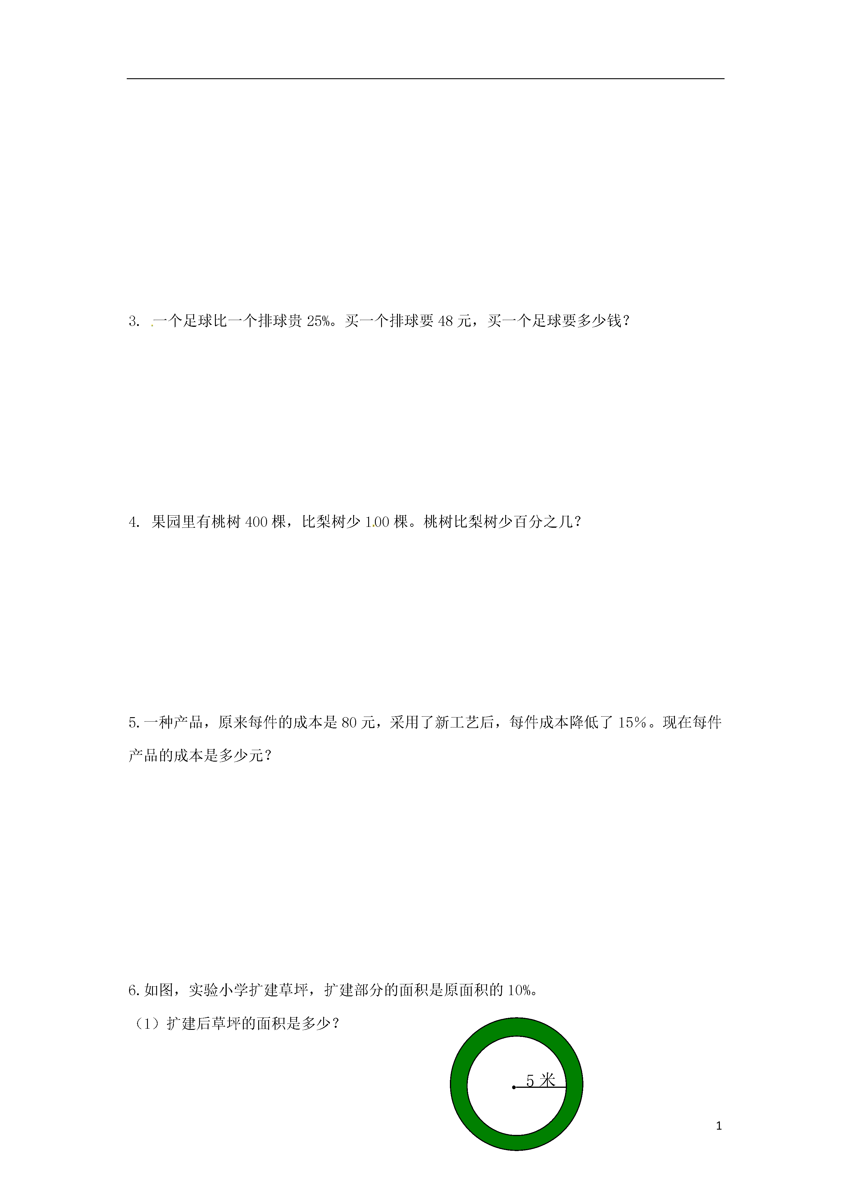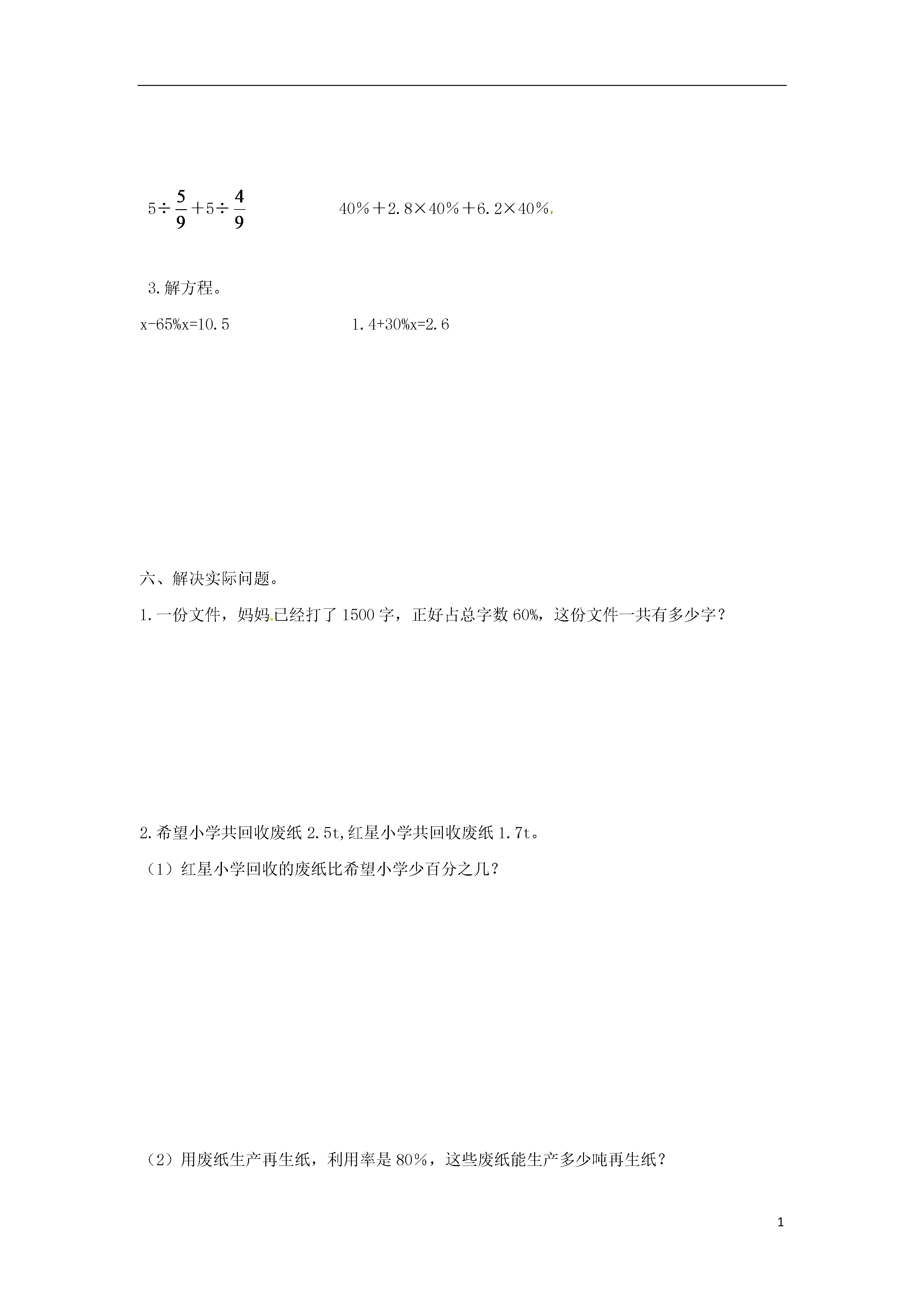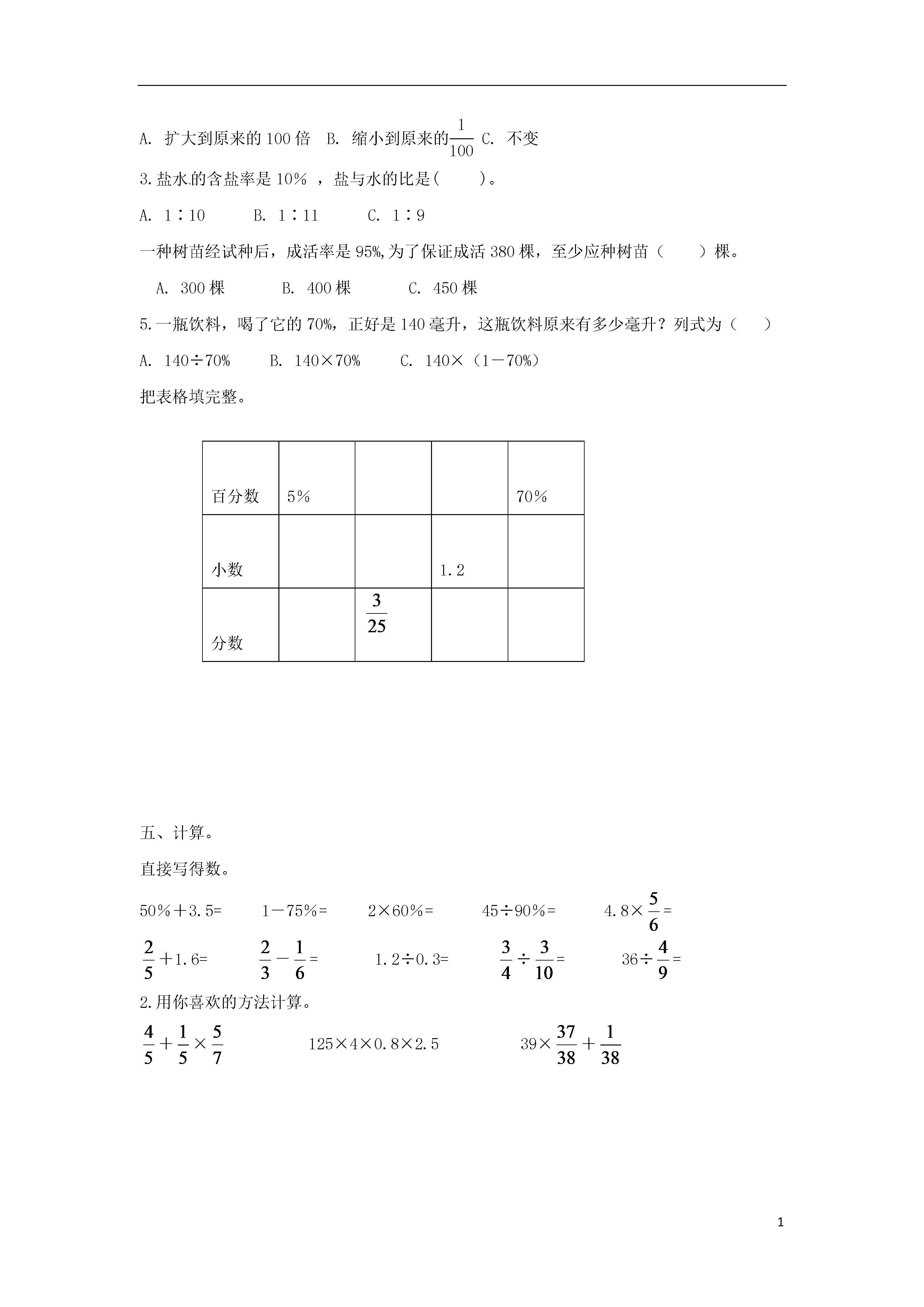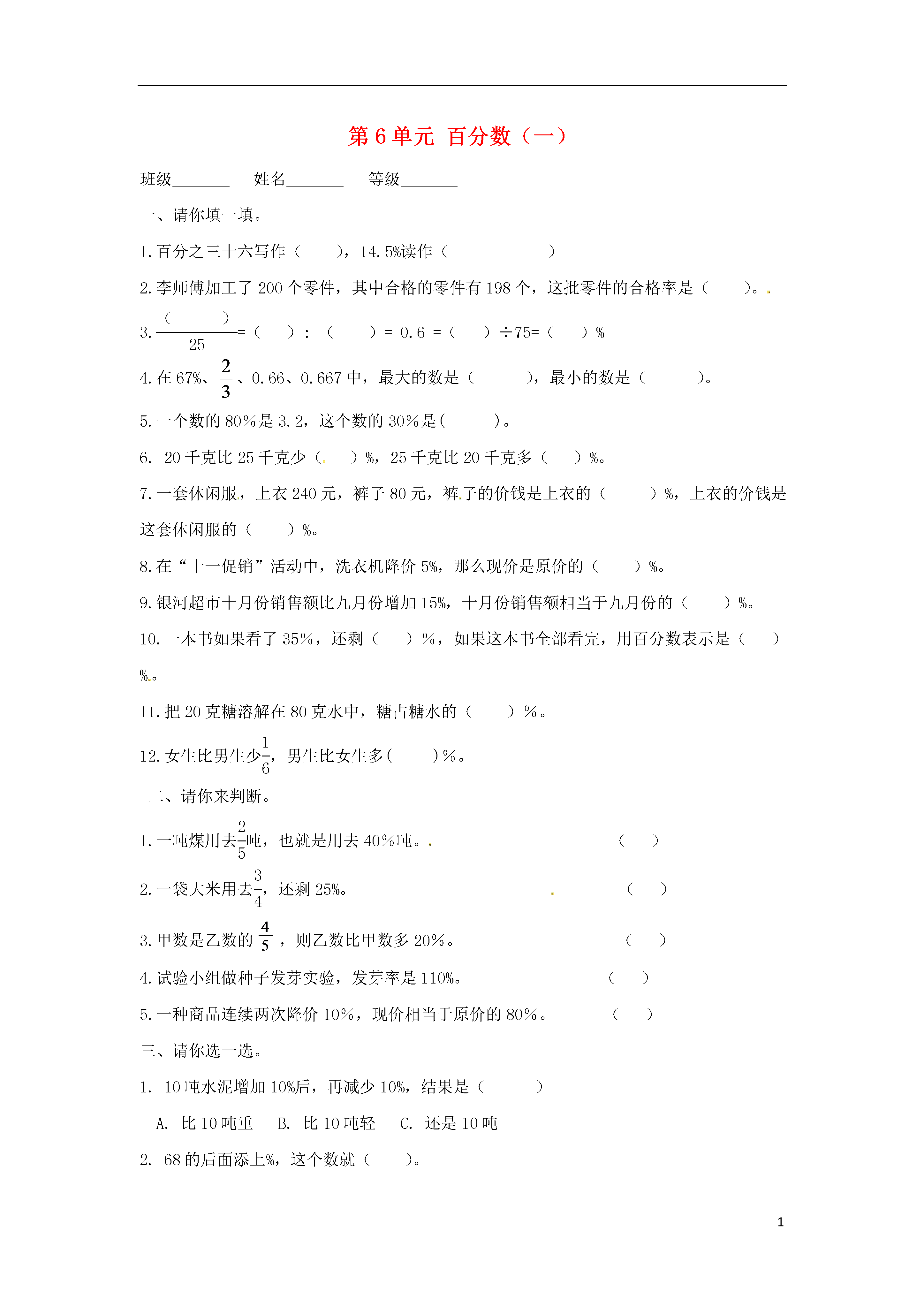 1第6单元百分数(一)班级姓名等级一、请你填一填。1.百分之三十六写作(),14.5%读作()2.李师傅加工了200个零件,其中合格的零件有198个,这批零件的合格率是()。3.EQ\F((),25)=():()=0.6=()÷75=()%4.在67%、、0.66、0.667中,最大的数是(),最小的数是()。5.一个数的80%是3.2,这个数的30%是()。6.20千克比25千克少()%,25千克比20千克多()%。7.一套休闲服,上衣240元,裤子80元,裤子的价钱是上衣的()%,上衣的价钱是这套休闲服的()%。8.在“十一促销”活动中,洗衣机降价5%,那么现价是原价的()%。9.银河超市十月份销售额比九月份增加15%,十月份销售额相当于九月份的()%。10.一本书如果看了35%,还剩()%,如果这本书全部看完,用百分数表示是()%。11.把20克糖溶解在80克水中,糖占糖水的()%。12.女生比男生少EQ\F(1,6),男生比女生多()%。二、请你来判断。1.一吨煤用去EQ\F(2,5)吨,也就是用去40%吨。()2.一袋大米用去EQ\F(3,4),还剩25%。()3.甲数是乙数的,则乙数比甲数多20%。()4.试验小组做种子发芽实验,发芽率是110%。()5.一种商品连续两次降价10%,现价相当于原价的80%。()三、请你选一选。1.10吨水泥增加10%后,再减少10%,结果是()A.比10吨重B.比10吨轻C.还是10吨2.68的后面添上%,这个数就()。A.扩大到原来的100倍B.缩小到原来的EQ\F(1,100)C.不变3.盐水的含盐率是10%,盐与水的比是()。A.1∶10B.1∶11C.1∶9一种树苗经试种后,成活率是95%,为了保证成活380棵,至少应种树苗()棵。A.300棵B.400棵C.450棵5.一瓶饮料,喝了它的70%,正好是140毫升,这瓶饮料原来有多少毫升?列式为()A.140÷70%B.140×70%C.140×(1-70%)把表格填完整。百分数5%70%小数1.2分数五、计算。直接写得数。50%+3.5=1-75%=2×60%=45÷90%=4.8×=+1.6=-=1.2÷0.3=÷=36÷=2.用你喜欢的方法计算。+×125×4×0.8×2.539×+5÷+5÷40%+2.8×40%+6.2×40%3.解方程。x-65%x=10.51.4+30%x=2.6六、解决实际问题。1.一份文件,妈妈已经打了1500字,正好占总字数60%,这份文件一共有多少字?2.希望小学共回收废纸2.5t,红星小学共回收废纸1.7t。(1)红星小学回收的废纸比希望小学少百分之几?(2)用废纸生产再生纸,利用率是80%,这些废纸能生产多少吨再生纸?3.一个足球比一个排球贵25%。买一个排球要48元,买一个足球要多少钱?4.果园里有桃树400棵,比梨树少100棵。桃树比梨树少百分之几?5.一种产品,原来每件的成本是80元,采用了新工艺后,每件成本降低了15%。现在每件产品的成本是多少元?6.如图,实验小学扩建草坪,扩建部分的面积是原面积的10%。5米(1)扩建后草坪的面积是多少?(2)扩建部分每平方米需投入300元,共需投入多少元?
