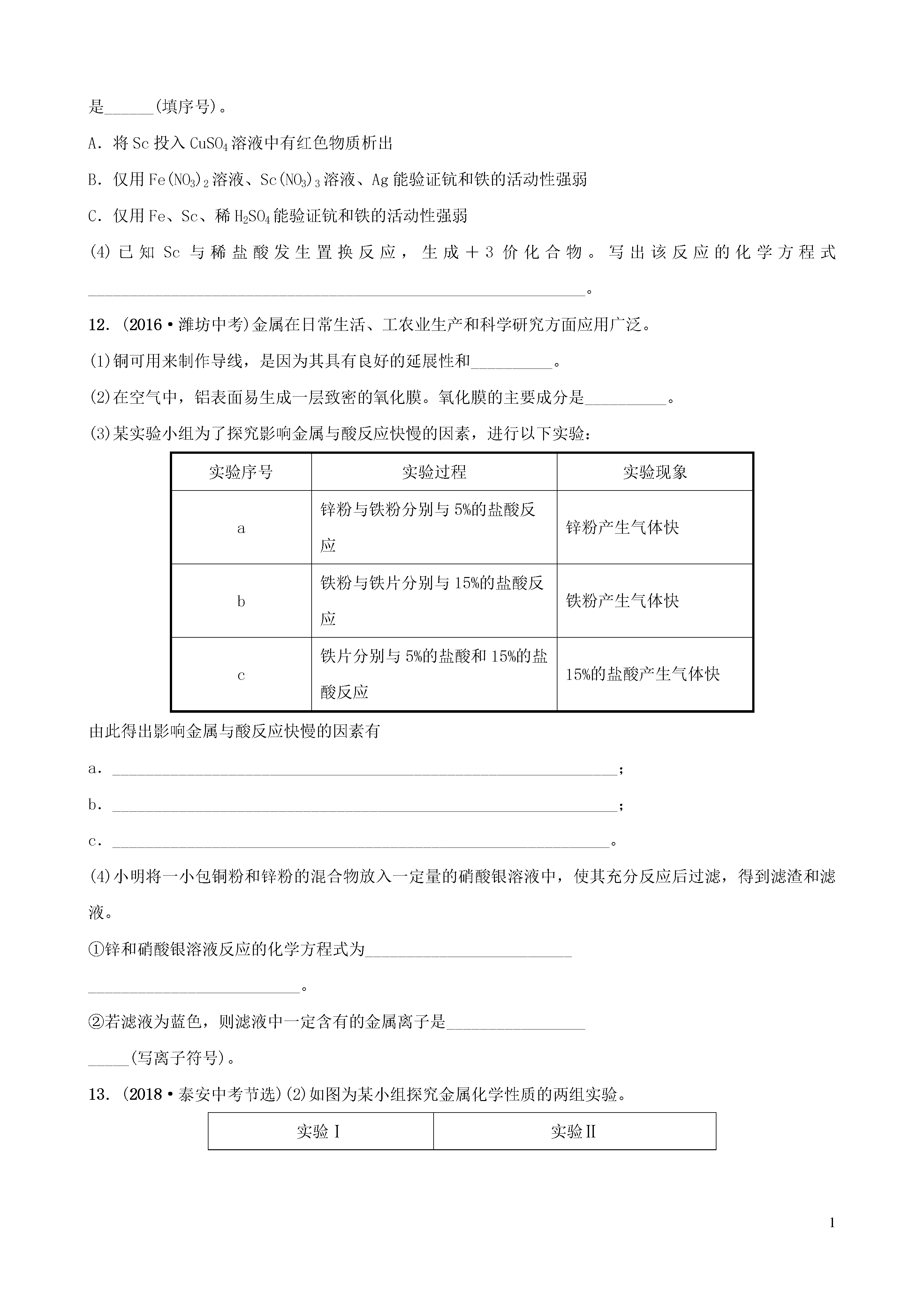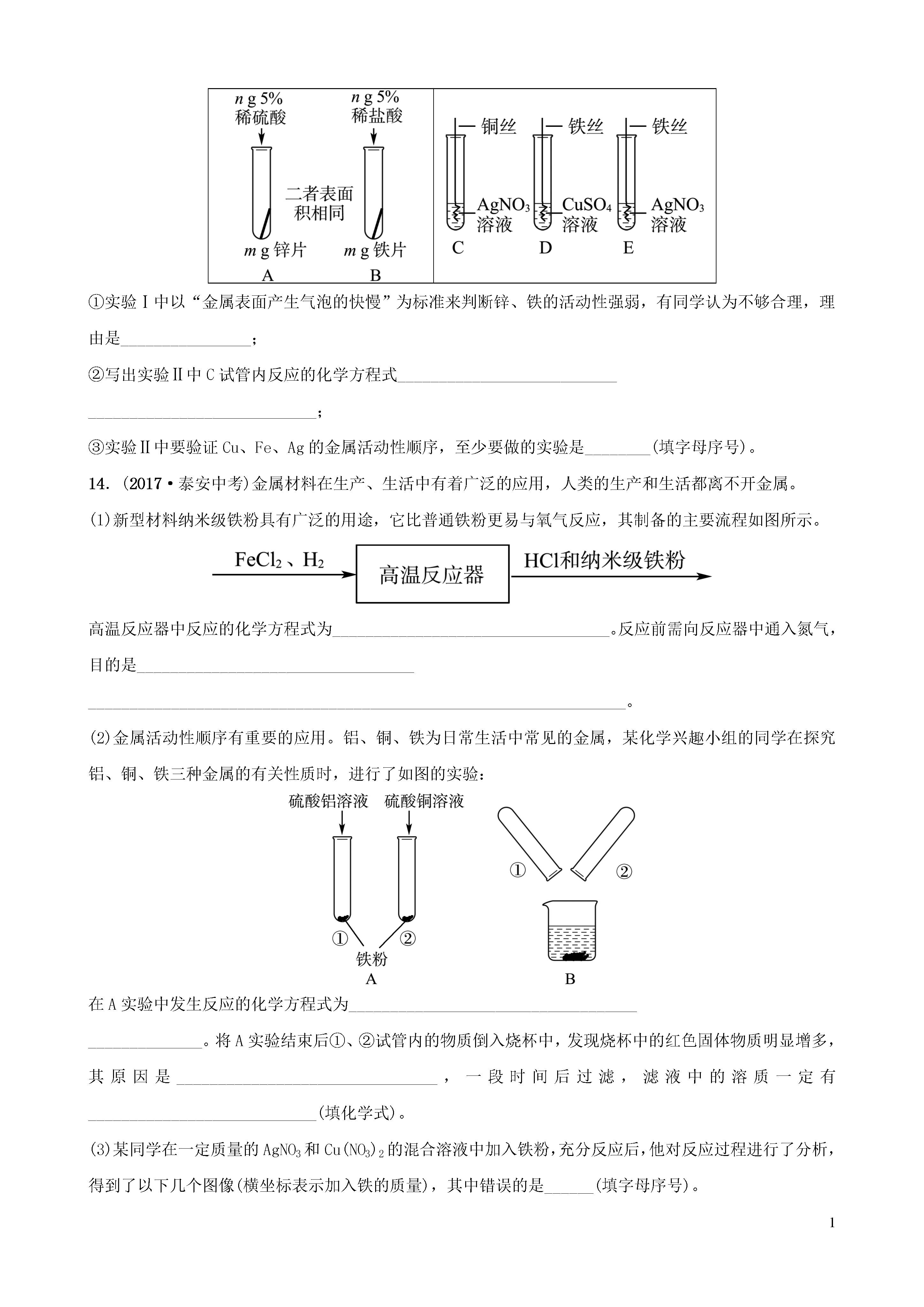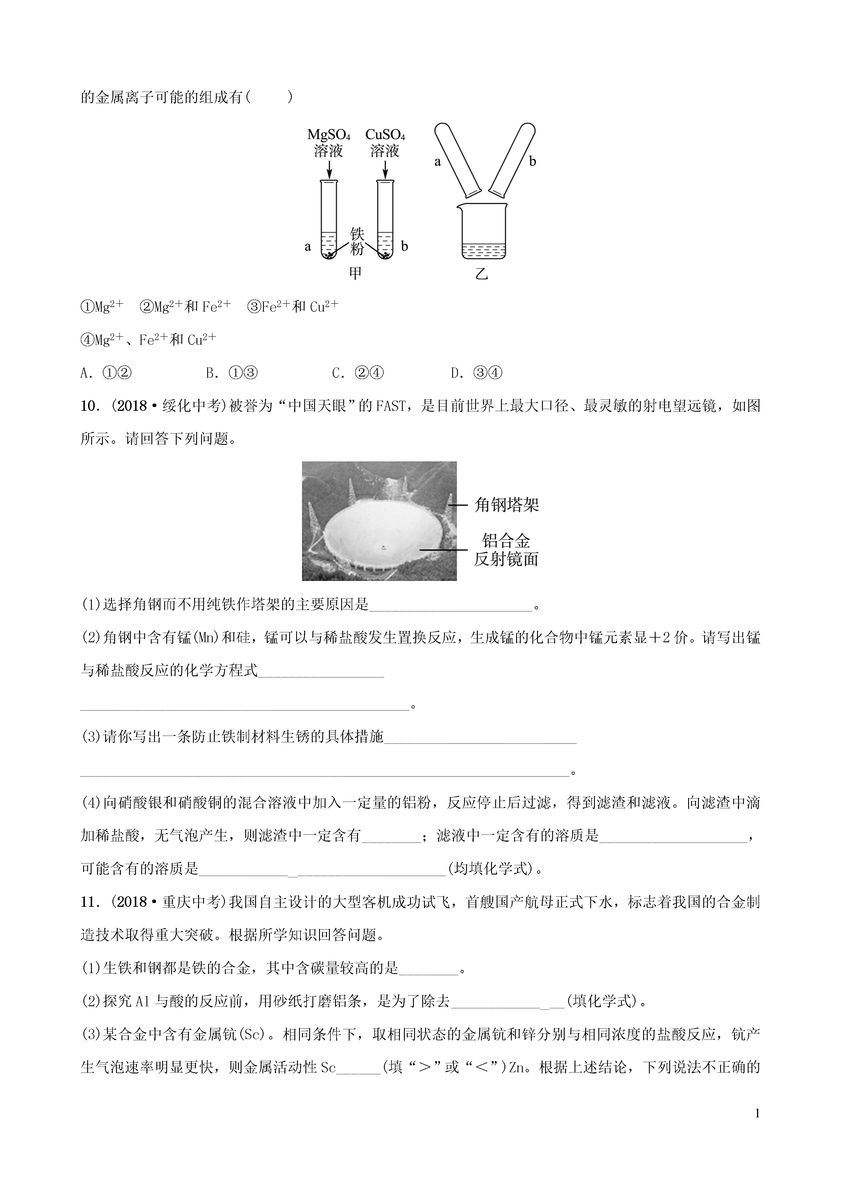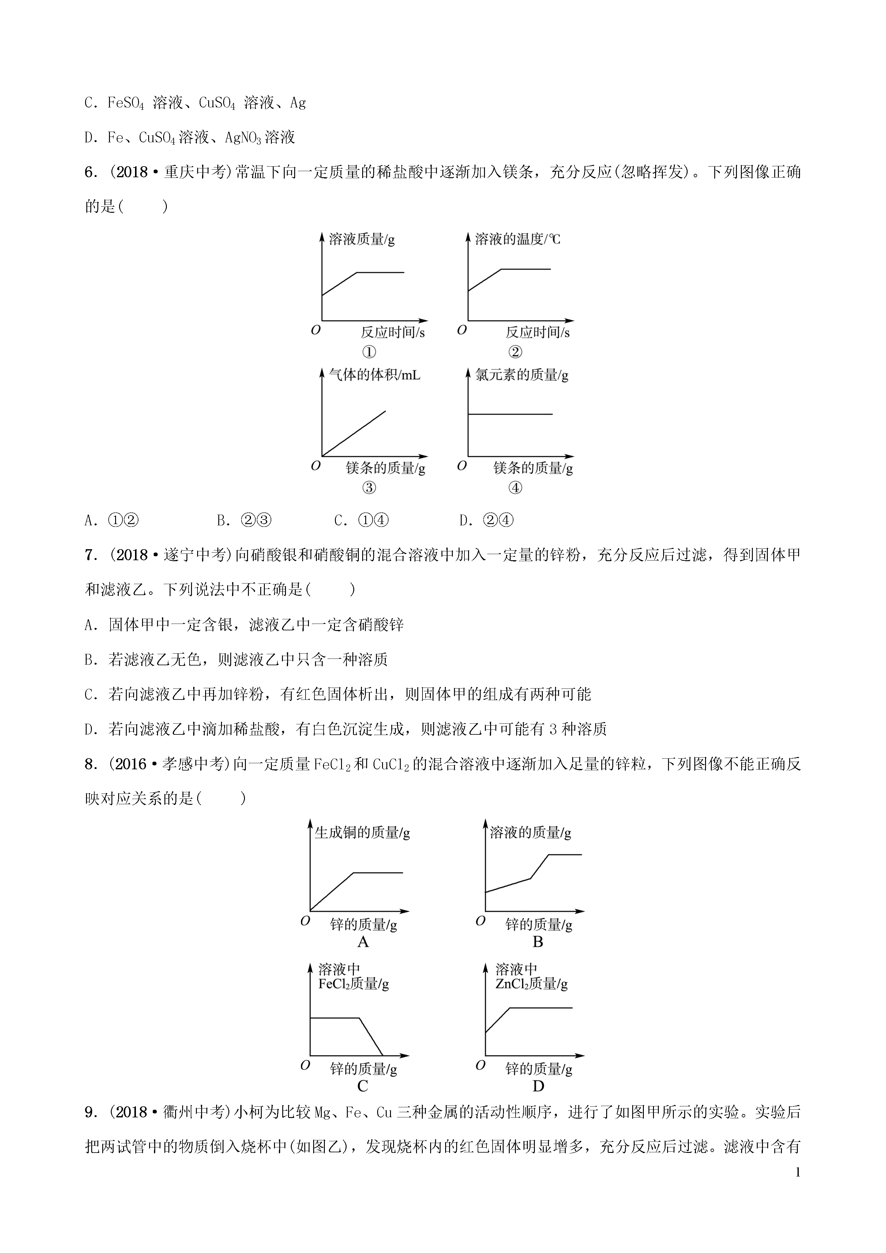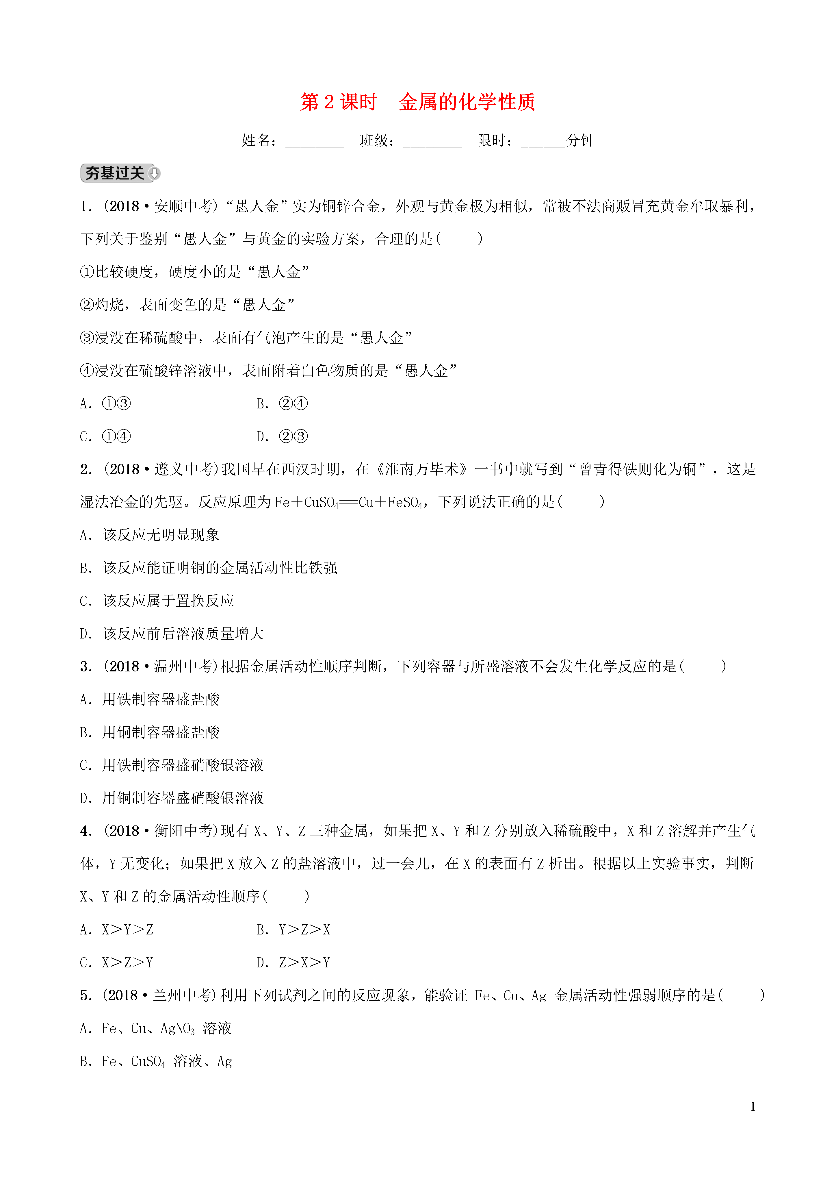1第2课时金属的化学性质姓名:________班级:________限时:______分钟1.(2018·安顺中考)“愚人金”实为铜锌合金,外观与黄金极为相似,常被不法商贩冒充黄金牟取暴利,下列关于鉴别“愚人金”与黄金的实验方案,合理的是()①比较硬度,硬度小的是“愚人金”②灼烧,表面变色的是“愚人金”③浸没在稀硫酸中,表面有气泡产生的是“愚人金”④浸没在硫酸锌溶液中,表面附着白色物质的是“愚人金”A.①③B.②④C.①④D.②③2.(2018·遵义中考)我国早在西汉时期,在《淮南万毕术》一书中就写到“曾青得铁则化为铜”,这是湿法冶金的先驱。反应原理为Fe+CuSO4===Cu+FeSO4,下列说法正确的是()A.该反应无明显现象B.该反应能证明铜的金属活动性比铁强C.该反应属于置换反应D.该反应前后溶液质量增大3.(2018·温州中考)根据金属活动性顺序判断,下列容器与所盛溶液不会发生化学反应的是()A.用铁制容器盛盐酸B.用铜制容器盛盐酸C.用铁制容器盛硝酸银溶液D.用铜制容器盛硝酸银溶液4.(2018·衡阳中考)现有X、Y、Z三种金属,如果把X、Y和Z分别放入稀硫酸中,X和Z溶解并产生气体,Y无变化;如果把X放入Z的盐溶液中,过一会儿,在X的表面有Z析出。根据以上实验事实,判断X、Y和Z的金属活动性顺序()A.X>Y>ZB.Y>Z>XC.X>Z>YD.Z>X>Y5.(2018·兰州中考)利用下列试剂之间的反应现象,能验证Fe、Cu、Ag金属活动性强弱顺序的是()A.Fe、Cu、AgNO3溶液B.Fe、CuSO4溶液、AgC.FeSO4溶液、CuSO4溶液、AgD.Fe、CuSO4溶液、AgNO3溶液6.(2018·重庆中考)常温下向一定质量的稀盐酸中逐渐加入镁条,充分反应(忽略挥发)。下列图像正确的是()A.①②B.②③C.①④D.②④7.(2018·遂宁中考)向硝酸银和硝酸铜的混合溶液中加入一定量的锌粉,充分反应后过滤,得到固体甲和滤液乙。下列说法中不正确是()A.固体甲中一定含银,滤液乙中一定含硝酸锌B.若滤液乙无色,则滤液乙中只含一种溶质C.若向滤液乙中再加锌粉,有红色固体析出,则固体甲的组成有两种可能D.若向滤液乙中滴加稀盐酸,有白色沉淀生成,则滤液乙中可能有3种溶质8.(2016·孝感中考)向一定质量FeCl2和CuCl2的混合溶液中逐渐加入足量的锌粒,下列图像不能正确反映对应关系的是()9.(2018·衢州中考)小柯为比较Mg、Fe、Cu三种金属的活动性顺序,进行了如图甲所示的实验。实验后把两试管中的物质倒入烧杯中(如图乙),发现烧杯内的红色固体明显增多,充分反应后过滤。滤液中含有的金属离子可能的组成有()①Mg2+②Mg2+和Fe2+③Fe2+和Cu2+④Mg2+、Fe2+和Cu2+A.①②B.①③C.②④D.③④10.(2018·绥化中考)被誉为“中国天眼”的FAST,是目前世界上最大口径、最灵敏的射电望远镜,如图所示。请回答下列问题。(1)选择角钢而不用纯铁作塔架的主要原因是______________________。(2)角钢中含有锰(Mn)和硅,锰可以与稀盐酸发生置换反应,生成锰的化合物中锰元素显+2价。请写出锰与稀盐酸反应的化学方程式______________________________________________________________。(3)请你写出一条防止铁制材料生锈的具体措施____________________________________________________________________________________________。(4)向硝酸银和硝酸铜的混合溶液中加入一定量的铝粉,反应停止后过滤,得到滤渣和滤液。向滤渣中滴加稀盐酸,无气泡产生,则滤渣中一定含有________;滤液中一定含有的溶质是____________________,可能含有的溶质是__________________________________(均填化学式)。11.(2018·重庆中考)我国自主设计的大型客机成功试飞,首艘国产航母正式下水,标志着我国的合金制造技术取得重大突破。根据所学知识回答问题。(1)生铁和钢都是铁的合金,其中含碳量较高的是________。(2)探究Al与酸的反应前,用砂纸打磨铝条,是为了除去________________(填化学式)。(3)某合金中含有金属钪(Sc)。相同条件下,取相同状态的金属钪和锌分别与相同浓度的盐酸反应,钪产生气泡速率明显更快,则金属活动性Sc______(填“>”或“<”)Zn。根据上述结论,下列说法
