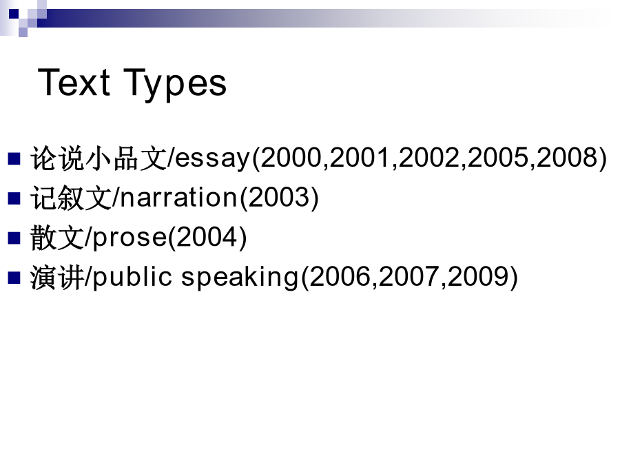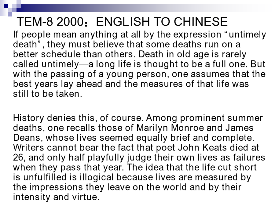 TEM-8andCATTI-3(1)TextTypesTEM-82000:ENGLISHTOCHINESEVersion1Version2TEM-82003:ENGLISHTOCHINESEVersion1Version2Exercise:CATTI-3English-Chinese