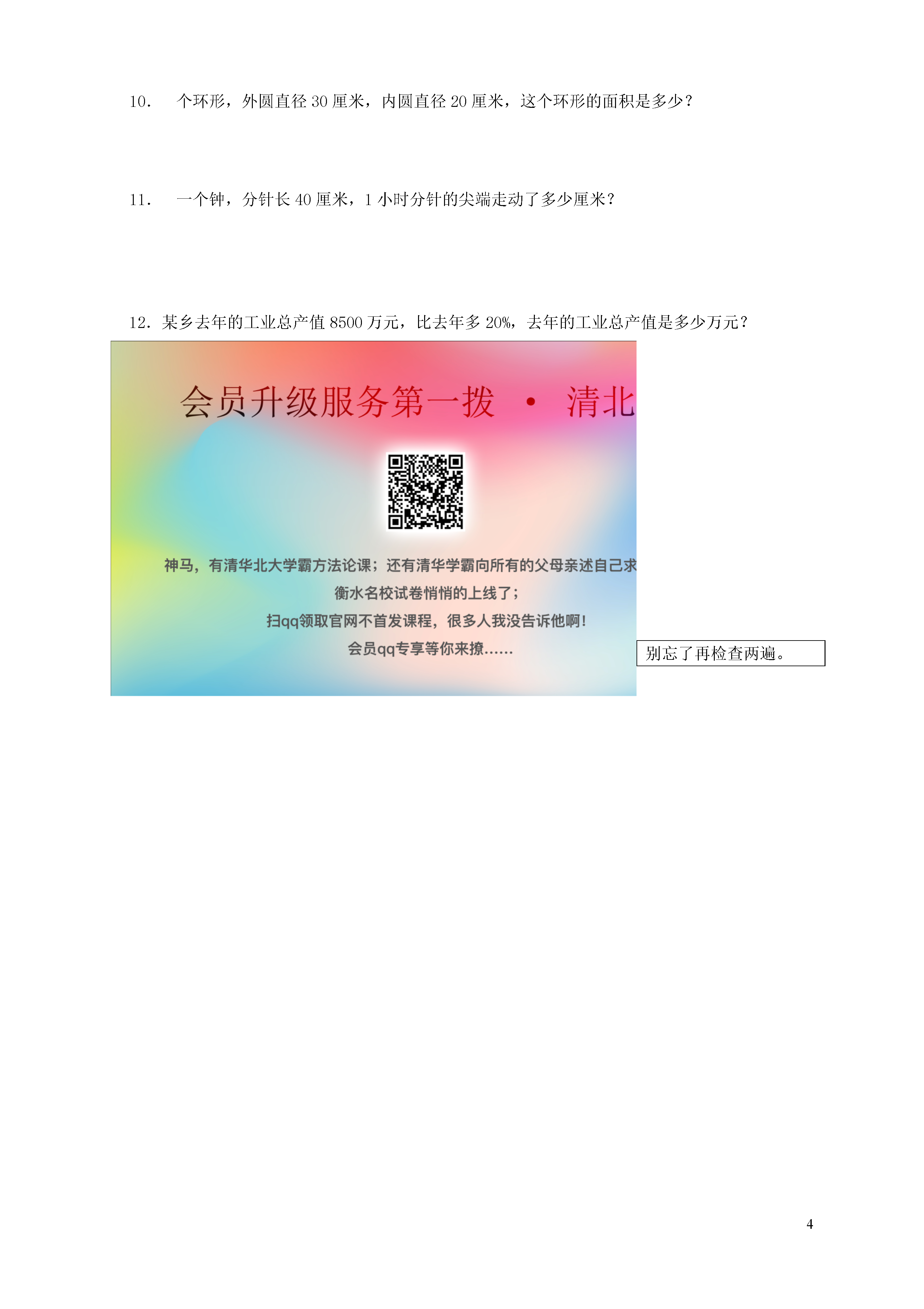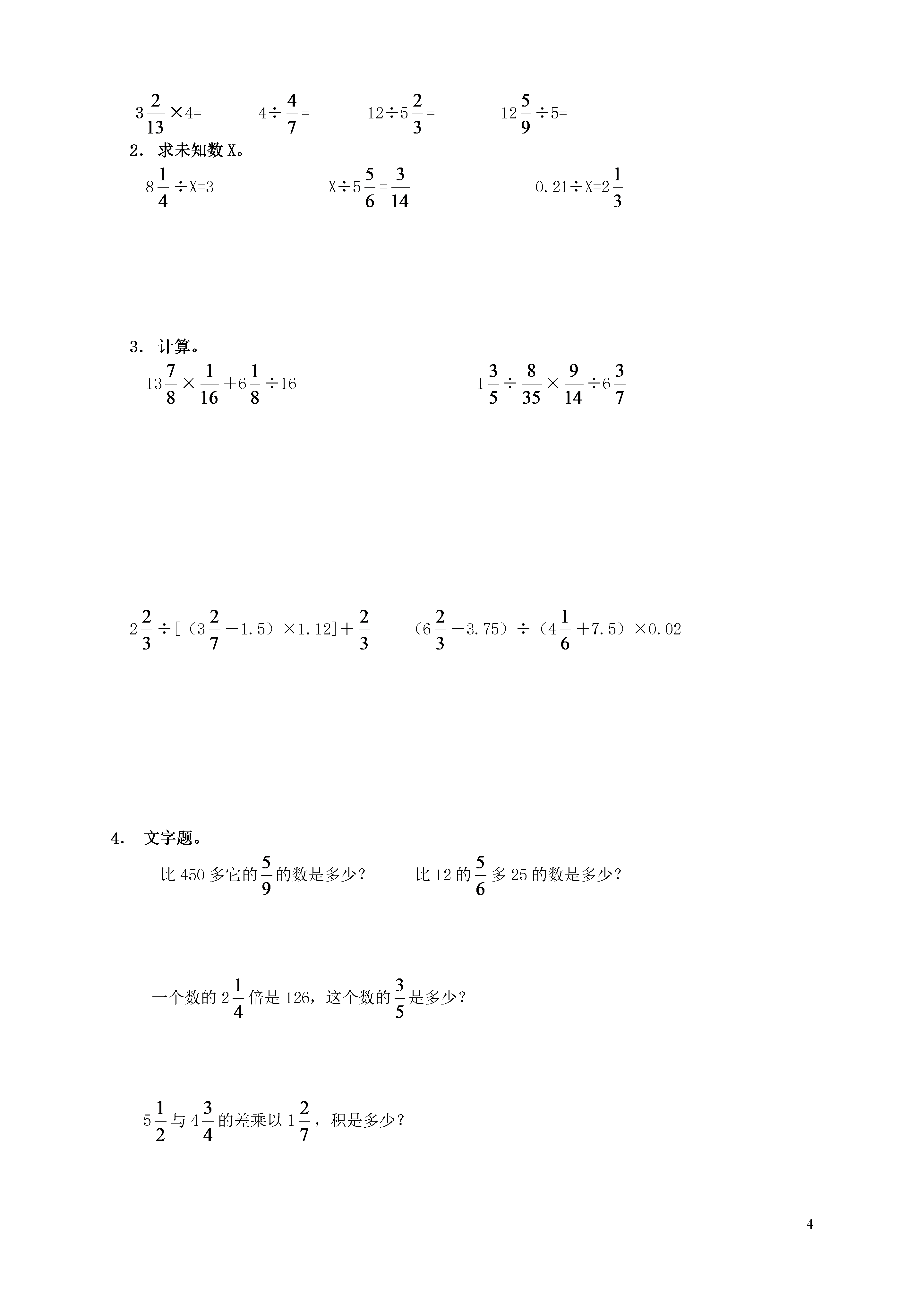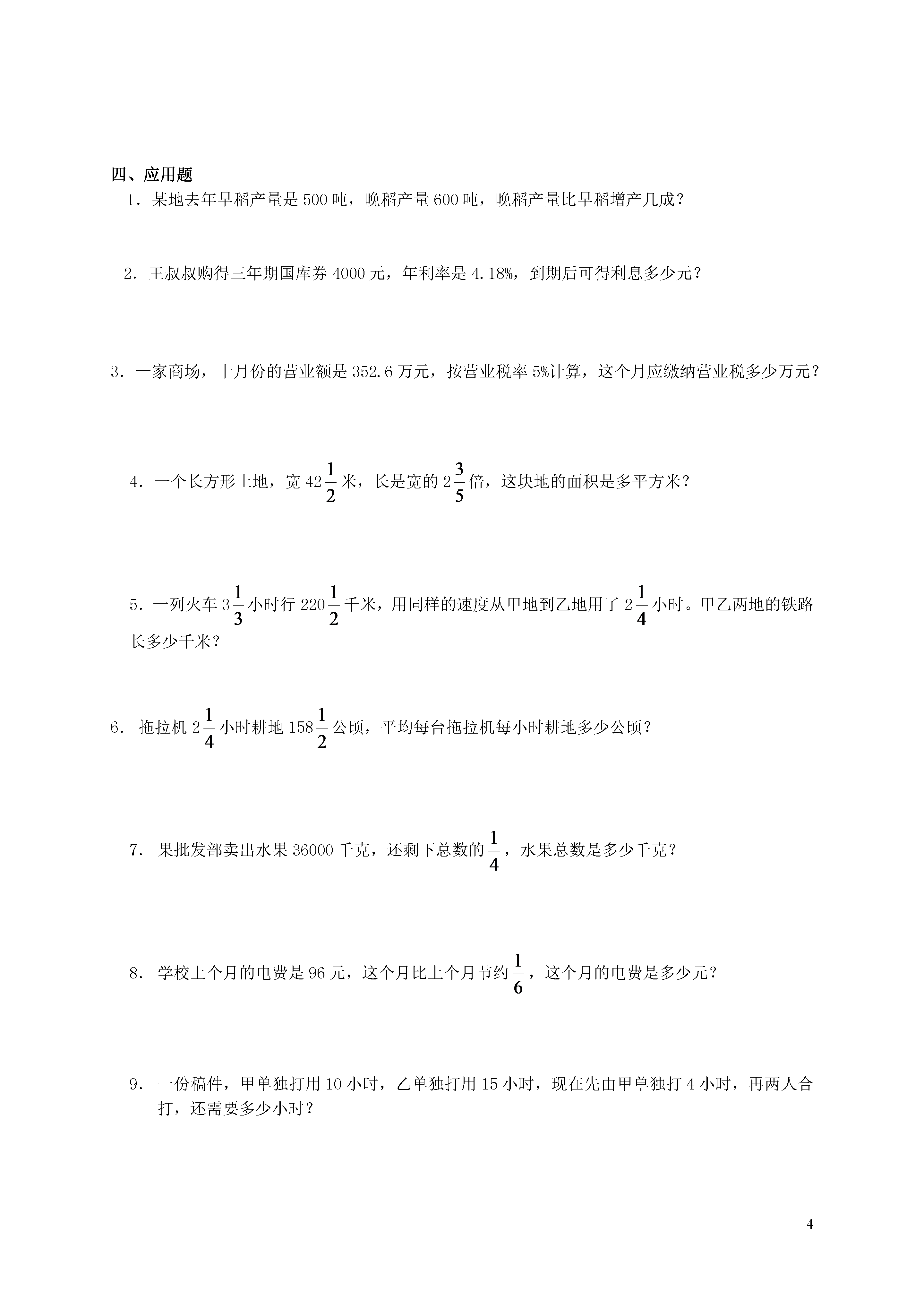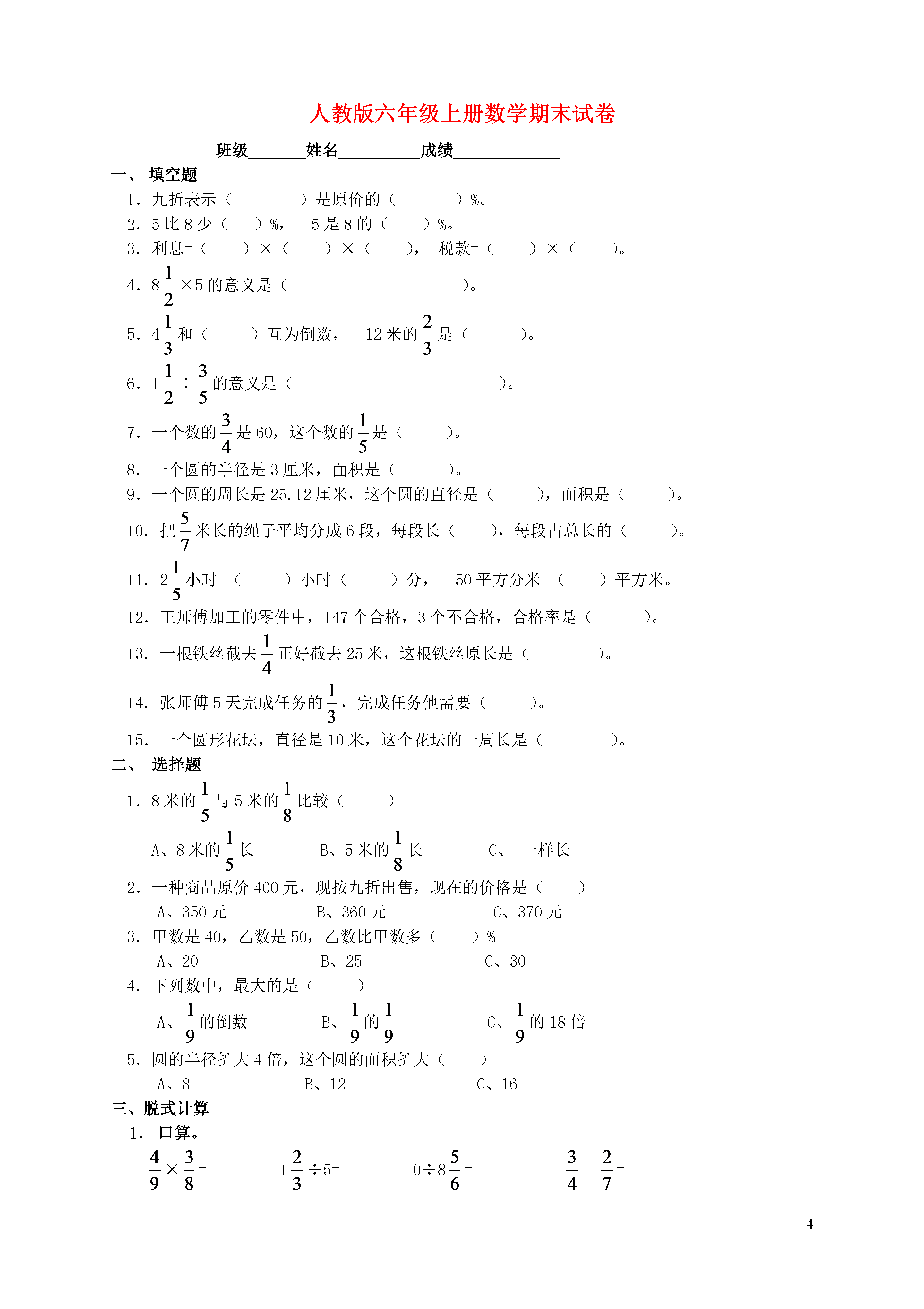 4人教版六年级上册数学期末试卷班级姓名成绩填空题1.九折表示()是原价的()%。2.5比8少()%,5是8的()%。3.利息=()×()×(),税款=()×()。4.8×5的意义是()。5.4和()互为倒数,12米的是()。6.1÷的意义是()。7.一个数的是60,这个数的是()。8.一个圆的半径是3厘米,面积是()。9.一个圆的周长是25.12厘米,这个圆的直径是(),面积是()。10.把米长的绳子平均分成6段,每段长(),每段占总长的()。11.2小时=()小时()分,50平方分米=()平方米。12.王师傅加工的零件中,147个合格,3个不合格,合格率是()。13.一根铁丝截去正好截去25米,这根铁丝原长是()。14.张师傅5天完成任务的,完成任务他需要()。15.一个圆形花坛,直径是10米,这个花坛的一周长是()。二、选择题1.8米的与5米的比较()A、8米的长B、5米的长C、一样长2.一种商品原价400元,现按九折出售,现在的价格是()A、350元B、360元C、370元3.甲数是40,乙数是50,乙数比甲数多()%A、20B、25C、304.下列数中,最大的是()A、的倒数B、的C、的18倍5.圆的半径扩大4倍,这个圆的面积扩大()A、8B、12C、16三、脱式计算口算。×=1÷5=0÷8=-=3×4=4÷=12÷5=12÷5=求未知数X。8÷X=3X÷5=0.21÷X=2计算。13×+6÷161÷×÷62÷[(3-1.5)×1.12]+(6-3.75)÷(4+7.5)×0.02文字题。比450多它的的数是多少?比12的多25的数是多少?一个数的2倍是126,这个数的是多少?5与4的差乘以1,积是多少?四、应用题1.某地去年早稻产量是500吨,晚稻产量600吨,晚稻产量比早稻增产几成?2.王叔叔购得三年期国库券4000元,年利率是4.18%,到期后可得利息多少元?3.一家商场,十月份的营业额是352.6万元,按营业税率5%计算,这个月应缴纳营业税多少万元?4.一个长方形土地,宽42米,长是宽的2倍,这块地的面积是多平方米?5.一列火车3小时行220千米,用同样的速度从甲地到乙地用了2小时。甲乙两地的铁路长多少千米?拖拉机2小时耕地158公顷,平均每台拖拉机每小时耕地多少公顷?果批发部卖出水果36000千克,还剩下总数的,水果总数是多少千克?学校上个月的电费是96元,这个月比上个月节约,这个月的电费是多少元?一份稿件,甲单独打用10小时,乙单独打用15小时,现在先由甲单独打4小时,再两人合打,还需要多少小时?个环形,外圆直径30厘米,内圆直径20厘米,这个环形的面积是多少?一个钟,分针长40厘米,1小时分针的尖端走动了多少厘米?别忘了再检查两遍。12.某乡去年的工业总产值8500万元,比去年多20%,去年的工业总产值是多少万元?
