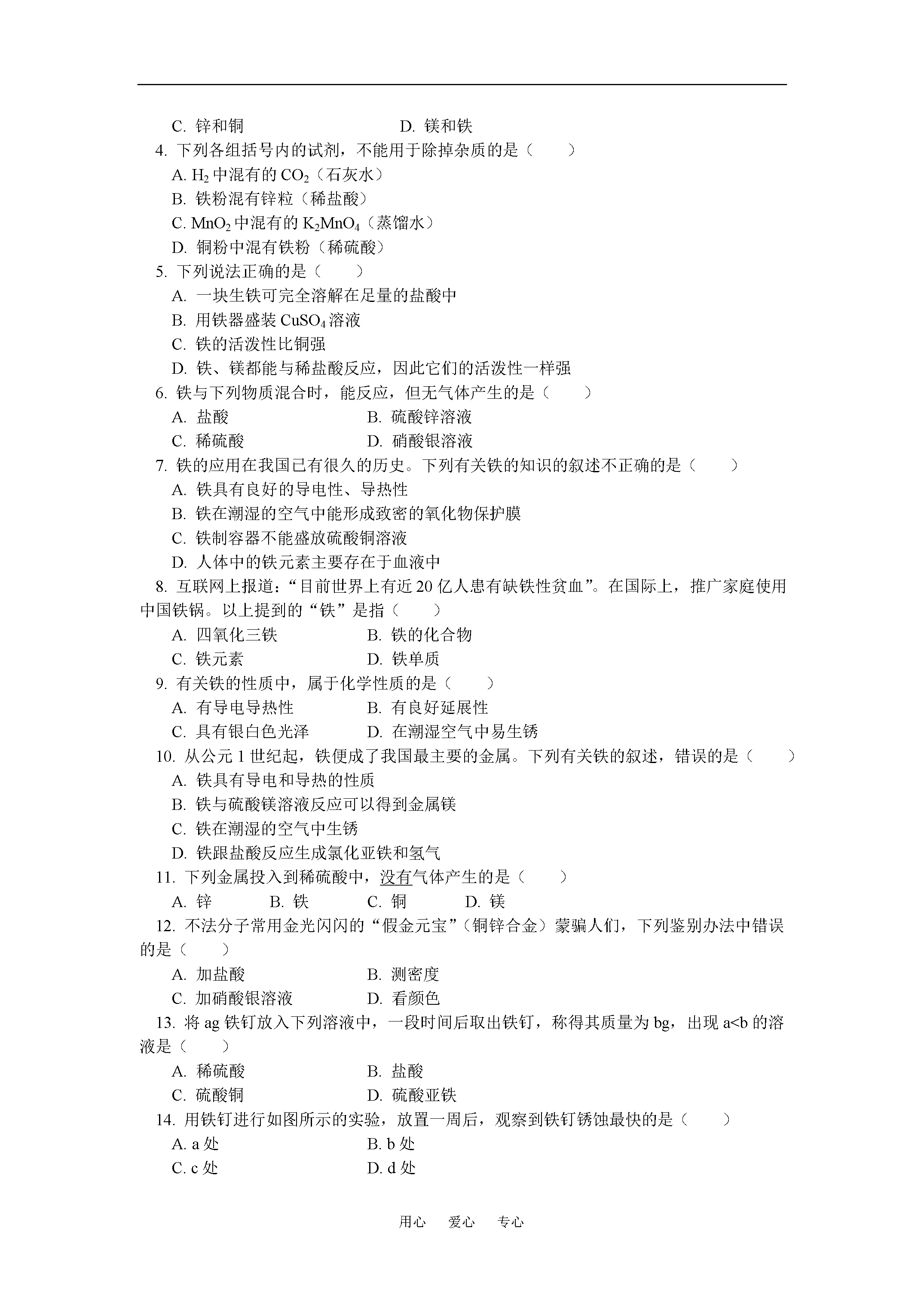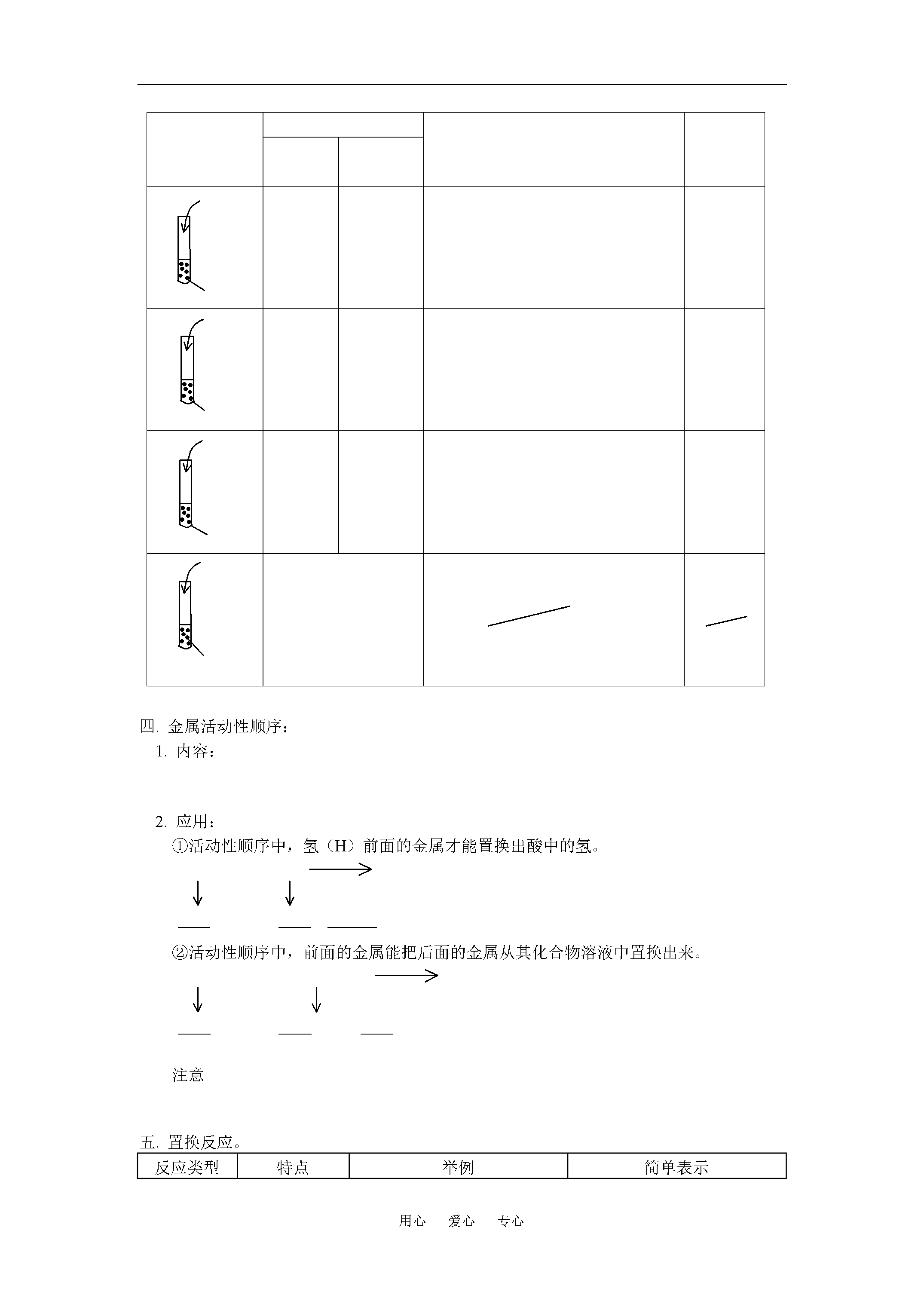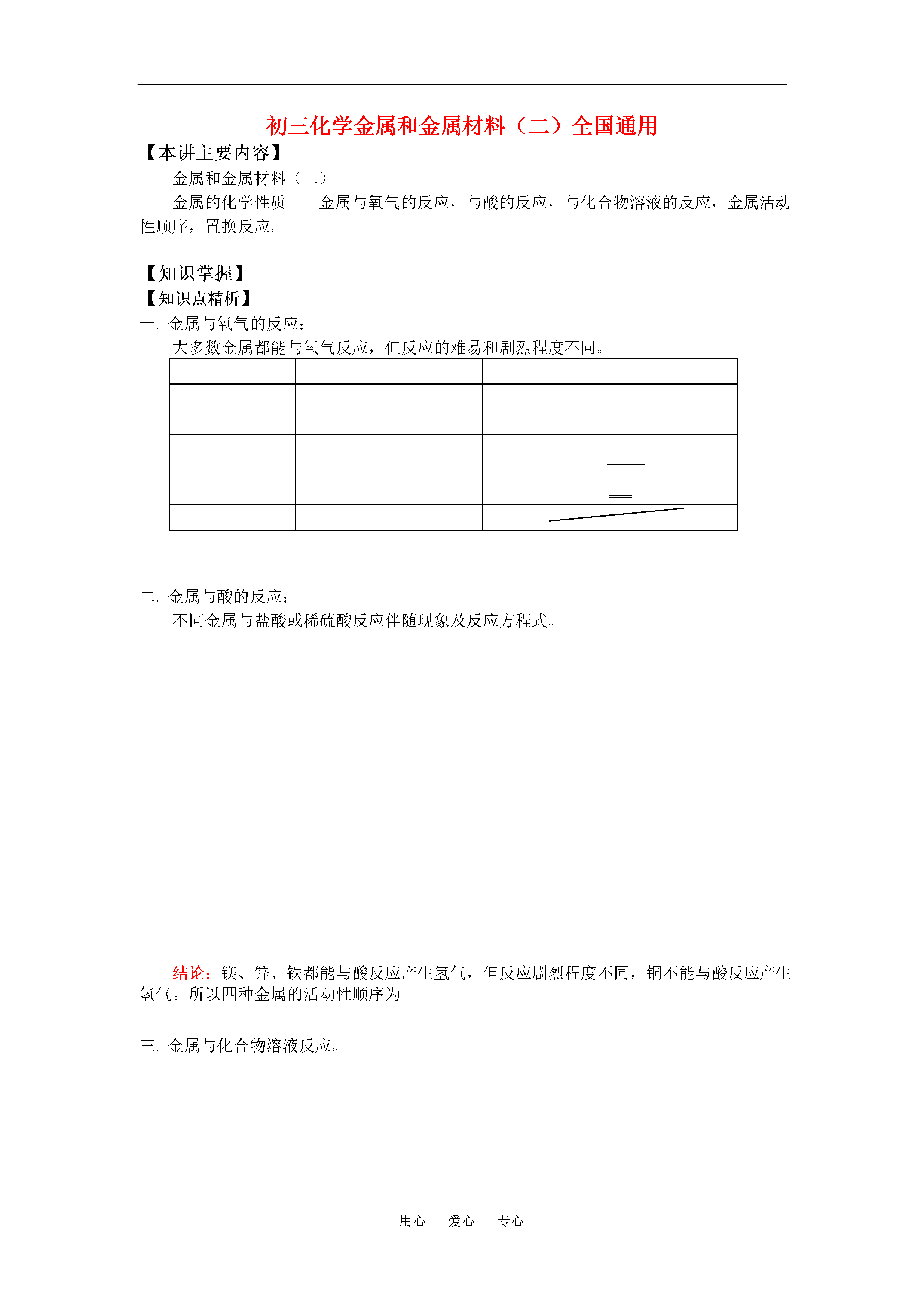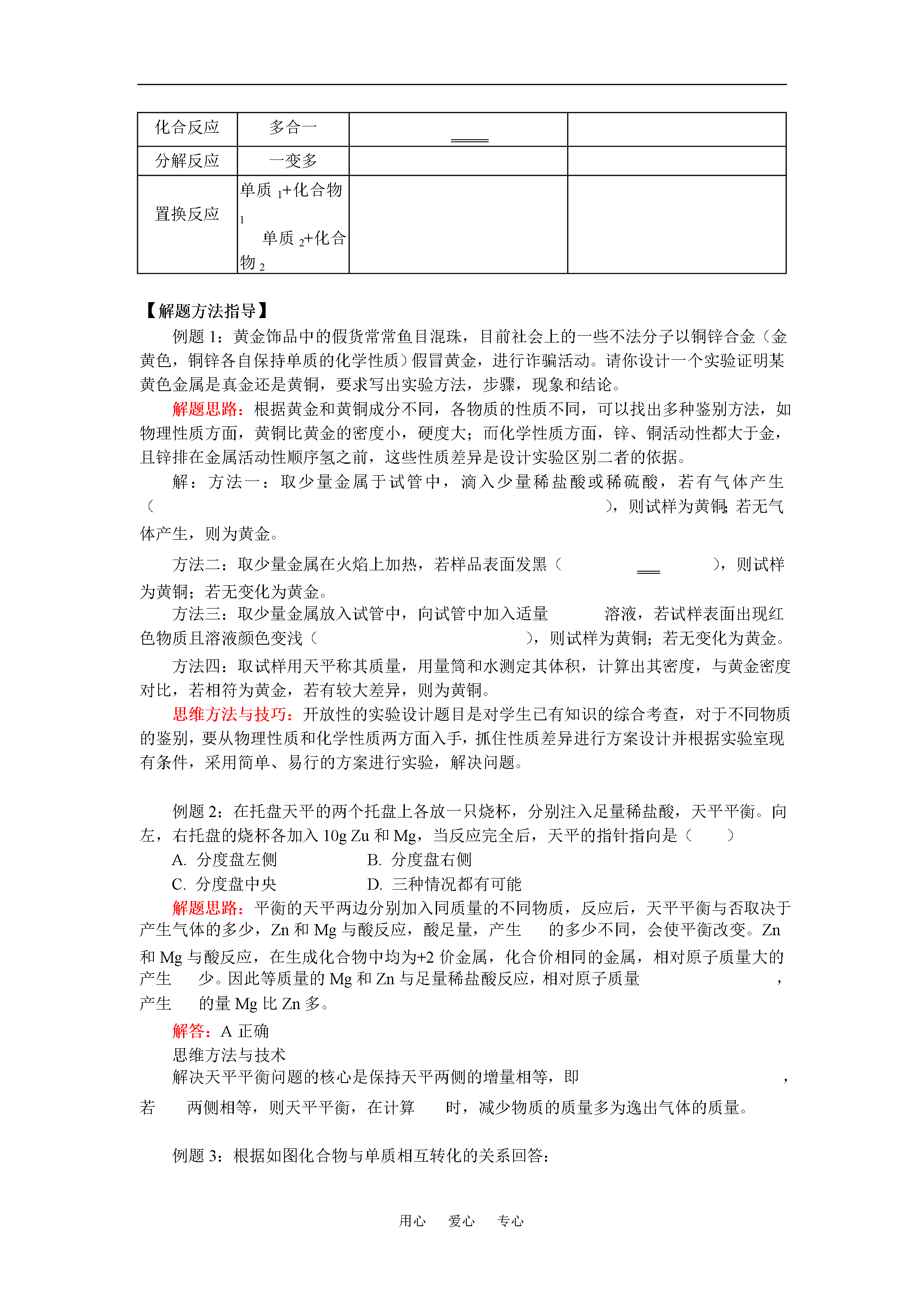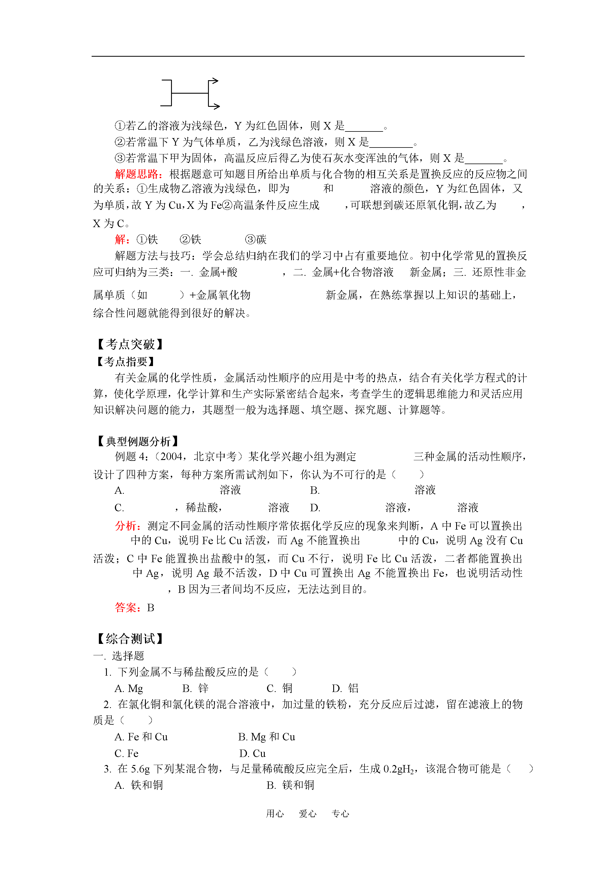 用心爱心专心初三化学金属和金属材料(二)全国通用【本讲主要内容】金属和金属材料(二)金属的化学性质——金属与氧气的反应,与酸的反应,与化合物溶液的反应,金属活动性顺序,置换反应。【知识掌握】【知识点精析】一.金属与氧气的反应:大多数金属都能与氧气反应,但反应的难易和剧烈程度不同。二.金属与酸的反应:不同金属与盐酸或稀硫酸反应伴随现象及反应方程式。结论:镁、锌、铁都能与酸反应产生氢气,但反应剧烈程度不同,铜不能与酸反应产生氢气。所以四种金属的活动性顺序为三.金属与化合物溶液反应。四.金属活动性顺序:1.内容:2.应用:①活动性顺序中,氢(H)前面的金属才能置换出酸中的氢。②活动性顺序中,前面的金属能把后面的金属从其化合物溶液中置换出来。注意五.置换反应。反应类型特点举例简单表示化合反应多合一分解反应一变多置换反应单质1+化合物1单质2+化合物2【解题方法指导】例题1:黄金饰品中的假货常常鱼目混珠,目前社会上的一些不法分子以铜锌合金(金黄色,铜锌各自保持单质的化学性质)假冒黄金,进行诈骗活动。请你设计一个实验证明某黄色金属是真金还是黄铜,要求写出实验方法,步骤,现象和结论。解题思路:根据黄金和黄铜成分不同,各物质的性质不同,可以找出多种鉴别方法,如物理性质方面,黄铜比黄金的密度小,硬度大;而化学性质方面,锌、铜活动性都大于金,且锌排在金属活动性顺序氢之前,这些性质差异是设计实验区别二者的依据。解:方法一:取少量金属于试管中,滴入少量稀盐酸或稀硫酸,若有气体产生(),则试样为黄铜;若无气体产生,则为黄金。方法二:取少量金属在火焰上加热,若样品表面发黑(),则试样为黄铜;若无变化为黄金。方法三:取少量金属放入试管中,向试管中加入适量溶液,若试样表面出现红色物质且溶液颜色变浅(),则试样为黄铜;若无变化为黄金。方法四:取试样用天平称其质量,用量筒和水测定其体积,计算出其密度,与黄金密度对比,若相符为黄金,若有较大差异,则为黄铜。思维方法与技巧:开放性的实验设计题目是对学生已有知识的综合考查,对于不同物质的鉴别,要从物理性质和化学性质两方面入手,抓住性质差异进行方案设计并根据实验室现有条件,采用简单、易行的方案进行实验,解决问题。例题2:在托盘天平的两个托盘上各放一只烧杯,分别注入足量稀盐酸,天平平衡。向左,右托盘的烧杯各加入10gZu和Mg,当反应完全后,天平的指针指向是()A.分度盘左侧B.分度盘右侧C.分度盘中央D.三种情况都有可能解题思路:平衡的天平两边分别加入同质量的不同物质,反应后,天平平衡与否取决于产生气体的多少,Zn和Mg与酸反应,酸足量,产生的多少不同,会使平衡改变。Zn和Mg与酸反应,在生成化合物中均为+2价金属,化合价相同的金属,相对原子质量大的产生少。因此等质量的Mg和Zn与足量稀盐酸反应,相对原子质量,产生的量Mg比Zn多。解答:A正确思维方法与技术解决天平平衡问题的核心是保持天平两侧的增量相等,即,若两侧相等,则天平平衡,在计算时,减少物质的质量多为逸出气体的质量。例题3:根据如图化合物与单质相互转化的关系回答:①若乙的溶液为浅绿色,Y为红色固体,则X是_______。②若常温下Y为气体单质,乙为浅绿色溶液,则X是________。③若常温下甲为固体,高温反应后得乙为使石灰水变浑浊的气体,则X是_______。解题思路:根据题意可知题目所给出单质与化合物的相互关系是置换反应的反应物之间的关系:①生成物乙溶液为浅绿色,即为和溶液的颜色,Y为红色固体,又为单质,故Y为Cu,X为Fe②高温条件反应生成,可联想到碳还原氧化铜,故乙为,X为C。解:①铁②铁③碳解题方法与技巧:学会总结归纳在我们的学习中占有重要地位。初中化学常见的置换反应可归纳为三类:一.金属+酸,二.金属+化合物溶液新金属;三.还原性非金属单质(如)+金属氧化物新金属,在熟练掌握以上知识的基础上,综合性问题就能得到很好的解决。【考点突破】【考点指要】有关金属的化学性质,金属活动性顺序的应用是中考的热点,结合有关化学方程式的计算,使化学原理,化学计算和生产实际紧密结合起来,考查学生的逻辑思维能力和灵活应用知识解决问题的能力,其题型一般为选择题、填空题、探究题、计算题等。【典型例题分析】例题4:(2004,北京中考)某化学兴趣小组为测定三种金属的活动性顺序,设计了四种方案,每种方案所需试剂如下,你认为不可行的是()A.溶液B.溶液C.,稀盐酸,溶液D.溶液,溶液分析:测定不同金属的活动性顺序常依据化学反应的现象来判断,A中Fe可以置换出中的Cu,说明Fe比Cu活泼,而Ag不能置换出中的Cu,说明Ag没有Cu活泼;C中Fe能置换出盐酸中的氢,而Cu不行,说明Fe比Cu活泼,二者都能置换出中Ag,说明Ag最不活泼,D中Cu可置换出Ag不能置换出Fe,也说明活动性