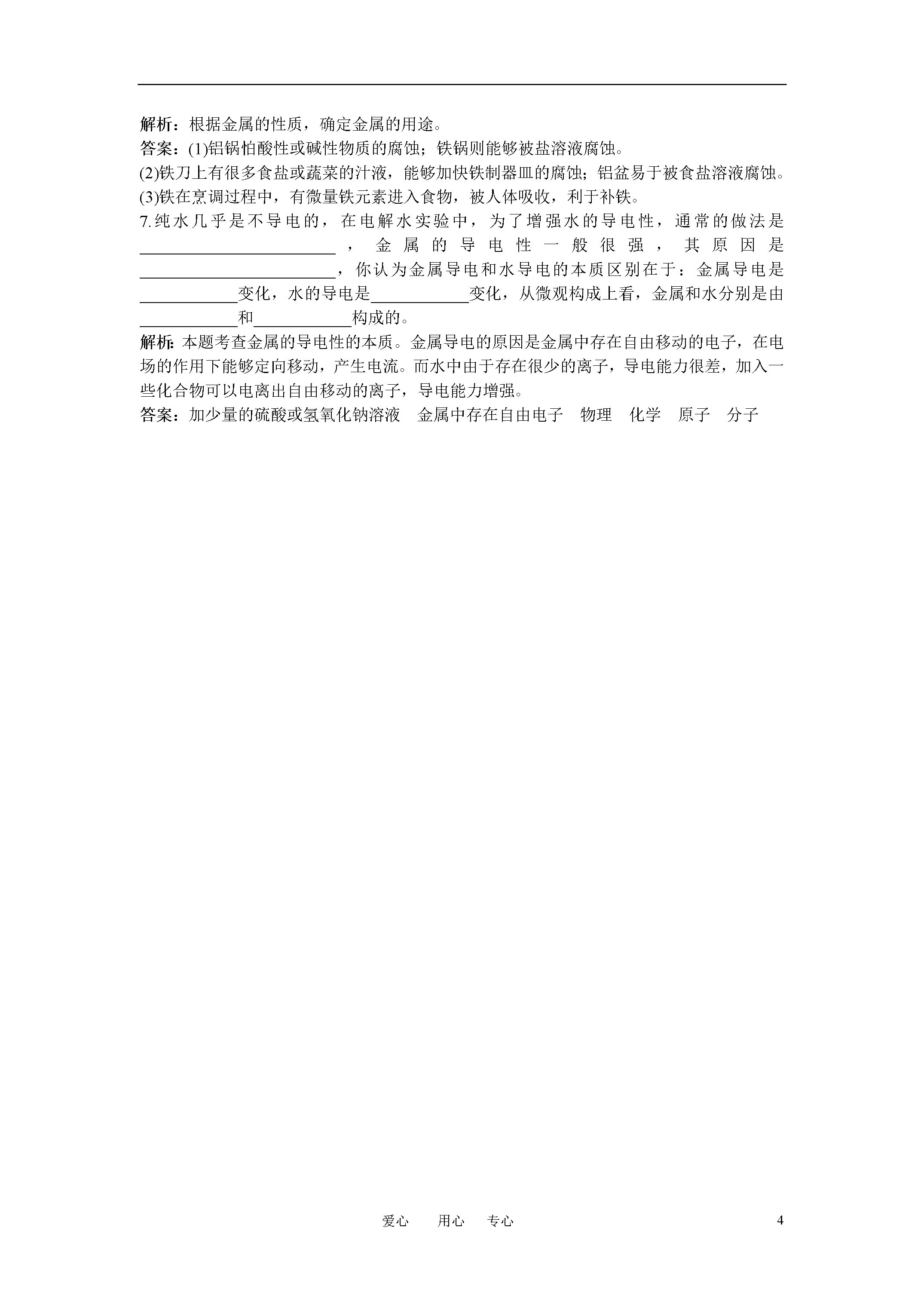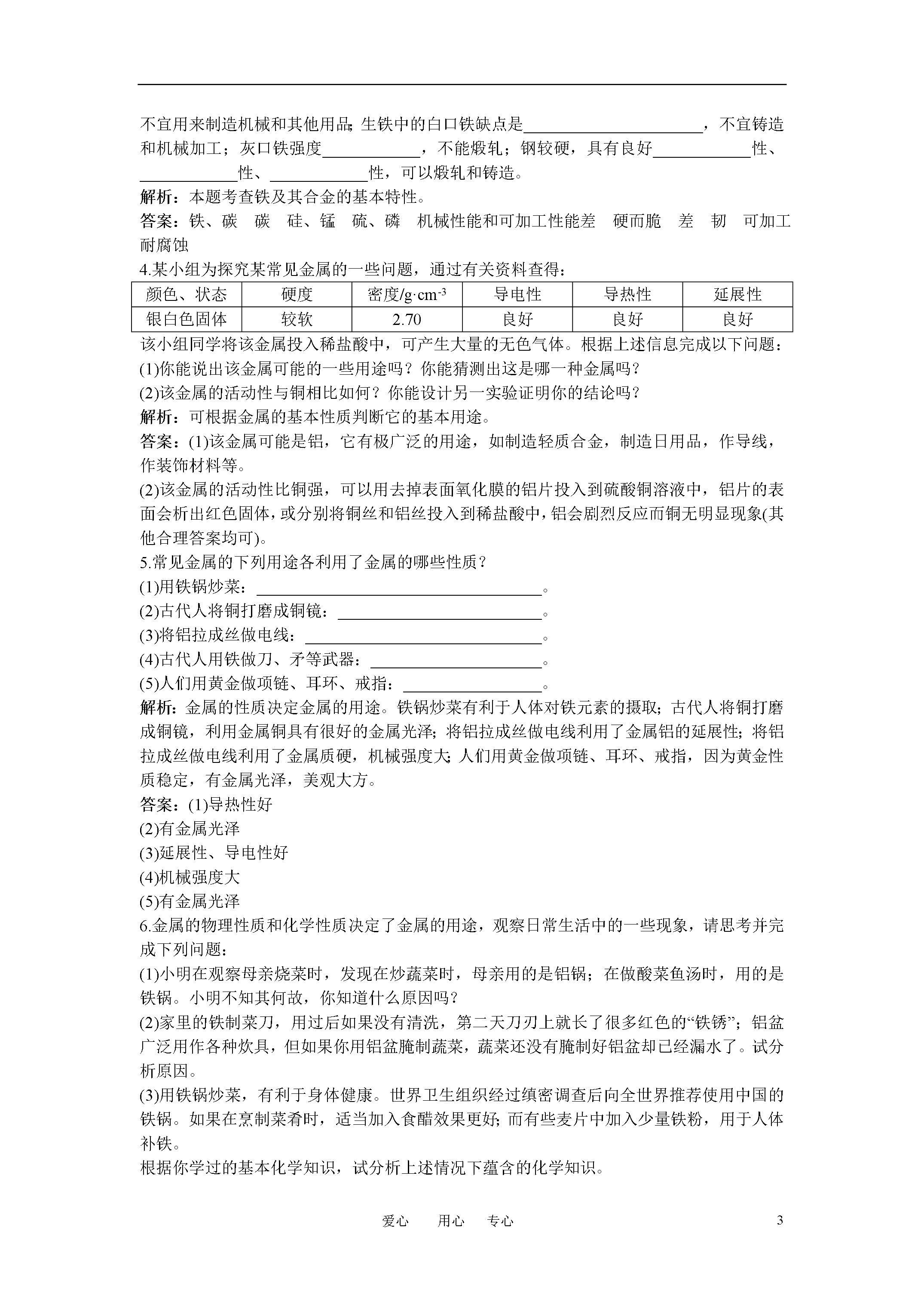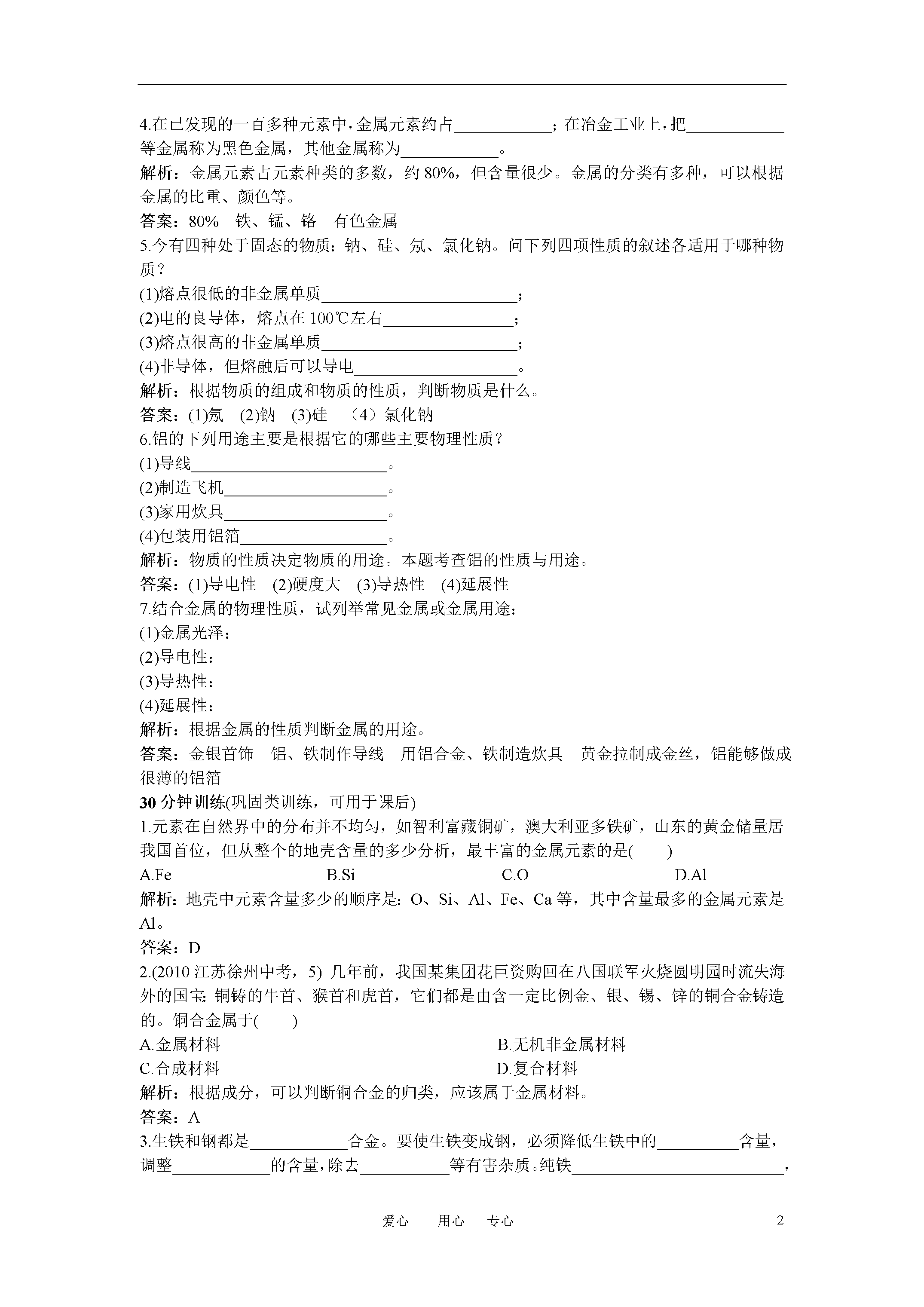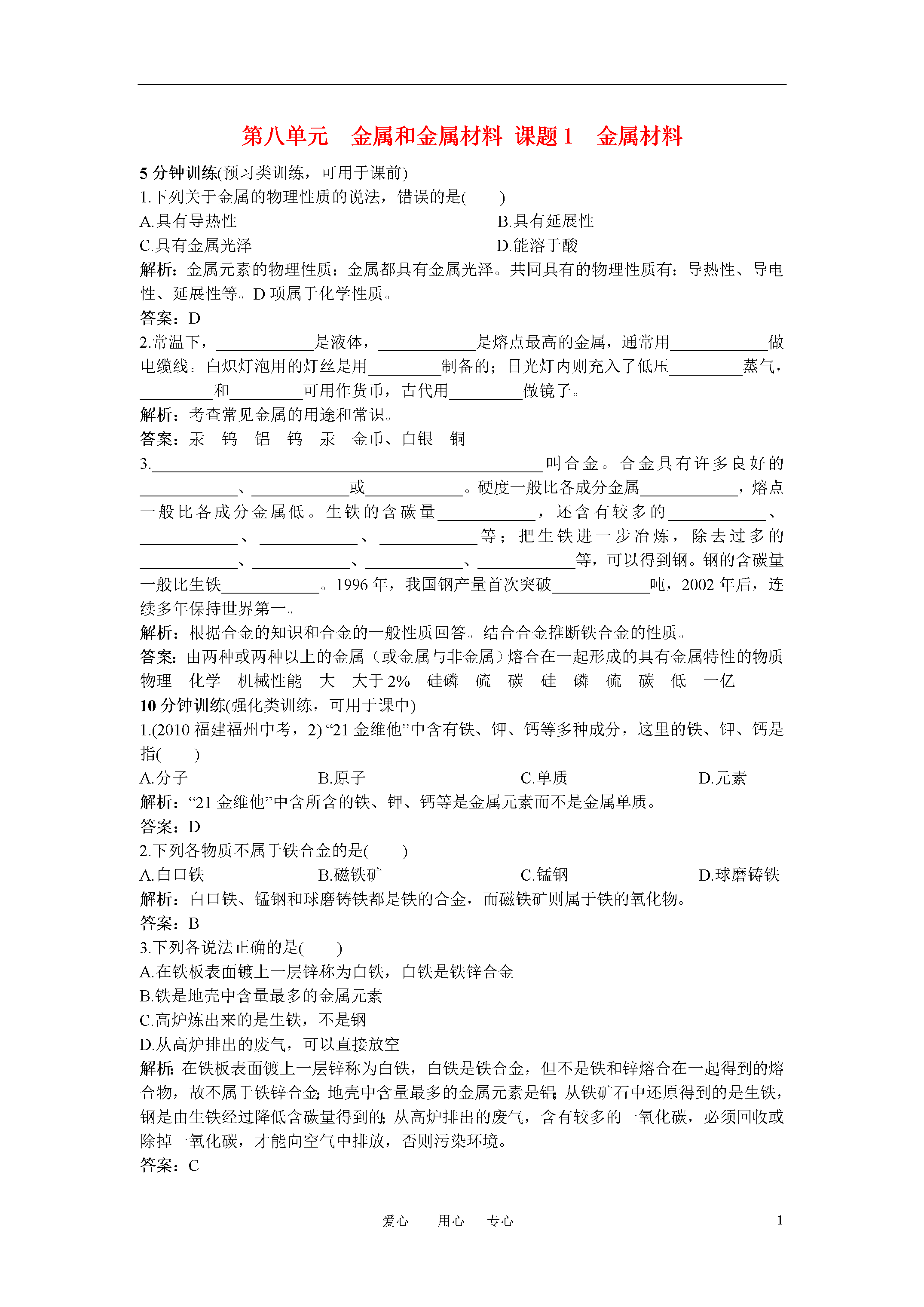4爱心用心专心第八单元金属和金属材料课题1金属材料5分钟训练(预习类训练,可用于课前)1.下列关于金属的物理性质的说法,错误的是()A.具有导热性B.具有延展性C.具有金属光泽D.能溶于酸解析:金属元素的物理性质:金属都具有金属光泽。共同具有的物理性质有:导热性、导电性、延展性等。D项属于化学性质。答案:D2.常温下,____________是液体,____________是熔点最高的金属,通常用____________做电缆线。白炽灯泡用的灯丝是用_________制备的;日光灯内则充入了低压_________蒸气,_________和_________可用作货币,古代用_________做镜子。解析:考查常见金属的用途和常识。答案:汞钨铝钨汞金币、白银铜3.________________________________________________叫合金。合金具有许多良好的____________、____________或____________。硬度一般比各成分金属____________,熔点一般比各成分金属低。生铁的含碳量____________,还含有较多的____________、____________、____________、____________等;把生铁进一步冶炼,除去过多的____________、____________、____________、____________等,可以得到钢。钢的含碳量一般比生铁____________。1996年,我国钢产量首次突破____________吨,2002年后,连续多年保持世界第一。解析:根据合金的知识和合金的一般性质回答。结合合金推断铁合金的性质。答案:由两种或两种以上的金属(或金属与非金属)熔合在一起形成的具有金属特性的物质物理化学机械性能大大于2%硅磷硫碳硅磷硫碳低一亿10分钟训练(强化类训练,可用于课中)1.(2010福建福州中考,2)“21金维他”中含有铁、钾、钙等多种成分,这里的铁、钾、钙是指()A.分子B.原子C.单质D.元素解析:“21金维他”中含所含的铁、钾、钙等是金属元素而不是金属单质。答案:D2.下列各物质不属于铁合金的是()A.白口铁B.磁铁矿C.锰钢D.球磨铸铁解析:白口铁、锰钢和球磨铸铁都是铁的合金,而磁铁矿则属于铁的氧化物。答案:B3.下列各说法正确的是()A.在铁板表面镀上一层锌称为白铁,白铁是铁锌合金B.铁是地壳中含量最多的金属元素C.高炉炼出来的是生铁,不是钢D.从高炉排出的废气,可以直接放空解析:在铁板表面镀上一层锌称为白铁,白铁是铁合金,但不是铁和锌熔合在一起得到的熔合物,故不属于铁锌合金;地壳中含量最多的金属元素是铝;从铁矿石中还原得到的是生铁,钢是由生铁经过降低含碳量得到的;从高炉排出的废气,含有较多的一氧化碳,必须回收或除掉一氧化碳,才能向空气中排放,否则污染环境。答案:C4.在已发现的一百多种元素中,金属元素约占____________;在冶金工业上,把____________等金属称为黑色金属,其他金属称为____________。解析:金属元素占元素种类的多数,约80%,但含量很少。金属的分类有多种,可以根据金属的比重、颜色等。答案:80%铁、锰、铬有色金属5.今有四种处于固态的物质:钠、硅、氖、氯化钠。问下列四项性质的叙述各适用于哪种物质?(1)熔点很低的非金属单质________________________;(2)电的良导体,熔点在100℃左右________________;(3)熔点很高的非金属单质________________________;(4)非导体,但熔融后可以导电____________________。解析:根据物质的组成和物质的性质,判断物质是什么。答案:(1)氖(2)钠(3)硅(4)氯化钠6.铝的下列用途主要是根据它的哪些主要物理性质?(1)导线________________________。(2)制造飞机____________________。(3)家用炊具____________________。(4)包装用铝箔__________________。解析:物质的性质决定物质的用途。本题考查铝的性质与用途。答案:(1)导电性(2)硬度大(3)导热性(4)延展性7.结合金属的物理性质,试列举常见金属或金属用途:(1)金属光泽:(2)导电性:(3)导热性:(4)延展性:解析:根据金属的性质判断金属的用途。答案:金银首饰铝、铁制作导线用铝合金、铁制造炊具黄金拉制成金丝,铝能够做成很薄的铝箔30分钟训练(巩固类训练,可用于课后)1.元素在自然界中的分布并不均匀,如智利富藏铜矿,澳大利亚多铁矿,山东的黄金储量居我国首位,但从整个的地壳含量的多少分析,最丰富的金属元素的是(