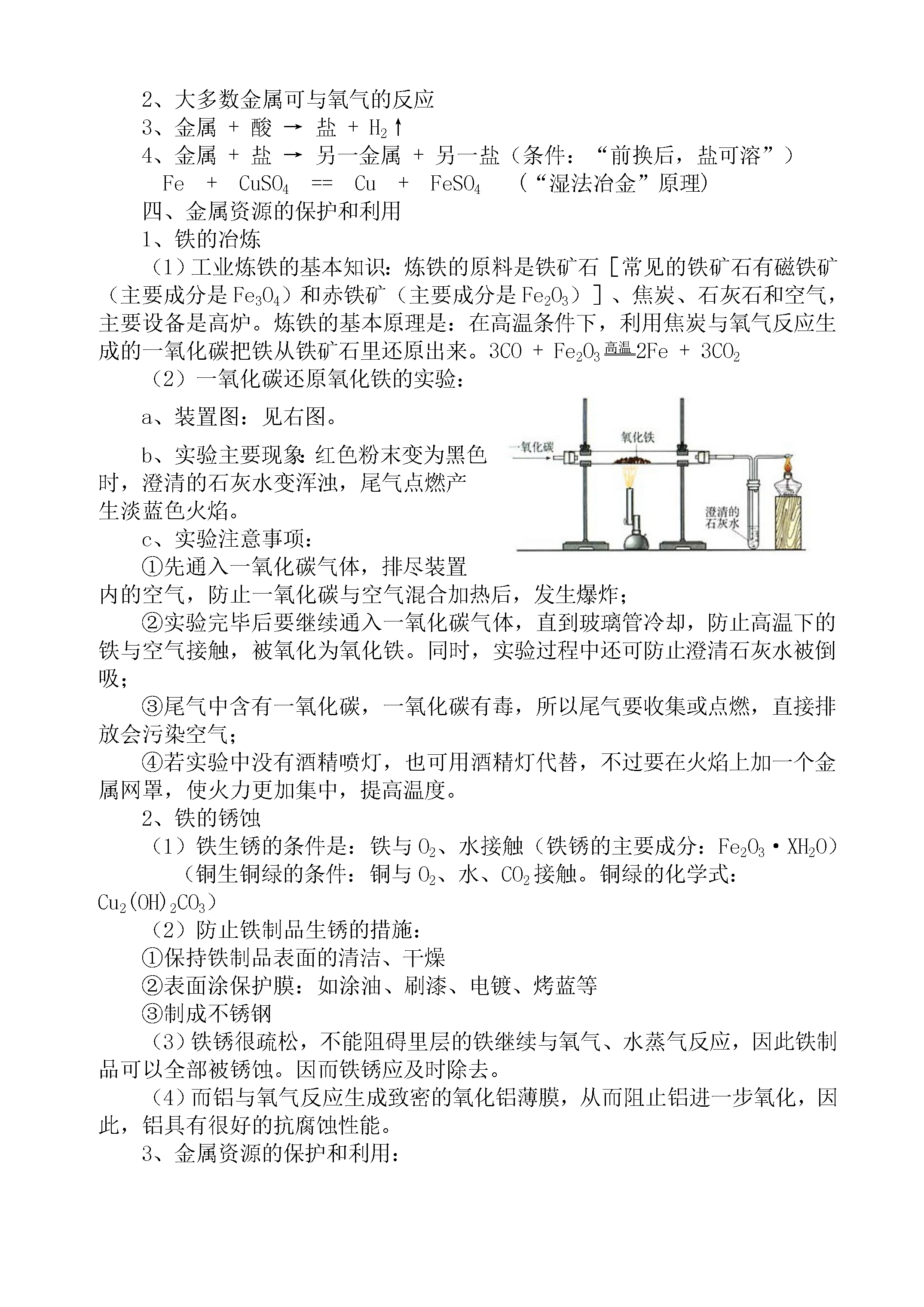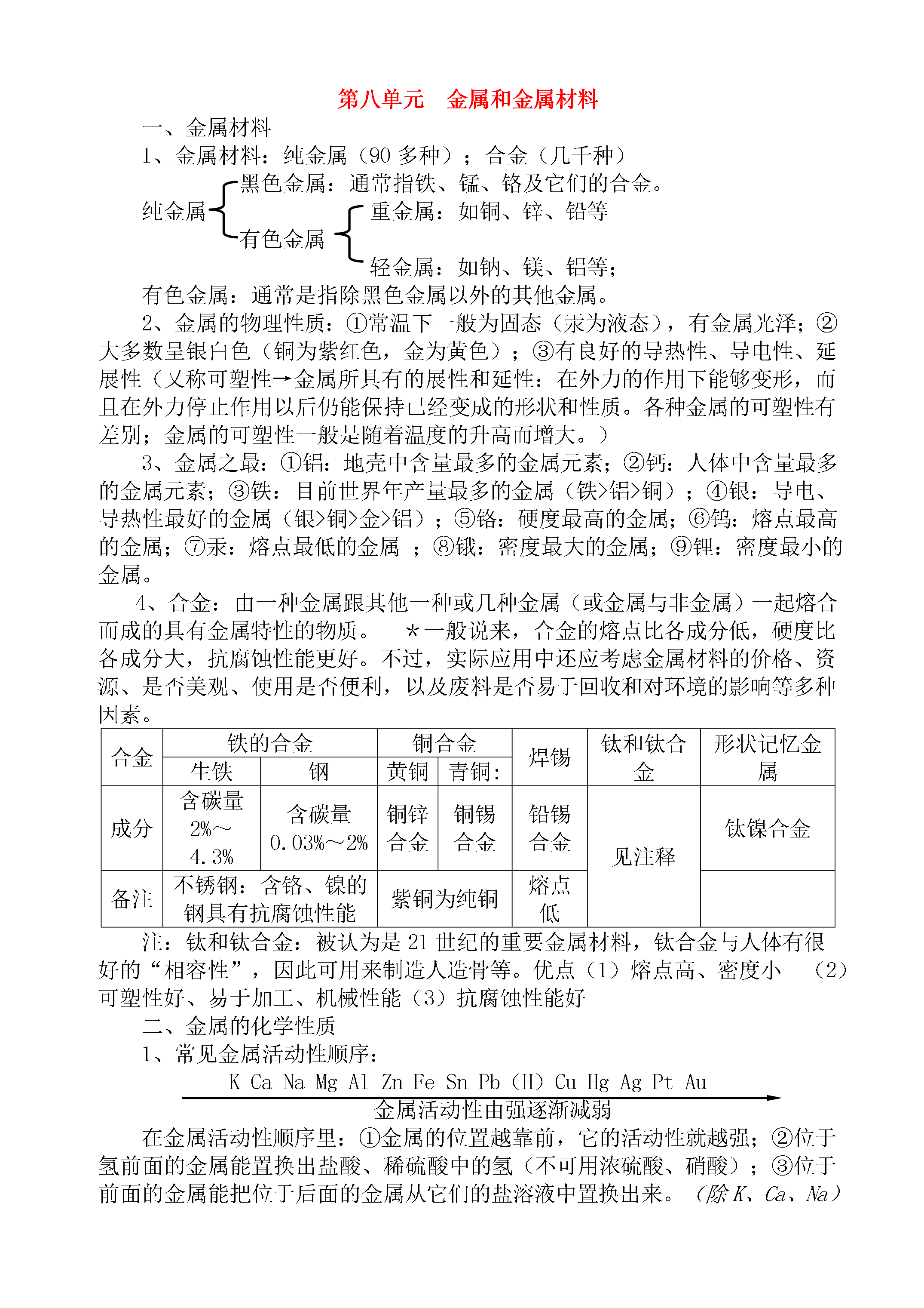 第八单元金属和金属材料一、金属材料1、金属材料:纯金属(90多种);合金(几千种)黑色金属:通常指铁、锰、铬及它们的合金。纯金属重金属:如铜、锌、铅等有色金属轻金属:如钠、镁、铝等;有色金属:通常是指除黑色金属以外的其他金属。2、金属的物理性质:①常温下一般为固态(汞为液态),有金属光泽;②大多数呈银白色(铜为紫红色,金为黄色);③有良好的导热性、导电性、延展性(又称可塑性→金属所具有的展性和延性:在外力的作用下能够变形,而且在外力停止作用以后仍能保持已经变成的形状和性质。各种金属的可塑性有差别;金属的可塑性一般是随着温度的升高而增大。)3、金属之最:①铝:地壳中含量最多的金属元素;②钙:人体中含量最多的金属元素;③铁:目前世界年产量最多的金属(铁>铝>铜);④银:导电、导热性最好的金属(银>铜>金>铝);⑤铬:硬度最高的金属;⑥钨:熔点最高的金属;⑦汞:熔点最低的金属;⑧锇:密度最大的金属;⑨锂:密度最小的金属。4、合金:由一种金属跟其他一种或几种金属(或金属与非金属)一起熔合而成的具有金属特性的物质。*一般说来,合金的熔点比各成分低,硬度比各成分大,抗腐蚀性能更好。不过,实际应用中还应考虑金属材料的价格、资源、是否美观、使用是否便利,以及废料是否易于回收和对环境的影响等多种因素。合金铁的合金铜合金焊锡钛和钛合金形状记忆金属生铁钢黄铜青铜:成分含碳量2%~4.3%含碳量0.03%~2%铜锌合金铜锡合金铅锡合金见注释钛镍合金备注不锈钢:含铬、镍的钢具有抗腐蚀性能紫铜为纯铜熔点低注:钛和钛合金:被认为是21世纪的重要金属材料,钛合金与人体有很好的“相容性”,因此可用来制造人造骨等。优点(1)熔点高、密度小(2)可塑性好、易于加工、机械性能(3)抗腐蚀性能好二、金属的化学性质1、常见金属活动性顺序:KCaNaMgAlZnFeSnPb(H)CuHgAgPtAu金属活动性由强逐渐减弱在金属活动性顺序里:①金属的位置越靠前,它的活动性就越强;②位于氢前面的金属能置换出盐酸、稀硫酸中的氢(不可用浓硫酸、硝酸);③位于前面的金属能把位于后面的金属从它们的盐溶液中置换出来。(除K、Ca、Na)2、大多数金属可与氧气的反应3、金属+酸→盐+H2↑4、金属+盐→另一金属+另一盐(条件:“前换后,盐可溶”)Fe+CuSO4==Cu+FeSO4(“湿法冶金”原理)四、金属资源的保护和利用1、铁的冶炼(1)工业炼铁的基本知识:炼铁的原料是铁矿石[常见的铁矿石有磁铁矿(主要成分是Fe3O4)和赤铁矿(主要成分是Fe2O3)]、焦炭、石灰石和空气,主要设备是高炉。炼铁的基本原理是:在高温条件下,利用焦炭与氧气反应生成的一氧化碳把铁从铁矿石里还原出来。3CO+Fe2O3高温2Fe+3CO2(2)一氧化碳还原氧化铁的实验:a、装置图:见右图。b、实验主要现象:红色粉末变为黑色时,澄清的石灰水变浑浊,尾气点燃产生淡蓝色火焰。c、实验注意事项:①先通入一氧化碳气体,排尽装置内的空气,防止一氧化碳与空气混合加热后,发生爆炸;②实验完毕后要继续通入一氧化碳气体,直到玻璃管冷却,防止高温下的铁与空气接触,被氧化为氧化铁。同时,实验过程中还可防止澄清石灰水被倒吸;③尾气中含有一氧化碳,一氧化碳有毒,所以尾气要收集或点燃,直接排放会污染空气;④若实验中没有酒精喷灯,也可用酒精灯代替,不过要在火焰上加一个金属网罩,使火力更加集中,提高温度。2、铁的锈蚀(1)铁生锈的条件是:铁与O2、水接触(铁锈的主要成分:Fe2O3·XH2O)(铜生铜绿的条件:铜与O2、水、CO2接触。铜绿的化学式:Cu2(OH)2CO3)(2)防止铁制品生锈的措施:①保持铁制品表面的清洁、干燥②表面涂保护膜:如涂油、刷漆、电镀、烤蓝等③制成不锈钢(3)铁锈很疏松,不能阻碍里层的铁继续与氧气、水蒸气反应,因此铁制品可以全部被锈蚀。因而铁锈应及时除去。(4)而铝与氧气反应生成致密的氧化铝薄膜,从而阻止铝进一步氧化,因此,铝具有很好的抗腐蚀性能。3、金属资源的保护和利用:①防止金属腐蚀;②回收利用废旧金属;③合理开采矿物;④寻找金属的代用。