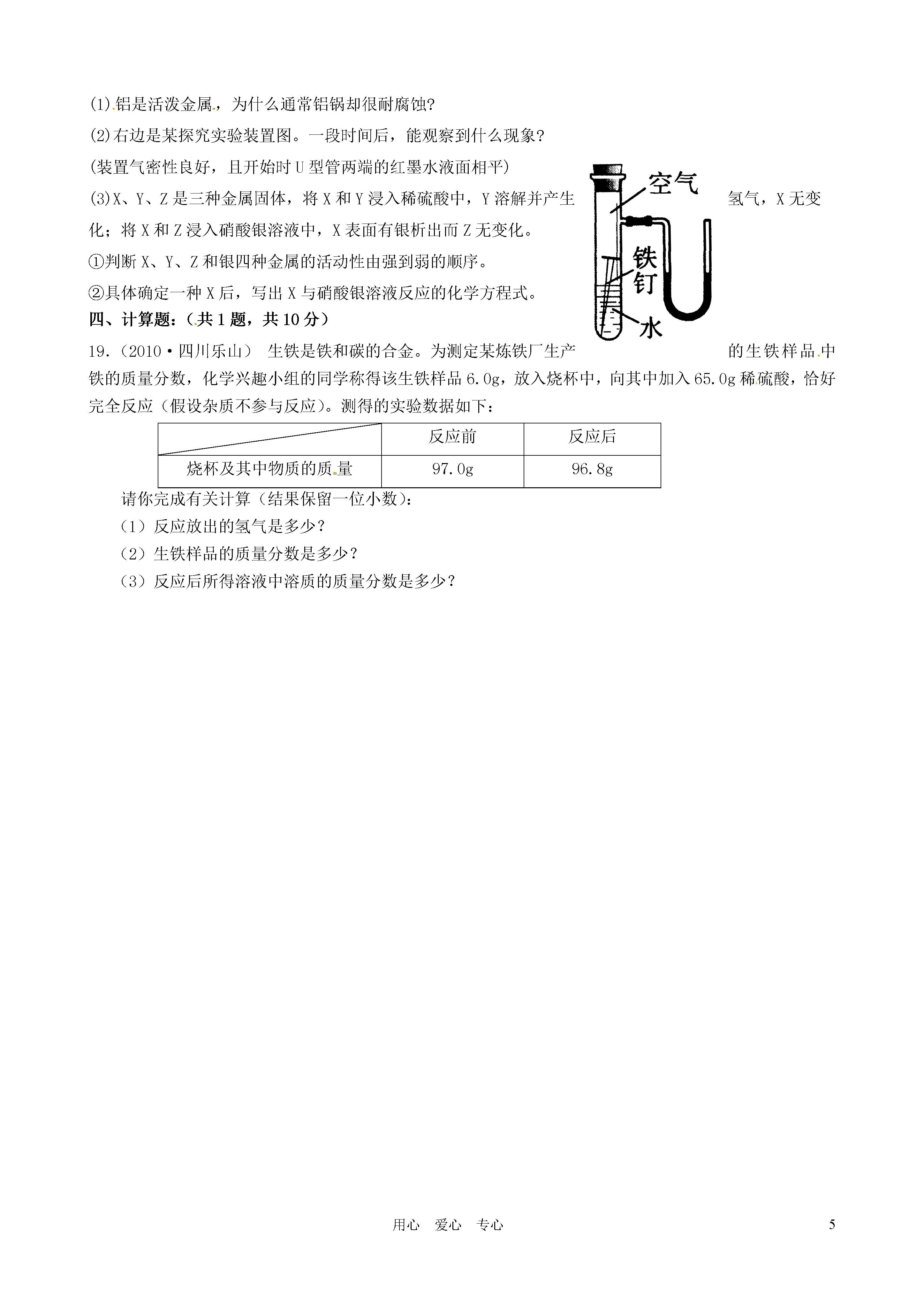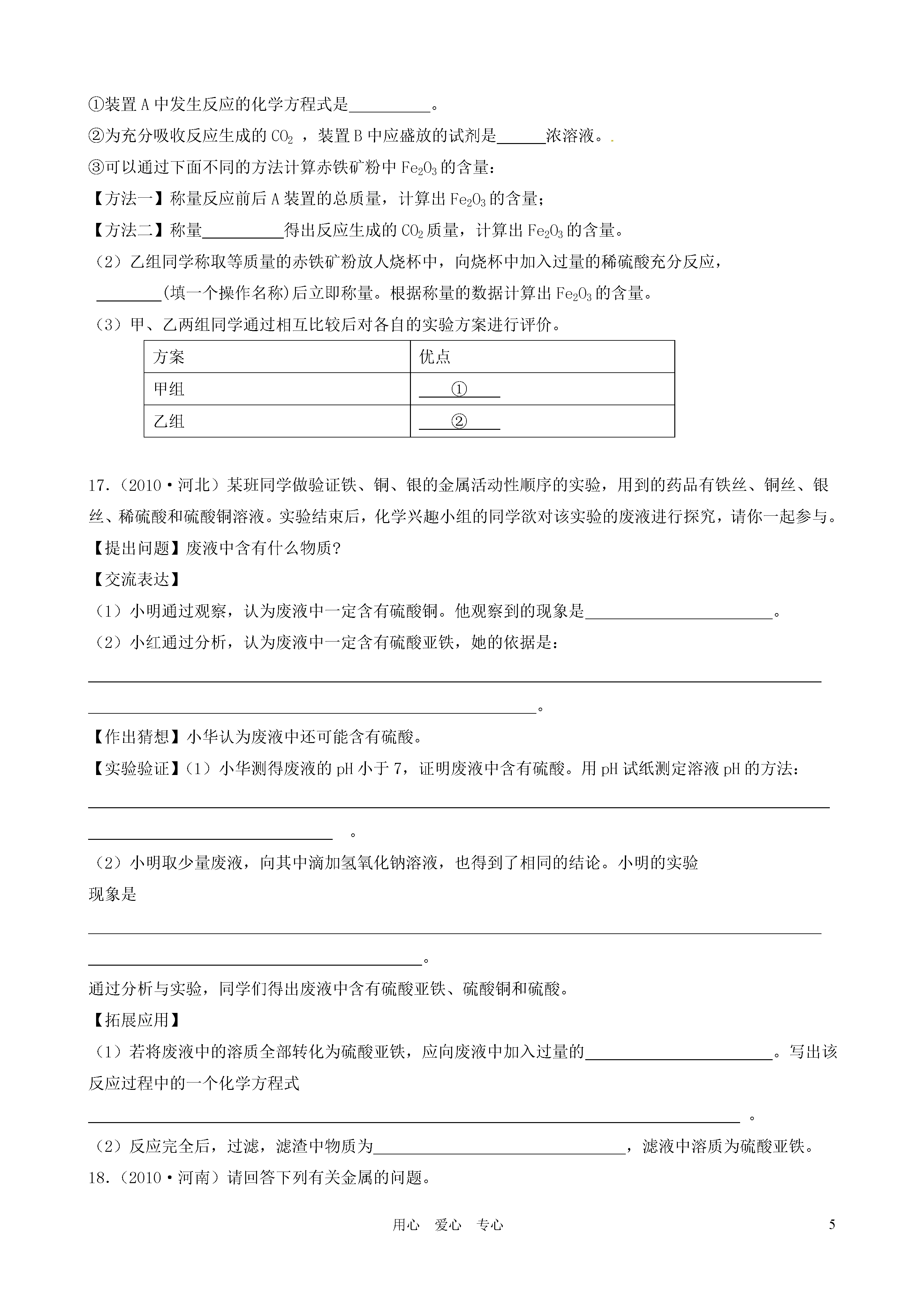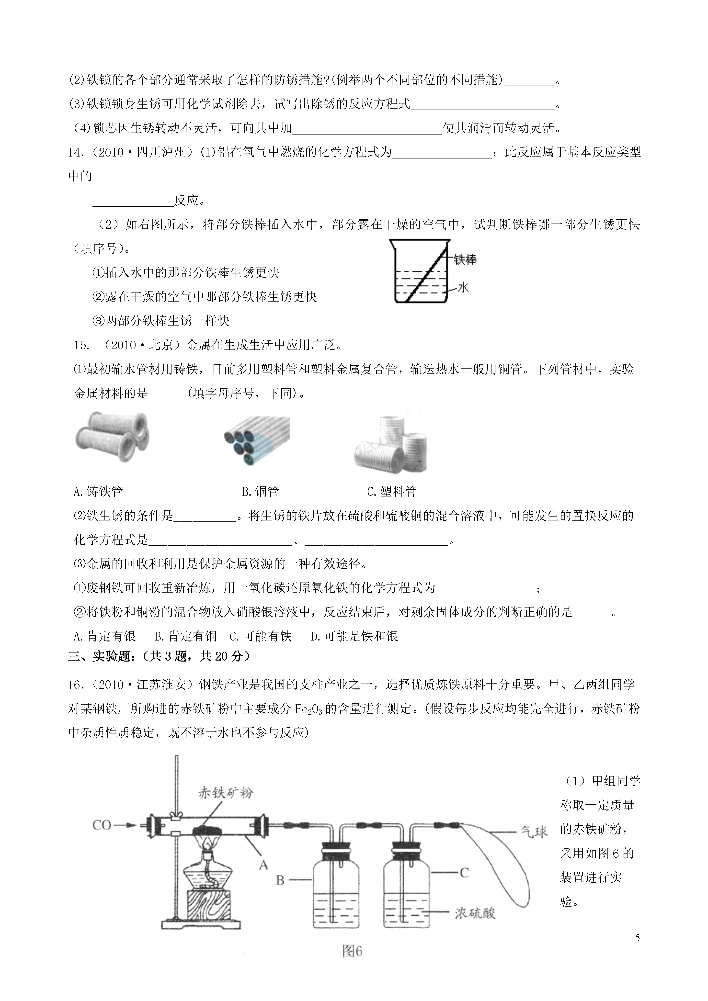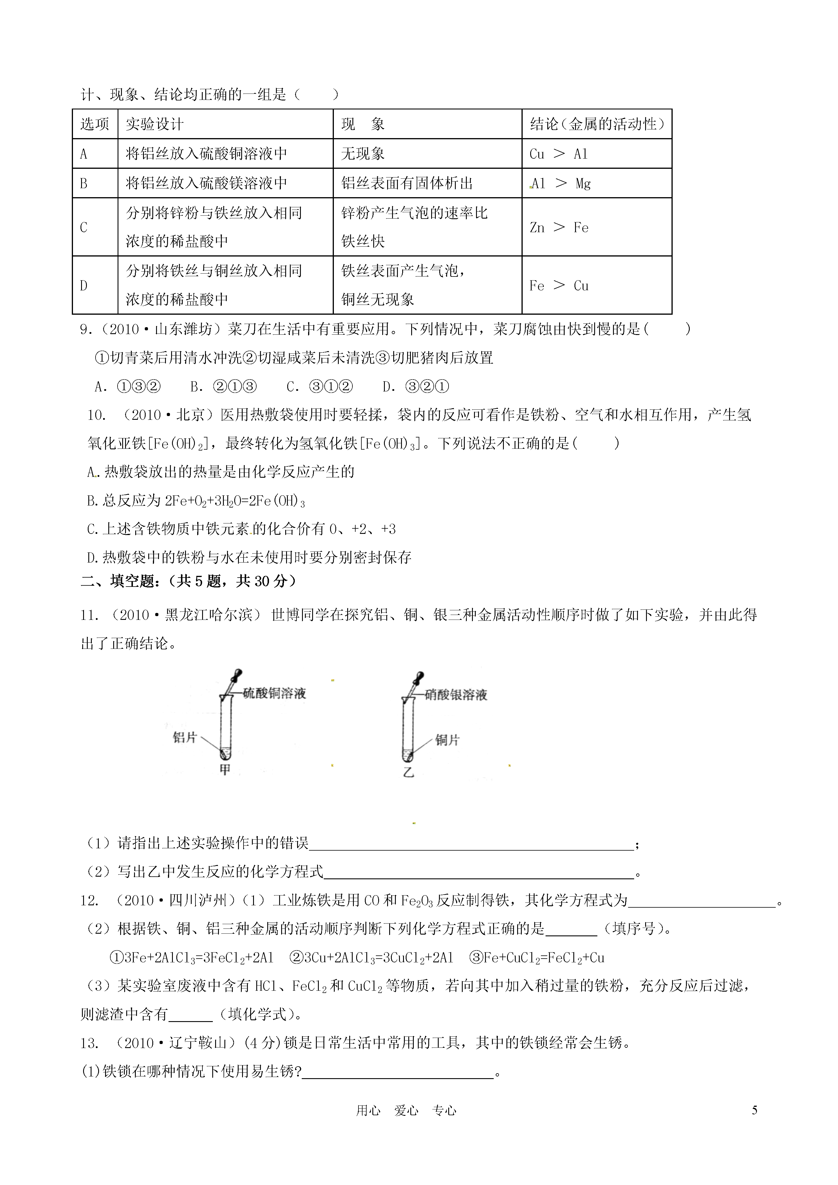5用心爱心专心备战2011中考精品系列2010中考化学全面解析之金属和金属材料(上)(学生版)一、选择题:(共10题,每小题4分,共40分)1、(2010·广东)铁是一种应用广泛的金属。下列有关铁的叙述正确的是()A.铁是地壳中含量最多的金属B.工业上用二氧化碳冶炼钢铁C.用铁可以回收硝酸银废液中的银D.铁丝在氧气中燃烧生成氧化铁2.(2010·山东泰安)2010年上海世博会中国馆—“东方之冠”给人强烈的视觉冲击,它的主体结构为四根巨型钢筋混凝土制成的核心筒。其中钢属于()A.金属材料B.硅酸盐材料C.复合材料D.有机高分子材料3.(2010·广州)下列四个实验中只需要完成三个就可以证明Fe、Cu、Ag三种金属的活动性顺序。其中不必进行的是()A.将铁片放入稀盐酸B.将铜片放入稀盐酸C.将铁片放入硝酸银溶液D.将铜片放入硝酸银溶液4.(2010·山东泰安)已知金属R与硫酸铜溶液反应的化学方程式是:R+CuSO4=Cu+RSO4。则下列说法正确的是()A.该反应属于复分解反应B.金属R的活泼性比Cu要强C.该金属可以是金属铝D.该金属一定是铁5.(2010·江苏南京)有X、Y、Z三种金属,如果把X和Y分别放入稀硫酸中,X溶解并产生氢气,Y不反应;如果把Y和Z分别放人硝酸银溶液中,过一会儿,在Y表面有银析出,而Z没有变化。根据以上实验事实,判断这三种金属的活动性由强到弱的顺序为()A.Z、Y、XB.X、Y、ZC.Y、X、ZD.X、Z、Y6.(2010·黑龙江哈尔滨)2010年6月6日,哈尔滨之夏旅游文化节暨松花江滨水游开幕式在松花江上举行,即日起许多彩船正式开始运行。下列有关认识不正确的是()A.该活动能促进经济和旅游业的发展B.制作彩船的钢材属于合成材料C.制作彩船使用了可重复使用的板块,体现了环保理念D.在铺设用电线路是,既要考虑安全问题,有要考虑节约资源7.(2010·辽宁鞍山)根据金属活动性顺序分析,下列描述或判断错误的是()A.常温下,在空气中金属镁比铁容易氧化B.在氧气中灼烧时,铁丝比铜丝反应剧烈C.与同种盐酸反应时,锌片比铁片反应剧烈D.铜活动性不强,故铜不能与硝酸银溶液反应得到金属银8.(2010·江苏淮安)同学们为探究不同金属的活动性强弱,设计了如下的实验方案,下列方案中实验设计、现象、结论均正确的一组是()选项实验设计现象结论(金属的活动性)A将铝丝放入硫酸铜溶液中无现象Cu>AlB将铝丝放入硫酸镁溶液中铝丝表面有固体析出Al>MgC分别将锌粉与铁丝放入相同浓度的稀盐酸中锌粉产生气泡的速率比铁丝快Zn>FeD分别将铁丝与铜丝放入相同浓度的稀盐酸中铁丝表面产生气泡,铜丝无现象Fe>Cu9.(2010·山东潍坊)菜刀在生活中有重要应用。下列情况中,菜刀腐蚀由快到慢的是()①切青菜后用清水冲洗②切湿咸菜后未清洗③切肥猪肉后放置A.①③②B.②①③C.③①②D.③②①10.(2010·北京)医用热敷袋使用时要轻揉,袋内的反应可看作是铁粉、空气和水相互作用,产生氢氧化亚铁[Fe(OH)2],最终转化为氢氧化铁[Fe(OH)3]。下列说法不正确的是()A.热敷袋放出的热量是由化学反应产生的B.总反应为2Fe+O2+3H2O=2Fe(OH)3C.上述含铁物质中铁元素的化合价有0、+2、+3D.热敷袋中的铁粉与水在未使用时要分别密封保存二、填空题:(共5题,共30分)11.(2010·黑龙江哈尔滨)世博同学在探究铝、铜、银三种金属活动性顺序时做了如下实验,并由此得出了正确结论。(1)请指出上述实验操作中的错误;(2)写出乙中发生反应的化学方程式。12.(2010·四川泸州)(1)工业炼铁是用CO和Fe2O3反应制得铁,其化学方程式为。(2)根据铁、铜、铝三种金属的活动顺序判断下列化学方程式正确的是(填序号)。①3Fe+2AlCl3=3FeCl2+2Al②3Cu+2AlCl3=3CuCl2+2Al③Fe+CuCl2=FeCl2+Cu(3)某实验室废液中含有HCl、FeCl2和CuCl2等物质,若向其中加入稍过量的铁粉,充分反应后过滤,则滤渣中含有(填化学式)。13.(2010·辽宁鞍山)(4分)锁是日常生活中常用的工具,其中的铁锁经常会生锈。(1)铁锁在哪种情况下使用易生锈?。(2)铁锁的各个部分通常采取了怎样的防锈措施?(例举两个不同部位的不同措施)。(3)铁锁锁身生锈可用化学试剂除去,试写出除锈的反应方程式。(4)锁芯因生锈转动不灵活,可向其中加使其润滑而转动灵活。14.(2010·四川泸州)(1)铝在氧气中燃烧的化学方程式为;此反应属于基本反应类型中的反应。(2)如右图所示,将部分铁棒插