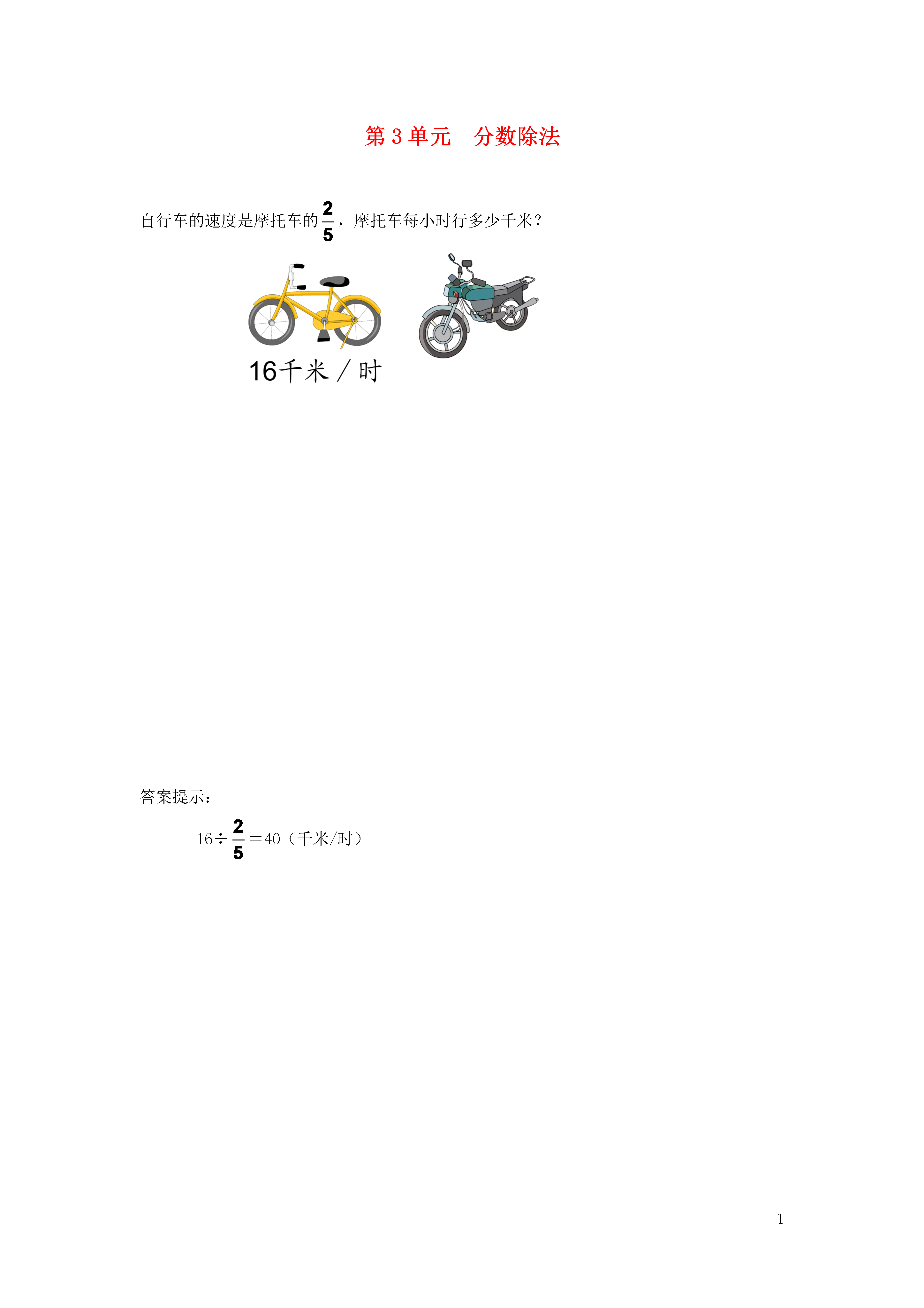 1第3单元分数除法自行车的速度是摩托车的,摩托车每小时行多少千米?答案提示:16÷=40(千米/时)