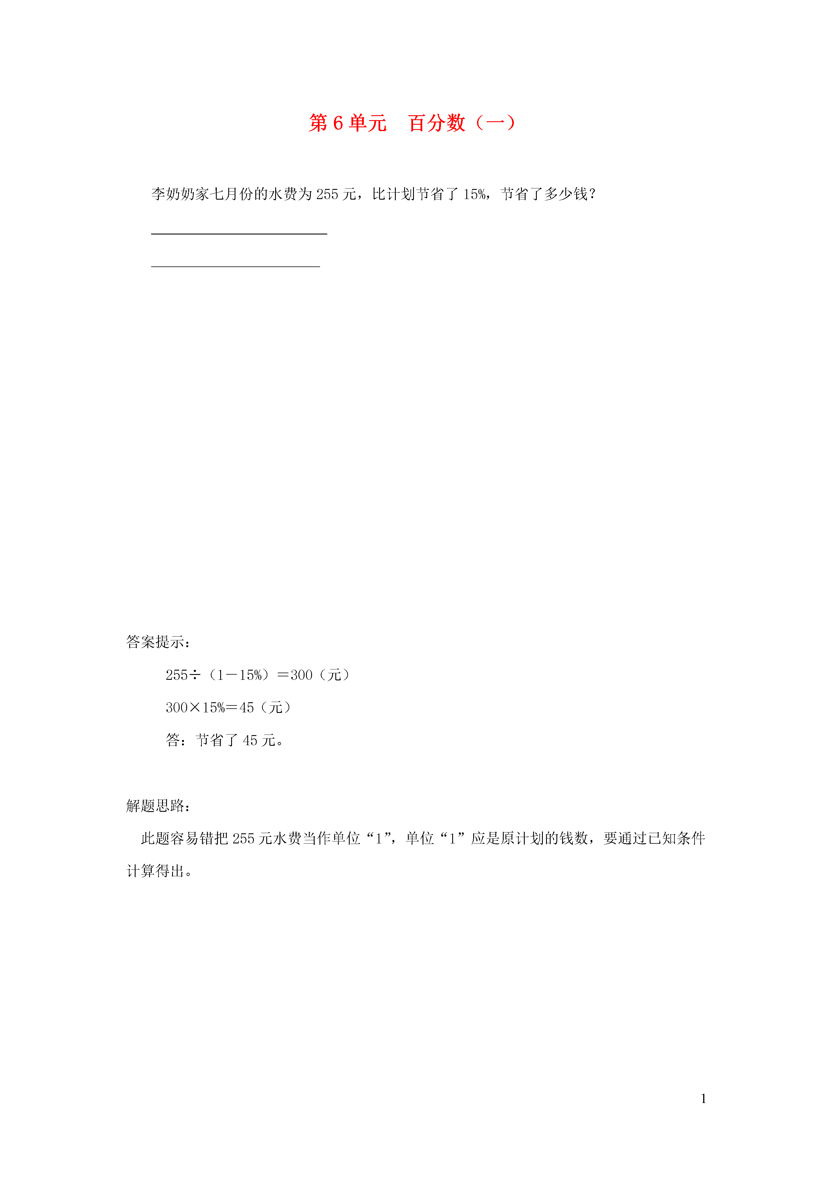 1第6单元百分数(一)李奶奶家七月份的水费为255元,比计划节省了15%,节省了多少钱?答案提示:255÷(1-15%)=300(元)300×15%=45(元)答:节省了45元。解题思路:此题容易错把255元水费当作单位“1”,单位“1”应是原计划的钱数,要通过已知条件计算得出。