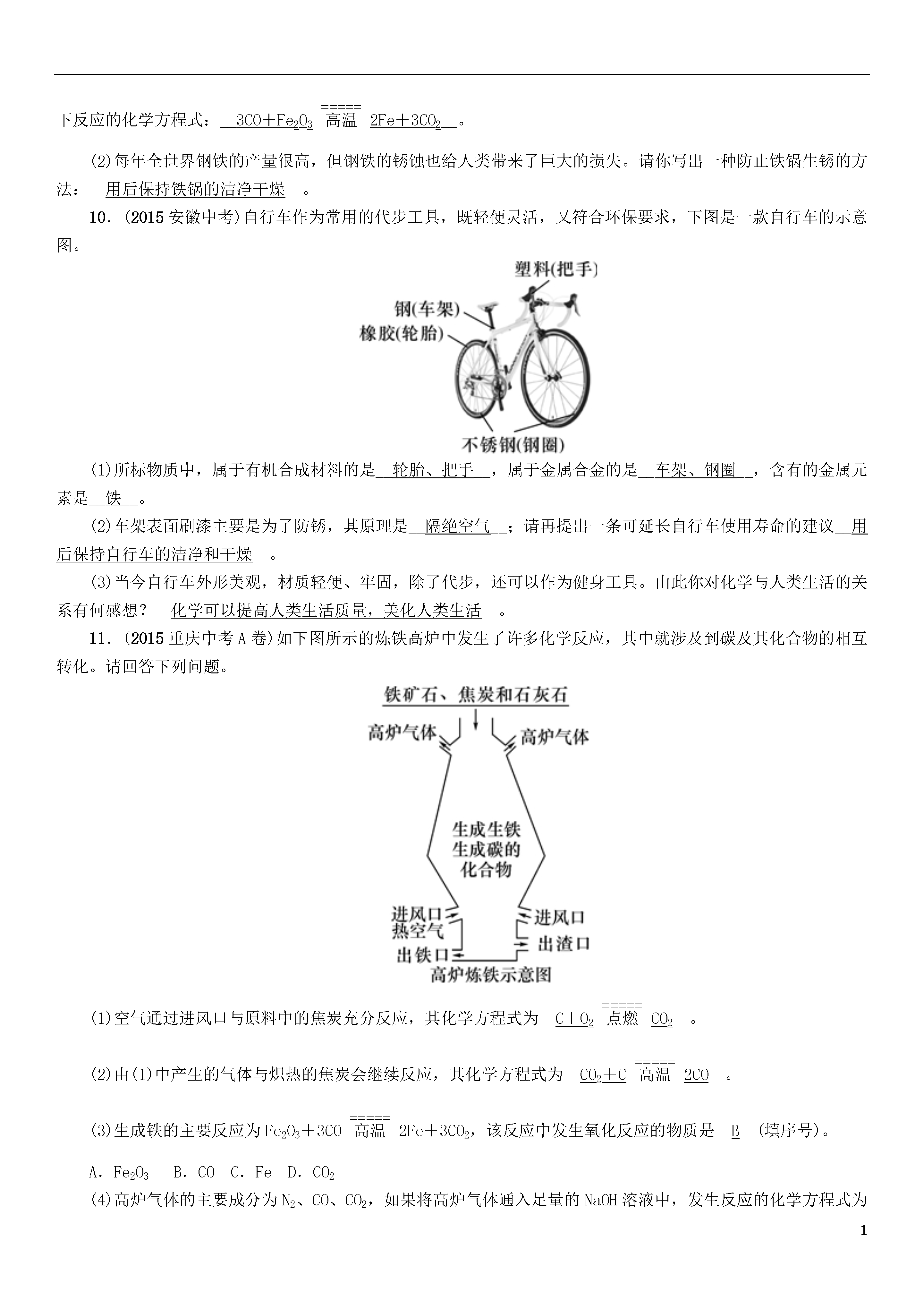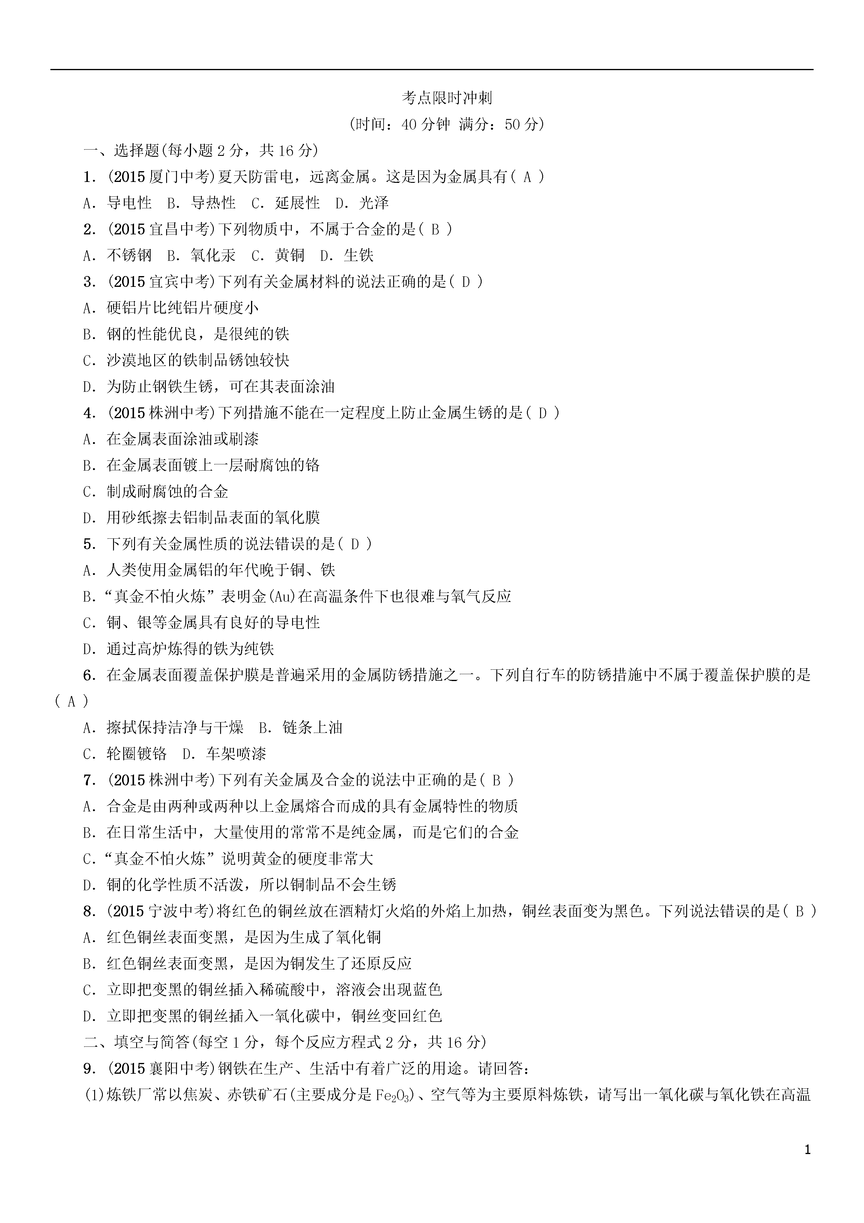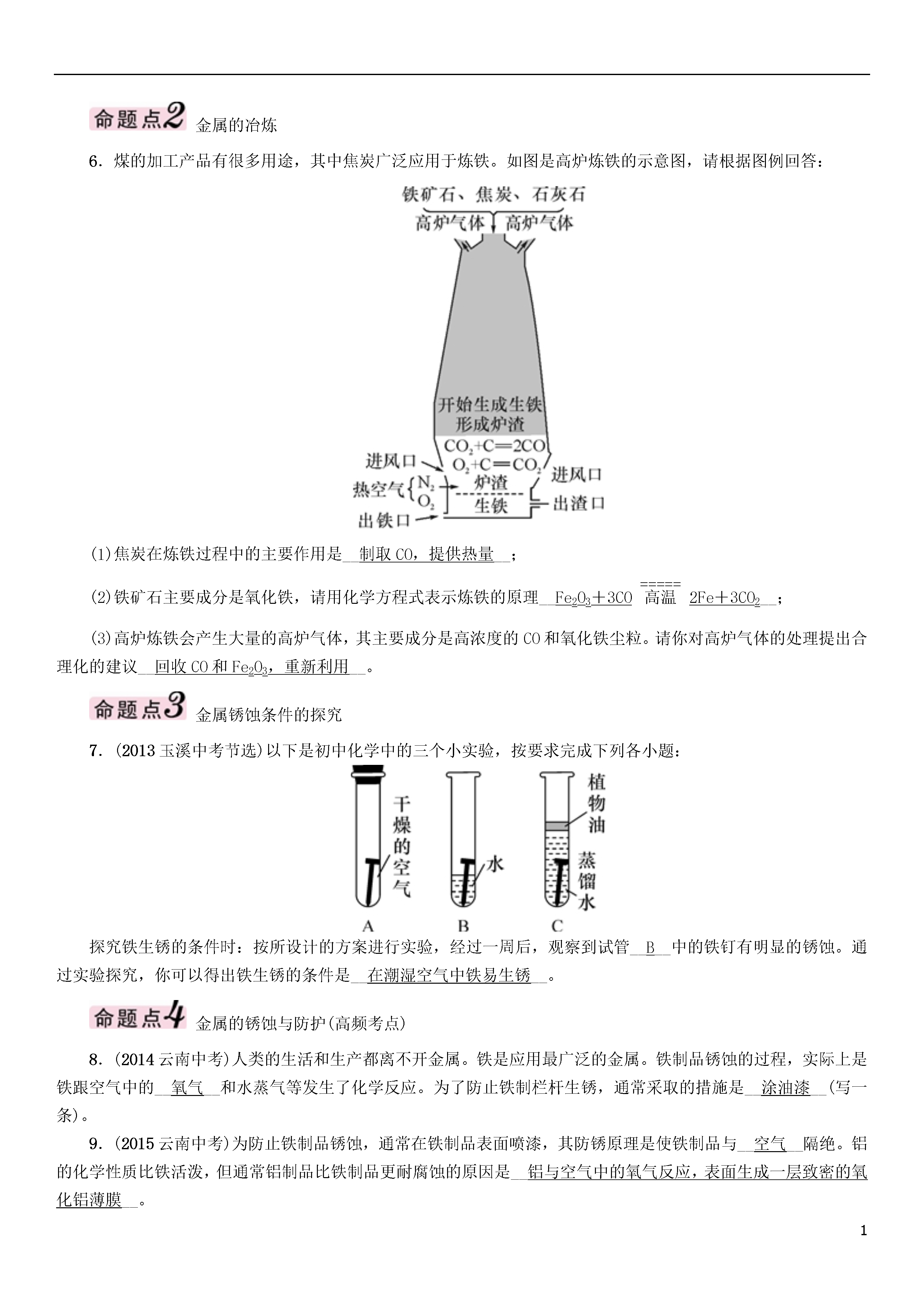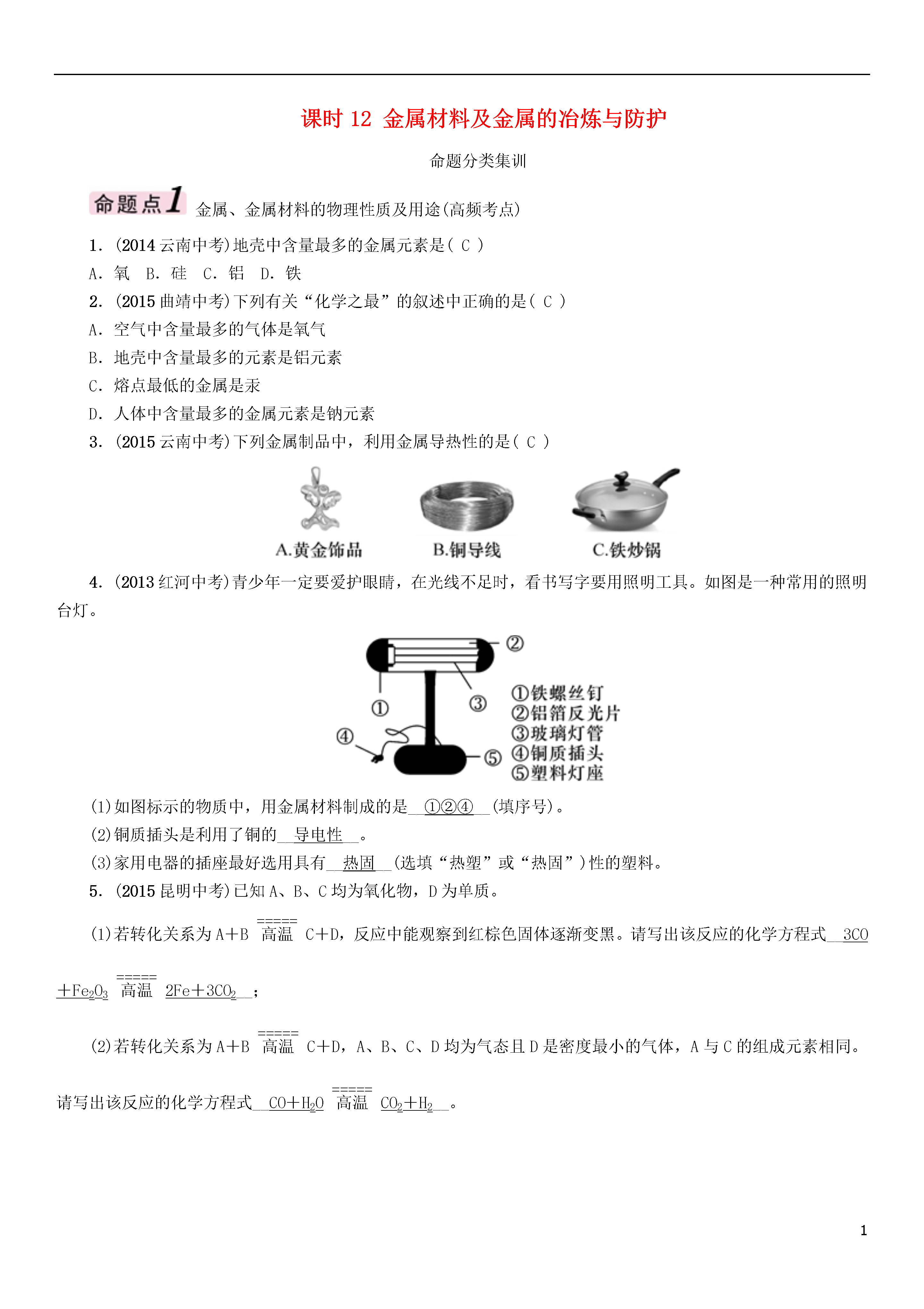 1课时12金属材料及金属的冶炼与防护命题分类集训金属、金属材料的物理性质及用途(高频考点)1.(2014云南中考)地壳中含量最多的金属元素是(C)A.氧B.硅C.铝D.铁2.(2015曲靖中考)下列有关“化学之最”的叙述中正确的是(C)A.空气中含量最多的气体是氧气B.地壳中含量最多的元素是铝元素C.熔点最低的金属是汞D.人体中含量最多的金属元素是钠元素3.(2015云南中考)下列金属制品中,利用金属导热性的是(C)4.(2013红河中考)青少年一定要爱护眼睛,在光线不足时,看书写字要用照明工具。如图是一种常用的照明台灯。(1)如图标示的物质中,用金属材料制成的是__①②④__(填序号)。(2)铜质插头是利用了铜的__导电性__。(3)家用电器的插座最好选用具有__热固__(选填“热塑”或“热固”)性的塑料。5.(2015昆明中考)已知A、B、C均为氧化物,D为单质。(1)若转化关系为A+BEQ\*jc0\*hps21\o(\s\up9(=====),高温)C+D,反应中能观察到红棕色固体逐渐变黑。请写出该反应的化学方程式__3CO+Fe2O3EQ\*jc0\*hps21\o(\s\up9(=====),高温)2Fe+3CO2__;(2)若转化关系为A+BEQ\*jc0\*hps21\o(\s\up9(=====),高温)C+D,A、B、C、D均为气态且D是密度最小的气体,A与C的组成元素相同。请写出该反应的化学方程式__CO+H2OEQ\*jc0\*hps21\o(\s\up9(=====),高温)CO2+H2__。金属的冶炼6.煤的加工产品有很多用途,其中焦炭广泛应用于炼铁。如图是高炉炼铁的示意图,请根据图例回答:(1)焦炭在炼铁过程中的主要作用是__制取CO,提供热量__;(2)铁矿石主要成分是氧化铁,请用化学方程式表示炼铁的原理__Fe2O3+3COEQ\*jc0\*hps21\o(\s\up9(=====),高温)2Fe+3CO2__;(3)高炉炼铁会产生大量的高炉气体,其主要成分是高浓度的CO和氧化铁尘粒。请你对高炉气体的处理提出合理化的建议__回收CO和Fe2O3,重新利用__。金属锈蚀条件的探究7.(2013玉溪中考节选)以下是初中化学中的三个小实验,按要求完成下列各小题:探究铁生锈的条件时:按所设计的方案进行实验,经过一周后,观察到试管__B__中的铁钉有明显的锈蚀。通过实验探究,你可以得出铁生锈的条件是__在潮湿空气中铁易生锈__。金属的锈蚀与防护(高频考点)8.(2014云南中考)人类的生活和生产都离不开金属。铁是应用最广泛的金属。铁制品锈蚀的过程,实际上是铁跟空气中的__氧气__和水蒸气等发生了化学反应。为了防止铁制栏杆生锈,通常采取的措施是__涂油漆__(写一条)。9.(2015云南中考)为防止铁制品锈蚀,通常在铁制品表面喷漆,其防锈原理是使铁制品与__空气__隔绝。铝的化学性质比铁活泼,但通常铝制品比铁制品更耐腐蚀的原因是__铝与空气中的氧气反应,表面生成一层致密的氧化铝薄膜__。10.(2015昆明中考)人类在生产和生活中广泛使用金属。(1)用铜丝做电线是利用了铜的__导电性__性。(2)铁是化学性质比较活泼的金属,它在自然界中主要以__化合物__(选填“单质”或“化合物”)的形式存在;在钢铁表面涂油、__刷油漆__、镀耐磨或耐腐蚀的铬及制造耐腐蚀的合金等,都能防止钢铁生锈。考点限时冲刺(时间:40分钟满分:50分)一、选择题(每小题2分,共16分)1.(2015厦门中考)夏天防雷电,远离金属。这是因为金属具有(A)A.导电性B.导热性C.延展性D.光泽2.(2015宜昌中考)下列物质中,不属于合金的是(B)A.不锈钢B.氧化汞C.黄铜D.生铁3.(2015宜宾中考)下列有关金属材料的说法正确的是(D)A.硬铝片比纯铝片硬度小B.钢的性能优良,是很纯的铁C.沙漠地区的铁制品锈蚀较快D.为防止钢铁生锈,可在其表面涂油4.(2015株洲中考)下列措施不能在一定程度上防止金属生锈的是(D)A.在金属表面涂油或刷漆B.在金属表面镀上一层耐腐蚀的铬C.制成耐腐蚀的合金D.用砂纸擦去铝制品表面的氧化膜5.下列有关金属性质的说法错误的是(D)A.人类使用金属铝的年代晚于铜、铁B.“真金不怕火炼”表明金(Au)在高温条件下也很难与氧气反应C.铜、银等金属具有良好的导电性D.通过高炉炼得的铁为纯铁6.在金属表面覆盖保护膜是普遍采用的金属防锈措施之一。下列自行车的防锈措施中不属于覆盖保护膜的是(A)A.擦拭保持洁净与干燥B.链条上油C.轮圈镀铬D.车