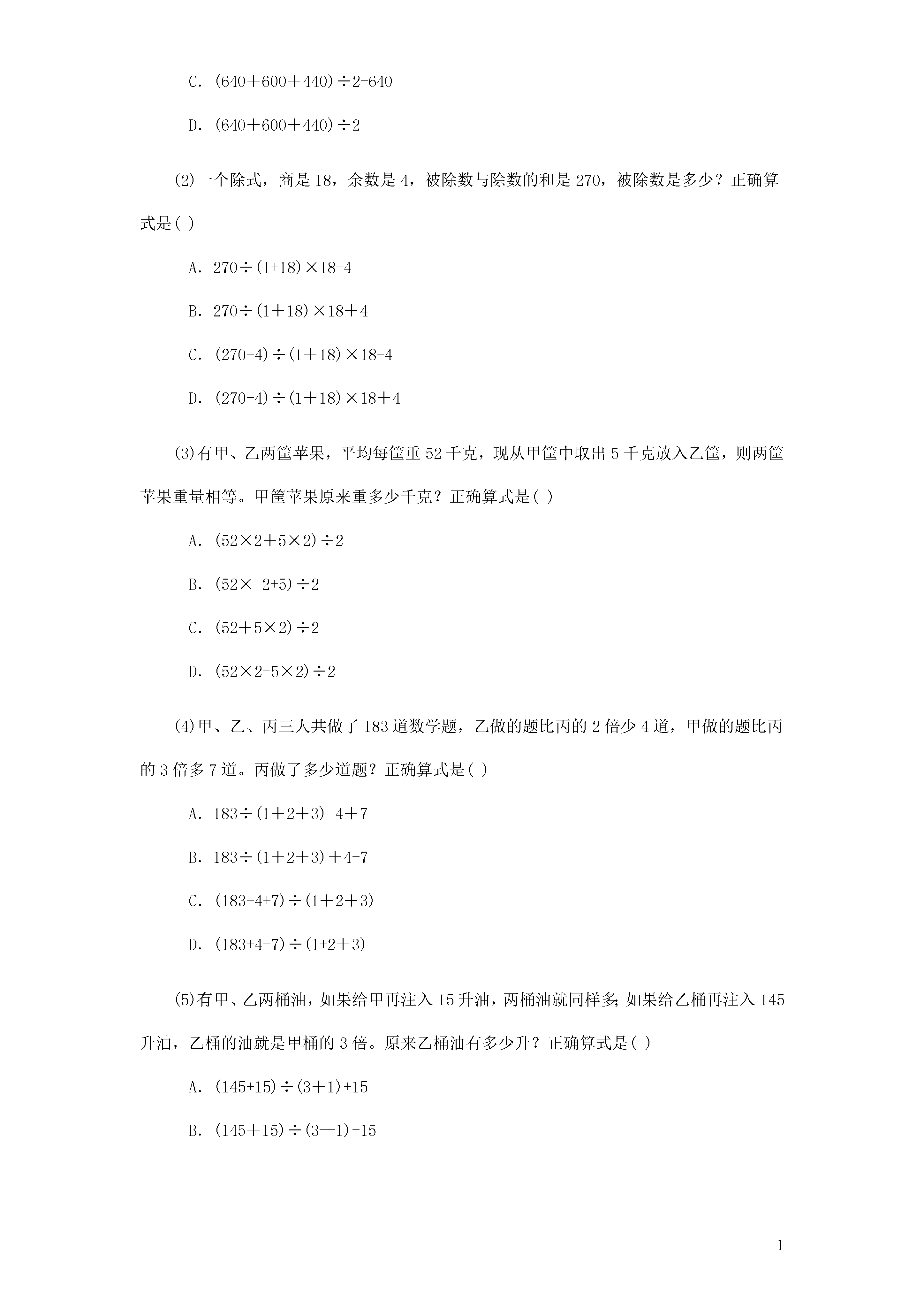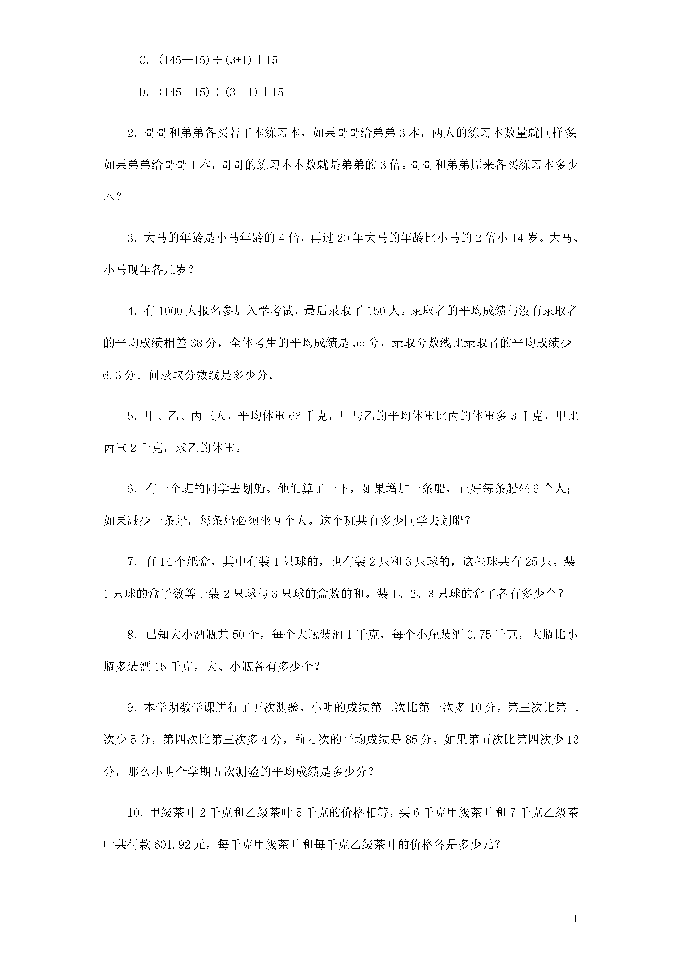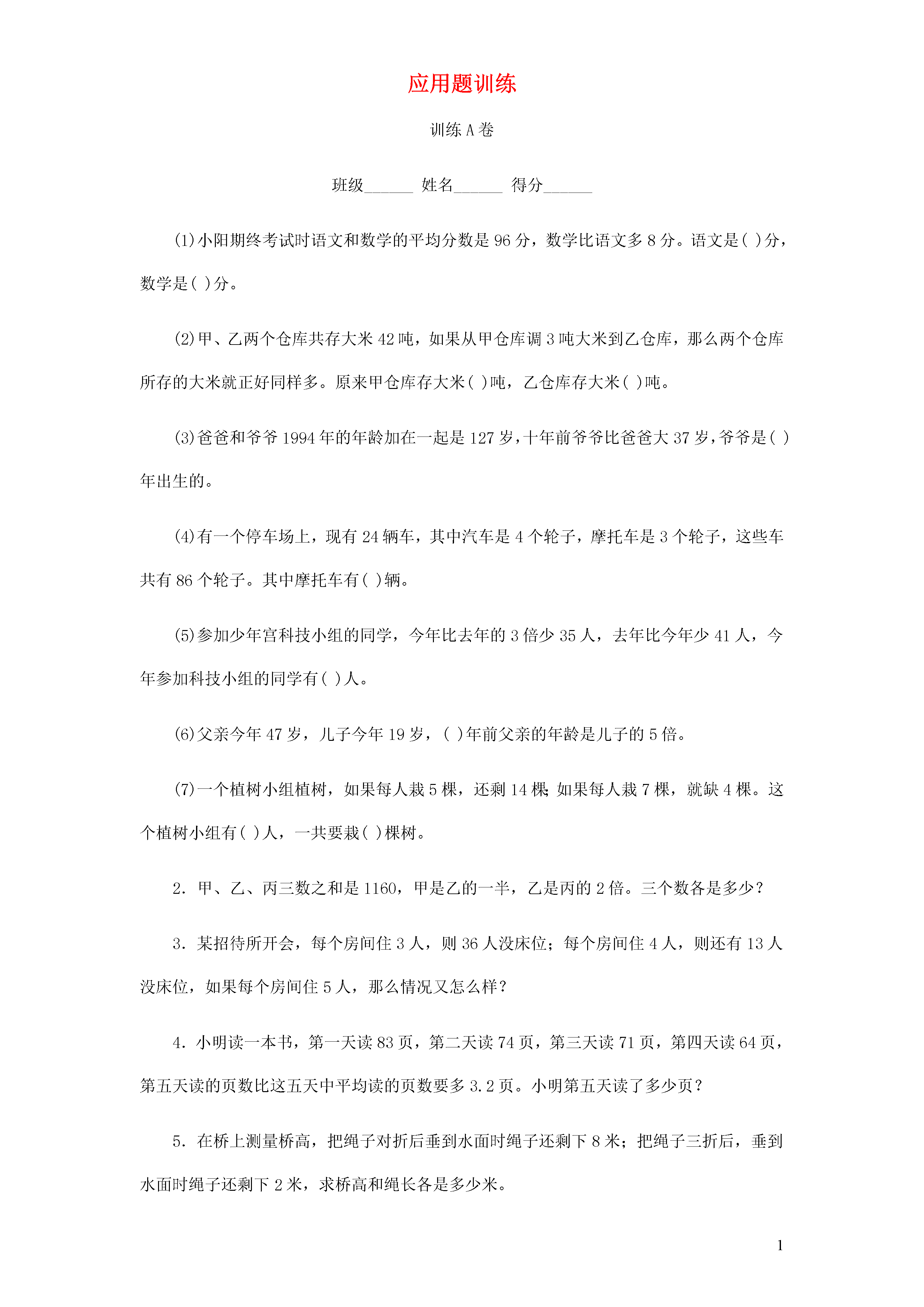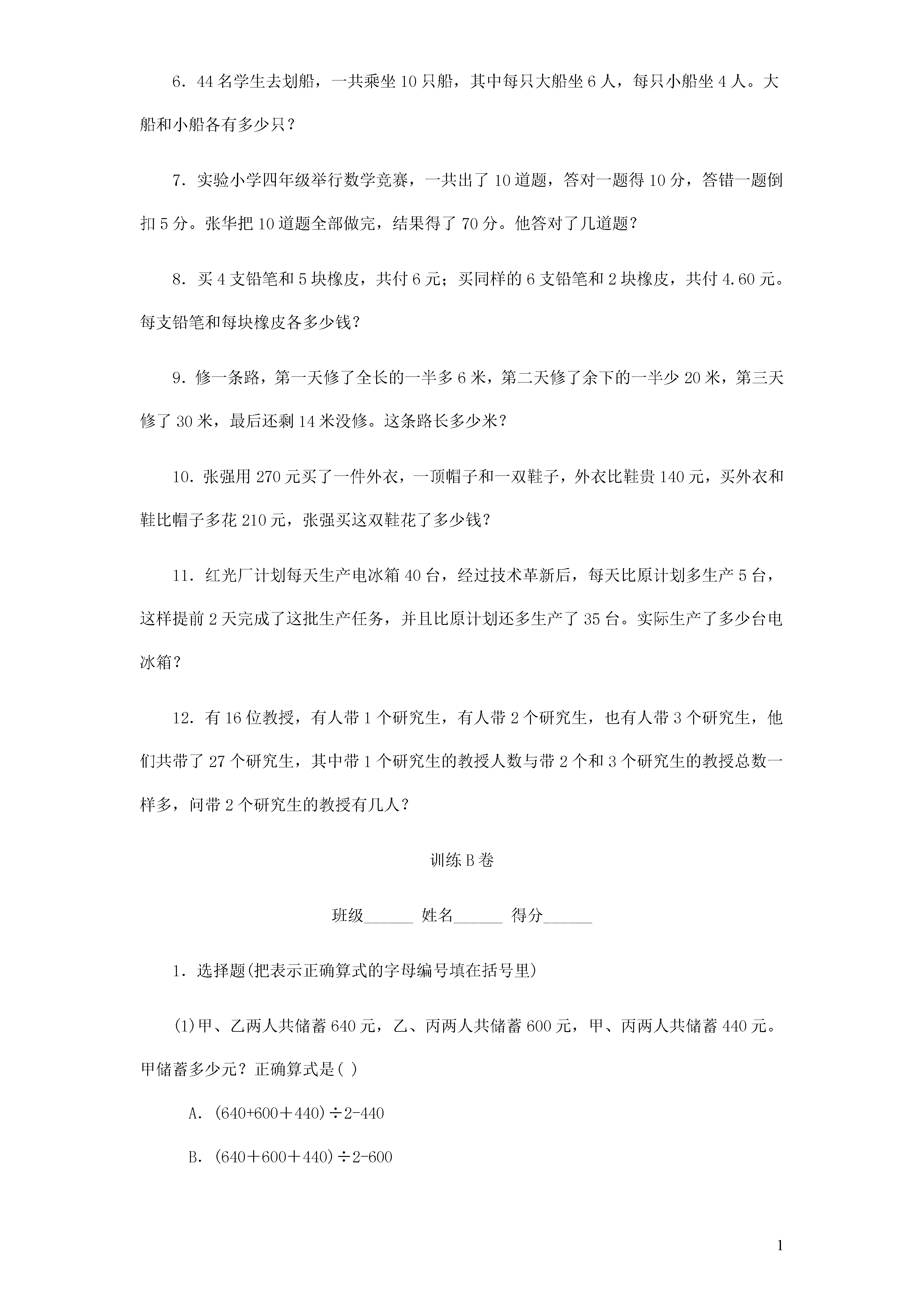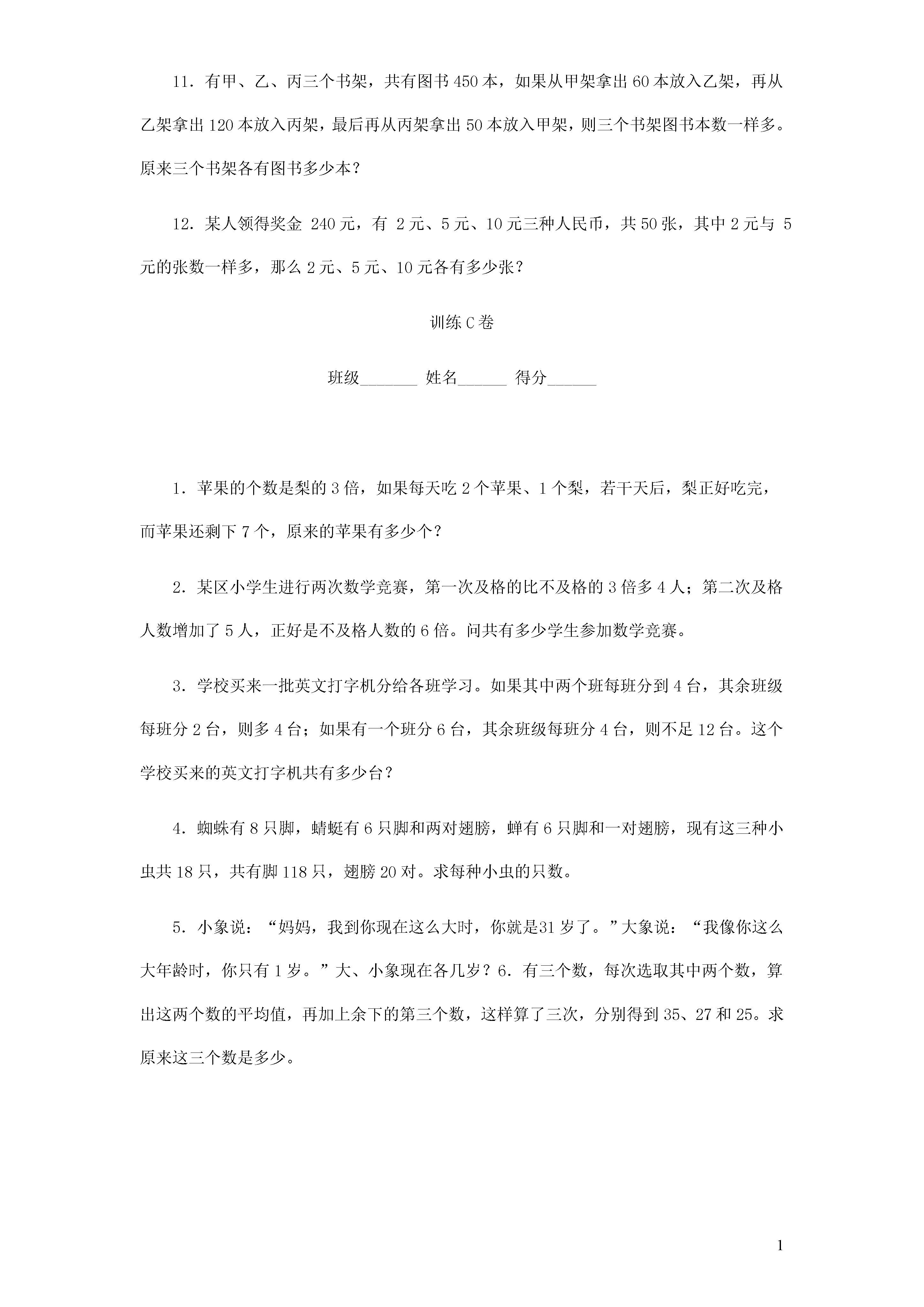 1应用题训练训练A卷班级______姓名______得分______(1)小阳期终考试时语文和数学的平均分数是96分,数学比语文多8分。语文是()分,数学是()分。(2)甲、乙两个仓库共存大米42吨,如果从甲仓库调3吨大米到乙仓库,那么两个仓库所存的大米就正好同样多。原来甲仓库存大米()吨,乙仓库存大米()吨。(3)爸爸和爷爷1994年的年龄加在一起是127岁,十年前爷爷比爸爸大37岁,爷爷是()年出生的。(4)有一个停车场上,现有24辆车,其中汽车是4个轮子,摩托车是3个轮子,这些车共有86个轮子。其中摩托车有()辆。(5)参加少年宫科技小组的同学,今年比去年的3倍少35人,去年比今年少41人,今年参加科技小组的同学有()人。(6)父亲今年47岁,儿子今年19岁,()年前父亲的年龄是儿子的5倍。(7)一个植树小组植树,如果每人栽5棵,还剩14棵;如果每人栽7棵,就缺4棵。这个植树小组有()人,一共要栽()棵树。2.甲、乙、丙三数之和是1160,甲是乙的一半,乙是丙的2倍。三个数各是多少?3.某招待所开会,每个房间住3人,则36人没床位;每个房间住4人,则还有13人没床位,如果每个房间住5人,那么情况又怎么样?4.小明读一本书,第一天读83页,第二天读74页,第三天读71页,第四天读64页,第五天读的页数比这五天中平均读的页数要多3.2页。小明第五天读了多少页?5.在桥上测量桥高,把绳子对折后垂到水面时绳子还剩下8米;把绳子三折后,垂到水面时绳子还剩下2米,求桥高和绳长各是多少米。6.44名学生去划船,一共乘坐10只船,其中每只大船坐6人,每只小船坐4人。大船和小船各有多少只?7.实验小学四年级举行数学竞赛,一共出了10道题,答对一题得10分,答错一题倒扣5分。张华把10道题全部做完,结果得了70分。他答对了几道题?8.买4支铅笔和5块橡皮,共付6元;买同样的6支铅笔和2块橡皮,共付4.60元。每支铅笔和每块橡皮各多少钱?9.修一条路,第一天修了全长的一半多6米,第二天修了余下的一半少20米,第三天修了30米,最后还剩14米没修。这条路长多少米?10.张强用270元买了一件外衣,一顶帽子和一双鞋子,外衣比鞋贵140元,买外衣和鞋比帽子多花210元,张强买这双鞋花了多少钱?11.红光厂计划每天生产电冰箱40台,经过技术革新后,每天比原计划多生产5台,这样提前2天完成了这批生产任务,并且比原计划还多生产了35台。实际生产了多少台电冰箱?12.有16位教授,有人带1个研究生,有人带2个研究生,也有人带3个研究生,他们共带了27个研究生,其中带1个研究生的教授人数与带2个和3个研究生的教授总数一样多,问带2个研究生的教授有几人?训练B卷班级______姓名______得分______1.选择题(把表示正确算式的字母编号填在括号里)(1)甲、乙两人共储蓄640元,乙、丙两人共储蓄600元,甲、丙两人共储蓄440元。甲储蓄多少元?正确算式是()A.(640+600+440)÷2-440B.(640+600+440)÷2-600C.(640+600+440)÷2-640D.(640+600+440)÷2(2)一个除式,商是18,余数是4,被除数与除数的和是270,被除数是多少?正确算式是()A.270÷(1+18)×18-4B.270÷(1+18)×18+4C.(270-4)÷(1+18)×18-4D.(270-4)÷(1+18)×18+4(3)有甲、乙两筐苹果,平均每筐重52千克,现从甲筐中取出5千克放入乙筐,则两筐苹果重量相等。甲筐苹果原来重多少千克?正确算式是()A.(52×2+5×2)÷2B.(52×2+5)÷2C.(52+5×2)÷2D.(52×2-5×2)÷2(4)甲、乙、丙三人共做了183道数学题,乙做的题比丙的2倍少4道,甲做的题比丙的3倍多7道。丙做了多少道题?正确算式是()A.183÷(1+2+3)-4+7B.183÷(1+2+3)+4-7C.(183-4+7)÷(1+2+3)D.(183+4-7)÷(1+2+3)(5)有甲、乙两桶油,如果给甲再注入15升油,两桶油就同样多;如果给乙桶再注入145升油,乙桶的油就是甲桶的3倍。原来乙桶油有多少升?正确算式是()A.(145+15)÷(3+1)+15B.(145+15)÷(3—1)+15C.(145—15)÷(3+1)+15D.(145—15)÷(3—1)+152.哥哥和弟弟各买若干本练习本,如果哥哥给弟弟3本,两人的练习本数量就同样多;如果弟弟给哥哥1本,哥哥的练习本本数就是弟弟的3倍。哥哥和弟弟原来各买练习本多少本?3.大马的年龄是小马年龄的4倍,再过20年大马的年龄比小马的2倍小14岁。大马、小马