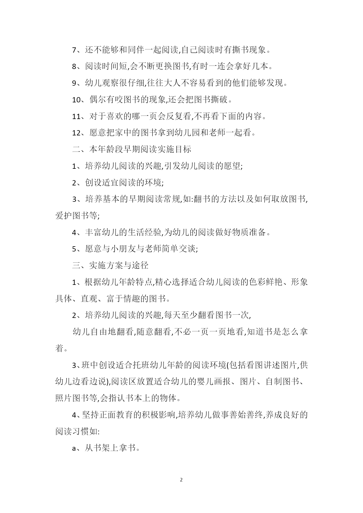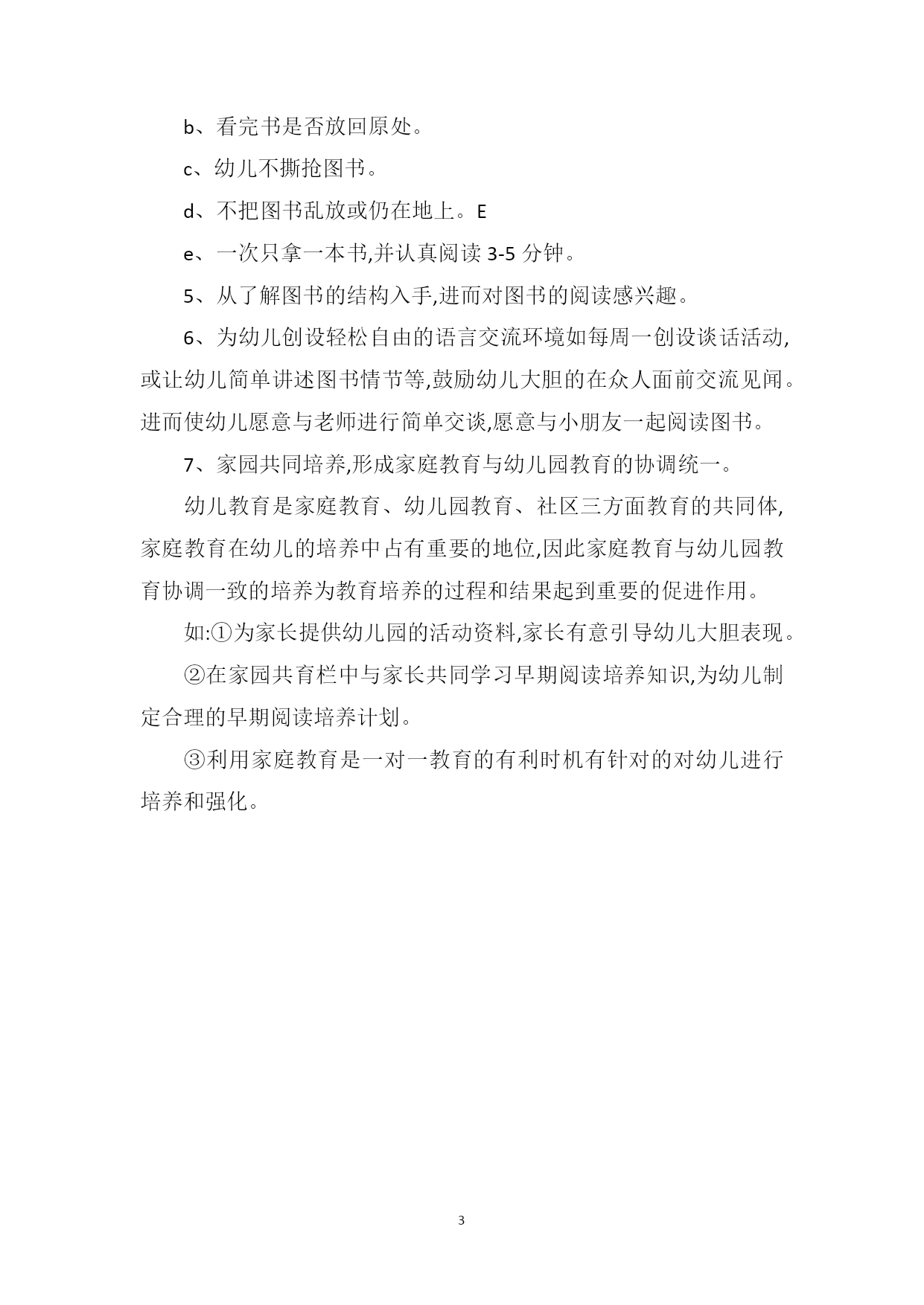 托班早期阅读教研计划总结 学年度第一学期 一、阅读是所有学科的基础 幼儿早期阅读应以培养幼儿良好的早期阅读习惯和幼儿对阅读的兴趣为主要目标。 我们在贯彻落实《纲要》的实践工作中深深体会到,良好的习惯是较好的开展幼儿教育的基础。我们观察到有的幼儿在看书时,东翻一下,西翻一下,有的幼儿把书打开,忽地一下翻到中间,又忽的一下翻到前面,个别幼儿有拿倒的现象,这阻碍了幼儿阅读的开展,因此引导幼儿形成良好的阅读习惯尤为重要。 提高幼儿的阅读兴趣是提升阅读生命力的重要方面。兴趣是积极探究某种事物或某种活动的心理倾向,它使人产生愉快的情绪体验,在精神上得到一定的满足,引导和培养幼儿的阅读兴趣,是培养幼儿阅读习惯的重要环节。 因此在幼儿期,阅读培养的主要目的就是培养幼儿良好的阅读习惯和激发幼儿对于阅读的浓厚兴趣。 一、本年龄段幼儿阅读的现状分析 1、大部分幼儿知道书怎样拿,还有一小部分幼儿有拿倒书的现象。 2、能够通过书面认识不同的图书,会假装自己在看书,有时还讲一讲书中的人物。 3、特别愿意和老师一起阅读,在引导下能够一页一页翻着看。 4、能够指认图书中的物体。 5、对于喜欢的书会反复看,并问老师书中的人物在干什么 6、对书上的薄膜很感兴趣,在看书时会把它撕掉。 7、还不能够和同伴一起阅读,自己阅读时有撕书现象。 8、阅读时间短,会不断更换图书,有时一连会拿好几本。 9、幼儿观察很仔细,往往大人不容易看到的他们能够发现。 10、偶尔有咬图书的现象,还会把图书撕破。 11、对于喜欢的哪一页会反复看,不再看下面的内容。 12、愿意把家中的图书拿到幼儿园和老师一起看。 二、本年龄段早期阅读实施目标 1、培养幼儿阅读的兴趣,引发幼儿阅读的愿望; 2、创设适宜阅读的环境; 3、培养基本的早期阅读常规,如:翻书的方法以及如何取放图书,爱护图书等; 4、丰富幼儿的生活经验,为幼儿的阅读做好物质准备。 5、愿意与小朋友与老师简单交谈; 三、实施方案与途径 1、根据幼儿年龄特点,精心选择适合幼儿阅读的色彩鲜艳、形象具体、直观、富于情趣的图书。 2、培养幼儿阅读的兴趣,每天至少翻看图书一次, 幼儿自由地翻看,随意翻看,不必一页一页地看,知道书是怎么拿着。 3、班中创设适合托班幼儿年龄的阅读环境(包括看图讲述图片,供幼儿边看边说),阅读区放置适合幼儿的婴儿画报、图片、自制图书、照片图书等,会指认书本上的物体。 4、坚持正面教育的积极影响,培养幼儿做事善始善终,养成良好的阅读习惯如: a、从书架上拿书。 b、看完书是否放回原处。 c、幼儿不撕抢图书。 d、不把图书乱放或仍在地上。E e、一次只拿一本书,并认真阅读3-5分钟。 5、从了解图书的结构入手,进而对图书的阅读感兴趣。 6、为幼儿创设轻松自由的语言交流环境如每周一创设谈话活动,或让幼儿简单讲述图书情节等,鼓励幼儿大胆的在众人面前交流见闻。进而使幼儿愿意与老师进行简单交谈,愿意与小朋友一起阅读图书。 7、家园共同培养,形成家庭教育与幼儿园教育的协调统一。 幼儿教育是家庭教育、幼儿园教育、社区三方面教育的共同体,家庭教育在幼儿的培养中占有重要的地位,因此家庭教育与幼儿园教育协调一致的培养为教育培养的过程和结果起到重要的促进作用。 如:①为家长提供幼儿园的活动资料,家长有意引导幼儿大胆表现。 ②在家园共育栏中与家长共同学习早期阅读培养知识,为幼儿制定合理的早期阅读培养计划。 ③利用家庭教育是一对一教育的有利时机有针对的对幼儿进行培养和强化。