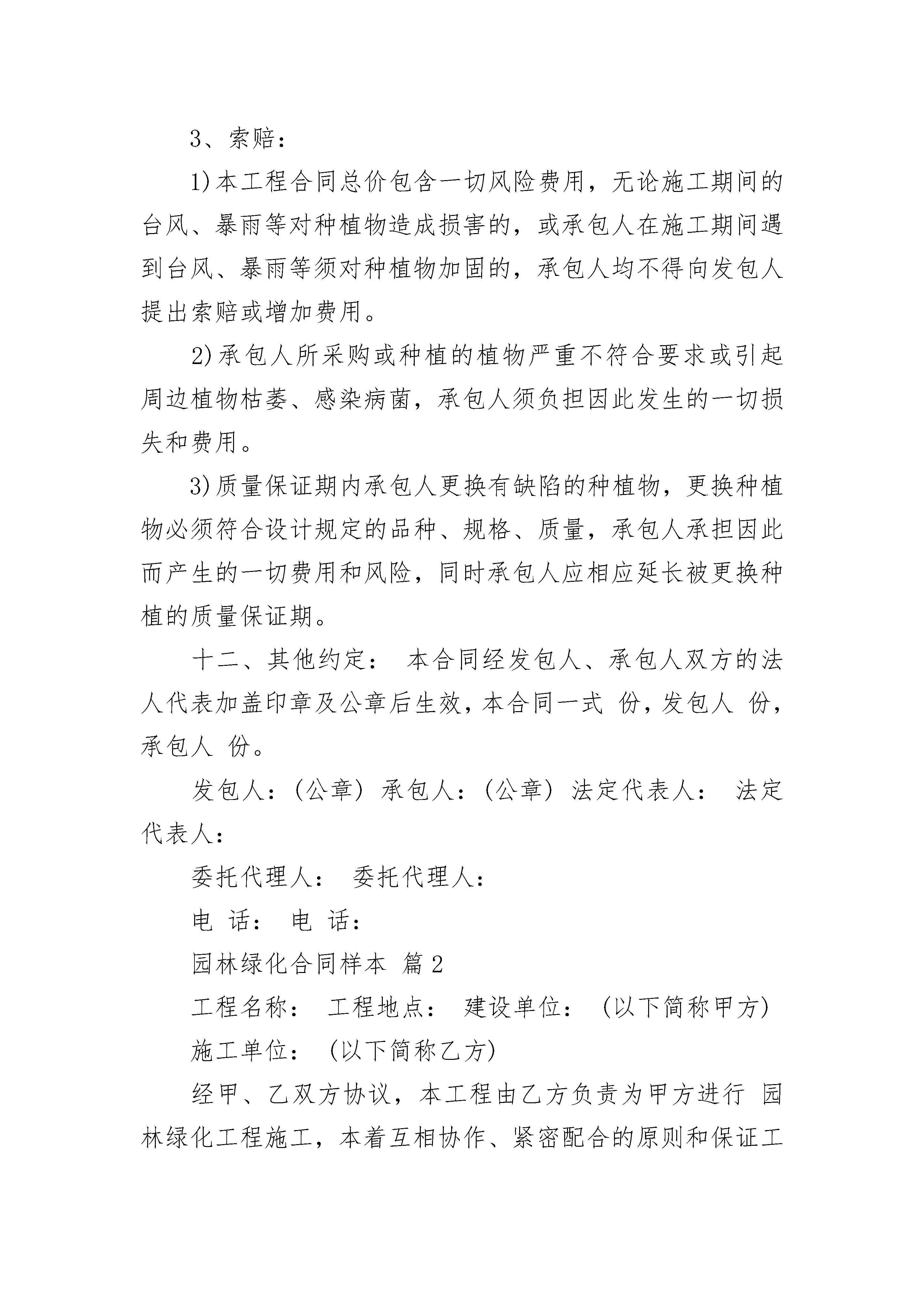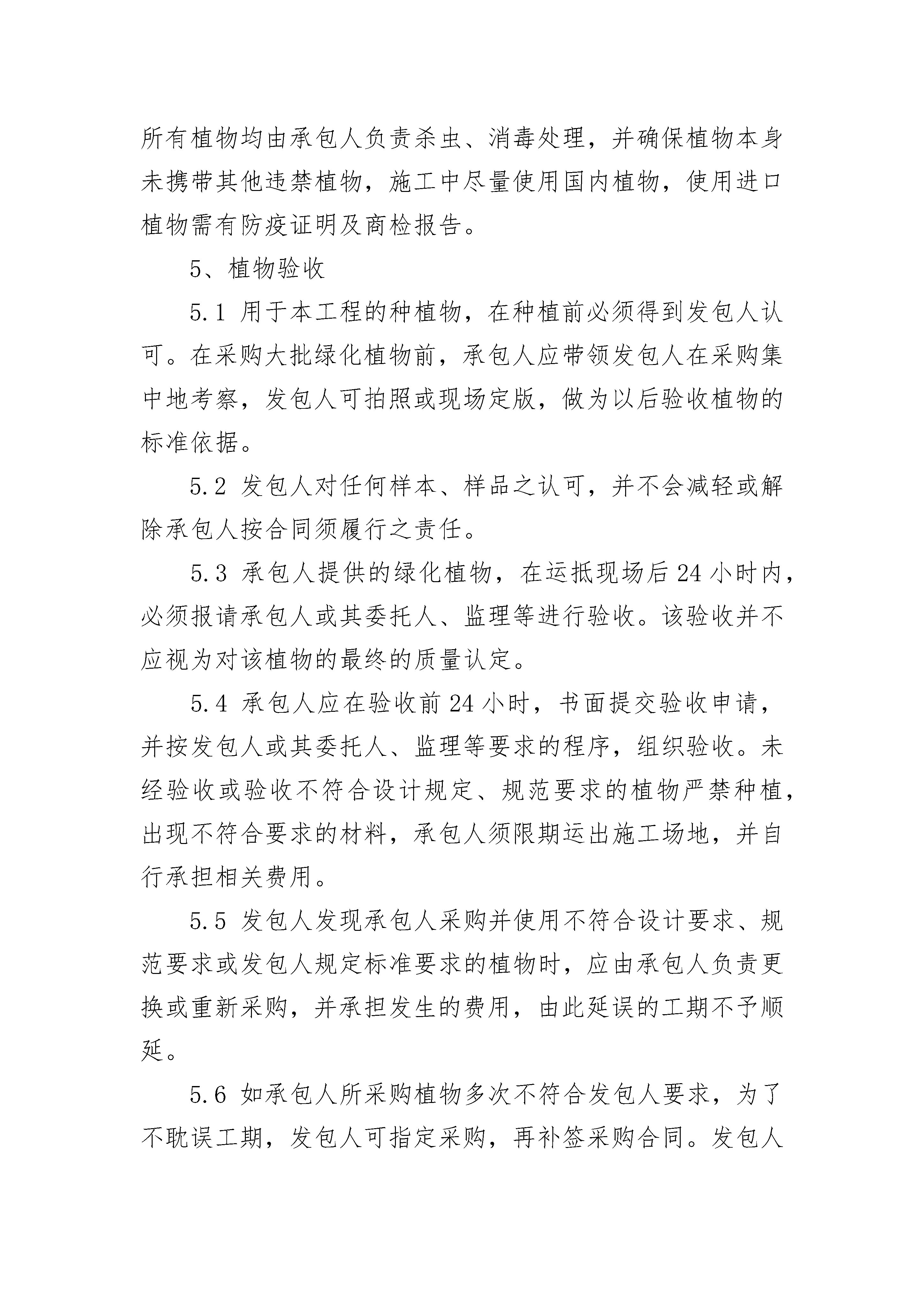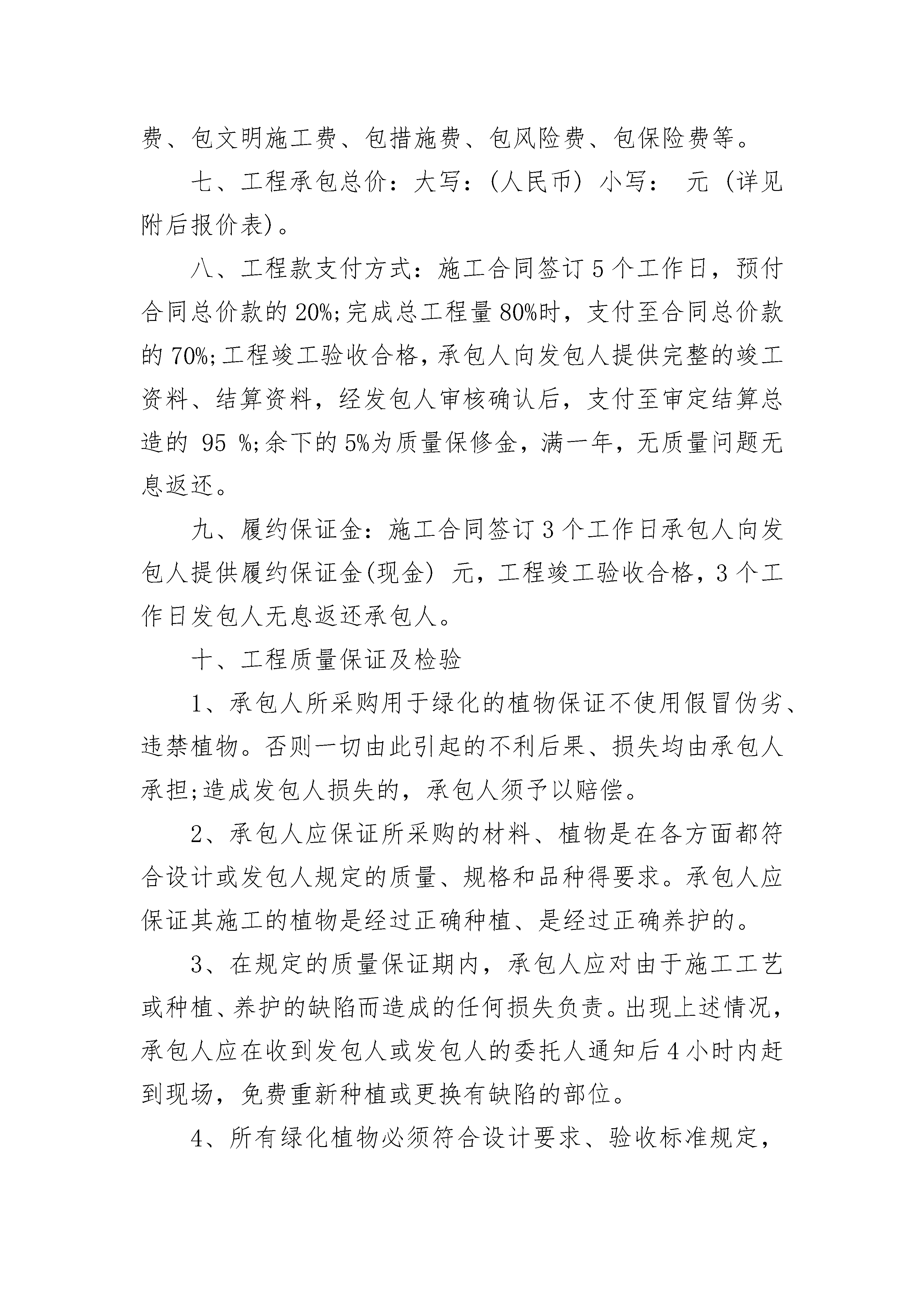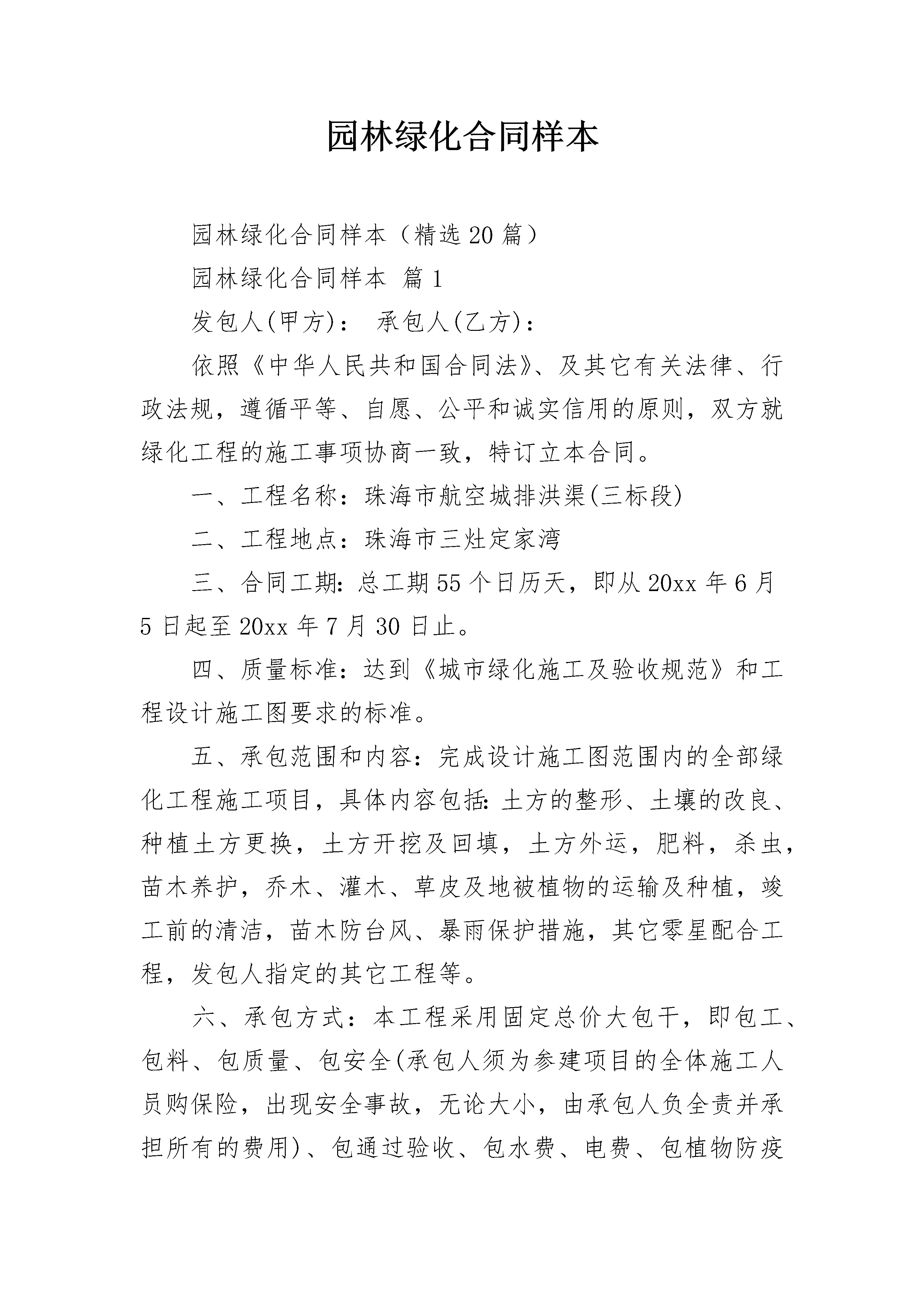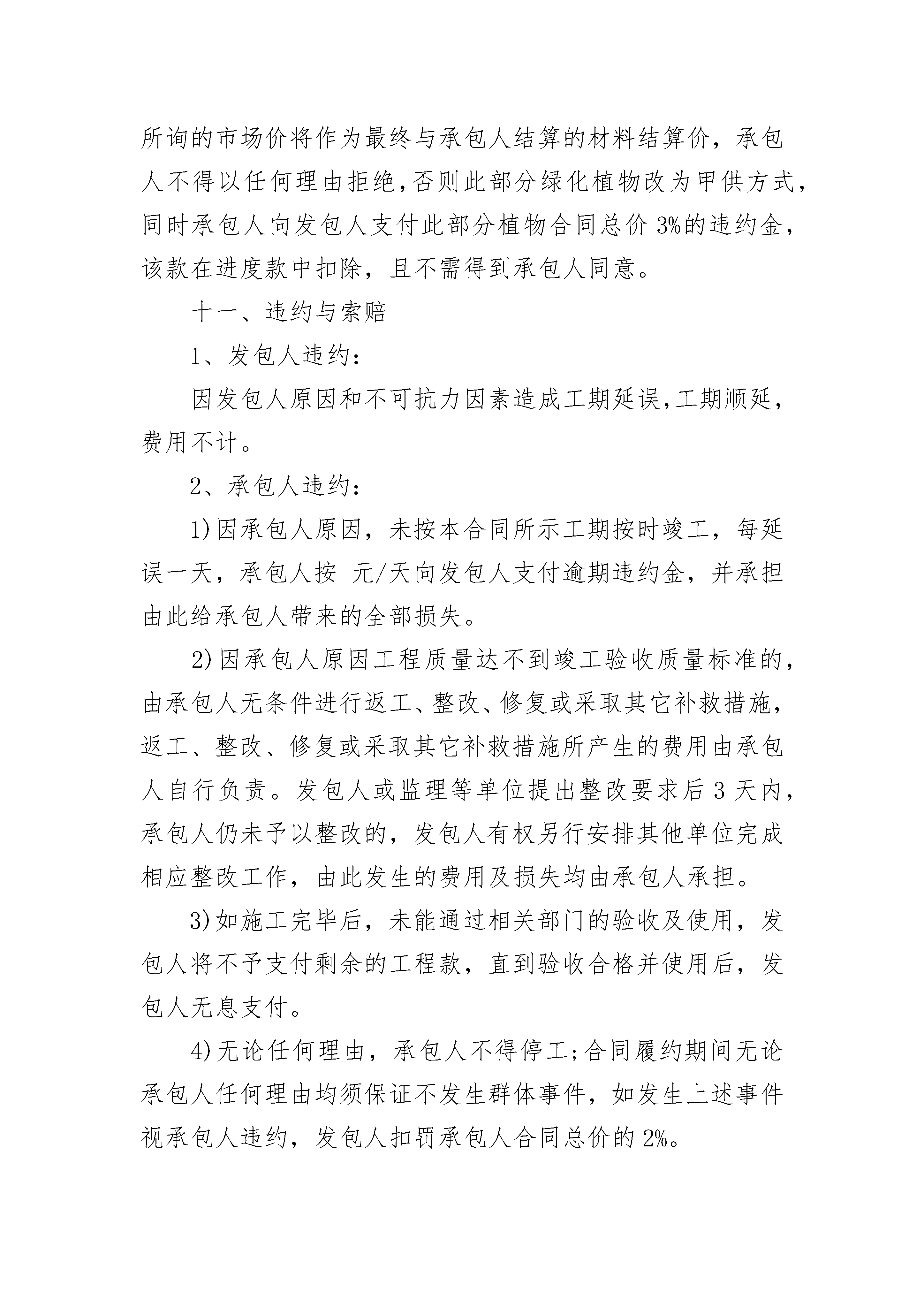 园林绿化合同样本园林绿化合同样本(精选20篇)园林绿化合同样本篇1发包人(甲方):承包人(乙方):依照《中华人民共和国合同法》、及其它有关法律、行政法规,遵循平等、自愿、公平和诚实信用的原则,双方就绿化工程的施工事项协商一致,特订立本合同。一、工程名称:珠海市航空城排洪渠(三标段)二、工程地点:珠海市三灶定家湾三、合同工期:总工期55个日历天,即从20xx年6月5日起至20xx年7月30日止。四、质量标准:达到《城市绿化施工及验收规范》和工程设计施工图要求的标准。五、承包范围和内容:完成设计施工图范围内的全部绿化工程施工项目,具体内容包括:土方的整形、土壤的改良、种植土方更换,土方开挖及回填,土方外运,肥料,杀虫,苗木养护,乔木、灌木、草皮及地被植物的运输及种植,竣工前的清洁,苗木防台风、暴雨保护措施,其它零星配合工程,发包人指定的其它工程等。六、承包方式:本工程采用固定总价大包干,即包工、包料、包质量、包安全(承包人须为参建项目的全体施工人员购保险,出现安全事故,无论大小,由承包人负全责并承担所有的费用)、包通过验收、包水费、电费、包植物防疫费、包文明施工费、包措施费、包风险费、包保险费等。七、工程承包总价:大写:(人民币)小写:元(详见附后报价表)。八、工程款支付方式:施工合同签订5个工作日,预付合同总价款的20%;完成总工程量80%时,支付至合同总价款的70%;工程竣工验收合格,承包人向发包人提供完整的竣工资料、结算资料,经发包人审核确认后,支付至审定结算总造的95%;余下的5%为质量保修金,满一年,无质量问题无息返还。九、履约保证金:施工合同签订3个工作日承包人向发包人提供履约保证金(现金)元,工程竣工验收合格,3个工作日发包人无息返还承包人。十、工程质量保证及检验1、承包人所采购用于绿化的植物保证不使用假冒伪劣、违禁植物。否则一切由此引起的不利后果、损失均由承包人承担;造成发包人损失的,承包人须予以赔偿。2、承包人应保证所采购的材料、植物是在各方面都符合设计或发包人规定的质量、规格和品种得要求。承包人应保证其施工的植物是经过正确种植、是经过正确养护的。3、在规定的质量保证期内,承包人应对由于施工工艺或种植、养护的缺陷而造成的任何损失负责。出现上述情况,承包人应在收到发包人或发包人的委托人通知后4小时内赶到现场,免费重新种植或更换有缺陷的部位。4、所有绿化植物必须符合设计要求、验收标准规定,所有植物均由承包人负责杀虫、消毒处理,并确保植物本身未携带其他违禁植物,施工中尽量使用国内植物,使用进口植物需有防疫证明及商检报告。5、植物验收5.1用于本工程的种植物,在种植前必须得到发包人认可。在采购大批绿化植物前,承包人应带领发包人在采购集中地考察,发包人可拍照或现场定版,做为以后验收植物的标准依据。5.2发包人对任何样本、样品之认可,并不会减轻或解除承包人按合同须履行之责任。5.3承包人提供的绿化植物,在运抵现场后24小时内,必须报请承包人或其委托人、监理等进行验收。该验收并不应视为对该植物的最终的质量认定。5.4承包人应在验收前24小时,书面提交验收申请,并按发包人或其委托人、监理等要求的程序,组织验收。未经验收或验收不符合设计规定、规范要求的植物严禁种植,出现不符合要求的材料,承包人须限期运出施工场地,并自行承担相关费用。5.5发包人发现承包人采购并使用不符合设计要求、规范要求或发包人规定标准要求的植物时,应由承包人负责更换或重新采购,并承担发生的费用,由此延误的工期不予顺延。5.6如承包人所采购植物多次不符合发包人要求,为了不耽误工期,发包人可指定采购,再补签采购合同。发包人所询的市场价将作为最终与承包人结算的材料结算价,承包人不得以任何理由拒绝,否则此部分绿化植物改为甲供方式,同时承包人向发包人支付此部分植物合同总价3%的违约金,该款在进度款中扣除,且不需得到承包人同意。十一、违约与索赔1、发包人违约:因发包人原因和不可抗力因素造成工期延误,工期顺延,费用不计。2、承包人违约:1)因承包人原因,未按本合同所示工期按时竣工,每延误一天,承包人按元/天向发包人支付逾期违约金,并承担由此给承包人带来的全部损失。2)因承包人原因工程质量达不到竣工验收质量标准的,由承包人无条件进行返工、整改、修复或采取其它补救措施,返工、整改、修复或采取其它补救措施所产生的费用由承包人自行负责。发包人或监理等单位提出整改要求后3天内,承包人仍未予以整改的,发包人有权另行安排其他单位完成相应整改工作,由此发生的费用及损失均由承包人承担。3)如施工完毕后,未能通过相关部门的验收及使用,发包人将不予支付剩余的工程款,直到验收合格并使用后,发包人无息支付。4)无论任何理由,承包人不得停工;合同履约期间无论承包人任何理由均须保证不发生群体事件,如发