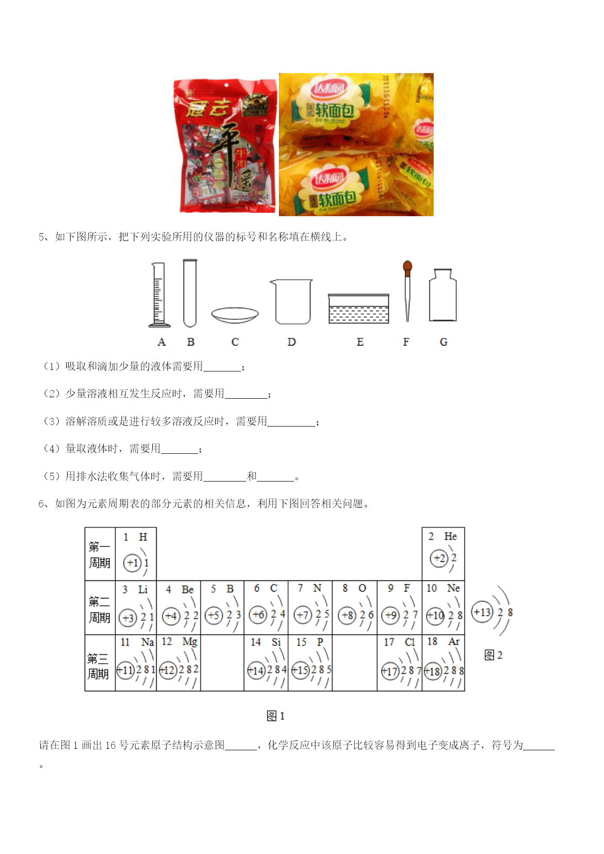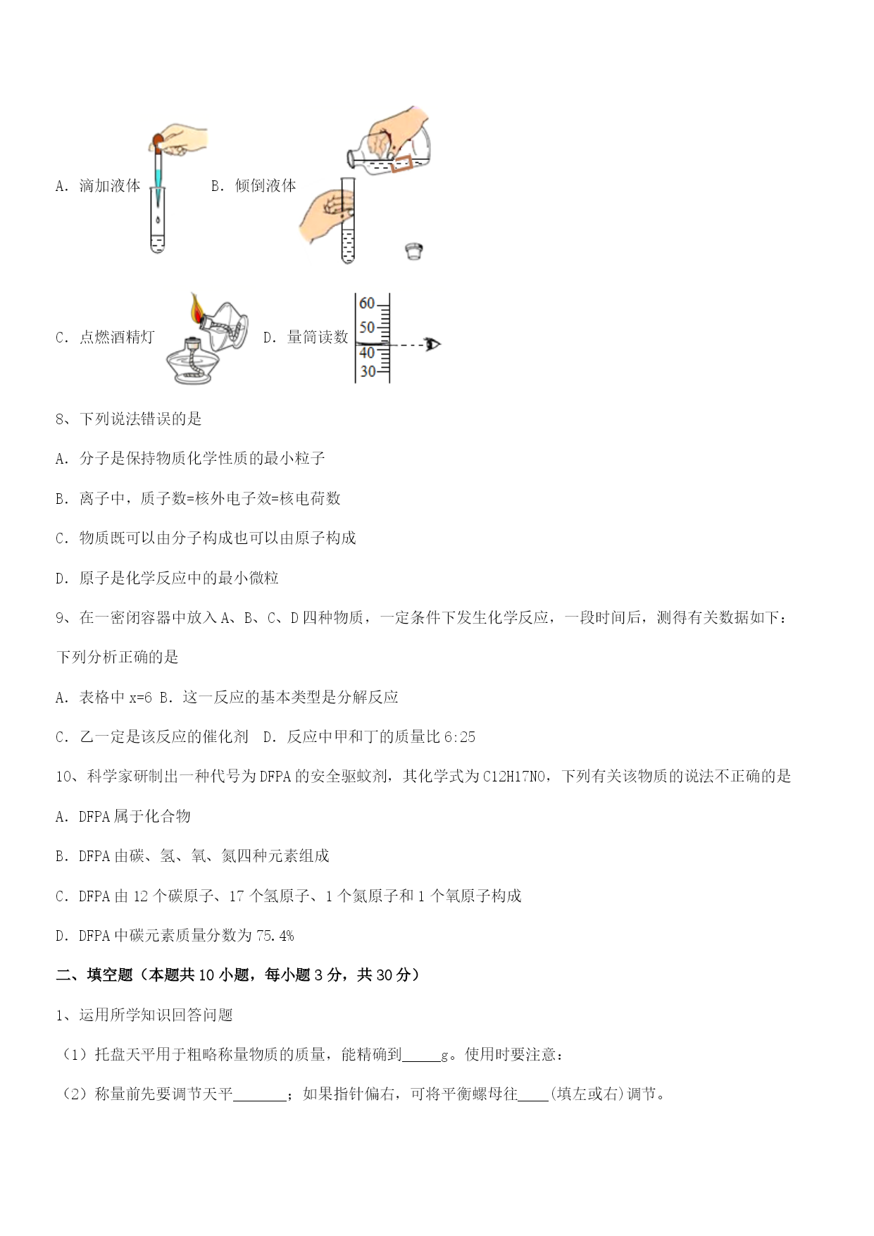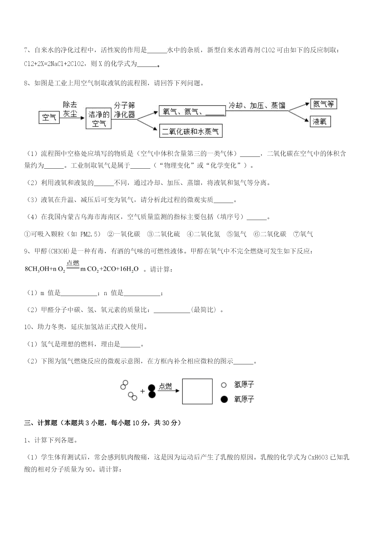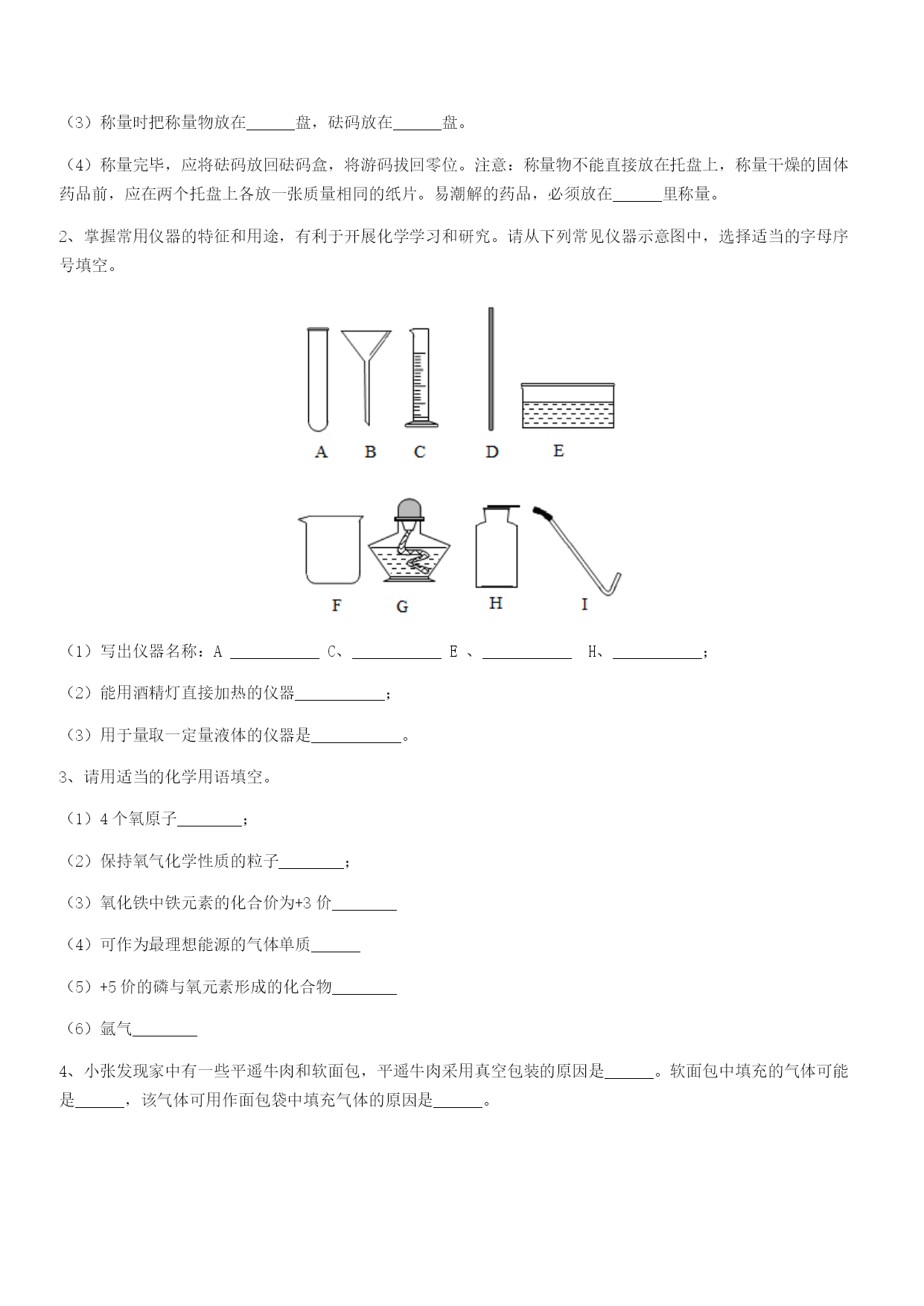 难点详解天津南开大附属中化学九年级上册期中专项训练试卷(含答案详解) 一、单项选择题(本题共10小题,每小题2分,共20分) 1、尿素[CO(NH2)2]是一种常用的化肥,其中质量分数最大的是 A.氮元素 B.氧元素 C.碳元素 D.氢元素 2、化学反应前后发生变化的是 A.元素种类 B.物质种类 C.原子种类 D.原子个数 3、某反应前后分子变化的微观示意图如下,下列说法正确的是 A.该反应为分解反应 B.反应后原子个数增多 C.该图可示意CO与O2反应 D.反应物中元素的化合价都为0 4、下列场所贴有“禁止吸烟”等消防标志的是 ①煤矿②油库③面粉厂④煤气站 A.①②④ B.①③④ C.②③④ D.①②③④ 5、下列说法正确的是 A.所有原子核都由质子和中子构成 B.混合物可能由一种元素组成 C.二氧化碳由氢原子和氧原子构成 D.气体升温时体积膨胀,是因为气体分子受热体积增大 6、每盒20mL“百菲酪”水牛高钙奶中钙的含量为240mg,这里的“钙”指的 A.元素 B.分子 C.原子 D.离子 7、下列实验操作符合规范要求的是 A.滴加液体 B.倾倒液体 C.点燃酒精灯 D.量筒读数 8、下列说法错误的是 A.分子是保持物质化学性质的最小粒子 B.离子中,质子数=核外电子效=核电荷数 C.物质既可以由分子构成也可以由原子构成 D.原子是化学反应中的最小微粒 9、在一密闭容器中放入A、B、C、D四种物质,一定条件下发生化学反应,一段时间后,测得有关数据如下: 下列分析正确的是 A.表格中x=6 B.这一反应的基本类型是分解反应 C.乙一定是该反应的催化剂 D.反应中甲和丁的质量比6:25 10、科学家研制出一种代号为DFPA的安全驱蚊剂,其化学式为C12H17NO,下列有关该物质的说法不正确的是 A.DFPA属于化合物 B.DFPA由碳、氢、氧、氮四种元素组成 C.DFPA由12个碳原子、17个氢原子、1个氮原子和1个氧原子构成 D.DFPA中碳元素质量分数为75.4% 二、填空题(本题共10小题,每小题3分,共30分) 1、运用所学知识回答问题 (1)托盘天平用于粗略称量物质的质量,能精确到_____g。使用时要注意: (2)称量前先要调节天平_______;如果指针偏右,可将平衡螺母往____(填左或右)调节。 (3)称量时把称量物放在______盘,砝码放在______盘。 (4)称量完毕,应将砝码放回砝码盒,将游码拔回零位。注意:称量物不能直接放在托盘上,称量干燥的固体药品前,应在两个托盘上各放一张质量相同的纸片。易潮解的药品,必须放在______里称量。 2、掌握常用仪器的特征和用途,有利于开展化学学习和研究。请从下列常见仪器示意图中,选择适当的字母序号填空。 (1)写出仪器名称:A___________C、___________E、___________H、___________; (2)能用酒精灯直接加热的仪器___________; (3)用于量取一定量液体的仪器是___________。 3、请用适当的化学用语填空。 (1)4个氧原子________; (2)保持氧气化学性质的粒子________; (3)氧化铁中铁元素的化合价为+3价________ (4)可作为最理想能源的气体单质______ (5)+5价的磷与氧元素形成的化合物________ (6)氩气________ 4、小张发现家中有一些平遥牛肉和软面包,平遥牛肉采用真空包装的原因是______。软面包中填充的气体可能是______,该气体可用作面包袋中填充气体的原因是______。 5、如下图所示,把下列实验所用的仪器的标号和名称填在横线上。 (1)吸取和滴加少量的液体需要用_______; (2)少量溶液相互发生反应时,需要用________; (3)溶解溶质或是进行较多溶液反应时,需要用_________; (4)量取液体时,需要用_______; (5)用排水法收集气体时,需要用________和_______。 6、如图为元素周期表的部分元素的相关信息,利用下图回答相关问题。 请在图1画出16号元素原子结构示意图______,化学反应中该原子比较容易得到电子变成离子,符号为______。 7、自来水的净化过程中,活性炭的作用是______水中的杂质,新型自来水消毒剂ClO2可由如下的反应制取:Cl2+2X=2NaCl+2ClO2,则X的化学式为______。 8、如图是工业上用空气制取液氧的流程图,请回答下列问题。 (1)流程图中空格处应填写的物质是(空气中体积含量第三的一类气体)______,二氧化碳在空气中的体积含量约为______。工业制取氧气是属于______(“物理变化”或“化学变化”)。 (2)利用液氧和液氮