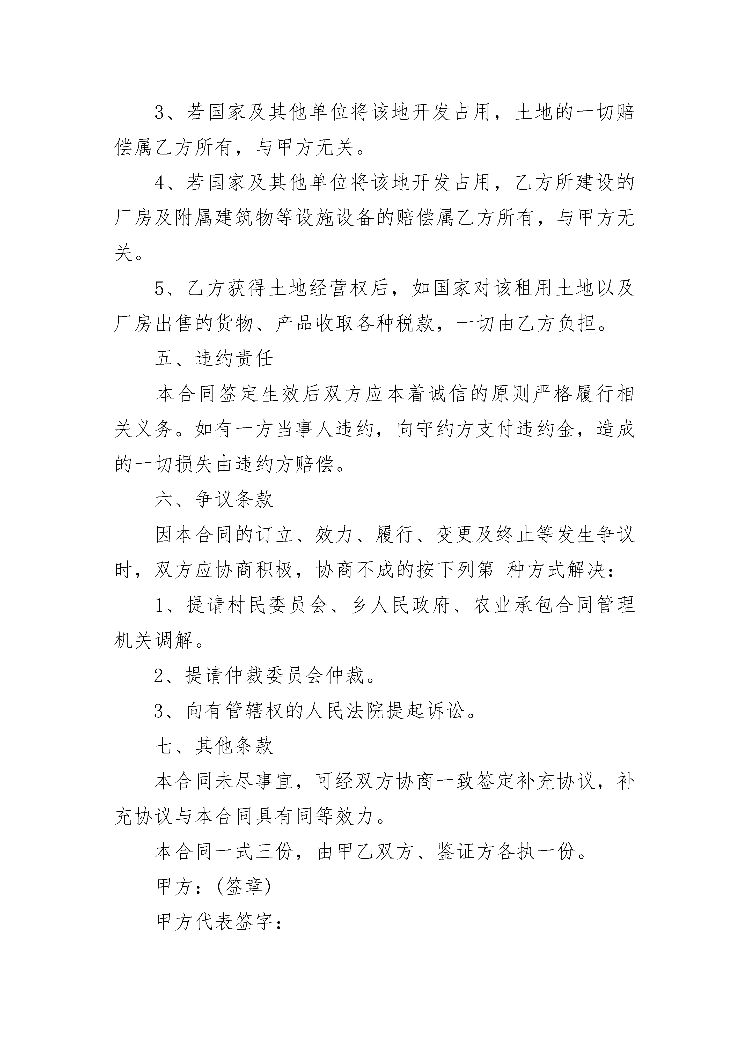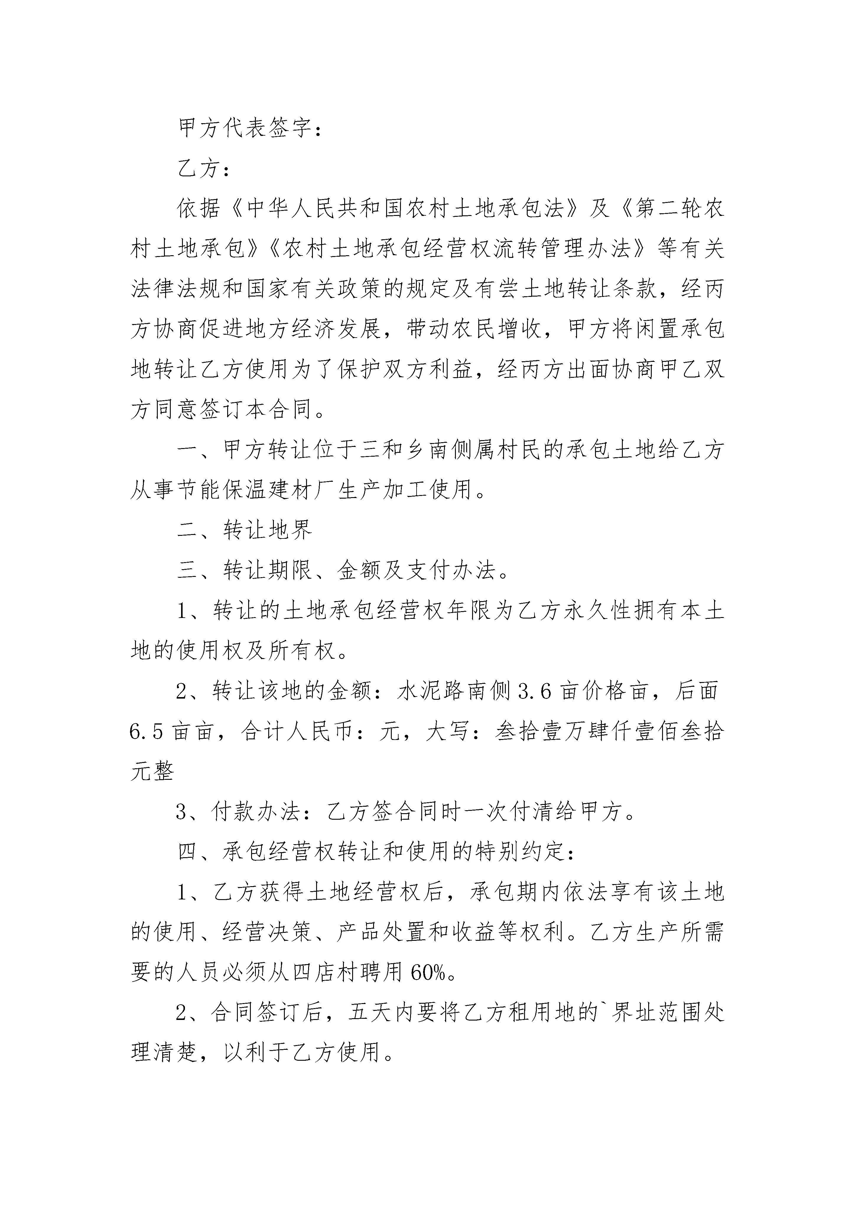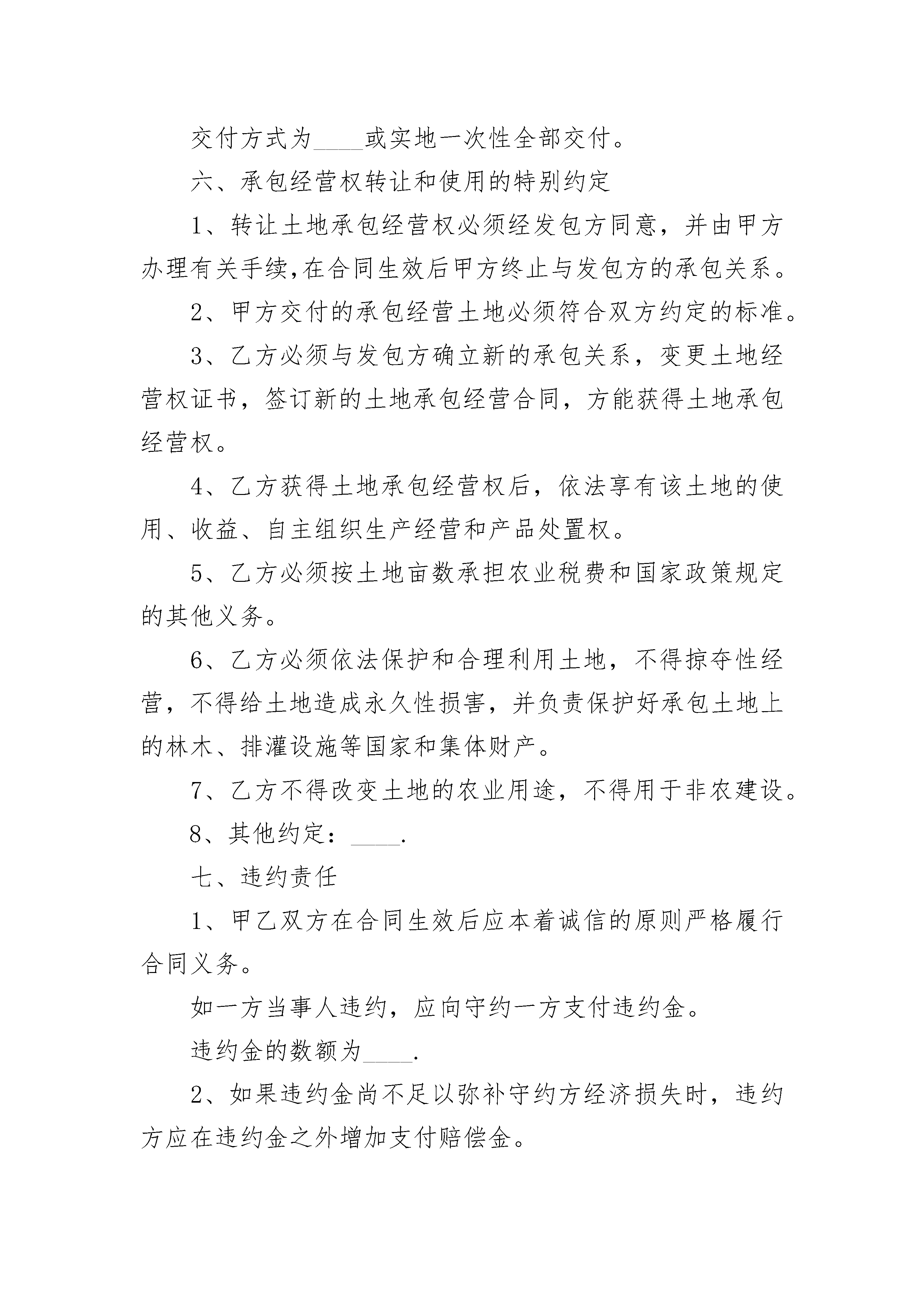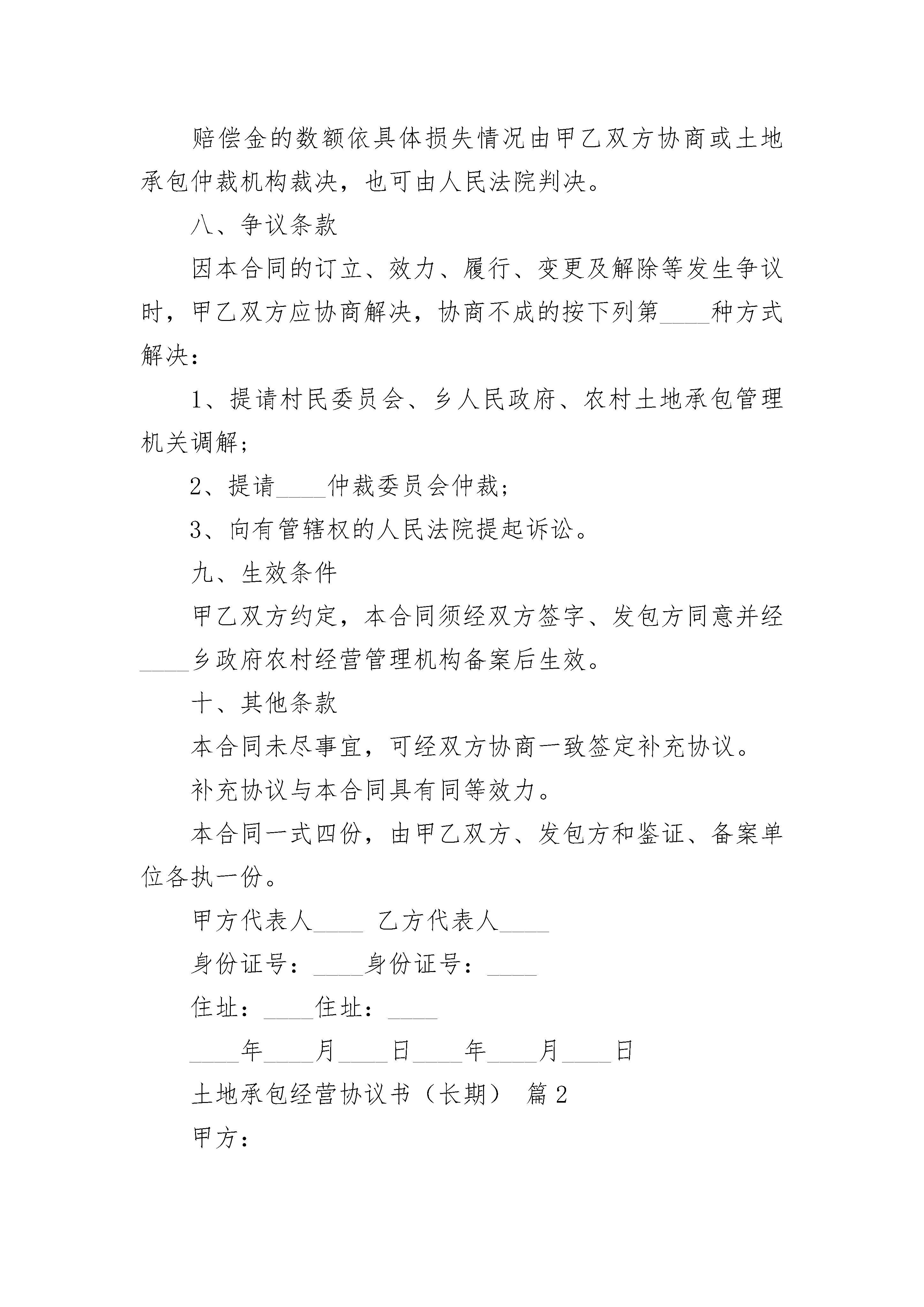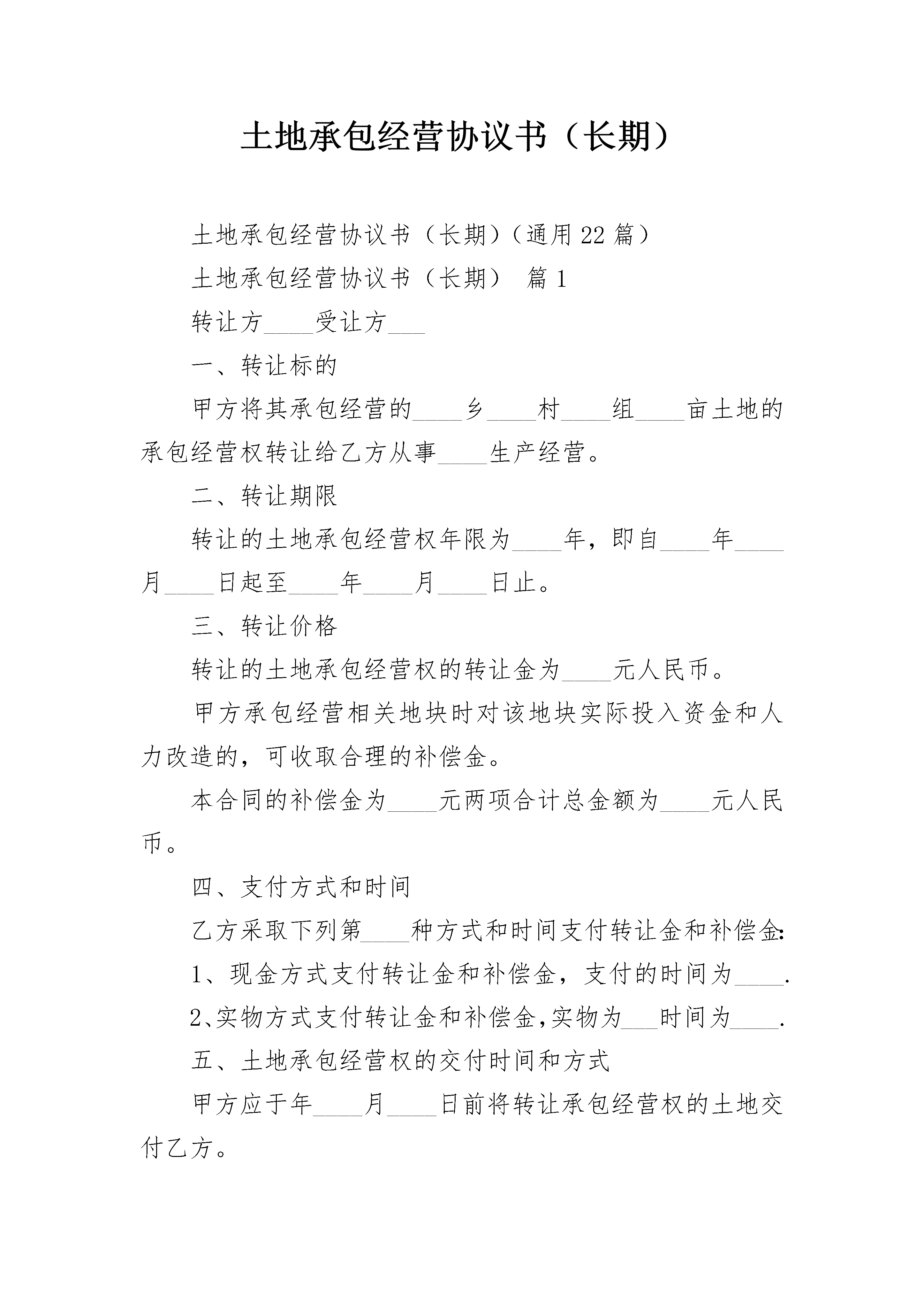 土地承包经营协议书(长期)土地承包经营协议书(长期)(通用22篇)土地承包经营协议书(长期)篇1转让方____受让方___一、转让标的甲方将其承包经营的____乡____村____组____亩土地的承包经营权转让给乙方从事____生产经营。二、转让期限转让的土地承包经营权年限为____年,即自____年____月____日起至____年____月____日止。三、转让价格转让的土地承包经营权的转让金为____元人民币。甲方承包经营相关地块时对该地块实际投入资金和人力改造的,可收取合理的补偿金。本合同的补偿金为____元两项合计总金额为____元人民币。四、支付方式和时间乙方采取下列第____种方式和时间支付转让金和补偿金:1、现金方式支付转让金和补偿金,支付的时间为____.2、实物方式支付转让金和补偿金,实物为___时间为____.五、土地承包经营权的交付时间和方式甲方应于年____月____日前将转让承包经营权的土地交付乙方。交付方式为____或实地一次性全部交付。六、承包经营权转让和使用的特别约定1、转让土地承包经营权必须经发包方同意,并由甲方办理有关手续,在合同生效后甲方终止与发包方的承包关系。2、甲方交付的承包经营土地必须符合双方约定的标准。3、乙方必须与发包方确立新的承包关系,变更土地经营权证书,签订新的土地承包经营合同,方能获得土地承包经营权。4、乙方获得土地承包经营权后,依法享有该土地的使用、收益、自主组织生产经营和产品处置权。5、乙方必须按土地亩数承担农业税费和国家政策规定的其他义务。6、乙方必须依法保护和合理利用土地,不得掠夺性经营,不得给土地造成永久性损害,并负责保护好承包土地上的林木、排灌设施等国家和集体财产。7、乙方不得改变土地的农业用途,不得用于非农建设。8、其他约定:____.七、违约责任1、甲乙双方在合同生效后应本着诚信的原则严格履行合同义务。如一方当事人违约,应向守约一方支付违约金。违约金的数额为____.2、如果违约金尚不足以弥补守约方经济损失时,违约方应在违约金之外增加支付赔偿金。赔偿金的数额依具体损失情况由甲乙双方协商或土地承包仲裁机构裁决,也可由人民法院判决。八、争议条款因本合同的订立、效力、履行、变更及解除等发生争议时,甲乙双方应协商解决,协商不成的按下列第____种方式解决:1、提请村民委员会、乡人民政府、农村土地承包管理机关调解;2、提请____仲裁委员会仲裁;3、向有管辖权的人民法院提起诉讼。九、生效条件甲乙双方约定,本合同须经双方签字、发包方同意并经____乡政府农村经营管理机构备案后生效。十、其他条款本合同未尽事宜,可经双方协商一致签定补充协议。补充协议与本合同具有同等效力。本合同一式四份,由甲乙双方、发包方和鉴证、备案单位各执一份。甲方代表人____乙方代表人____身份证号:____身份证号:____住址:____住址:________年____月____日____年____月____日土地承包经营协议书(长期)篇2甲方:甲方代表签字:乙方:依据《中华人民共和国农村土地承包法》及《第二轮农村土地承包》《农村土地承包经营权流转管理办法》等有关法律法规和国家有关政策的规定及有尝土地转让条款,经丙方协商促进地方经济发展,带动农民增收,甲方将闲置承包地转让乙方使用为了保护双方利益,经丙方出面协商甲乙双方同意签订本合同。一、甲方转让位于三和乡南侧属村民的承包土地给乙方从事节能保温建材厂生产加工使用。二、转让地界三、转让期限、金额及支付办法。1、转让的土地承包经营权年限为乙方永久性拥有本土地的使用权及所有权。2、转让该地的金额:水泥路南侧3.6亩价格亩,后面6.5亩亩,合计人民币:元,大写:叁拾壹万肆仟壹佰叁拾元整3、付款办法:乙方签合同时一次付清给甲方。四、承包经营权转让和使用的特别约定:1、乙方获得土地经营权后,承包期内依法享有该土地的使用、经营决策、产品处置和收益等权利。乙方生产所需要的人员必须从四店村聘用60%。2、合同签订后,五天内要将乙方租用地的`界址范围处理清楚,以利于乙方使用。3、若国家及其他单位将该地开发占用,土地的一切赔偿属乙方所有,与甲方无关。4、若国家及其他单位将该地开发占用,乙方所建设的厂房及附属建筑物等设施设备的赔偿属乙方所有,与甲方无关。5、乙方获得土地经营权后,如国家对该租用土地以及厂房出售的货物、产品收取各种税款,一切由乙方负担。五、违约责任本合同签定生效后双方应本着诚信的原则严格履行相关义务。如有一方当事人违约,向守约方支付违约金,造成的一切损失由违约方赔偿。六、争议条款因本合同的订立、效力、履行、变更及终止等发生争议时,双方应协商积极,协商不成的按下列第种方式解决:1、提请村民委员会、乡人民政府、农业承包合同管理机关调解。2、提请仲裁委员会