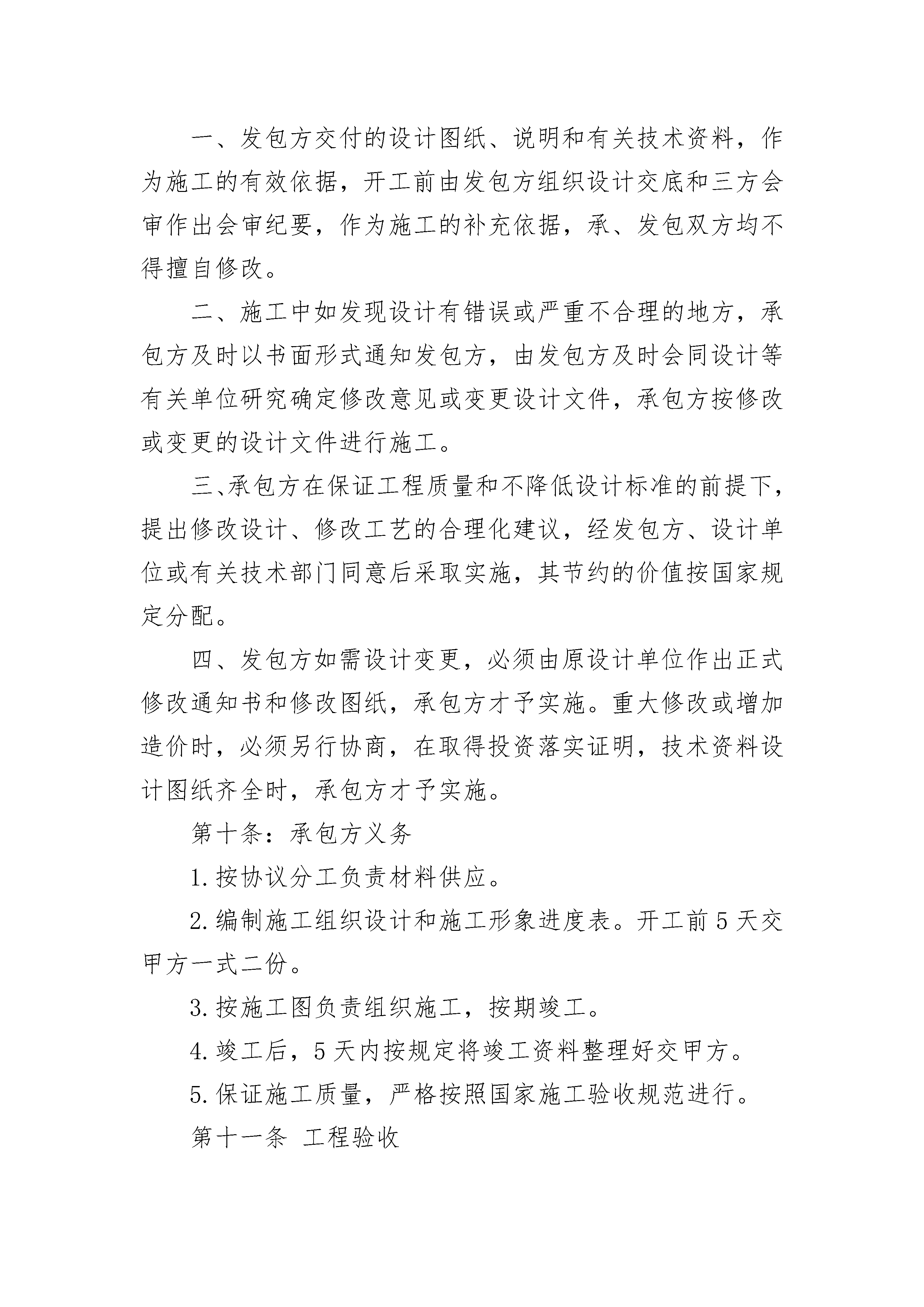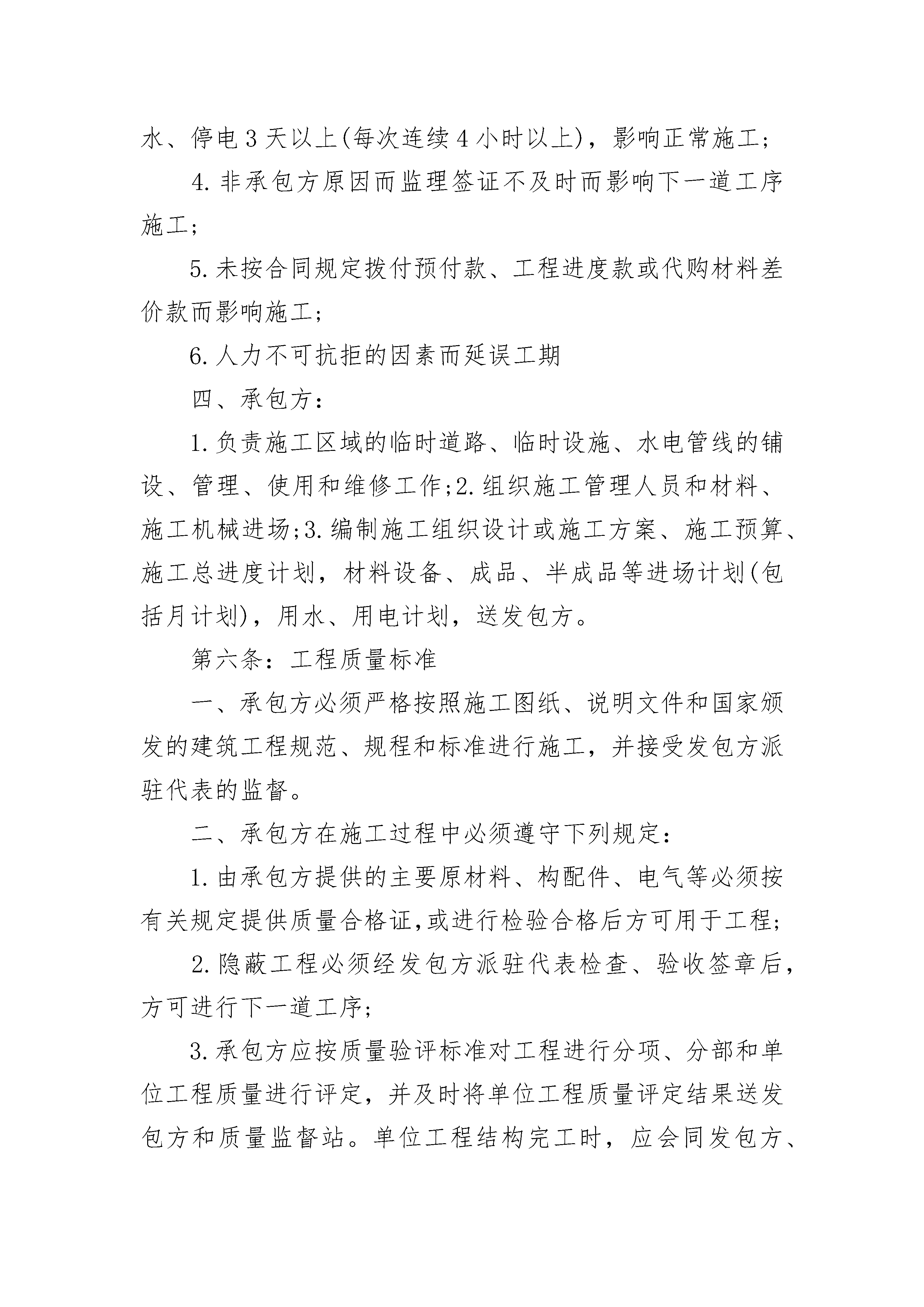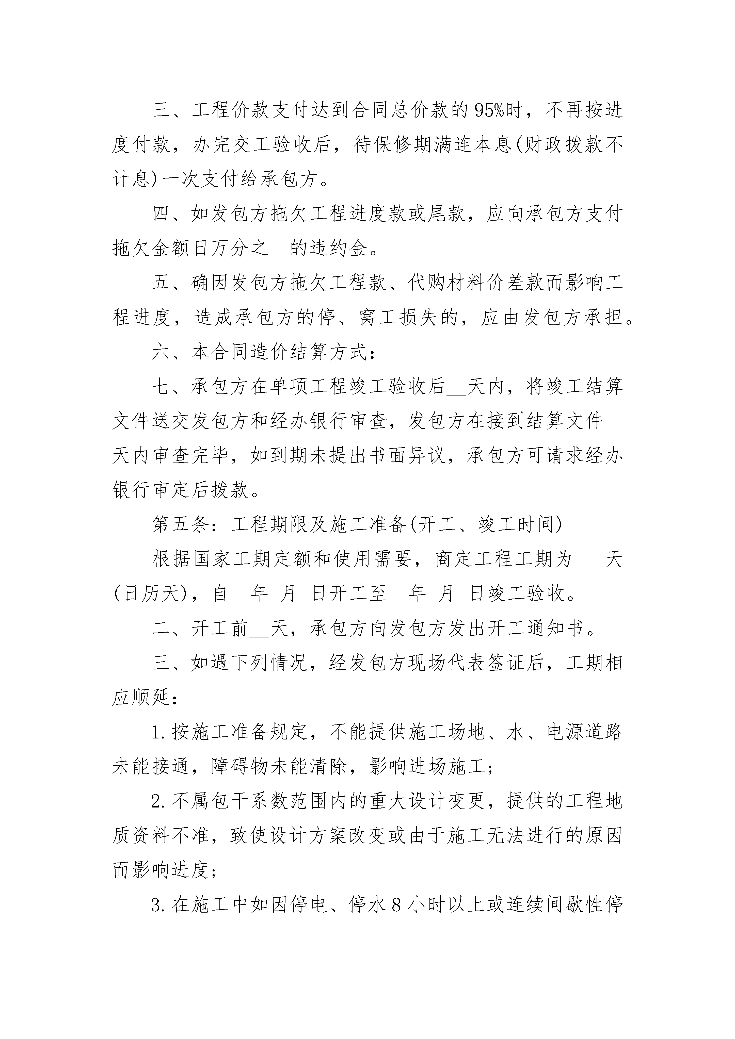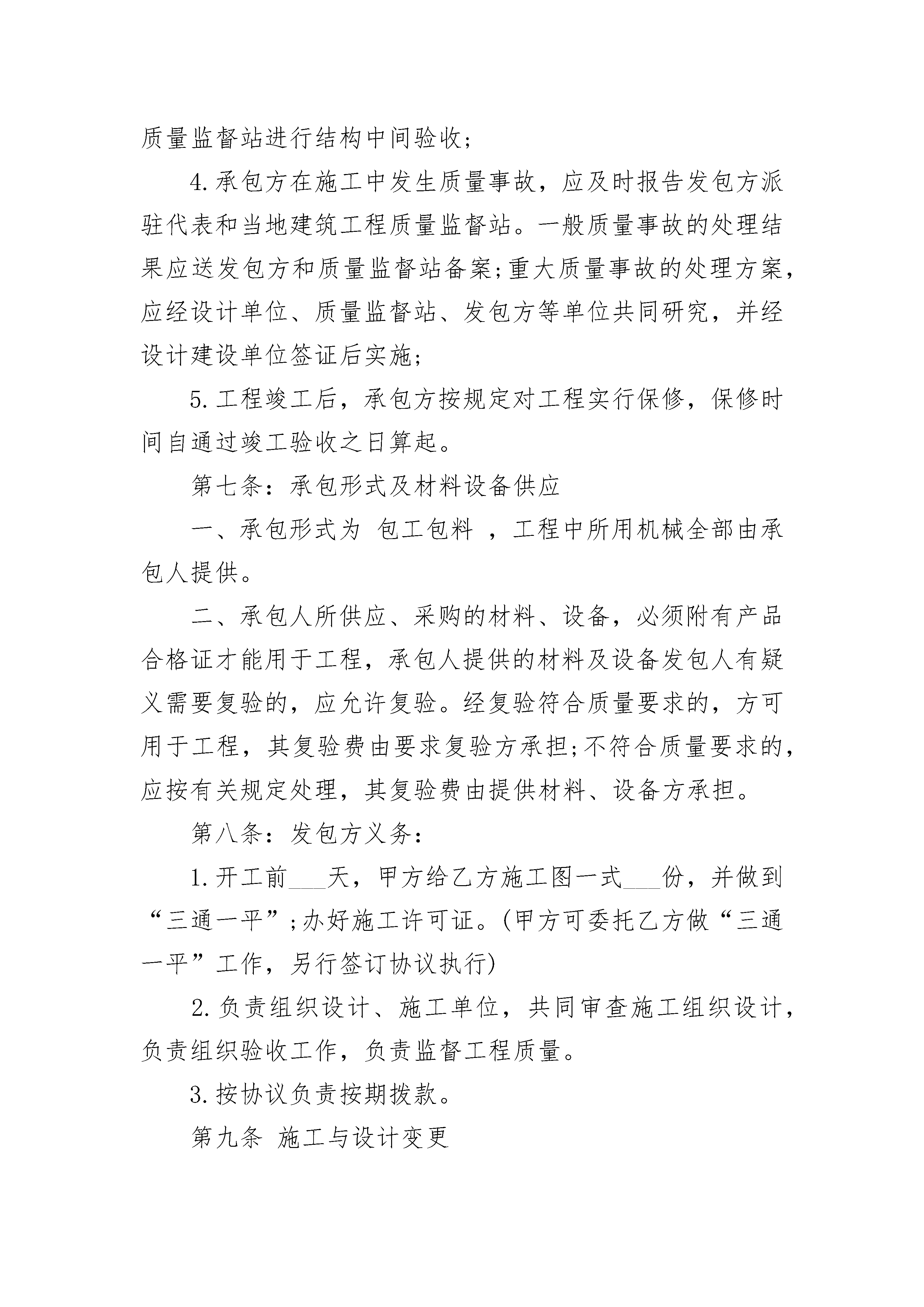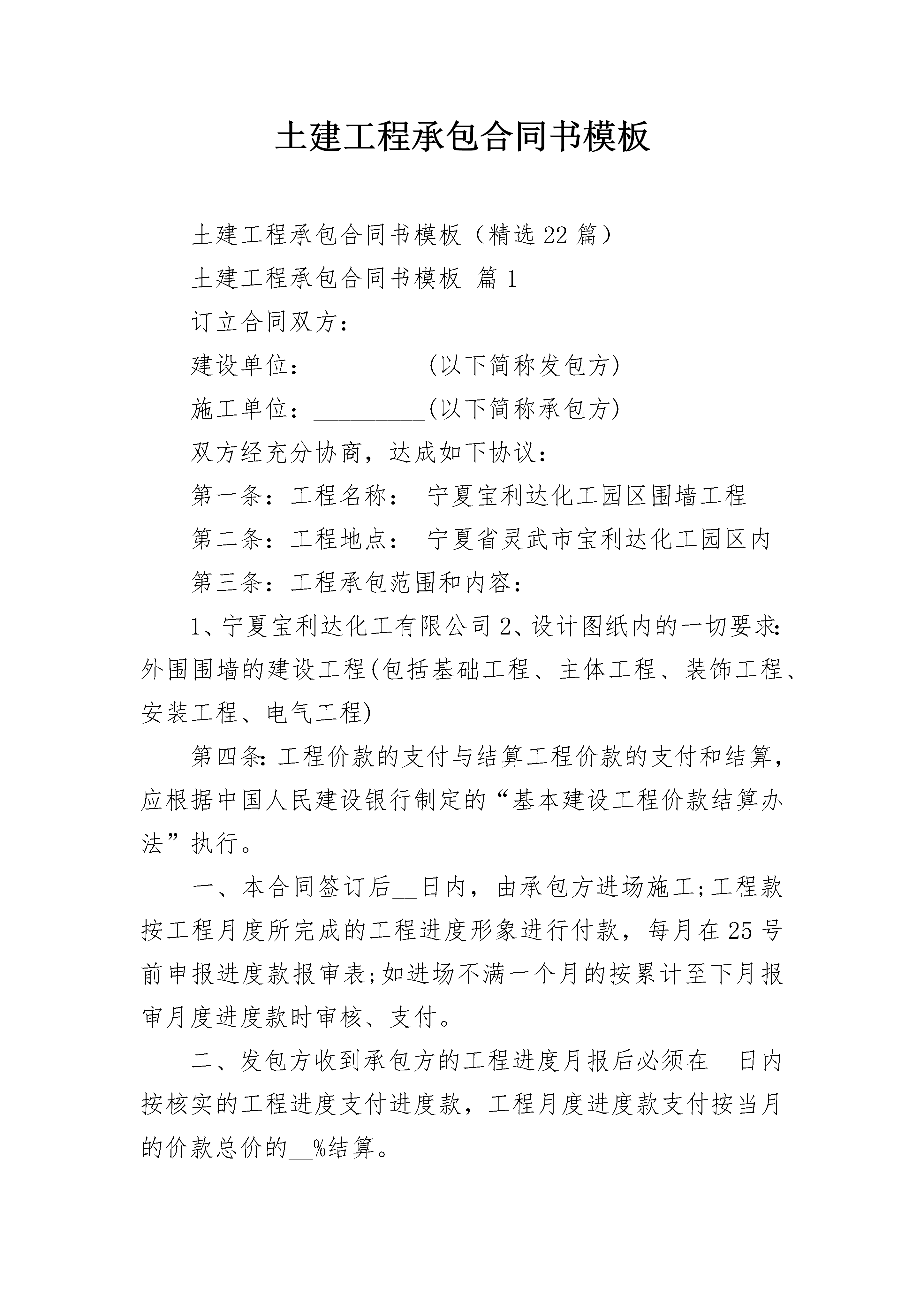 土建工程承包合同书模板土建工程承包合同书模板(精选22篇)土建工程承包合同书模板篇1订立合同双方:建设单位:_________(以下简称发包方)施工单位:_________(以下简称承包方)双方经充分协商,达成如下协议:第一条:工程名称:宁夏宝利达化工园区围墙工程第二条:工程地点:宁夏省灵武市宝利达化工园区内第三条:工程承包范围和内容:1、宁夏宝利达化工有限公司2、设计图纸内的一切要求:外围围墙的建设工程(包括基础工程、主体工程、装饰工程、安装工程、电气工程)第四条:工程价款的支付与结算工程价款的支付和结算,应根据中国人民建设银行制定的“基本建设工程价款结算办法”执行。一、本合同签订后__日内,由承包方进场施工;工程款按工程月度所完成的工程进度形象进行付款,每月在25号前申报进度款报审表;如进场不满一个月的按累计至下月报审月度进度款时审核、支付。二、发包方收到承包方的工程进度月报后必须在__日内按核实的工程进度支付进度款,工程月度进度款支付按当月的价款总价的__%结算。三、工程价款支付达到合同总价款的95%时,不再按进度付款,办完交工验收后,待保修期满连本息(财政拨款不计息)一次支付给承包方。四、如发包方拖欠工程进度款或尾款,应向承包方支付拖欠金额日万分之__的违约金。五、确因发包方拖欠工程款、代购材料价差款而影响工程进度,造成承包方的停、窝工损失的,应由发包方承担。六、本合同造价结算方式:____________________七、承包方在单项工程竣工验收后__天内,将竣工结算文件送交发包方和经办银行审查,发包方在接到结算文件__天内审查完毕,如到期未提出书面异议,承包方可请求经办银行审定后拨款。第五条:工程期限及施工准备(开工、竣工时间)根据国家工期定额和使用需要,商定工程工期为___天(日历天),自__年_月_日开工至__年_月_日竣工验收。二、开工前__天,承包方向发包方发出开工通知书。三、如遇下列情况,经发包方现场代表签证后,工期相应顺延:1.按施工准备规定,不能提供施工场地、水、电源道路未能接通,障碍物未能清除,影响进场施工;2.不属包干系数范围内的重大设计变更,提供的工程地质资料不准,致使设计方案改变或由于施工无法进行的原因而影响进度;3.在施工中如因停电、停水8小时以上或连续间歇性停水、停电3天以上(每次连续4小时以上),影响正常施工;4.非承包方原因而监理签证不及时而影响下一道工序施工;5.未按合同规定拨付预付款、工程进度款或代购材料差价款而影响施工;6.人力不可抗拒的因素而延误工期四、承包方:1.负责施工区域的临时道路、临时设施、水电管线的铺设、管理、使用和维修工作;2.组织施工管理人员和材料、施工机械进场;3.编制施工组织设计或施工方案、施工预算、施工总进度计划,材料设备、成品、半成品等进场计划(包括月计划),用水、用电计划,送发包方。第六条:工程质量标准一、承包方必须严格按照施工图纸、说明文件和国家颁发的建筑工程规范、规程和标准进行施工,并接受发包方派驻代表的监督。二、承包方在施工过程中必须遵守下列规定:1.由承包方提供的主要原材料、构配件、电气等必须按有关规定提供质量合格证,或进行检验合格后方可用于工程;2.隐蔽工程必须经发包方派驻代表检查、验收签章后,方可进行下一道工序;3.承包方应按质量验评标准对工程进行分项、分部和单位工程质量进行评定,并及时将单位工程质量评定结果送发包方和质量监督站。单位工程结构完工时,应会同发包方、质量监督站进行结构中间验收;4.承包方在施工中发生质量事故,应及时报告发包方派驻代表和当地建筑工程质量监督站。一般质量事故的处理结果应送发包方和质量监督站备案;重大质量事故的处理方案,应经设计单位、质量监督站、发包方等单位共同研究,并经设计建设单位签证后实施;5.工程竣工后,承包方按规定对工程实行保修,保修时间自通过竣工验收之日算起。第七条:承包形式及材料设备供应一、承包形式为包工包料,工程中所用机械全部由承包人提供。二、承包人所供应、采购的材料、设备,必须附有产品合格证才能用于工程,承包人提供的材料及设备发包人有疑义需要复验的,应允许复验。经复验符合质量要求的,方可用于工程,其复验费由要求复验方承担;不符合质量要求的,应按有关规定处理,其复验费由提供材料、设备方承担。第八条:发包方义务:1.开工前___天,甲方给乙方施工图一式___份,并做到“三通一平”;办好施工许可证。(甲方可委托乙方做“三通一平”工作,另行签订协议执行)2.负责组织设计、施工单位,共同审查施工组织设计,负责组织验收工作,负责监督工程质量。3.按协议负责按期拨款。第九条施工与设计变更一、发包方交付的设计图纸、说明和有关技术资料,作为施工的有效依据,开工前由发包方组织设计交底和三方会审作出会审纪要,作为施工的