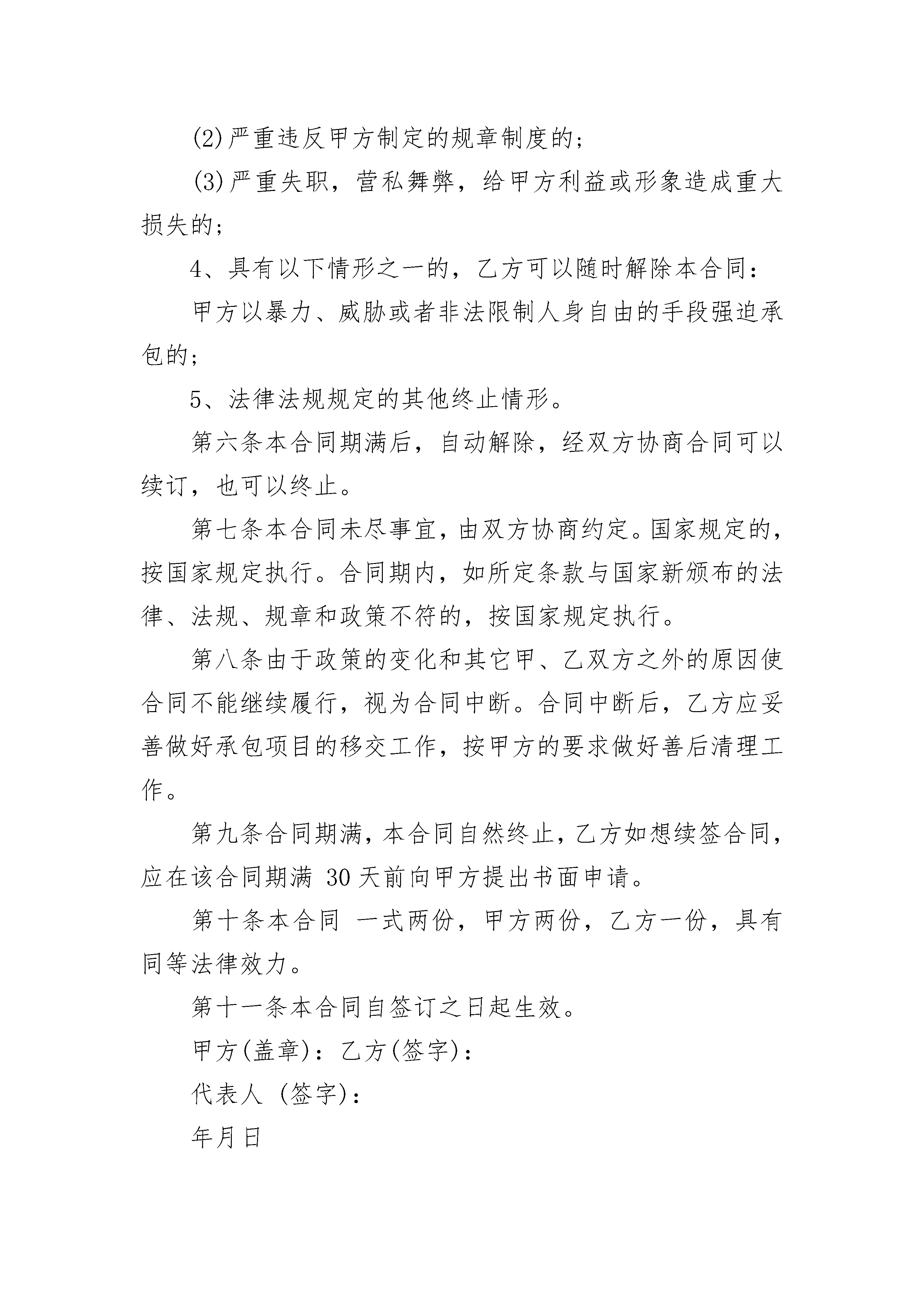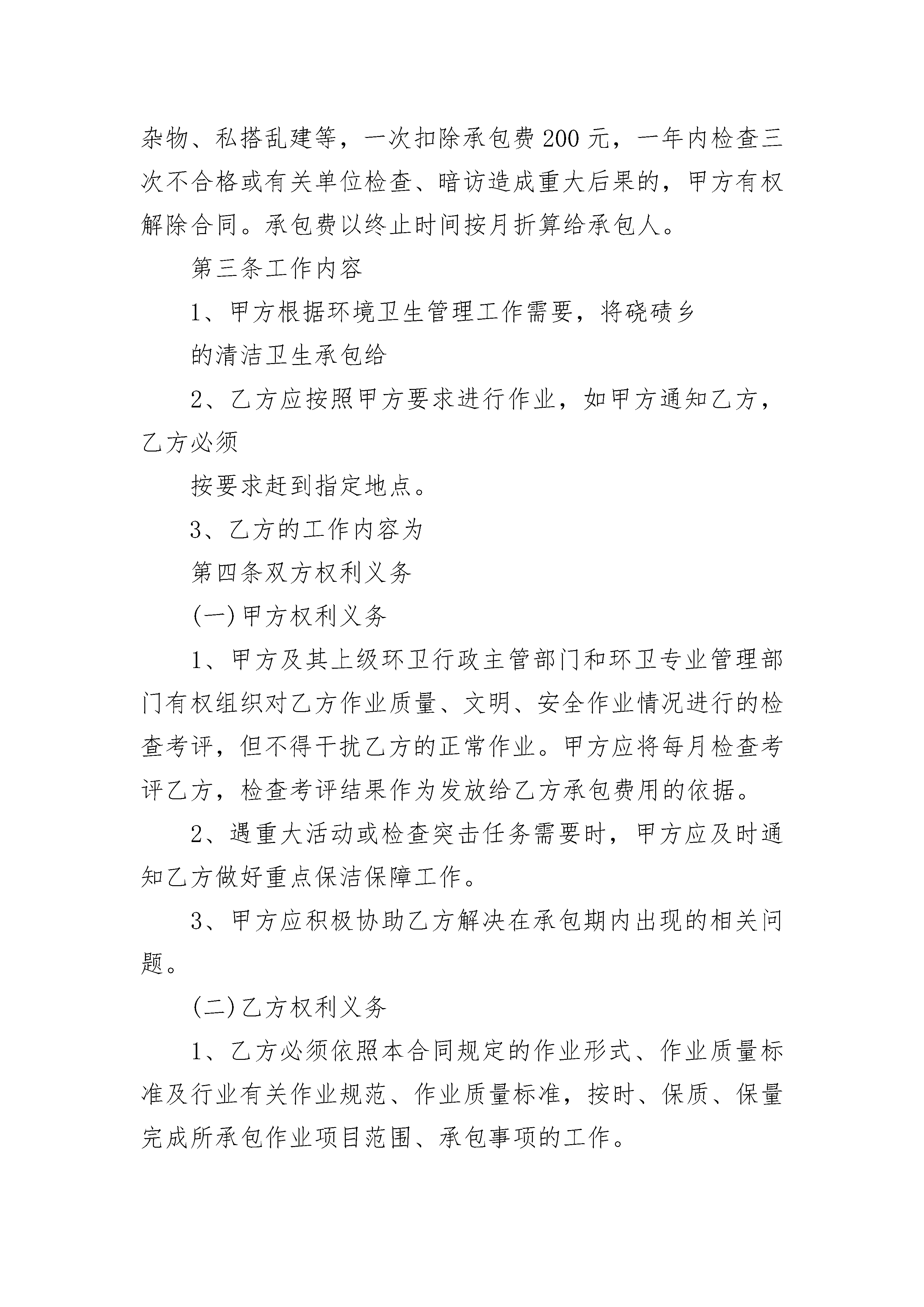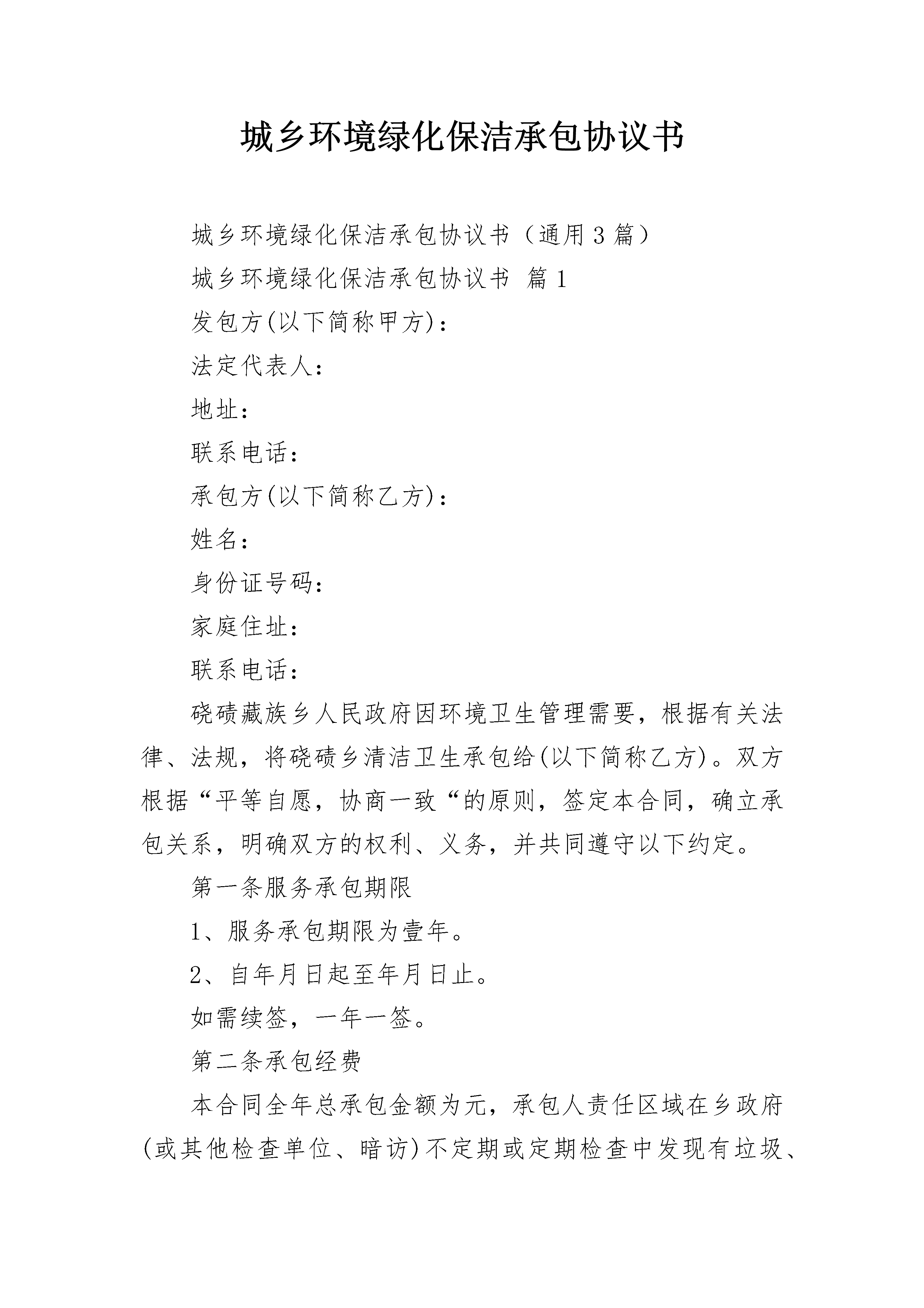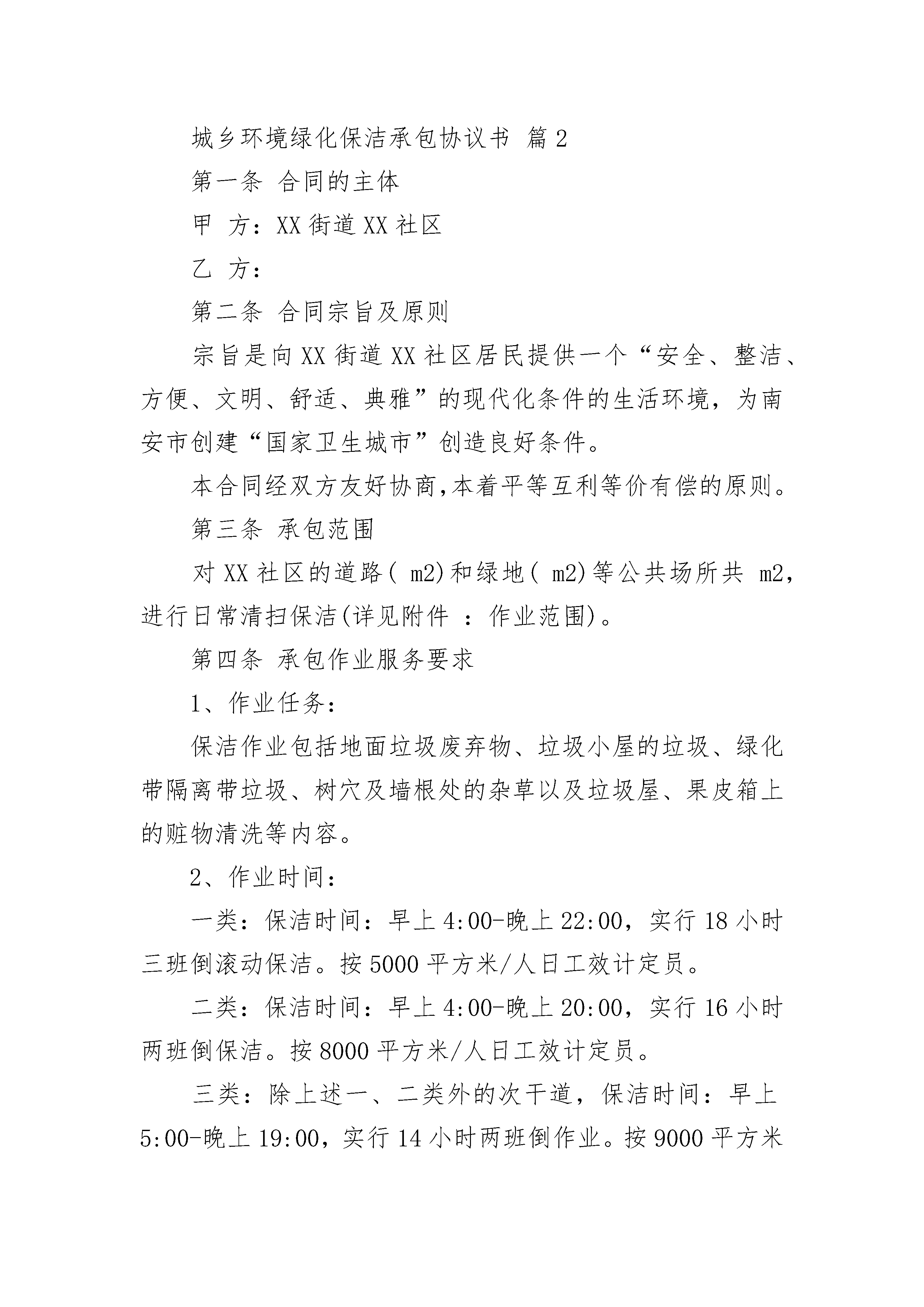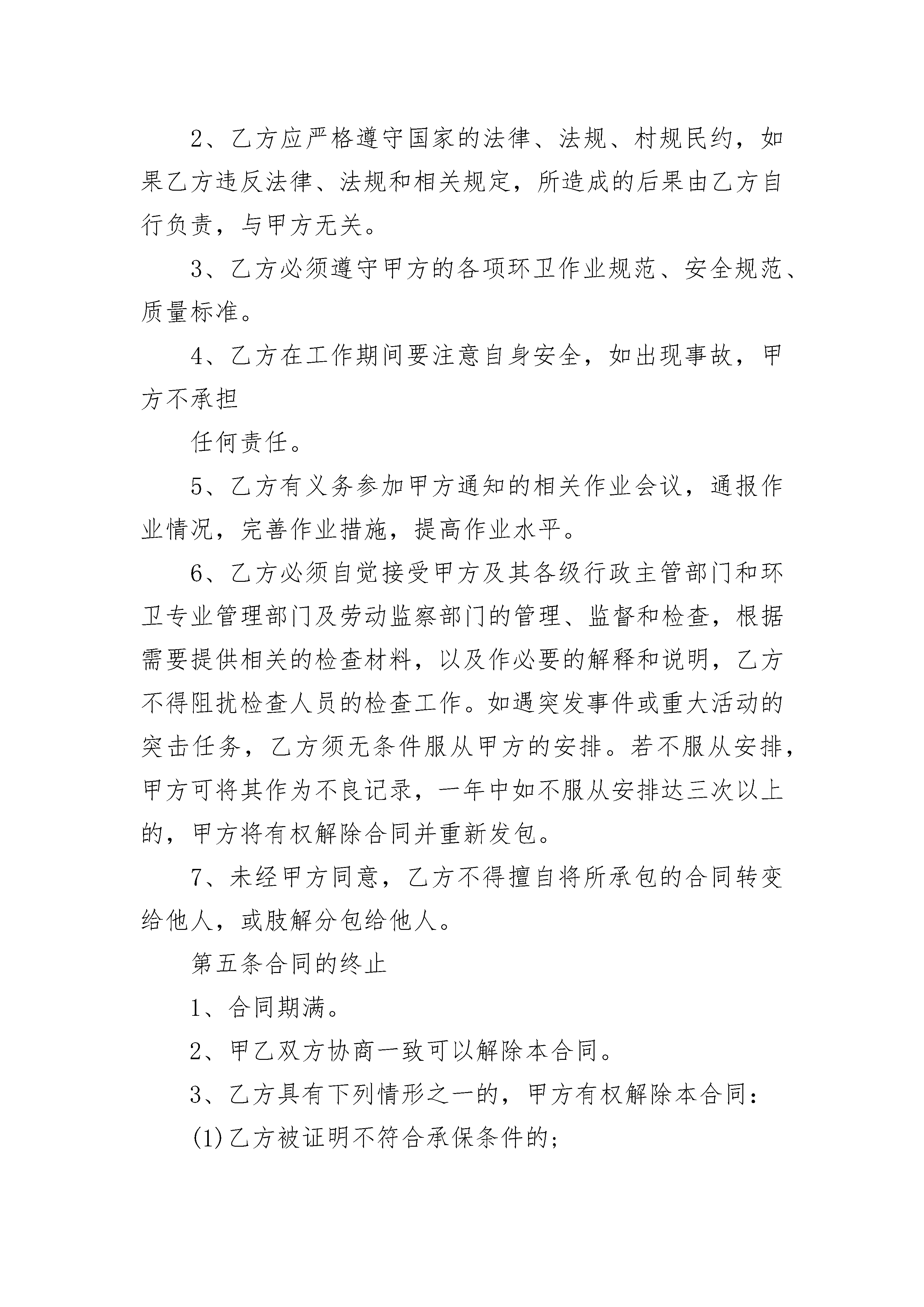 城乡环境绿化保洁承包协议书城乡环境绿化保洁承包协议书(通用3篇)城乡环境绿化保洁承包协议书篇1发包方(以下简称甲方):法定代表人:地址:联系电话:承包方(以下简称乙方):姓名:身份证号码:家庭住址:联系电话:硗碛藏族乡人民政府因环境卫生管理需要,根据有关法律、法规,将硗碛乡清洁卫生承包给(以下简称乙方)。双方根据“平等自愿,协商一致“的原则,签定本合同,确立承包关系,明确双方的权利、义务,并共同遵守以下约定。第一条服务承包期限1、服务承包期限为壹年。2、自年月日起至年月日止。如需续签,一年一签。第二条承包经费本合同全年总承包金额为元,承包人责任区域在乡政府(或其他检查单位、暗访)不定期或定期检查中发现有垃圾、杂物、私搭乱建等,一次扣除承包费200元,一年内检查三次不合格或有关单位检查、暗访造成重大后果的,甲方有权解除合同。承包费以终止时间按月折算给承包人。第三条工作内容1、甲方根据环境卫生管理工作需要,将硗碛乡的清洁卫生承包给2、乙方应按照甲方要求进行作业,如甲方通知乙方,乙方必须按要求赶到指定地点。3、乙方的工作内容为第四条双方权利义务(一)甲方权利义务1、甲方及其上级环卫行政主管部门和环卫专业管理部门有权组织对乙方作业质量、文明、安全作业情况进行的检查考评,但不得干扰乙方的正常作业。甲方应将每月检查考评乙方,检查考评结果作为发放给乙方承包费用的依据。2、遇重大活动或检查突击任务需要时,甲方应及时通知乙方做好重点保洁保障工作。3、甲方应积极协助乙方解决在承包期内出现的相关问题。(二)乙方权利义务1、乙方必须依照本合同规定的作业形式、作业质量标准及行业有关作业规范、作业质量标准,按时、保质、保量完成所承包作业项目范围、承包事项的工作。2、乙方应严格遵守国家的法律、法规、村规民约,如果乙方违反法律、法规和相关规定,所造成的后果由乙方自行负责,与甲方无关。3、乙方必须遵守甲方的各项环卫作业规范、安全规范、质量标准。4、乙方在工作期间要注意自身安全,如出现事故,甲方不承担任何责任。5、乙方有义务参加甲方通知的相关作业会议,通报作业情况,完善作业措施,提高作业水平。6、乙方必须自觉接受甲方及其各级行政主管部门和环卫专业管理部门及劳动监察部门的管理、监督和检查,根据需要提供相关的检查材料,以及作必要的解释和说明,乙方不得阻扰检查人员的检查工作。如遇突发事件或重大活动的突击任务,乙方须无条件服从甲方的安排。若不服从安排,甲方可将其作为不良记录,一年中如不服从安排达三次以上的,甲方将有权解除合同并重新发包。7、未经甲方同意,乙方不得擅自将所承包的合同转变给他人,或肢解分包给他人。第五条合同的终止1、合同期满。2、甲乙双方协商一致可以解除本合同。3、乙方具有下列情形之一的,甲方有权解除本合同:(1)乙方被证明不符合承保条件的;(2)严重违反甲方制定的规章制度的;(3)严重失职,营私舞弊,给甲方利益或形象造成重大损失的;4、具有以下情形之一的,乙方可以随时解除本合同:甲方以暴力、威胁或者非法限制人身自由的手段强迫承包的;5、法律法规规定的其他终止情形。第六条本合同期满后,自动解除,经双方协商合同可以续订,也可以终止。第七条本合同未尽事宜,由双方协商约定。国家规定的,按国家规定执行。合同期内,如所定条款与国家新颁布的法律、法规、规章和政策不符的,按国家规定执行。第八条由于政策的变化和其它甲、乙双方之外的原因使合同不能继续履行,视为合同中断。合同中断后,乙方应妥善做好承包项目的移交工作,按甲方的要求做好善后清理工作。第九条合同期满,本合同自然终止,乙方如想续签合同,应在该合同期满30天前向甲方提出书面申请。第十条本合同一式两份,甲方两份,乙方一份,具有同等法律效力。第十一条本合同自签订之日起生效。甲方(盖章):乙方(签字):代表人(签字):年月日城乡环境绿化保洁承包协议书篇2第一条合同的主体甲方:XX街道XX社区乙方:第二条合同宗旨及原则宗旨是向XX街道XX社区居民提供一个“安全、整洁、方便、文明、舒适、典雅”的现代化条件的生活环境,为南安市创建“国家卫生城市”创造良好条件。本合同经双方友好协商,本着平等互利等价有偿的原则。第三条承包范围对XX社区的道路(m2)和绿地(m2)等公共场所共m2,进行日常清扫保洁(详见附件:作业范围)。第四条承包作业服务要求1、作业任务:保洁作业包括地面垃圾废弃物、垃圾小屋的垃圾、绿化带隔离带垃圾、树穴及墙根处的杂草以及垃圾屋、果皮箱上的赃物清洗等内容。2、作业时间:一类:保洁时间:早上4:00-晚上22:00,实行18小时三班倒滚动保洁。按5000平方米/人日工效计定员。二类:保洁时间:早上4:00-晚上20:00,实行16小时两班倒保洁。按8000平方米/人日工效计定员。三类:除上述一、二类外的次干道,保洁时间