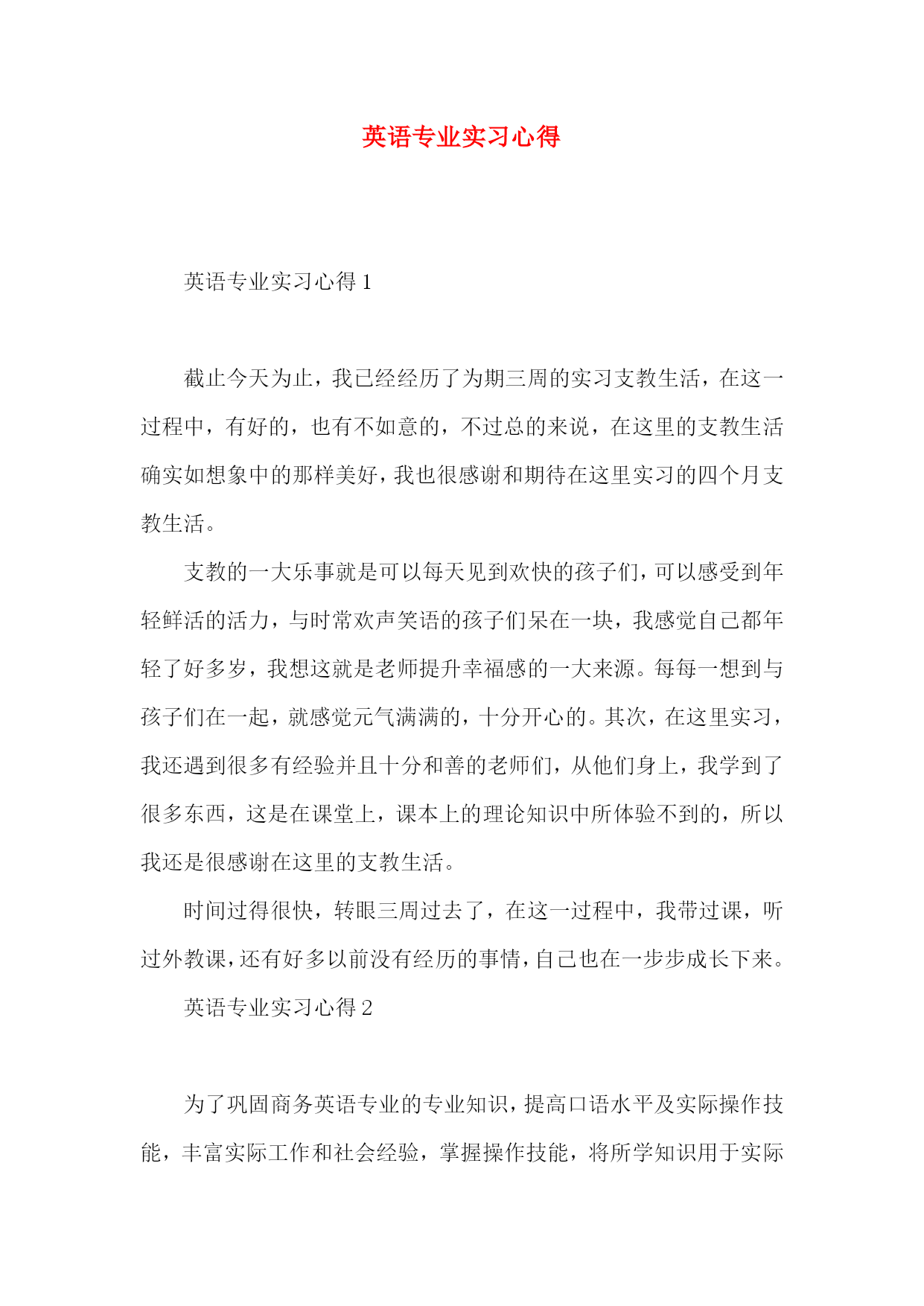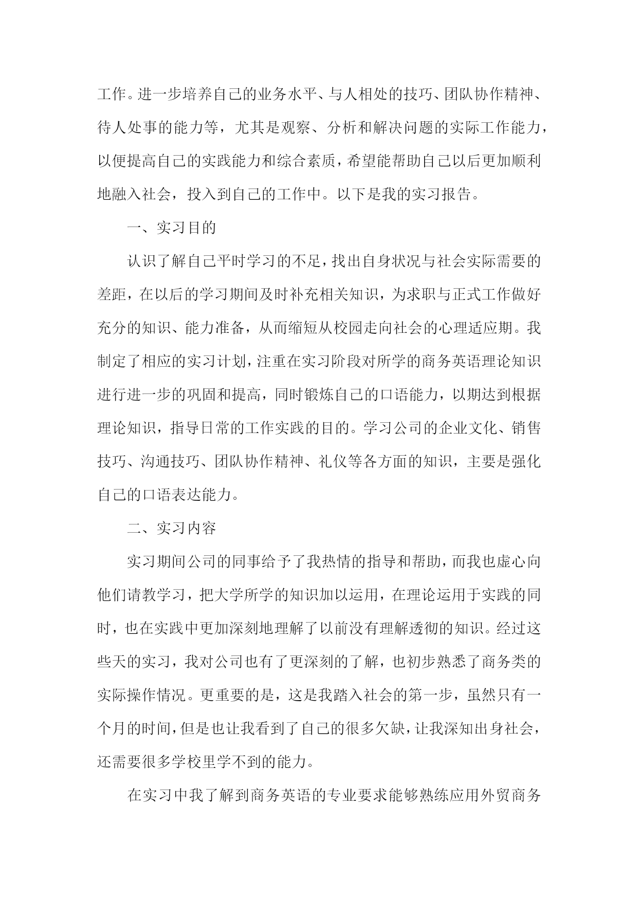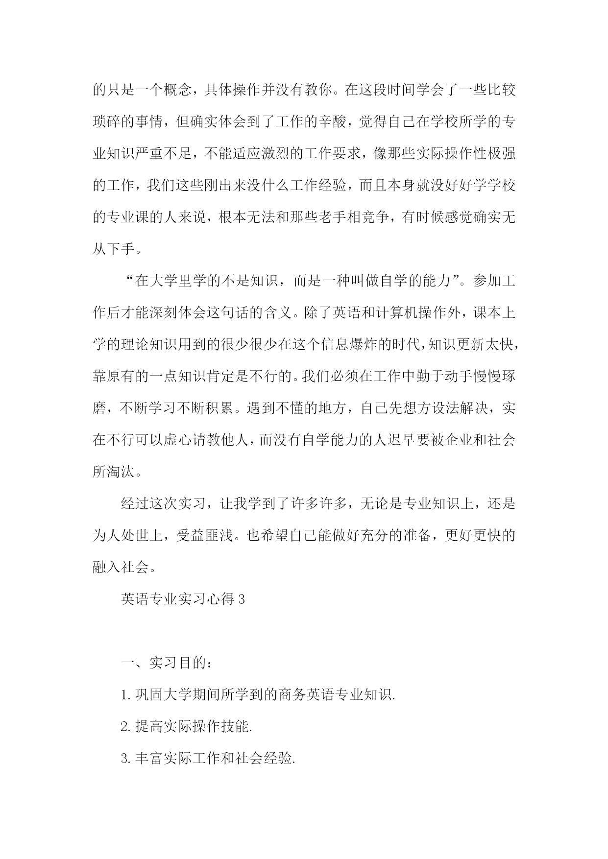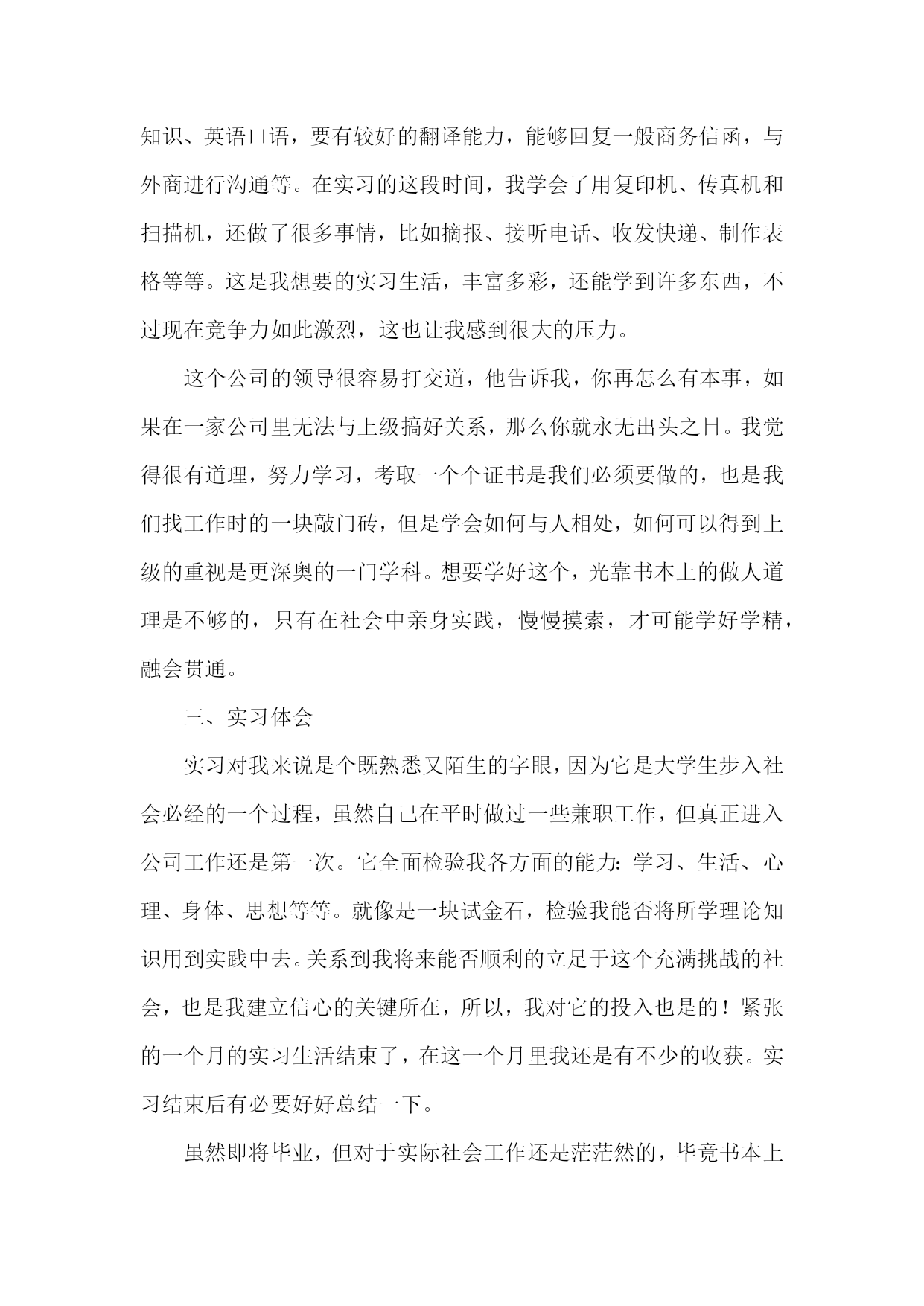 英语专业实习心得 英语专业实习心得1截止今天为止,我已经经历了为期三周的实习支教生活,在这一过程中,有好的,也有不如意的,不过总的来说,在这里的支教生活确实如想象中的那样美好,我也很感谢和期待在这里实习的四个月支教生活。支教的一大乐事就是可以每天见到欢快的孩子们,可以感受到年轻鲜活的活力,与时常欢声笑语的孩子们呆在一块,我感觉自己都年轻了好多岁,我想这就是老师提升幸福感的一大来源。每每一想到与孩子们在一起,就感觉元气满满的,十分开心的。其次,在这里实习,我还遇到很多有经验并且十分和善的老师们,从他们身上,我学到了很多东西,这是在课堂上,课本上的理论知识中所体验不到的,所以我还是很感谢在这里的支教生活。时间过得很快,转眼三周过去了,在这一过程中,我带过课,听过外教课,还有好多以前没有经历的事情,自己也在一步步成长下来。英语专业实习心得2为了巩固商务英语专业的专业知识,提高口语水平及实际操作技能,丰富实际工作和社会经验,掌握操作技能,将所学知识用于实际工作。进一步培养自己的业务水平、与人相处的技巧、团队协作精神、待人处事的能力等,尤其是观察、分析和解决问题的实际工作能力,以便提高自己的实践能力和综合素质,希望能帮助自己以后更加顺利地融入社会,投入到自己的工作中。以下是我的实习报告。一、实习目的认识了解自己平时学习的不足,找出自身状况与社会实际需要的差距,在以后的学习期间及时补充相关知识,为求职与正式工作做好充分的知识、能力准备,从而缩短从校园走向社会的心理适应期。我制定了相应的实习计划,注重在实习阶段对所学的商务英语理论知识进行进一步的巩固和提高,同时锻炼自己的口语能力,以期达到根据理论知识,指导日常的工作实践的目的。学习公司的企业文化、销售技巧、沟通技巧、团队协作精神、礼仪等各方面的知识,主要是强化自己的口语表达能力。二、实习内容实习期间公司的同事给予了我热情的指导和帮助,而我也虚心向他们请教学习,把大学所学的知识加以运用,在理论运用于实践的同时,也在实践中更加深刻地理解了以前没有理解透彻的知识。经过这些天的实习,我对公司也有了更深刻的了解,也初步熟悉了商务类的实际操作情况。更重要的是,这是我踏入社会的第一步,虽然只有一个月的时间,但是也让我看到了自己的很多欠缺,让我深知出身社会,还需要很多学校里学不到的能力。在实习中我了解到商务英语的专业要求能够熟练应用外贸商务知识、英语口语,要有较好的翻译能力,能够回复一般商务信函,与外商进行沟通等。在实习的这段时间,我学会了用复印机、传真机和扫描机,还做了很多事情,比如摘报、接听电话、收发快递、制作表格等等。这是我想要的实习生活,丰富多彩,还能学到许多东西,不过现在竞争力如此激烈,这也让我感到很大的压力。这个公司的领导很容易打交道,他告诉我,你再怎么有本事,如果在一家公司里无法与上级搞好关系,那么你就永无出头之日。我觉得很有道理,努力学习,考取一个个证书是我们必须要做的,也是我们找工作时的一块敲门砖,但是学会如何与人相处,如何可以得到上级的重视是更深奥的一门学科。想要学好这个,光靠书本上的做人道理是不够的,只有在社会中亲身实践,慢慢摸索,才可能学好学精,融会贯通。三、实习体会实习对我来说是个既熟悉又陌生的字眼,因为它是大学生步入社会必经的一个过程,虽然自己在平时做过一些兼职工作,但真正进入公司工作还是第一次。它全面检验我各方面的能力:学习、生活、心理、身体、思想等等。就像是一块试金石,检验我能否将所学理论知识用到实践中去。关系到我将来能否顺利的立足于这个充满挑战的社会,也是我建立信心的关键所在,所以,我对它的投入也是的!紧张的一个月的实习生活结束了,在这一个月里我还是有不少的收获。实习结束后有必要好好总结一下。虽然即将毕业,但对于实际社会工作还是茫茫然的,毕竟书本上的只是一个概念,具体操作并没有教你。在这段时间学会了一些比较琐碎的事情,但确实体会到了工作的辛酸,觉得自己在学校所学的专业知识严重不足,不能适应激烈的工作要求,像那些实际操作性极强的工作,我们这些刚出来没什么工作经验,而且本身就没好好学学校的专业课的人来说,根本无法和那些老手相竞争,有时候感觉确实无从下手。“在大学里学的不是知识,而是一种叫做自学的能力”。参加工作后才能深刻体会这句话的含义。除了英语和计算机操作外,课本上学的理论知识用到的很少很少在这个信息爆炸的时代,知识更新太快,靠原有的一点知识肯定是不行的。我们必须在工作中勤于动手慢慢琢磨,不断学习不断积累。遇到不懂的地方,自己先想方设法解决,实在不行可以虚心请教他人,而没有自学能力的人迟早要被企业和社会所淘汰。经过这次实习,让我学到了许多许多,无论是专业知识上,还是为人处世上,受益匪浅。也希望自己能做好充分的准备,更好更快的融入社会。英语专业实习心得3一、实习目的:1.