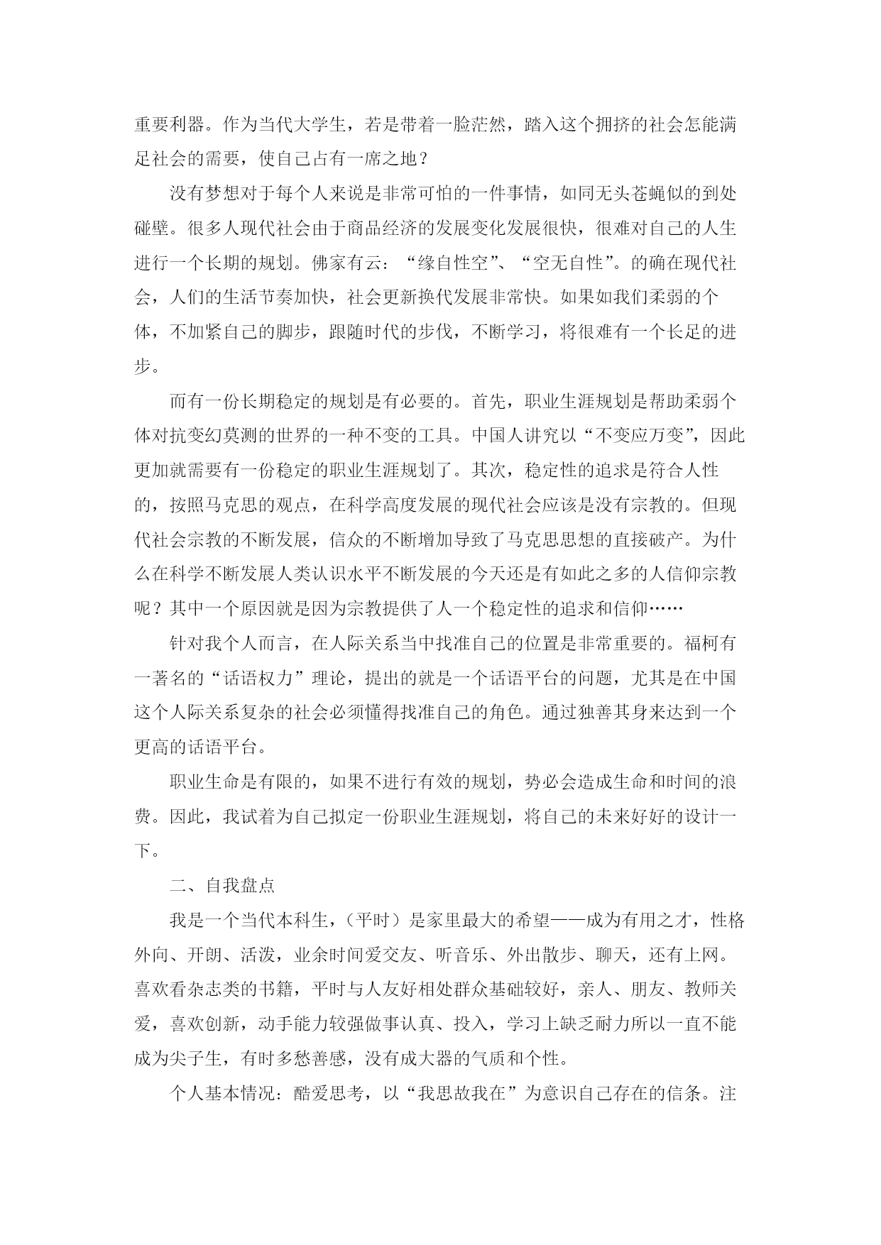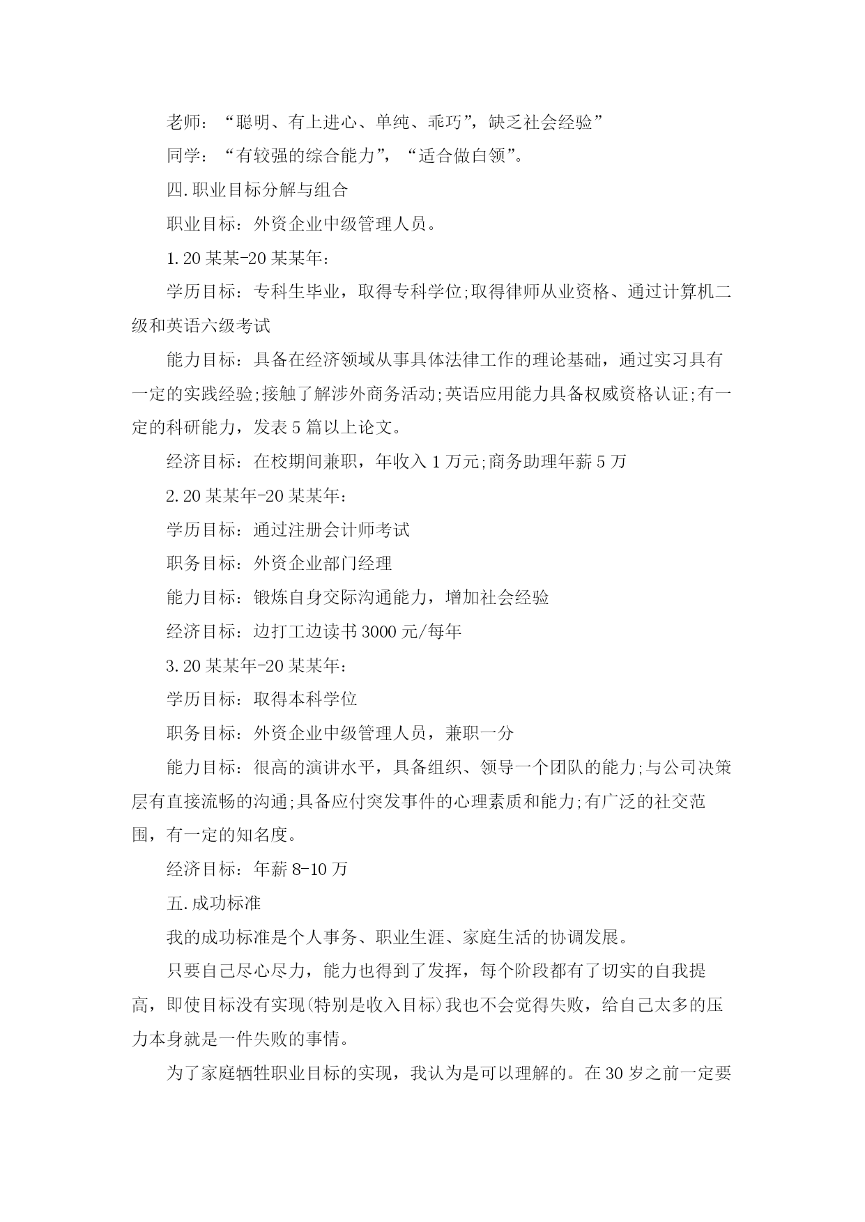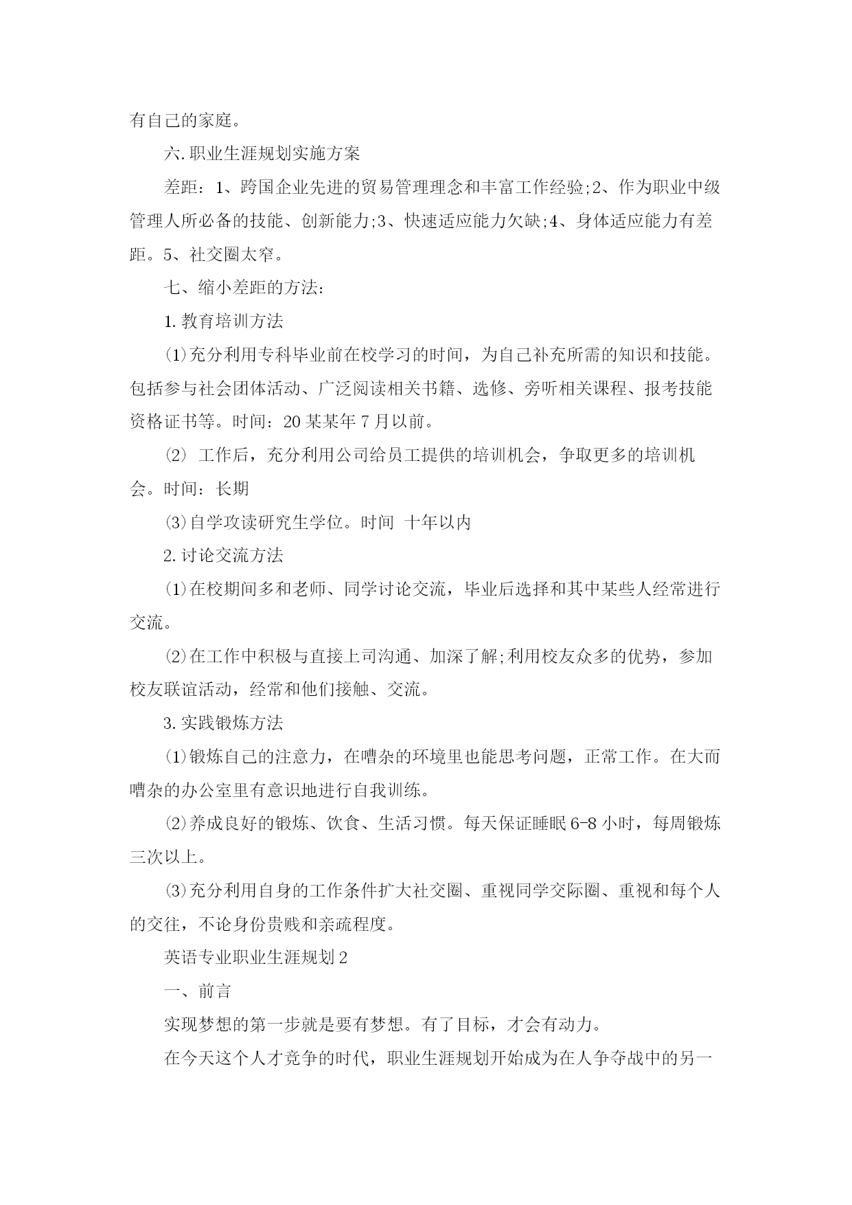 英语专业职业生涯规划 英语专业职业生涯规划1一、毕业后的十年规划(20某某年-20某某年,20岁至30岁)美好愿望:事业有成,家庭幸福方向:企业基层人员总体目标:完成转升本的学习,进入外资企业,成为基层管理者。二.社会环境规划和职业分析(十年规划)1、社会一般环境:中国政治稳定,经济持续发展。在全球经济一体化环境中的重要角色。经济发展有强劲的势头,加入WTO后,会有大批的外国企业进入中国市场,中国的企业也将走出国门。2、管理职业特殊社会环境:由于中国的管理科学发展较晚,管理知识大部分源于国外,中国的企业管理还有许多不完善的地方。中国急需管理人才,尤其是经过系统培训的高级管理人才。因此企业管理职业市场广阔。要在中国发展企业,必须要适合中国的国情,这就要求管理的科学性与艺术性和环境动态适应相结合。因此,受中国市场吸引进入的大批外资企业都面临着本土化改造的任务。这就为准备去外企做管理工作的人员提供了很多机会。三.个人分析与角色建议1.个人分析:(1)自身现状:英语水平中上层,基本能流利沟通;精通经贸知识;具有较强的人际沟通能力;思维敏捷,表达流畅;在大学期间长期成绩较好;有很强的学习愿望和能力。2.角色建议:父亲:“要不断学习,能力要强”;“工作要努力,有发展,要在大城市,方便我们搬来一起居住生活。”母亲:工作要上进,婚姻不要误。老师:“聪明、有上进心、单纯、乖巧”,缺乏社会经验”同学:“有较强的综合能力”,“适合做白领”。四.职业目标分解与组合职业目标:外资企业中级管理人员。1.20某某-20某某年:学历目标:专科生毕业,取得专科学位;取得律师从业资格、通过计算机二级和英语六级考试能力目标:具备在经济领域从事具体法律工作的理论基础,通过实习具有一定的实践经验;接触了解涉外商务活动;英语应用能力具备权威资格认证;有一定的科研能力,发表5篇以上论文。经济目标:在校期间兼职,年收入1万元;商务助理年薪5万2.20某某年-20某某年:学历目标:通过注册会计师考试职务目标:外资企业部门经理能力目标:锻炼自身交际沟通能力,增加社会经验经济目标:边打工边读书3000元/每年3.20某某年-20某某年:学历目标:取得本科学位职务目标:外资企业中级管理人员,兼职一分能力目标:很高的演讲水平,具备组织、领导一个团队的能力;与公司决策层有直接流畅的沟通;具备应付突发事件的心理素质和能力;有广泛的社交范围,有一定的知名度。经济目标:年薪8-10万五.成功标准我的成功标准是个人事务、职业生涯、家庭生活的协调发展。只要自己尽心尽力,能力也得到了发挥,每个阶段都有了切实的自我提高,即使目标没有实现(特别是收入目标)我也不会觉得失败,给自己太多的压力本身就是一件失败的事情。为了家庭牺牲职业目标的实现,我认为是可以理解的。在30岁之前一定要有自己的家庭。六.职业生涯规划实施方案差距:1、跨国企业先进的贸易管理理念和丰富工作经验;2、作为职业中级管理人所必备的技能、创新能力;3、快速适应能力欠缺;4、身体适应能力有差距。5、社交圈太窄。七、缩小差距的方法:1.教育培训方法(1)充分利用专科毕业前在校学习的时间,为自己补充所需的知识和技能。包括参与社会团体活动、广泛阅读相关书籍、选修、旁听相关课程、报考技能资格证书等。时间:20某某年7月以前。(2)工作后,充分利用公司给员工提供的培训机会,争取更多的培训机会。时间:长期(3)自学攻读研究生学位。时间十年以内2.讨论交流方法(1)在校期间多和老师、同学讨论交流,毕业后选择和其中某些人经常进行交流。(2)在工作中积极与直接上司沟通、加深了解;利用校友众多的优势,参加校友联谊活动,经常和他们接触、交流。3.实践锻炼方法(1)锻炼自己的注意力,在嘈杂的环境里也能思考问题,正常工作。在大而嘈杂的办公室里有意识地进行自我训练。(2)养成良好的锻炼、饮食、生活习惯。每天保证睡眠6-8小时,每周锻炼三次以上。(3)充分利用自身的工作条件扩大社交圈、重视同学交际圈、重视和每个人的交往,不论身份贵贱和亲疏程度。英语专业职业生涯规划2一、前言实现梦想的第一步就是要有梦想。有了目标,才会有动力。在今天这个人才竞争的时代,职业生涯规划开始成为在人争夺战中的另一重要利器。作为当代大学生,若是带着一脸茫然,踏入这个拥挤的社会怎能满足社会的需要,使自己占有一席之地?没有梦想对于每个人来说是非常可怕的一件事情,如同无头苍蝇似的到处碰壁。很多人现代社会由于商品经济的发展变化发展很快,很难对自己的人生进行一个长期的规划。佛家有云:“缘自性空”、“空无自性”。的确在现代社会,人们的生活节奏加快,社会更新换代发展非常快。如果如我们柔弱的个体,不加紧自己的脚步,跟随时代的步伐,不断学习,将很难有一个长足的进步。而有一份长期稳定的规划是有必要的。首先,职业生涯规