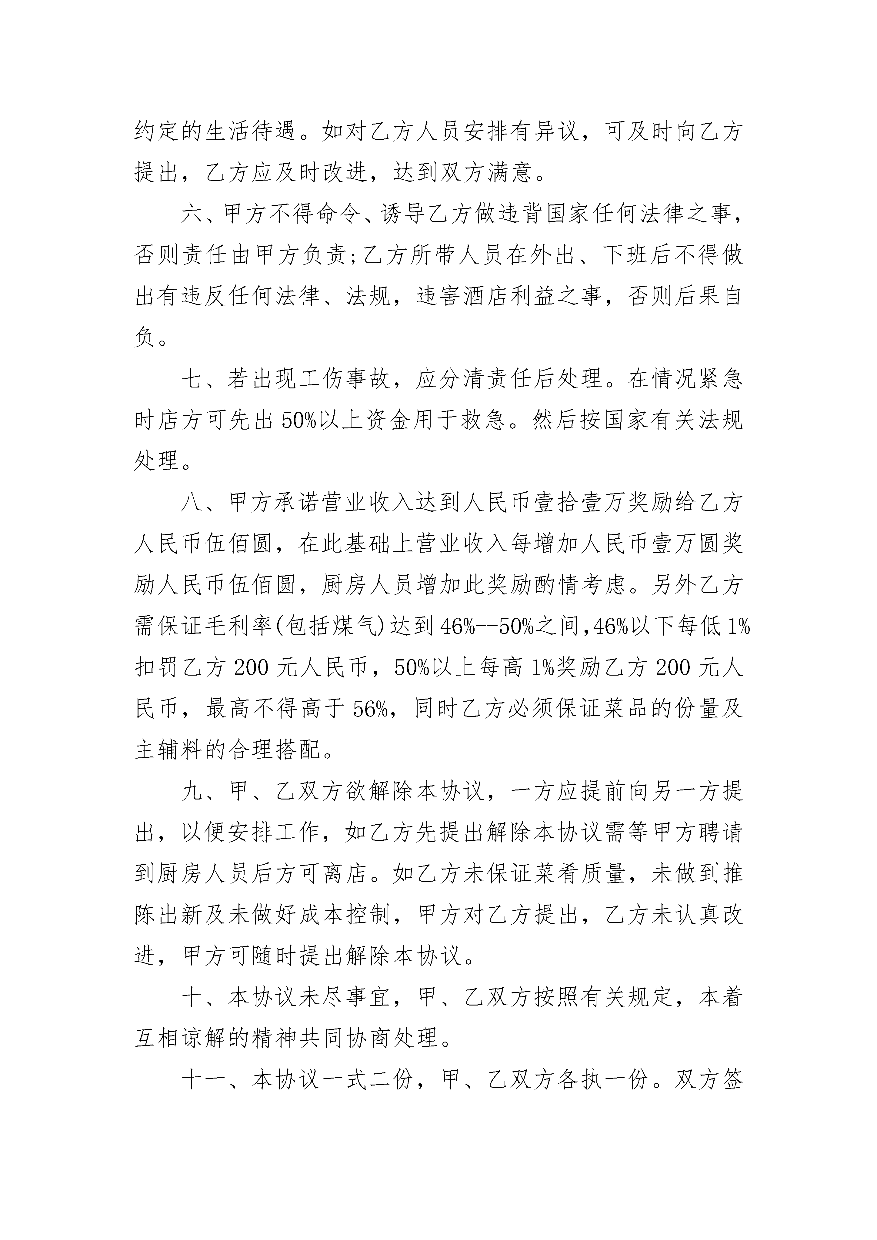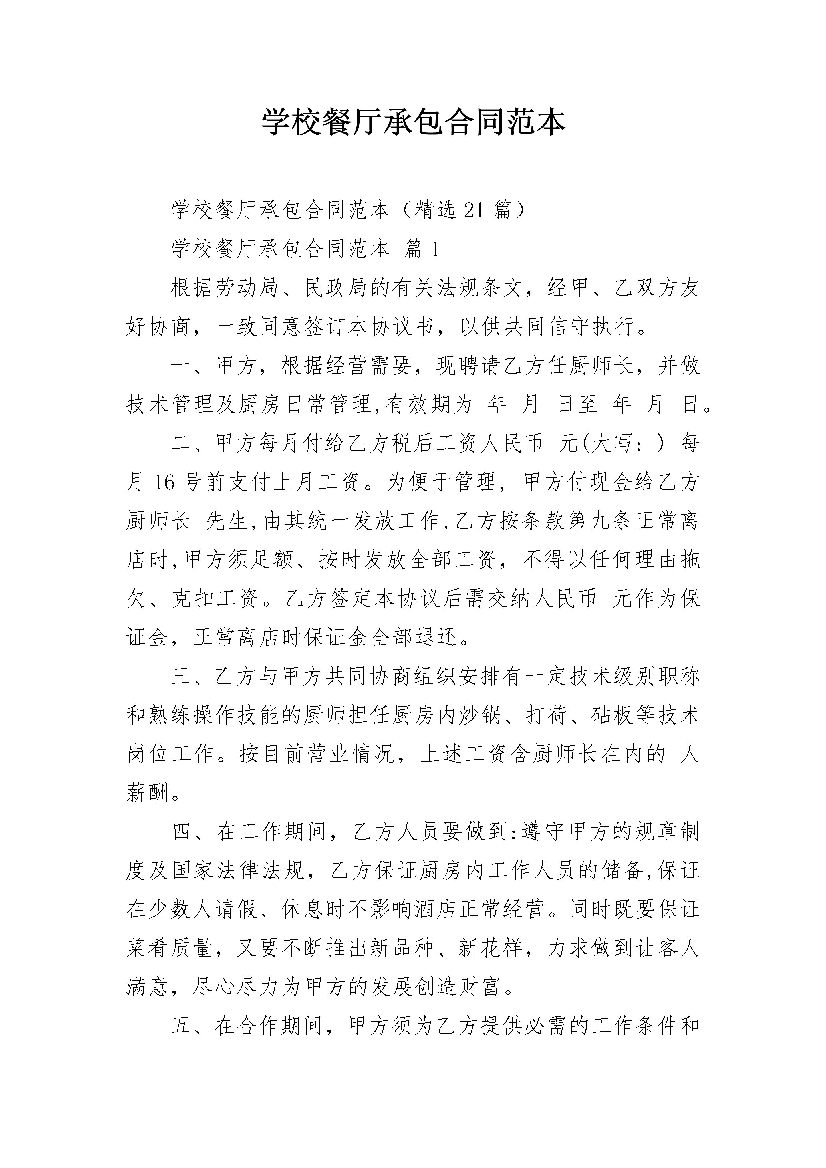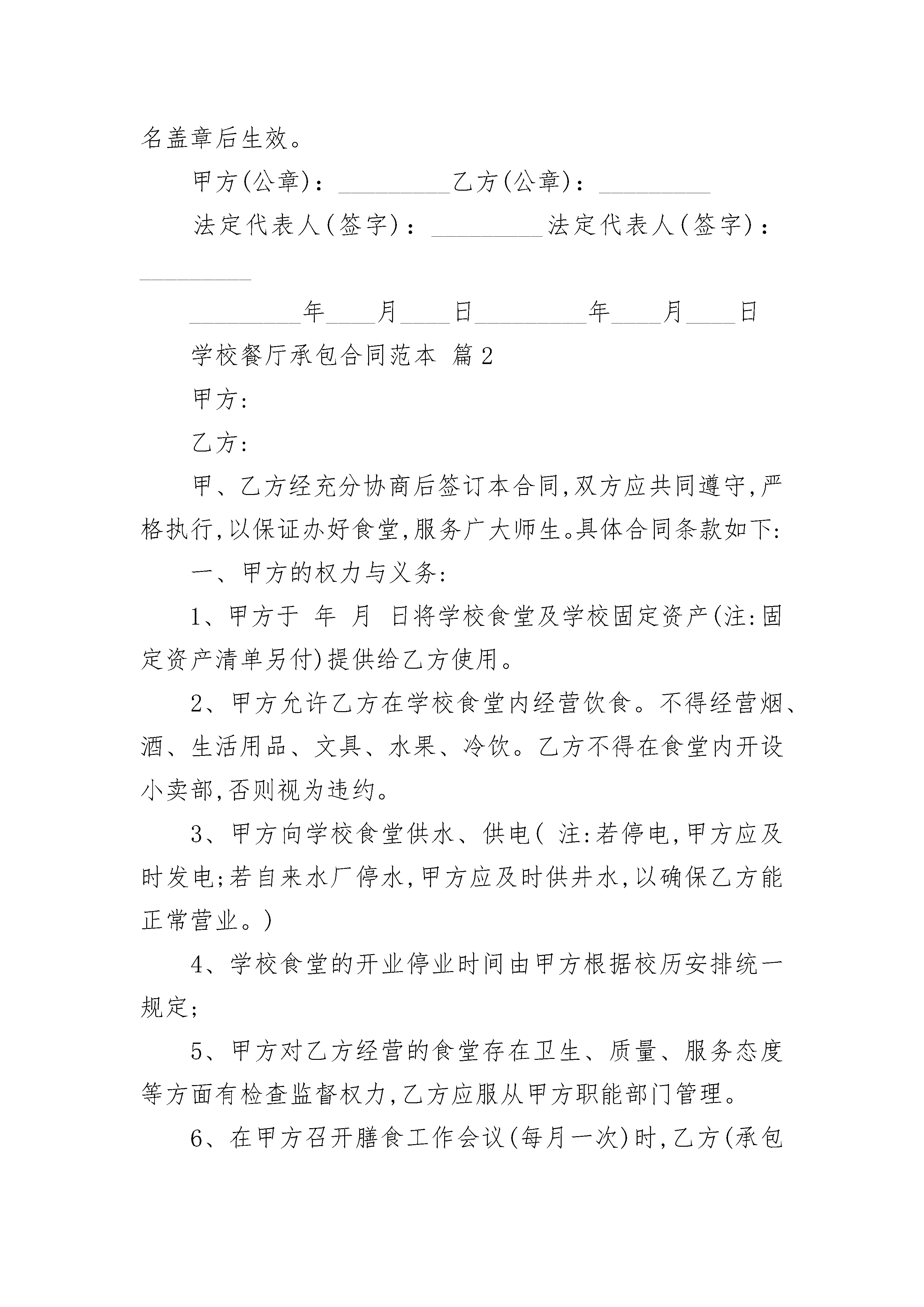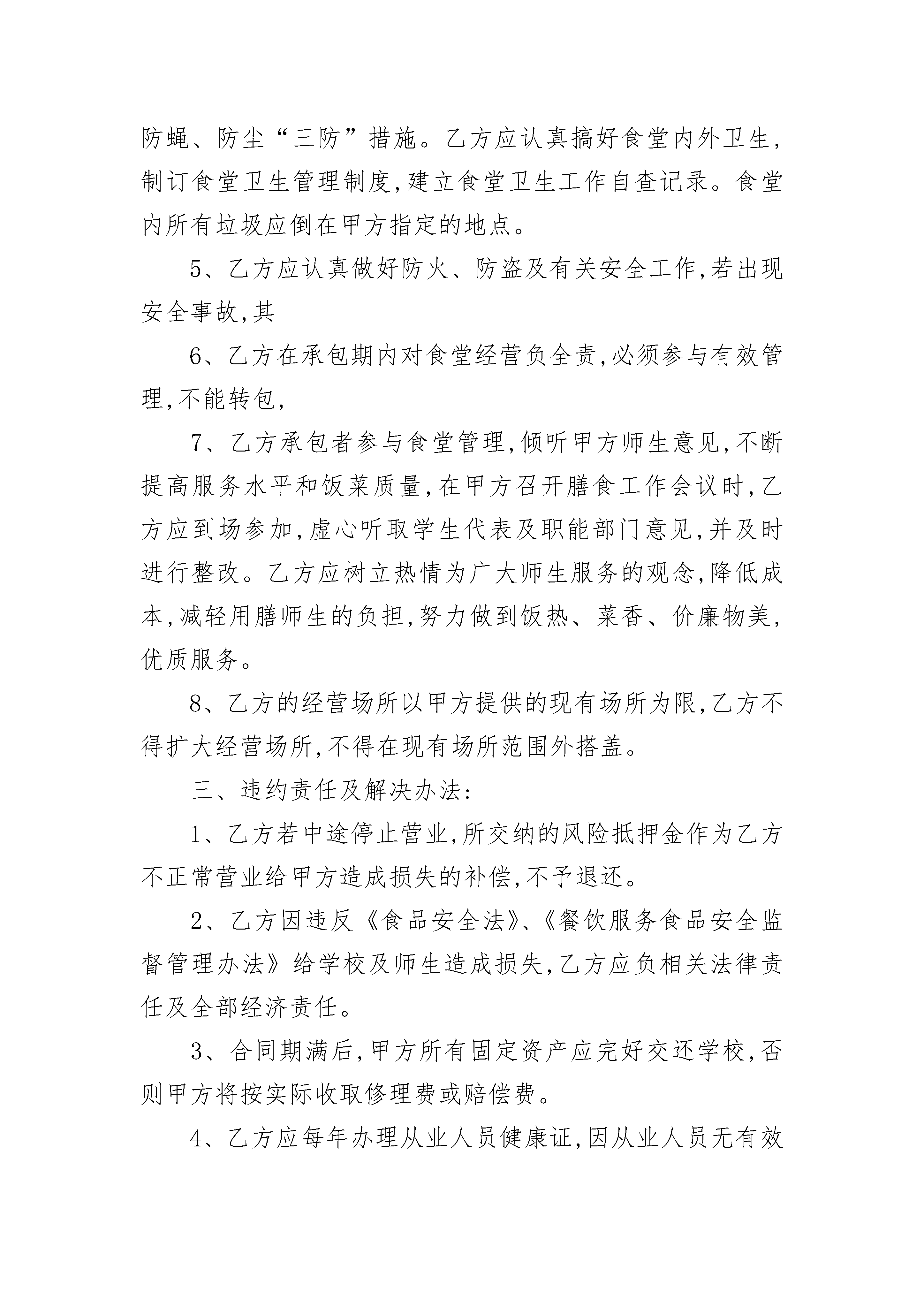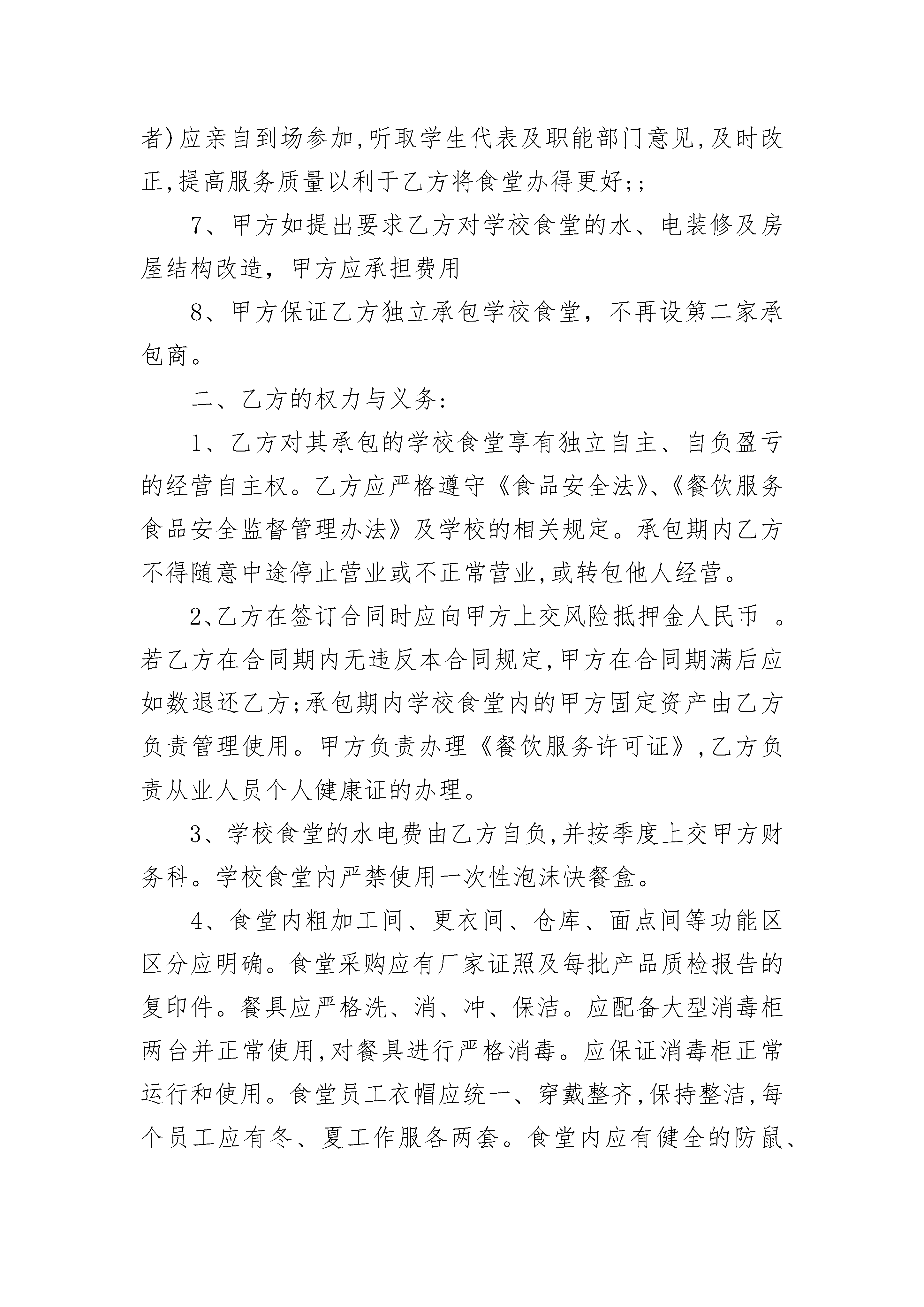 学校餐厅承包合同范本学校餐厅承包合同范本(精选21篇)学校餐厅承包合同范本篇1根据劳动局、民政局的有关法规条文,经甲、乙双方友好协商,一致同意签订本协议书,以供共同信守执行。一、甲方,根据经营需要,现聘请乙方任厨师长,并做技术管理及厨房日常管理,有效期为年月日至年月日。二、甲方每月付给乙方税后工资人民币元(大写:)每月16号前支付上月工资。为便于管理,甲方付现金给乙方厨师长先生,由其统一发放工作,乙方按条款第九条正常离店时,甲方须足额、按时发放全部工资,不得以任何理由拖欠、克扣工资。乙方签定本协议后需交纳人民币元作为保证金,正常离店时保证金全部退还。三、乙方与甲方共同协商组织安排有一定技术级别职称和熟练操作技能的厨师担任厨房内炒锅、打荷、砧板等技术岗位工作。按目前营业情况,上述工资含厨师长在内的人薪酬。四、在工作期间,乙方人员要做到:遵守甲方的规章制度及国家法律法规,乙方保证厨房内工作人员的储备,保证在少数人请假、休息时不影响酒店正常经营。同时既要保证菜肴质量,又要不断推出新品种、新花样,力求做到让客人满意,尽心尽力为甲方的发展创造财富。五、在合作期间,甲方须为乙方提供必需的工作条件和约定的生活待遇。如对乙方人员安排有异议,可及时向乙方提出,乙方应及时改进,达到双方满意。六、甲方不得命令、诱导乙方做违背国家任何法律之事,否则责任由甲方负责;乙方所带人员在外出、下班后不得做出有违反任何法律、法规,违害酒店利益之事,否则后果自负。七、若出现工伤事故,应分清责任后处理。在情况紧急时店方可先出50%以上资金用于救急。然后按国家有关法规处理。八、甲方承诺营业收入达到人民币壹拾壹万奖励给乙方人民币伍佰圆,在此基础上营业收入每增加人民币壹万圆奖励人民币伍佰圆,厨房人员增加此奖励酌情考虑。另外乙方需保证毛利率(包括煤气)达到46%--50%之间,46%以下每低1%扣罚乙方200元人民币,50%以上每高1%奖励乙方200元人民币,最高不得高于56%,同时乙方必须保证菜品的份量及主辅料的合理搭配。九、甲、乙双方欲解除本协议,一方应提前向另一方提出,以便安排工作,如乙方先提出解除本协议需等甲方聘请到厨房人员后方可离店。如乙方未保证菜肴质量,未做到推陈出新及未做好成本控制,甲方对乙方提出,乙方未认真改进,甲方可随时提出解除本协议。十、本协议未尽事宜,甲、乙双方按照有关规定,本着互相谅解的精神共同协商处理。十一、本协议一式二份,甲、乙双方各执一份。双方签名盖章后生效。甲方(公章):_________乙方(公章):_________法定代表人(签字):_________法定代表人(签字):__________________年____月____日_________年____月____日学校餐厅承包合同范本篇2甲方:乙方:甲、乙方经充分协商后签订本合同,双方应共同遵守,严格执行,以保证办好食堂,服务广大师生。具体合同条款如下:一、甲方的权力与义务:1、甲方于年月日将学校食堂及学校固定资产(注:固定资产清单另付)提供给乙方使用。2、甲方允许乙方在学校食堂内经营饮食。不得经营烟、酒、生活用品、文具、水果、冷饮。乙方不得在食堂内开设小卖部,否则视为违约。3、甲方向学校食堂供水、供电(注:若停电,甲方应及时发电;若自来水厂停水,甲方应及时供井水,以确保乙方能正常营业。)4、学校食堂的开业停业时间由甲方根据校历安排统一规定;5、甲方对乙方经营的食堂存在卫生、质量、服务态度等方面有检查监督权力,乙方应服从甲方职能部门管理。6、在甲方召开膳食工作会议(每月一次)时,乙方(承包者)应亲自到场参加,听取学生代表及职能部门意见,及时改正,提高服务质量以利于乙方将食堂办得更好;;7、甲方如提出要求乙方对学校食堂的水、电装修及房屋结构改造,甲方应承担费用8、甲方保证乙方独立承包学校食堂,不再设第二家承包商。二、乙方的权力与义务:1、乙方对其承包的学校食堂享有独立自主、自负盈亏的经营自主权。乙方应严格遵守《食品安全法》、《餐饮服务食品安全监督管理办法》及学校的相关规定。承包期内乙方不得随意中途停止营业或不正常营业,或转包他人经营。2、乙方在签订合同时应向甲方上交风险抵押金人民币。若乙方在合同期内无违反本合同规定,甲方在合同期满后应如数退还乙方;承包期内学校食堂内的甲方固定资产由乙方负责管理使用。甲方负责办理《餐饮服务许可证》,乙方负责从业人员个人健康证的办理。3、学校食堂的水电费由乙方自负,并按季度上交甲方财务科。学校食堂内严禁使用一次性泡沫快餐盒。4、食堂内粗加工间、更衣间、仓库、面点间等功能区区分应明确。食堂采购应有厂家证照及每批产品质检报告的复印件。餐具应严格洗、消、冲、保洁。应配备大型消毒柜两台并正常使用,对餐具进行严格消毒。应保证消毒柜正常运行和使用。食堂员工衣帽应统