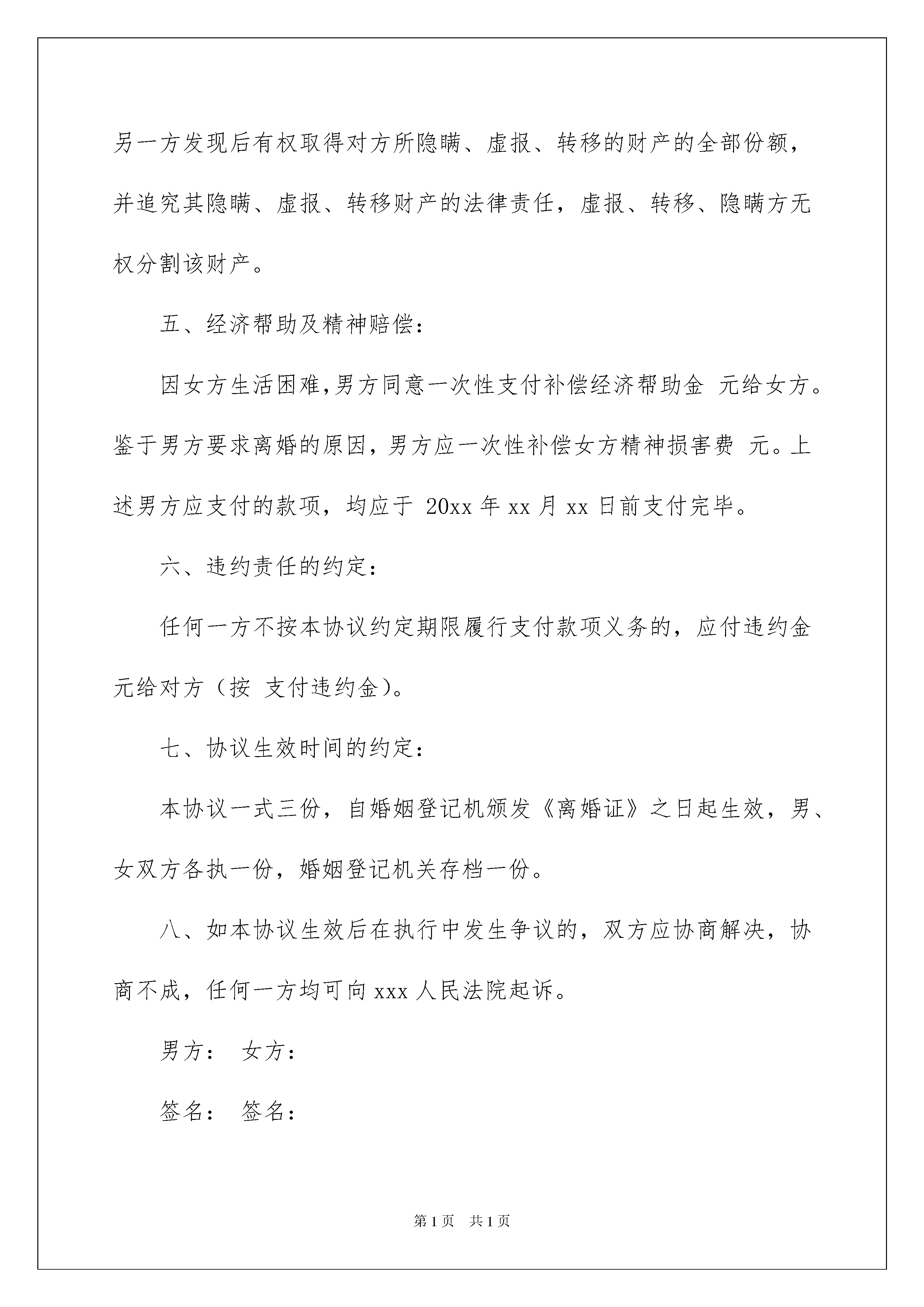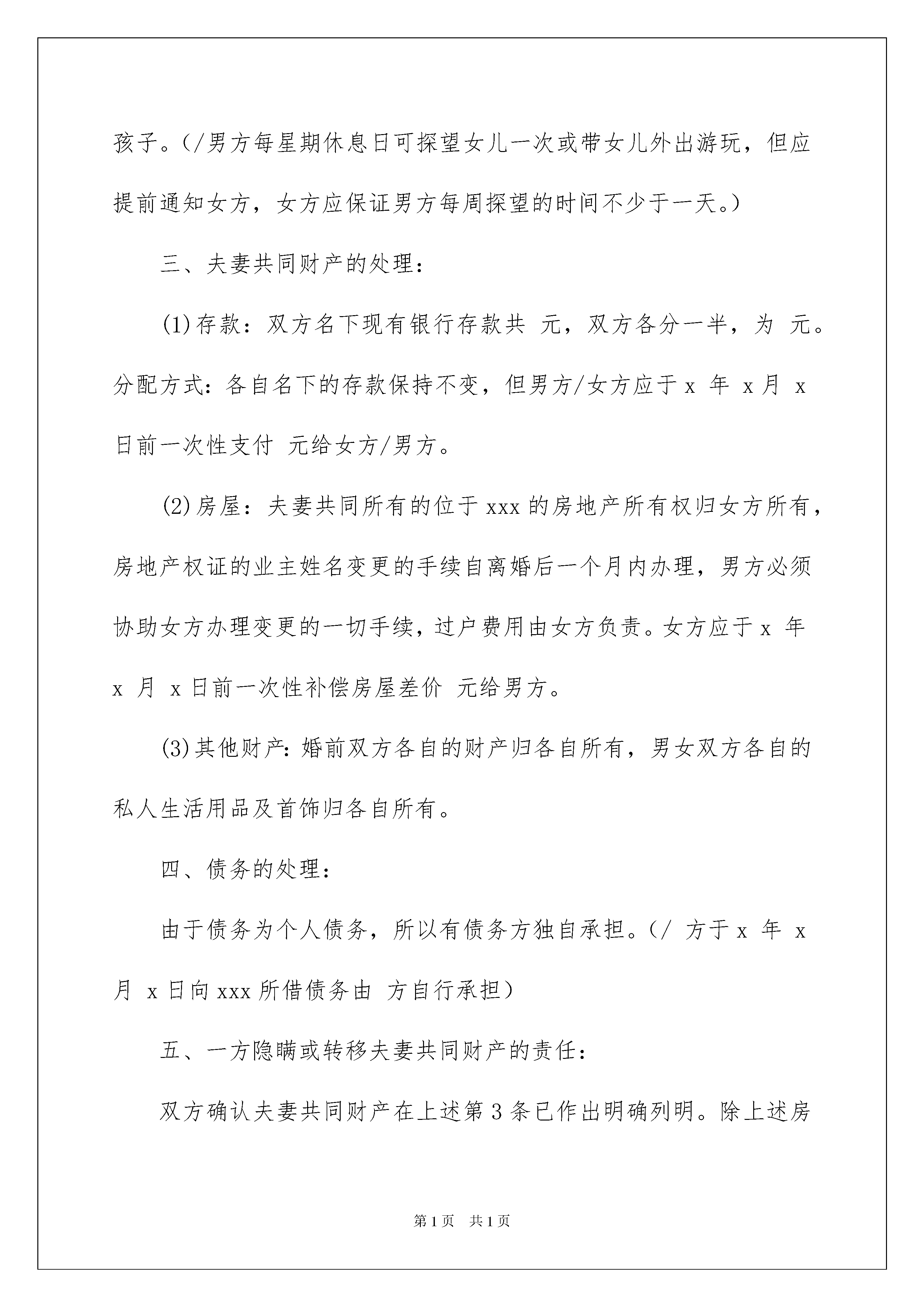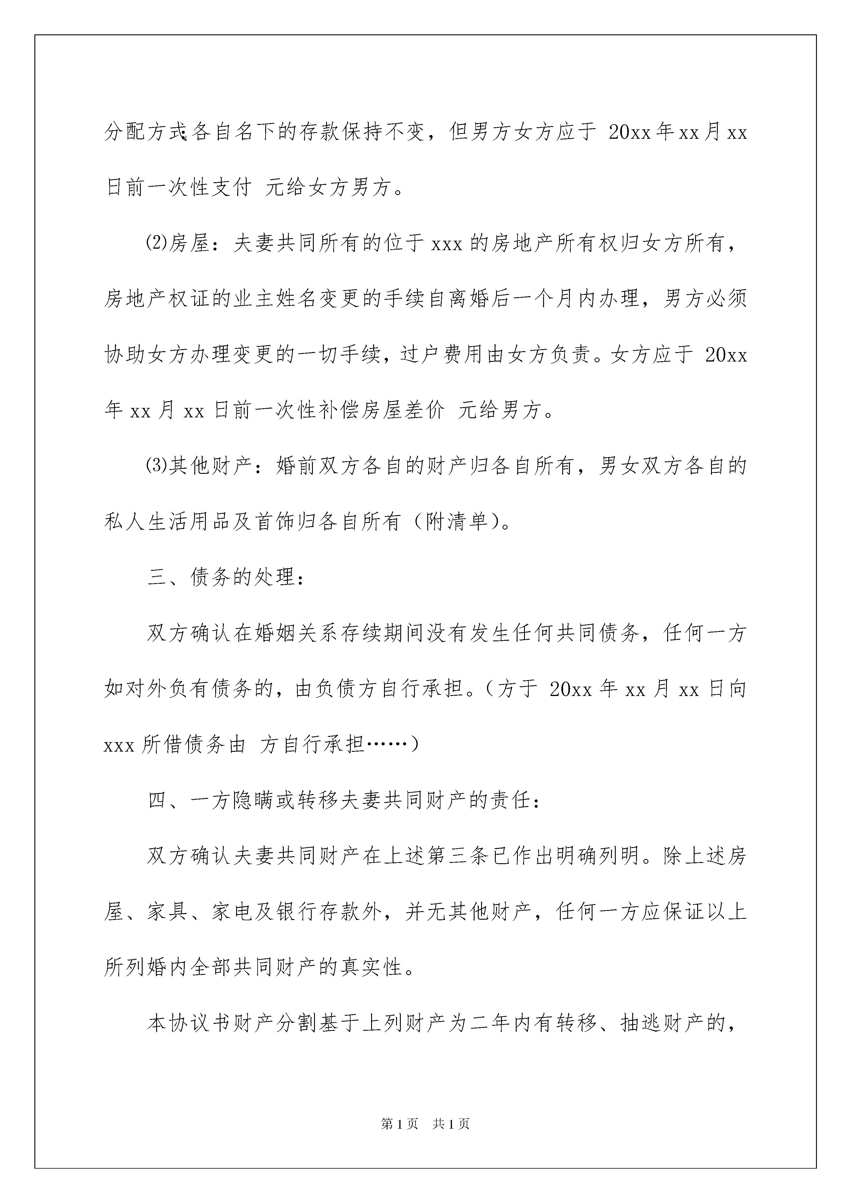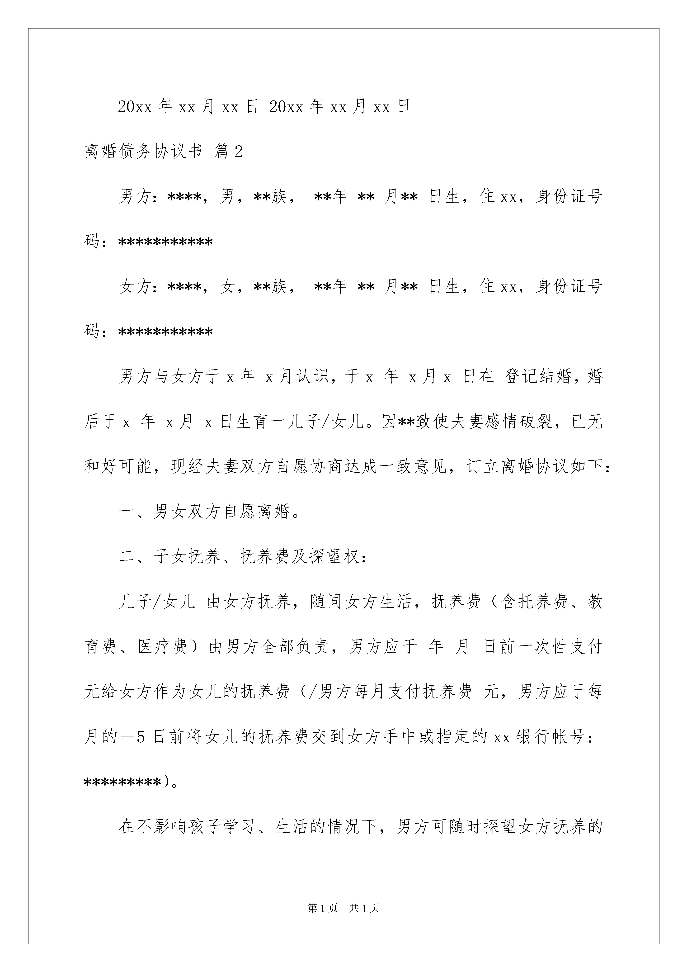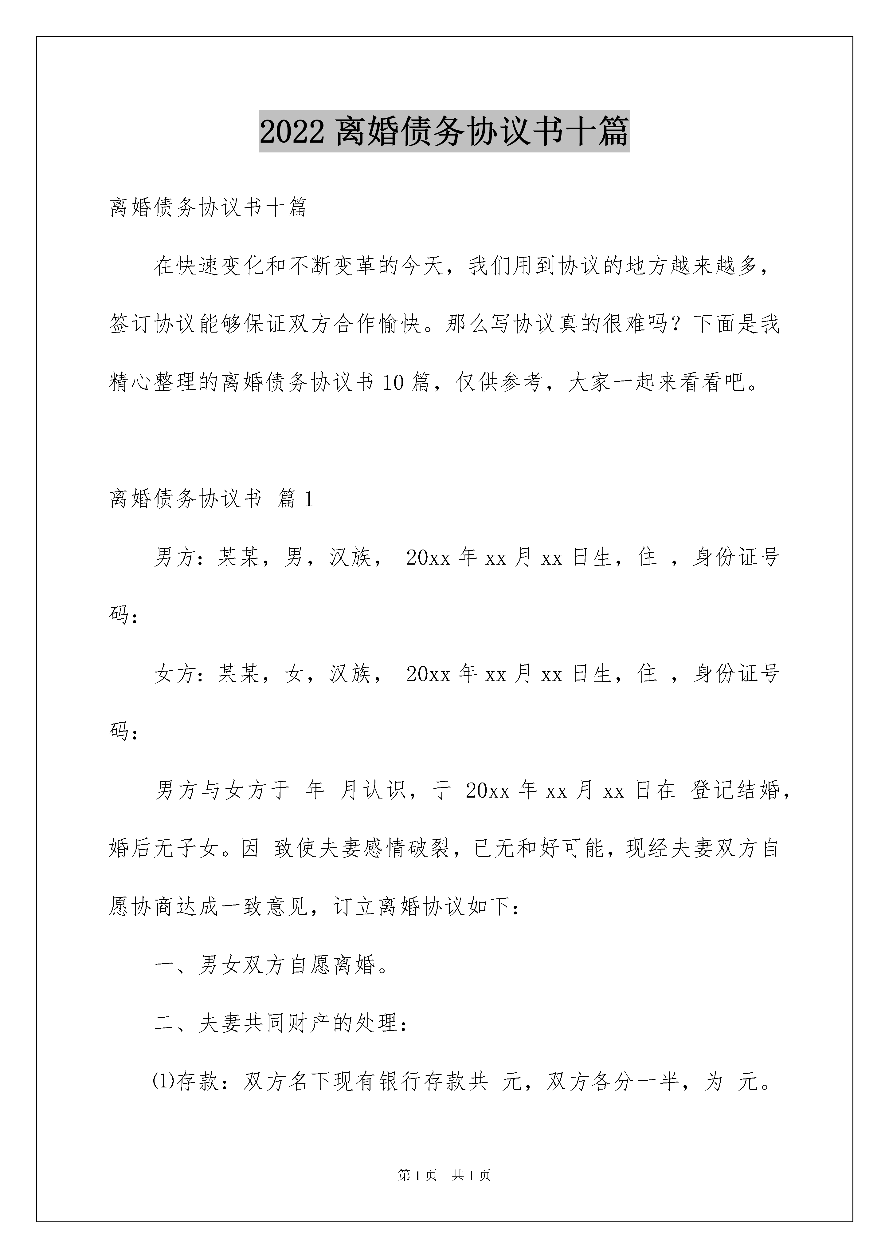 2022离婚债务协议书十篇离婚债务协议书十篇在快速变化和不断变革的今天,我们用到协议的地方越来越多,签订协议能够保证双方合作愉快。那么写协议真的很难吗?下面是我精心整理的离婚债务协议书10篇,仅供参考,大家一起来看看吧。离婚债务协议书篇1男方:某某,男,汉族,20xx年xx月xx日生,住,身份证号码:女方:某某,女,汉族,20xx年xx月xx日生,住,身份证号码:男方与女方于年月认识,于20xx年xx月xx日在登记结婚,婚后无子女。因致使夫妻感情破裂,已无和好可能,现经夫妻双方自愿协商达成一致意见,订立离婚协议如下:一、男女双方自愿离婚。二、夫妻共同财产的处理:⑴存款:双方名下现有银行存款共元,双方各分一半,为元。分配方式:各自名下的存款保持不变,但男方女方应于20xx年xx月xx日前一次性支付元给女方男方。⑵房屋:夫妻共同所有的位于xxx的房地产所有权归女方所有,房地产权证的业主姓名变更的手续自离婚后一个月内办理,男方必须协助女方办理变更的一切手续,过户费用由女方负责。女方应于20xx年xx月xx日前一次性补偿房屋差价元给男方。⑶其他财产:婚前双方各自的财产归各自所有,男女双方各自的私人生活用品及首饰归各自所有(附清单)。三、债务的处理:双方确认在婚姻关系存续期间没有发生任何共同债务,任何一方如对外负有债务的,由负债方自行承担。(方于20xx年xx月xx日向xxx所借债务由方自行承担……)四、一方隐瞒或转移夫妻共同财产的责任:双方确认夫妻共同财产在上述第三条已作出明确列明。除上述房屋、家具、家电及银行存款外,并无其他财产,任何一方应保证以上所列婚内全部共同财产的真实性。本协议书财产分割基于上列财产为二年内有转移、抽逃财产的,另一方发现后有权取得对方所隐瞒、虚报、转移的财产的全部份额,并追究其隐瞒、虚报、转移财产的法律责任,虚报、转移、隐瞒方无权分割该财产。五、经济帮助及精神赔偿:因女方生活困难,男方同意一次性支付补偿经济帮助金元给女方。鉴于男方要求离婚的原因,男方应一次性补偿女方精神损害费元。上述男方应支付的款项,均应于20xx年xx月xx日前支付完毕。六、违约责任的约定:任何一方不按本协议约定期限履行支付款项义务的,应付违约金元给对方(按支付违约金)。七、协议生效时间的约定:本协议一式三份,自婚姻登记机颁发《离婚证》之日起生效,男、女双方各执一份,婚姻登记机关存档一份。八、如本协议生效后在执行中发生争议的,双方应协商解决,协商不成,任何一方均可向xxx人民法院起诉。男方:女方:签名:签名:20xx年xx月xx日20xx年xx月xx日离婚债务协议书篇2男方:****,男,**族,**年**月**日生,住xx,身份证号码:***********女方:****,女,**族,**年**月**日生,住xx,身份证号码:***********男方与女方于x年x月认识,于x年x月x日在登记结婚,婚后于x年x月x日生育一儿子/女儿。因**致使夫妻感情破裂,已无和好可能,现经夫妻双方自愿协商达成一致意见,订立离婚协议如下:一、男女双方自愿离婚。二、子女抚养、抚养费及探望权:儿子/女儿由女方抚养,随同女方生活,抚养费(含托养费、教育费、医疗费)由男方全部负责,男方应于年月日前一次性支付元给女方作为女儿的抚养费(/男方每月支付抚养费元,男方应于每月的-5日前将女儿的抚养费交到女方手中或指定的xx银行帐号:*********)。在不影响孩子学习、生活的情况下,男方可随时探望女方抚养的孩子。(/男方每星期休息日可探望女儿一次或带女儿外出游玩,但应提前通知女方,女方应保证男方每周探望的时间不少于一天。)三、夫妻共同财产的处理:(1)存款:双方名下现有银行存款共元,双方各分一半,为元。分配方式:各自名下的存款保持不变,但男方/女方应于x年x月x日前一次性支付元给女方/男方。(2)房屋:夫妻共同所有的位于xxx的房地产所有权归女方所有,房地产权证的业主姓名变更的手续自离婚后一个月内办理,男方必须协助女方办理变更的一切手续,过户费用由女方负责。女方应于x年x月x日前一次性补偿房屋差价元给男方。(3)其他财产:婚前双方各自的财产归各自所有,男女双方各自的私人生活用品及首饰归各自所有。四、债务的处理:由于债务为个人债务,所以有债务方独自承担。(/方于x年x月x日向xxx所借债务由方自行承担)五、一方隐瞒或转移夫妻共同财产的责任:双方确认夫妻共同财产在上述第3条已作出明确列明。除上述房屋、家具、家电及银行存款外,并无其他财产,任何一方应保证以上所列婚内全部共同财产的真实性。本协议书财产分割基于上列财产为基础